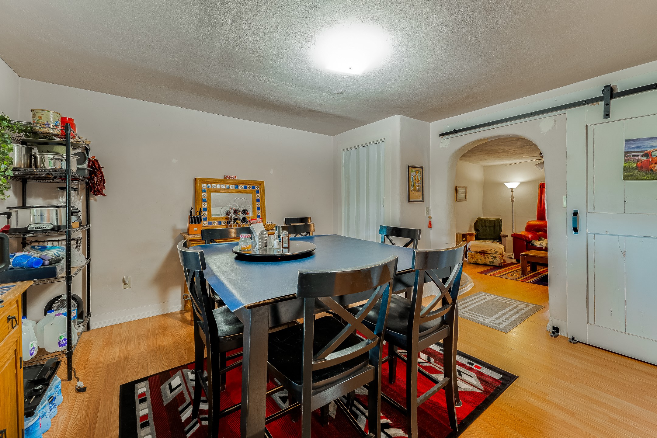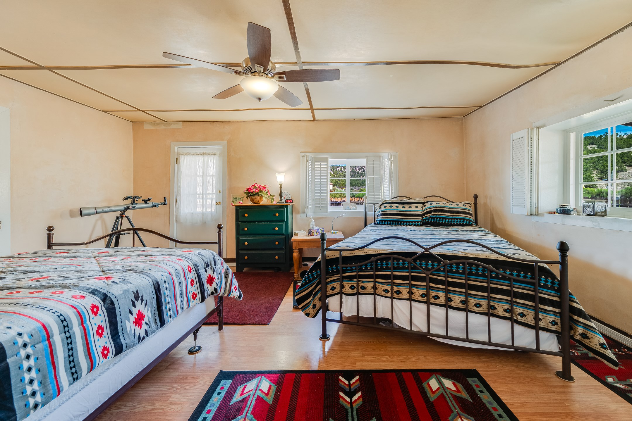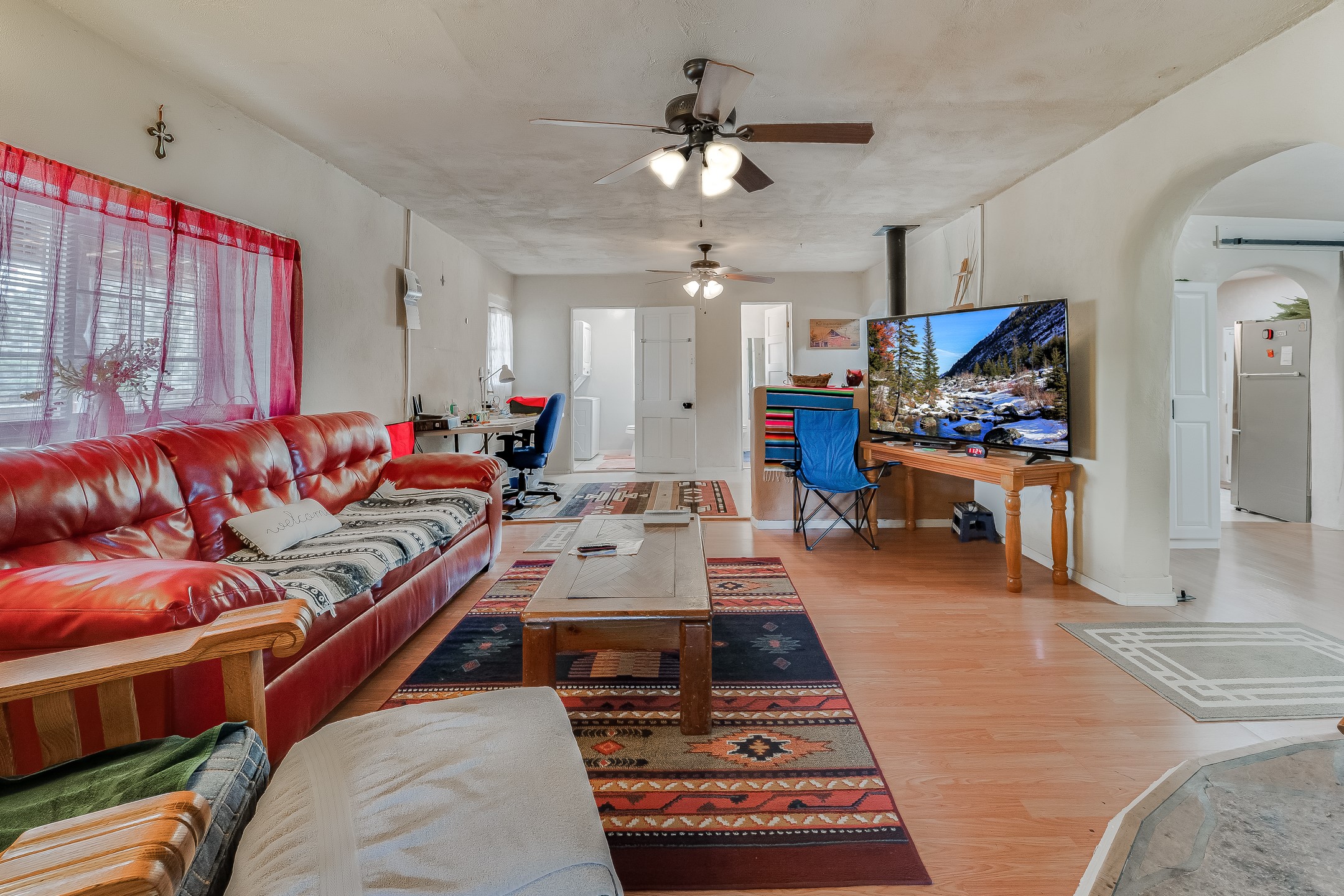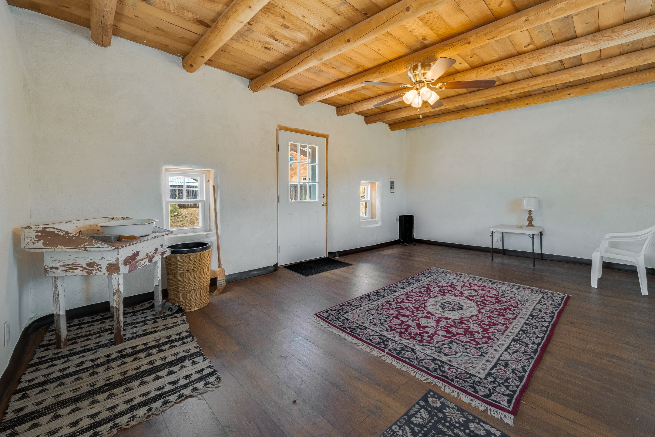 This sprawling ranch sits on 24 acres with an underground irrigation system throughout and the Tusas River winding through the estate. It consist of an 2600 Sq/Ft adobe (mud block) two-story main house built in the early 1940s. The thick, earthen walls, offers a unique and comforting warmth during the colder months and are cool during the hot summer days are also a glimpse into the rich historic past of New Mexico. Within a short walking distance from the main home, is the 320 Sq/Ft casita dating early circa 1830's. The allure of adobe-style home building, often referred to as Pueblo style, lies in its romantic visual appeal that resonates with many seeking a traditional Southwestern aesthetic. The influence of Moorish architecture on adobe homes is notable, reflecting centuries of cultural exchange between North Africa and Spain, which subsequently impacted the architectural landscape of New Mexico. This historical connection adds a layer of depth to the architectural heritage of the area. The property additionally features a 24'x28' two-car garage; a 36'x 40' workshop and a 36' x36' metal barn. Traditional farming in the area included harvesting alfalfa, vegetables and other farming, largely organic. The community of La Madera population is about 150 people, which offers a great deal of privacy. The mountains surrounding the property are a "high-elevation desert landscape" are characterized by dramatic mountains, broad valleys, high elevation, alkaline soil, and an abundance of diverse plant and animal life. Also offered is the potential of purchasing the farm equipment at a reduced rate. Property is ideal for horses, sheep, cattle, goats, pets and other livestock.