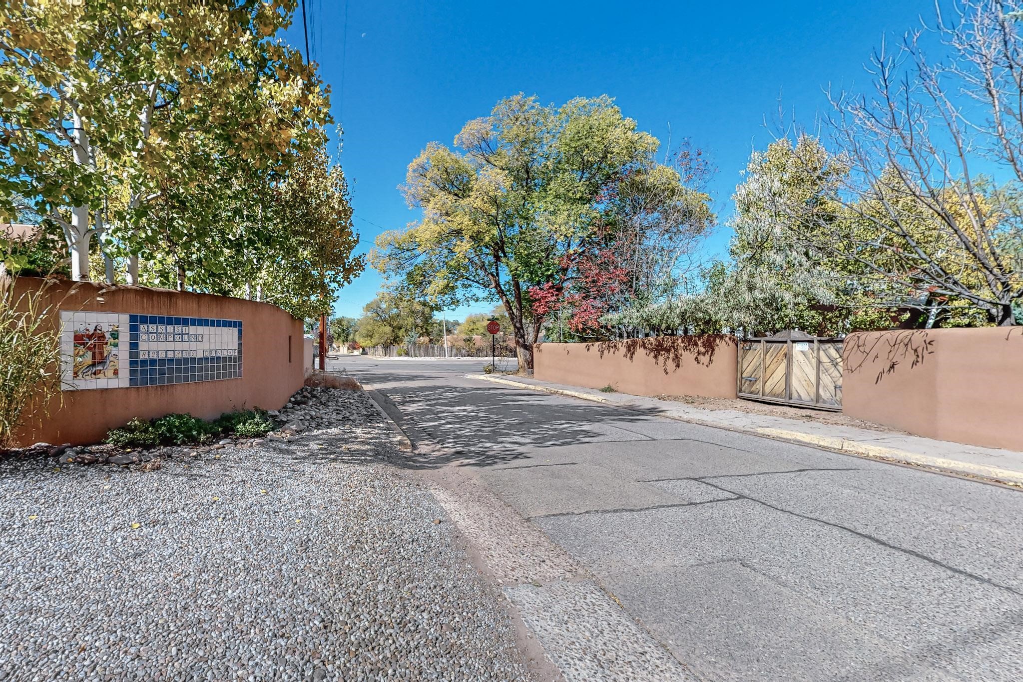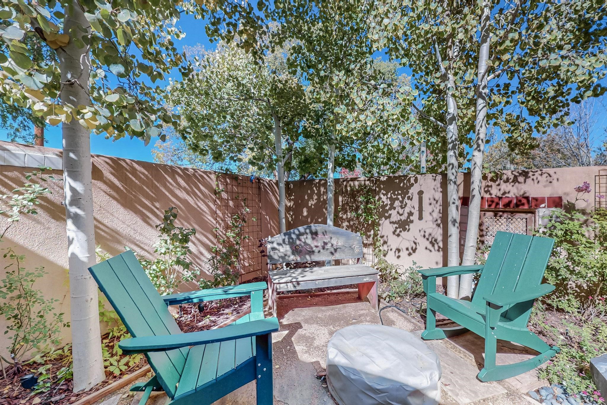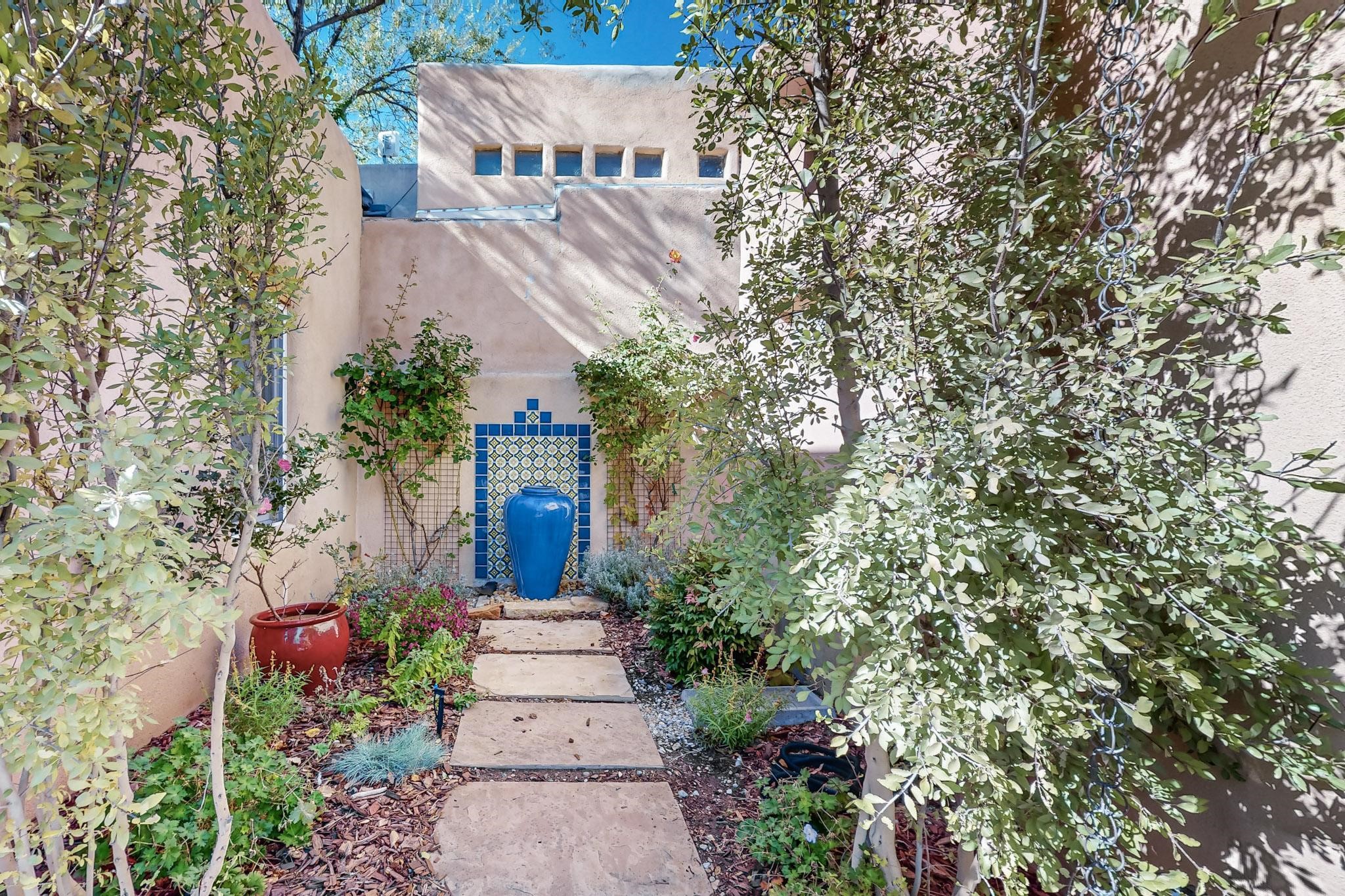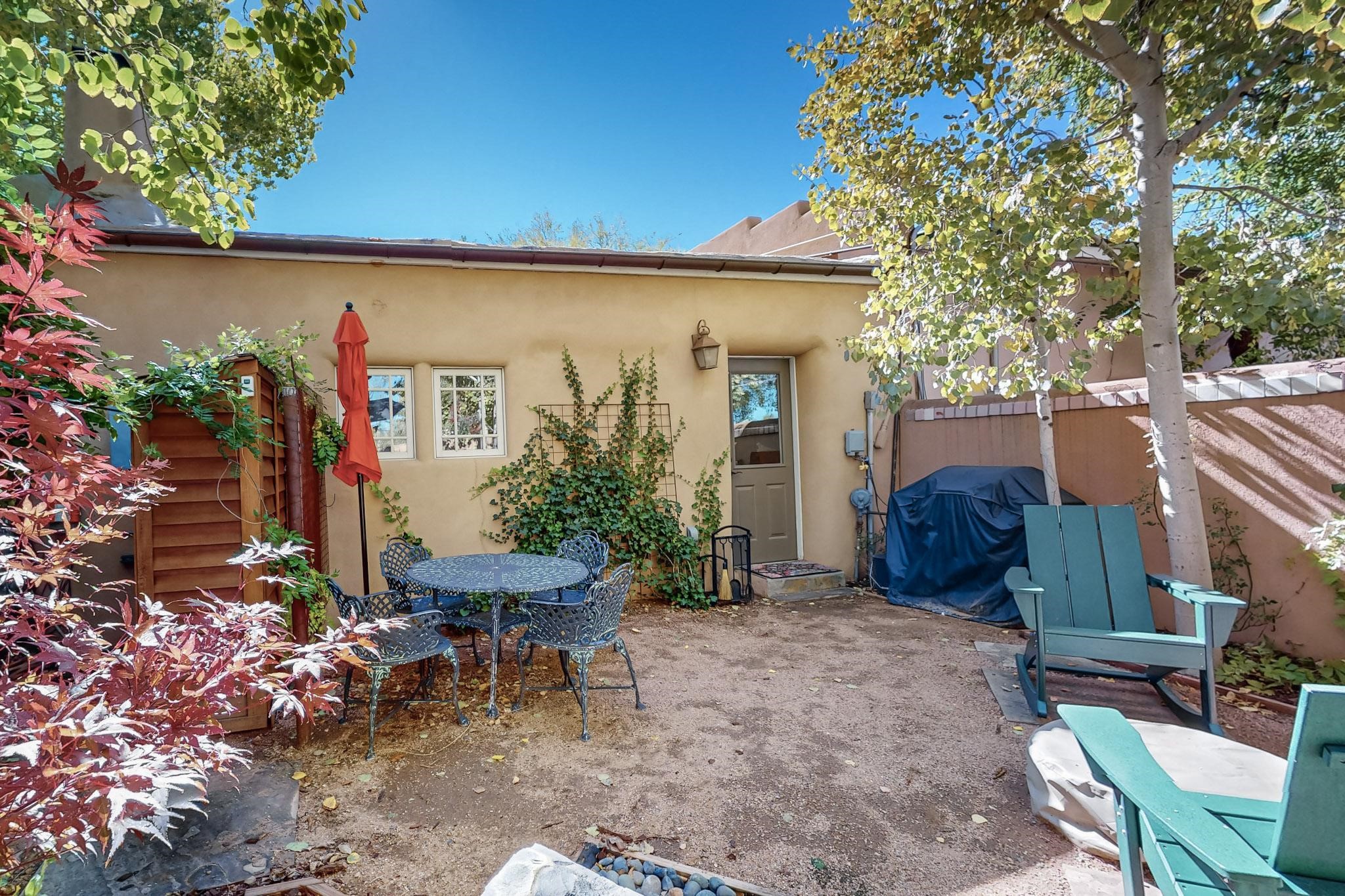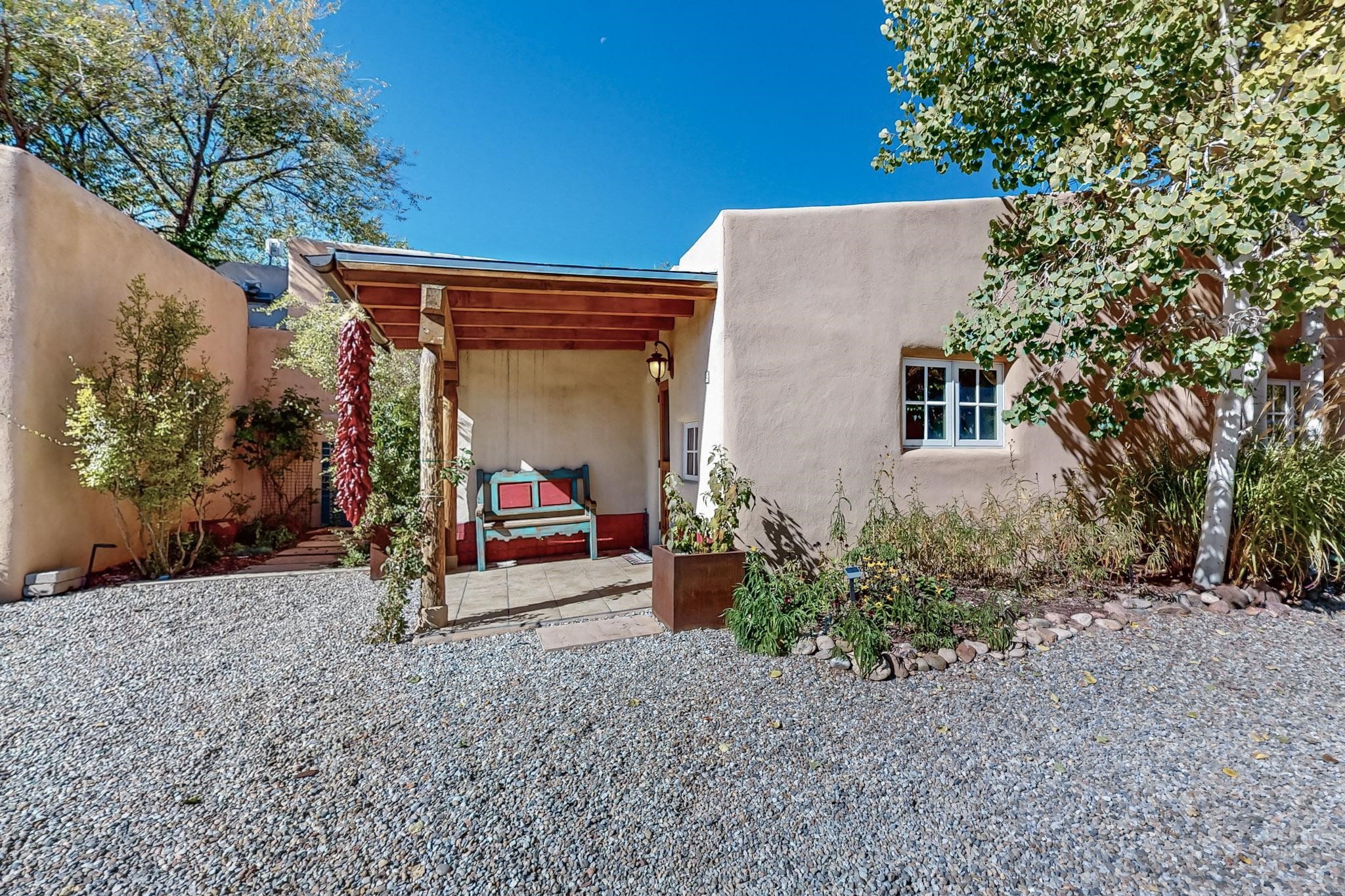 Rarely does a condo in the gated Assisi Compound become available. The Compound is beautifully maintained, landscaped and located in the vibrant Railyard/Guadalupe area. Oozing with charm, character and attention to detail, Casa Wren is one of the seven distinctively unique units. A gracious vigas and beamed portal shelters the front entrance. Inside, elegant architectural details including rounded bullnose corners, clerestory windows, beamed ceilings, Venetian plaster, skylights and a Kiva fireplace. Galley-style kitchen with wood cabinetry, Quartz countertops, ceramic double sink, tile backsplash and new appliances. Open and bright Living/Dining with a wood burning Kiva fireplace and stone flooring that continues into the en-suite bedroom. Matisse wall tiles, slate floors, new mini-splits, bathroom tub and tankless hot water. Private garden, off the living room, with its' own secret entrance. Water feature, fire pit, landscaping and storage shed. Stucco walls enclose the property. 1 parking place and no street parking permit required.