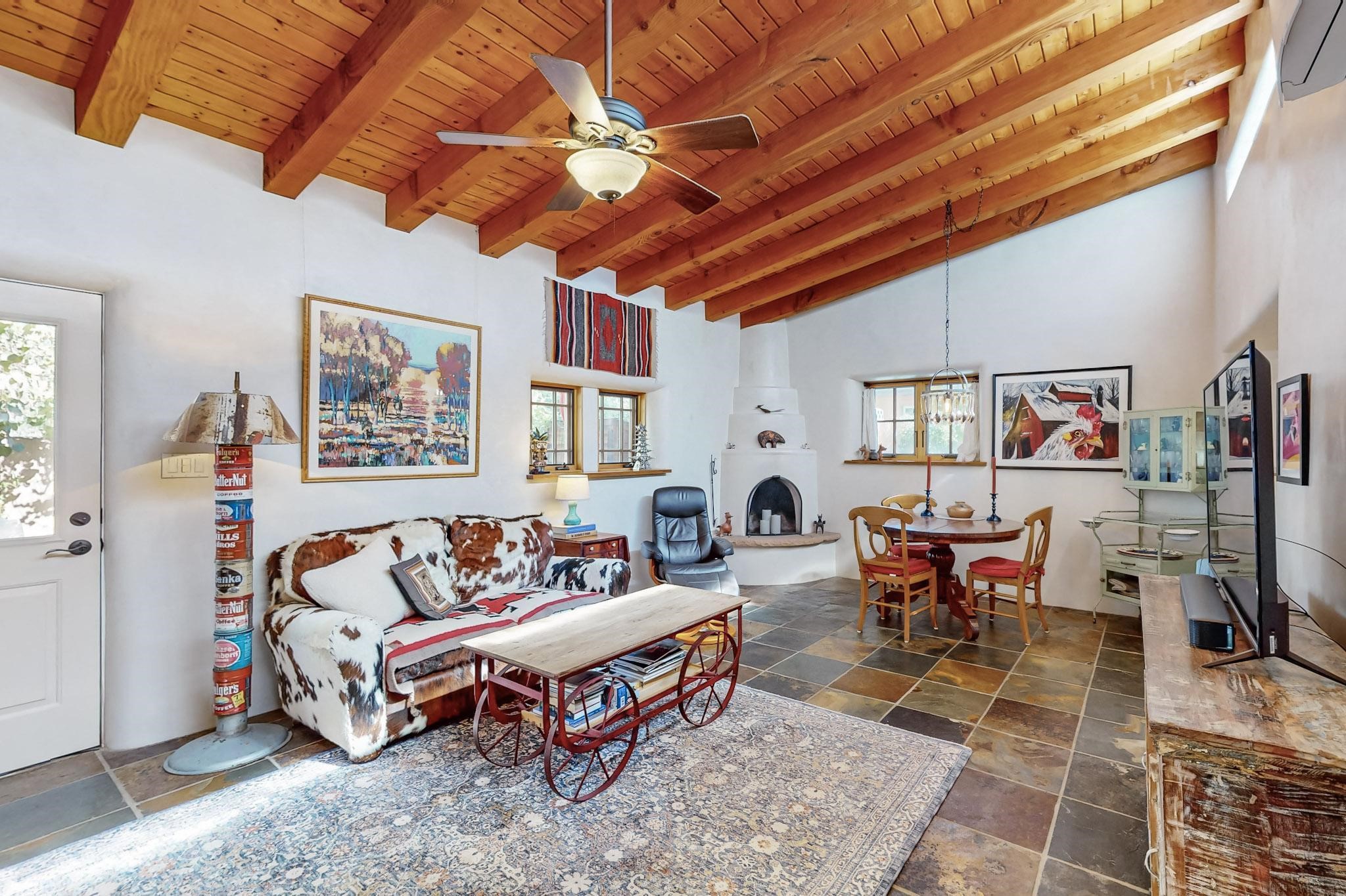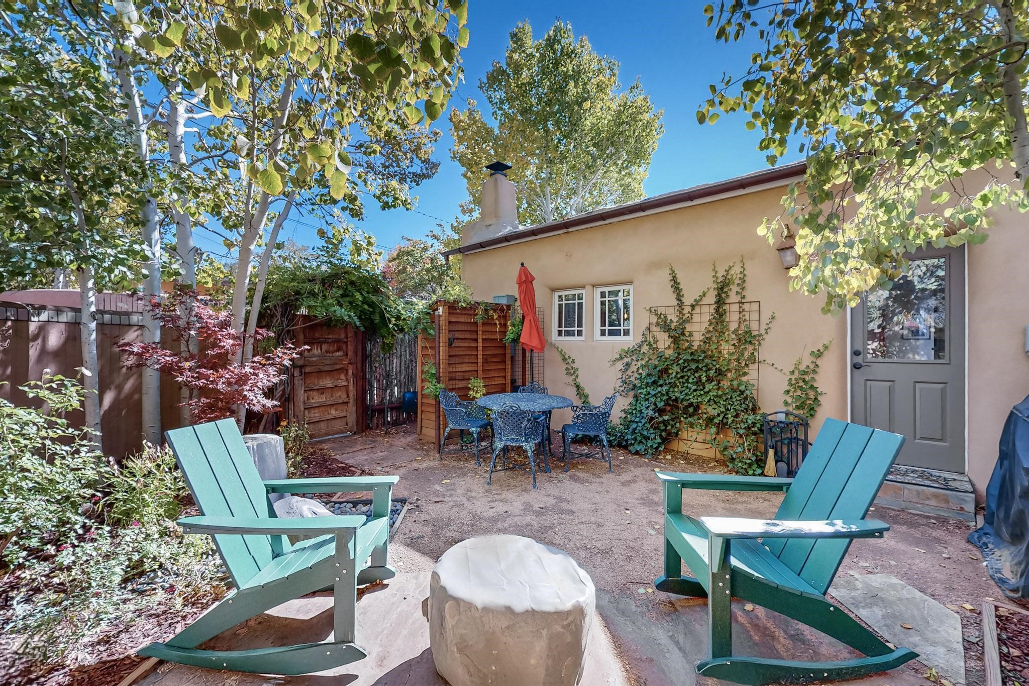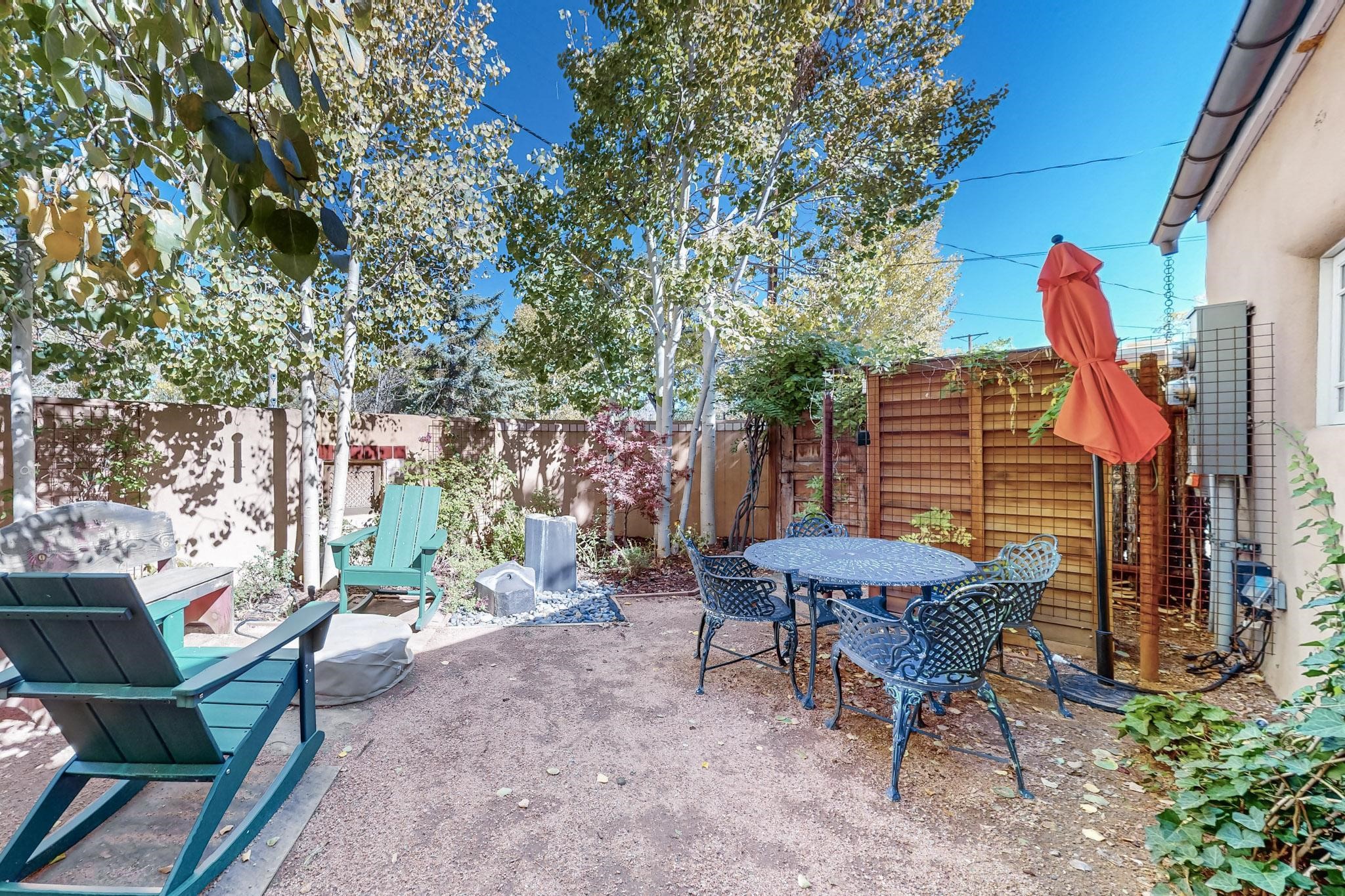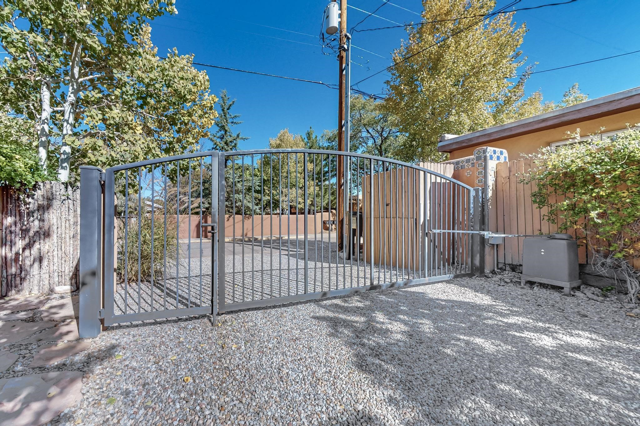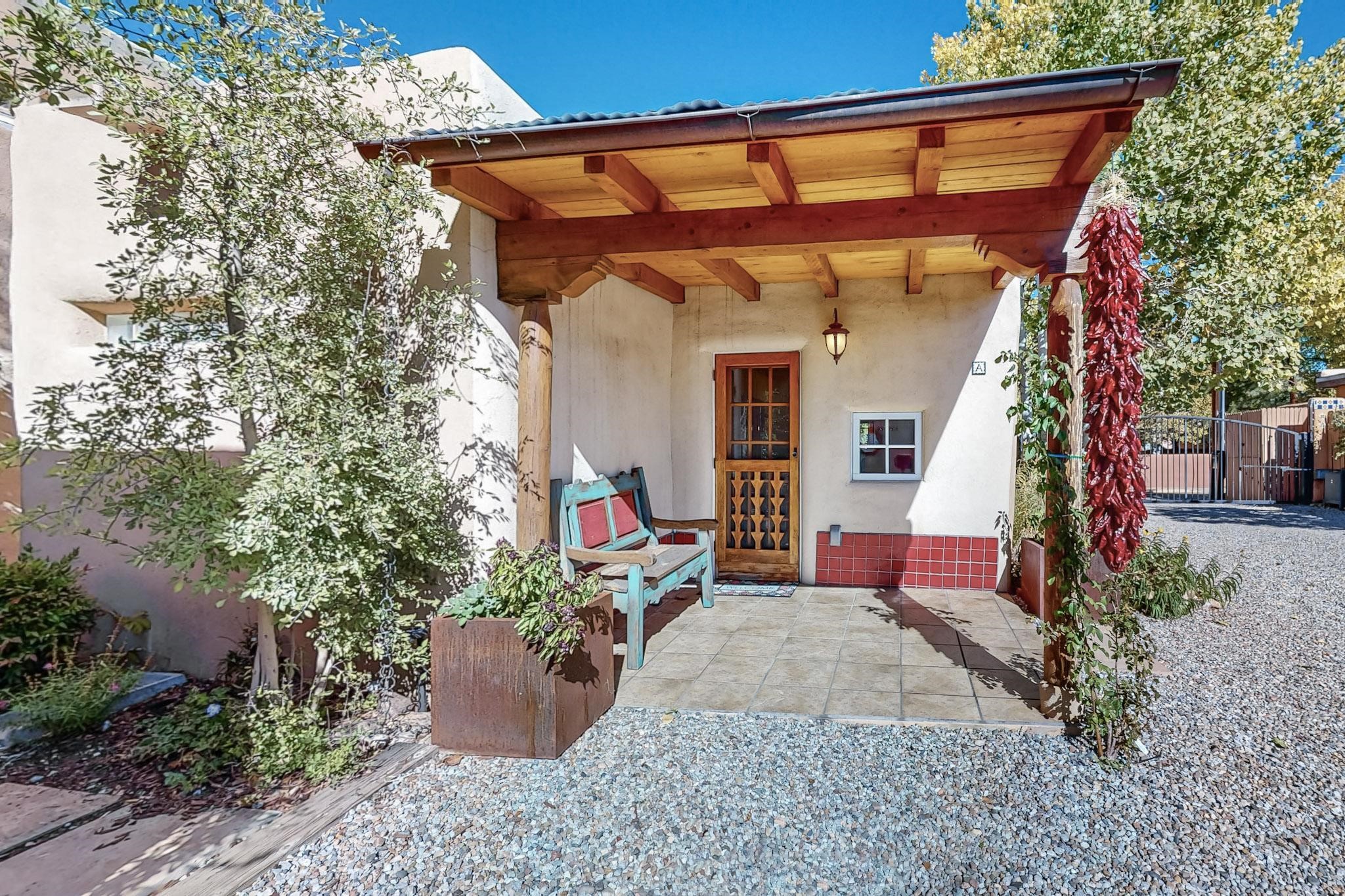 Rarely does a condo in the gated Assisi Compound become available. The Compound is beautifully maintained, landscaped and located in the vibrant Railyard/Guadalupe area. Oozing with charm, character and attention to detail, Casa Wren is one of the seven distinctively unique units. A gracious vigas and beamed portal shelters the front entrance. Inside, elegant architectural details including rounded bullnose corners, clerestory windows, beamed ceilings, Venetian plaster, skylights and a Kiva fireplace. Galley-style kitchen with wood cabinetry, Quartz countertops, ceramic double sink, tile backsplash and new appliances. Open and bright Living/Dining with a wood burning Kiva fireplace and stone flooring that continues into the en-suite bedroom. Matisse wall tiles, slate floors, new mini-splits, bathroom tub and tankless hot water. Private garden, off the living room, with its' own secret entrance. Water feature, fire pit, landscaping and storage shed. Stucco walls enclose the property. 1 parking place and no street parking permit required.