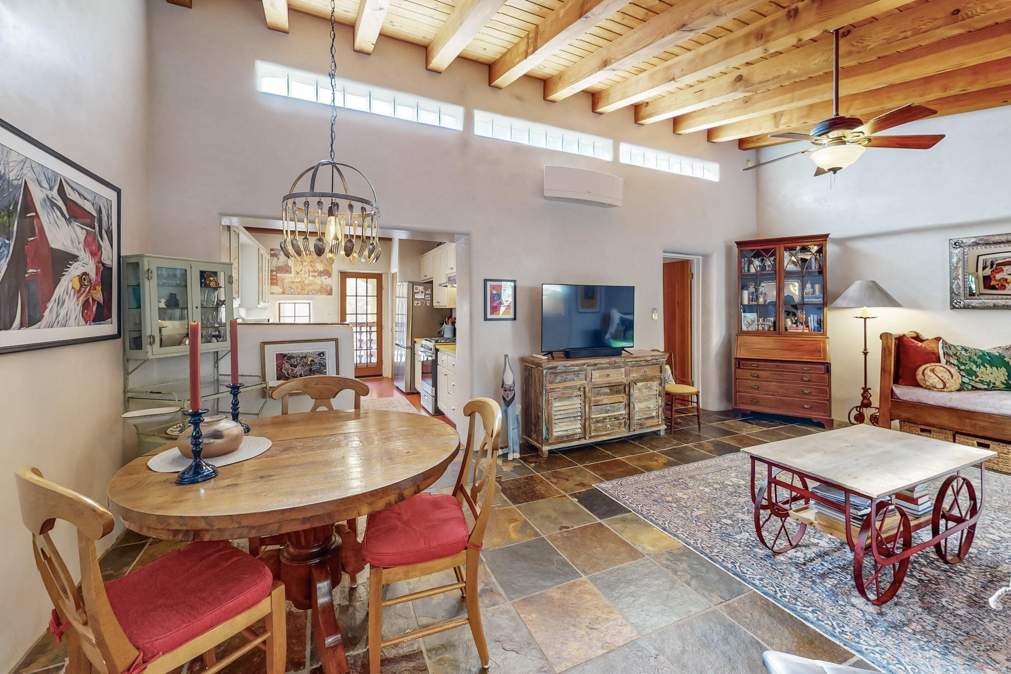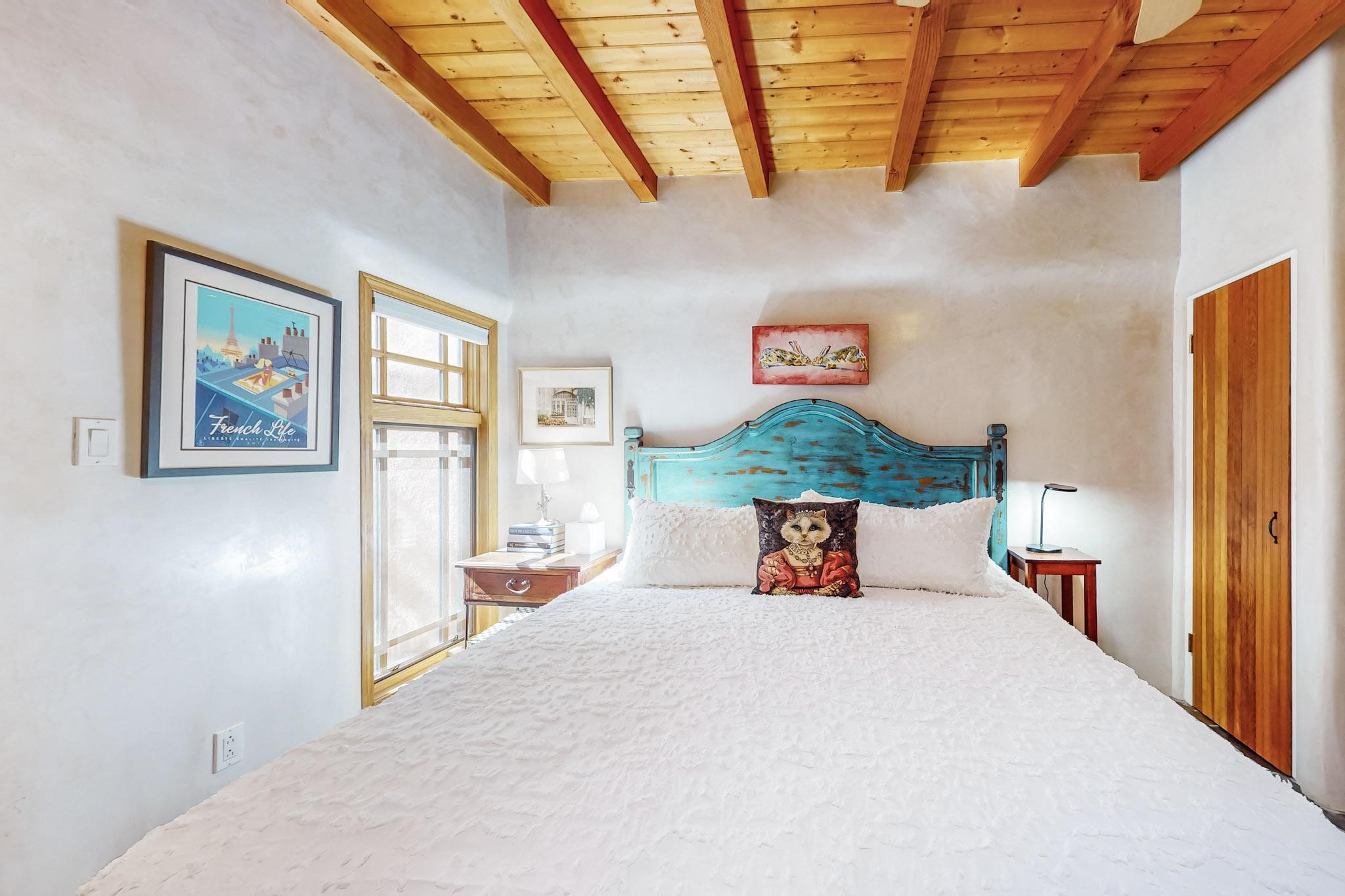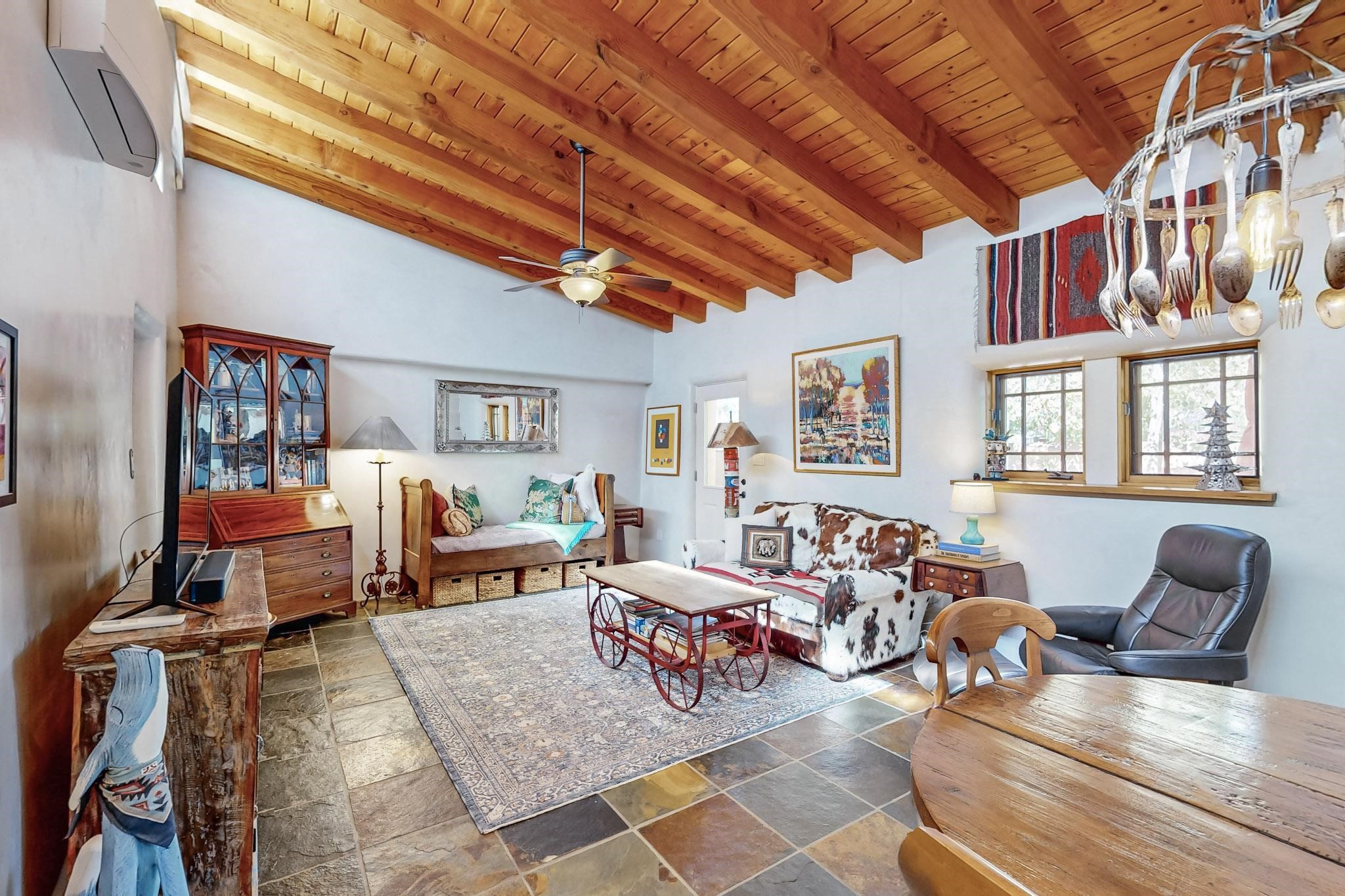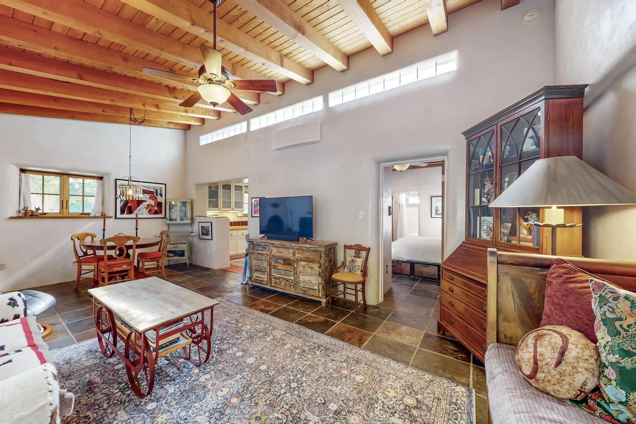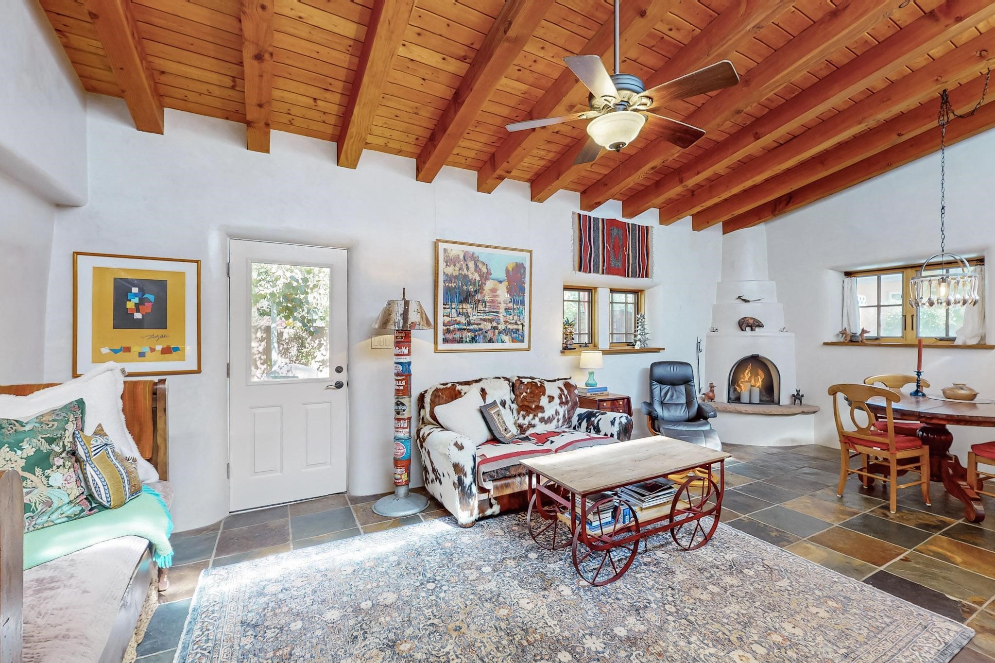 Rarely does a condo in the gated Assisi Compound become available. The Compound is beautifully maintained, landscaped and located in the vibrant Railyard/Guadalupe area. Oozing with charm, character and attention to detail, Casa Wren is one of the seven distinctively unique units. A gracious vigas and beamed portal shelters the front entrance. Inside, elegant architectural details including rounded bullnose corners, clerestory windows, beamed ceilings, Venetian plaster, skylights and a Kiva fireplace. Galley-style kitchen with wood cabinetry, Quartz countertops, ceramic double sink, tile backsplash and new appliances. Open and bright Living/Dining with a wood burning Kiva fireplace and stone flooring that continues into the en-suite bedroom. Matisse wall tiles, slate floors, new mini-splits, bathroom tub and tankless hot water. Private garden, off the living room, with its' own secret entrance. Water feature, fire pit, landscaping and storage shed. Stucco walls enclose the property. 1 parking place and no street parking permit required.
