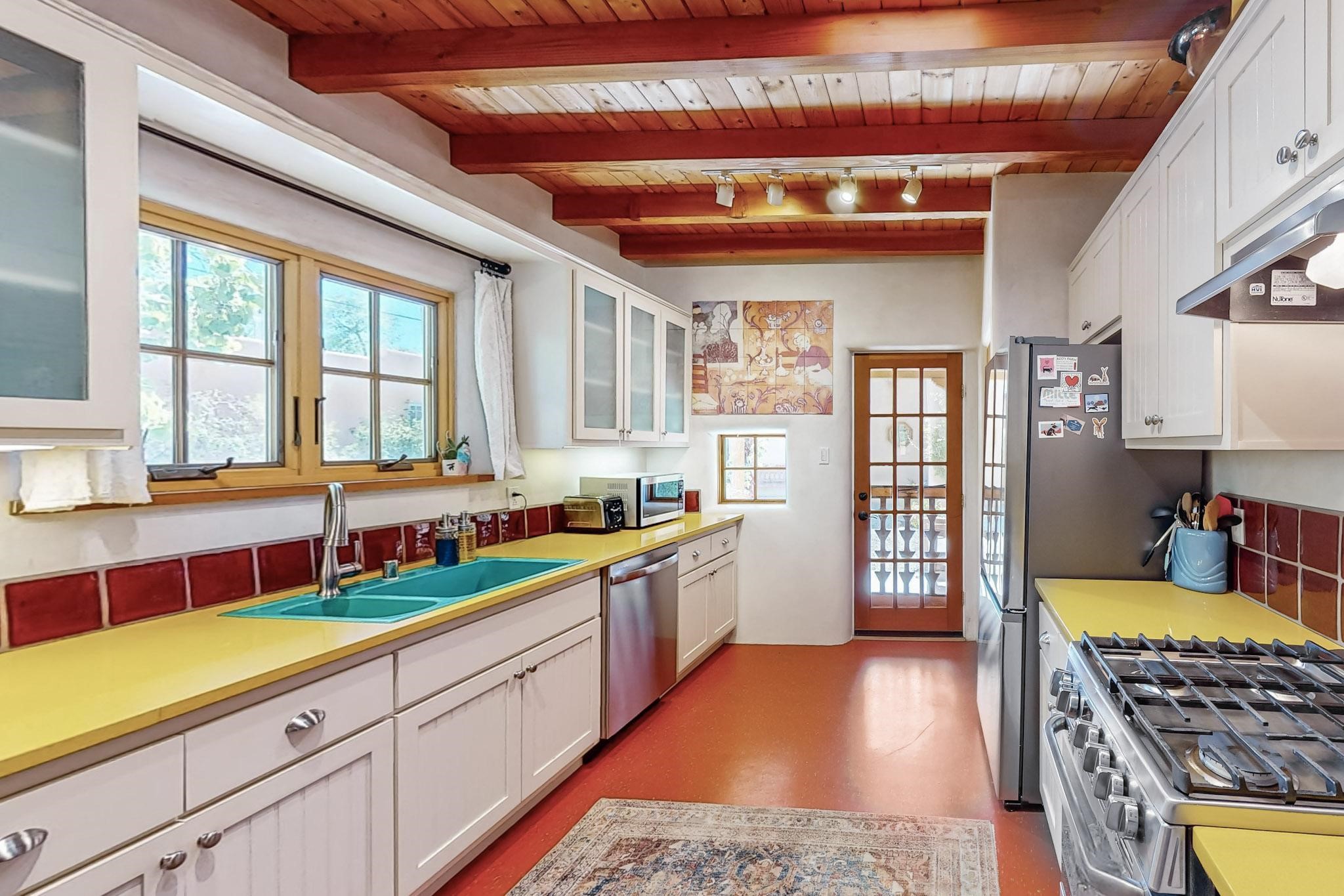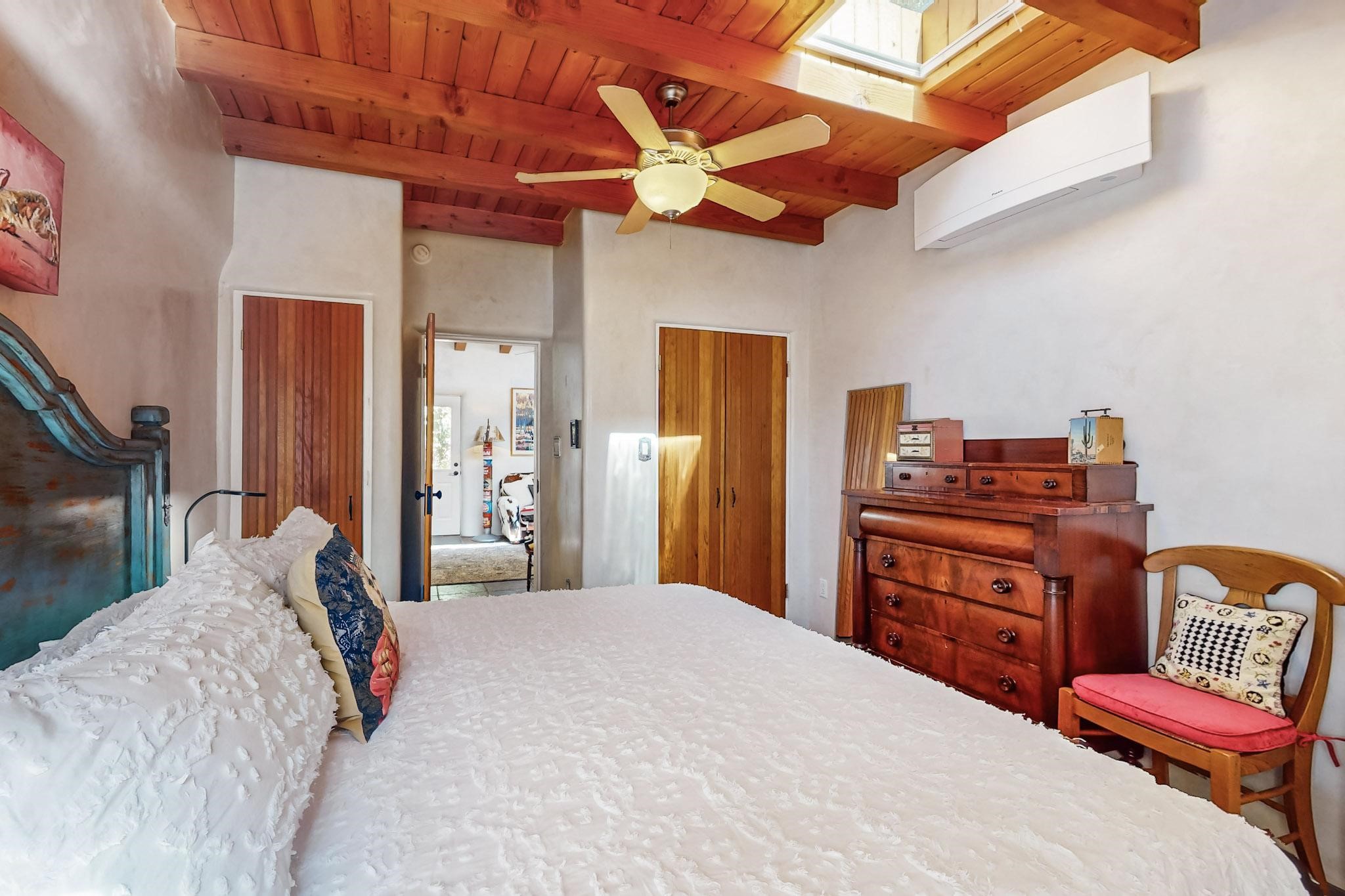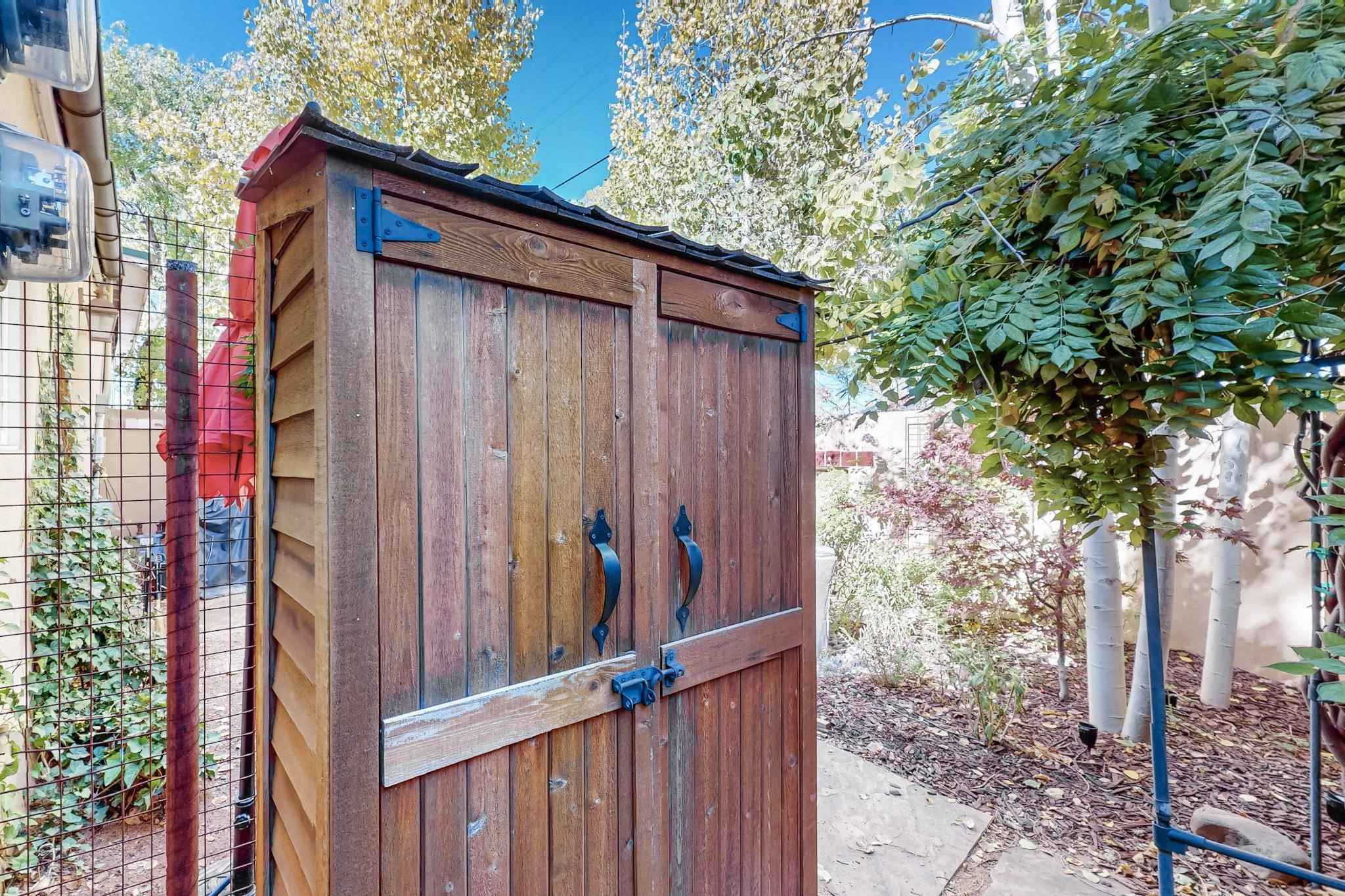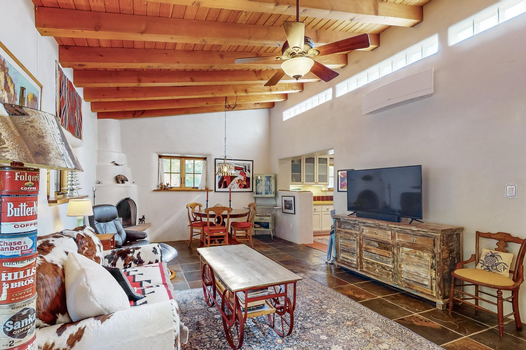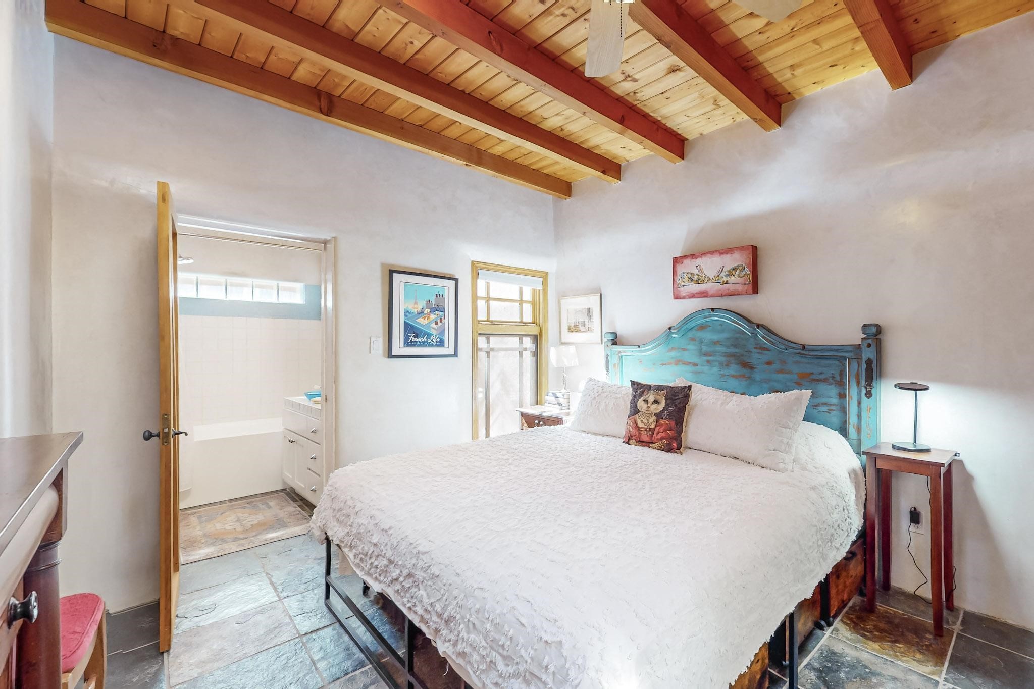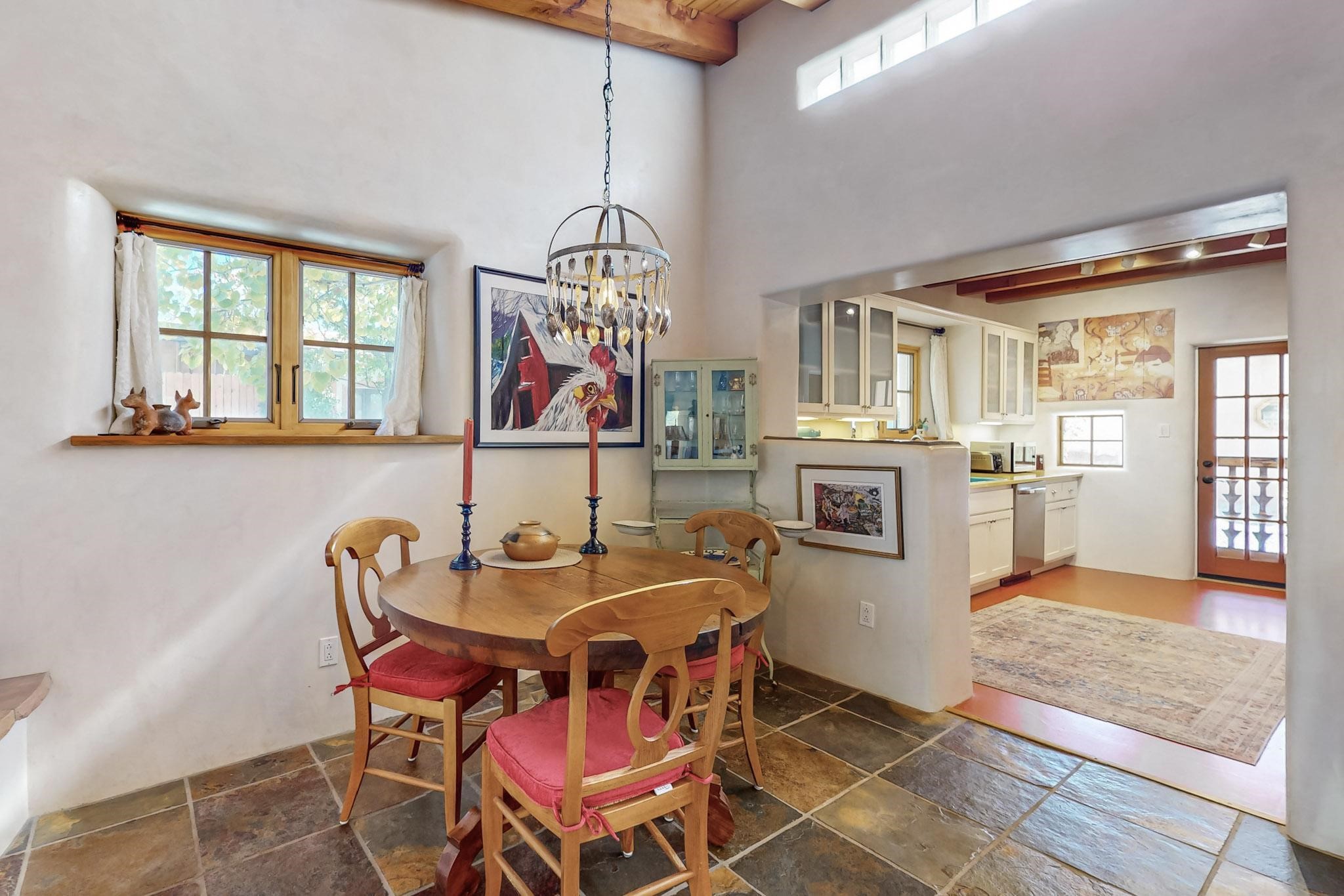 Rarely does a condo in the gated Assisi Compound become available. The Compound is beautifully maintained, landscaped and located in the vibrant Railyard/Guadalupe area. Oozing with charm, character and attention to detail, Casa Wren is one of the seven distinctively unique units. A gracious vigas and beamed portal shelters the front entrance. Inside, elegant architectural details including rounded bullnose corners, clerestory windows, beamed ceilings, Venetian plaster, skylights and a Kiva fireplace. Galley-style kitchen with wood cabinetry, Quartz countertops, ceramic double sink, tile backsplash and new appliances. Open and bright Living/Dining with a wood burning Kiva fireplace and stone flooring that continues into the en-suite bedroom. Matisse wall tiles, slate floors, new mini-splits, bathroom tub and tankless hot water. Private garden, off the living room, with its' own secret entrance. Water feature, fire pit, landscaping and storage shed. Stucco walls enclose the property. 1 parking place and no street parking permit required.