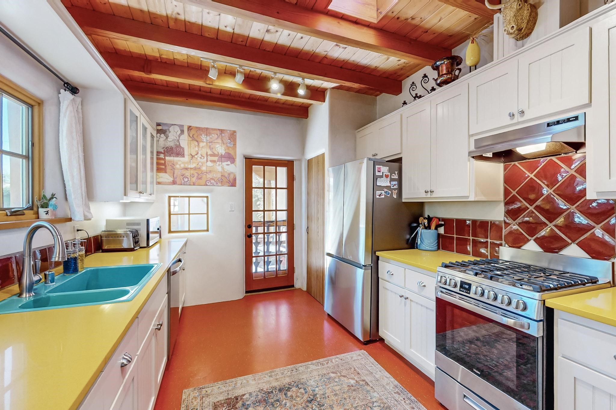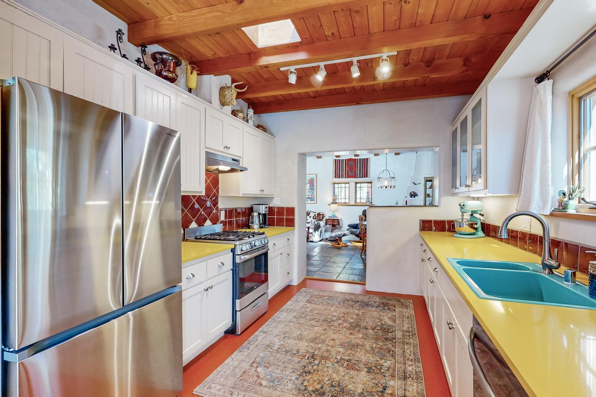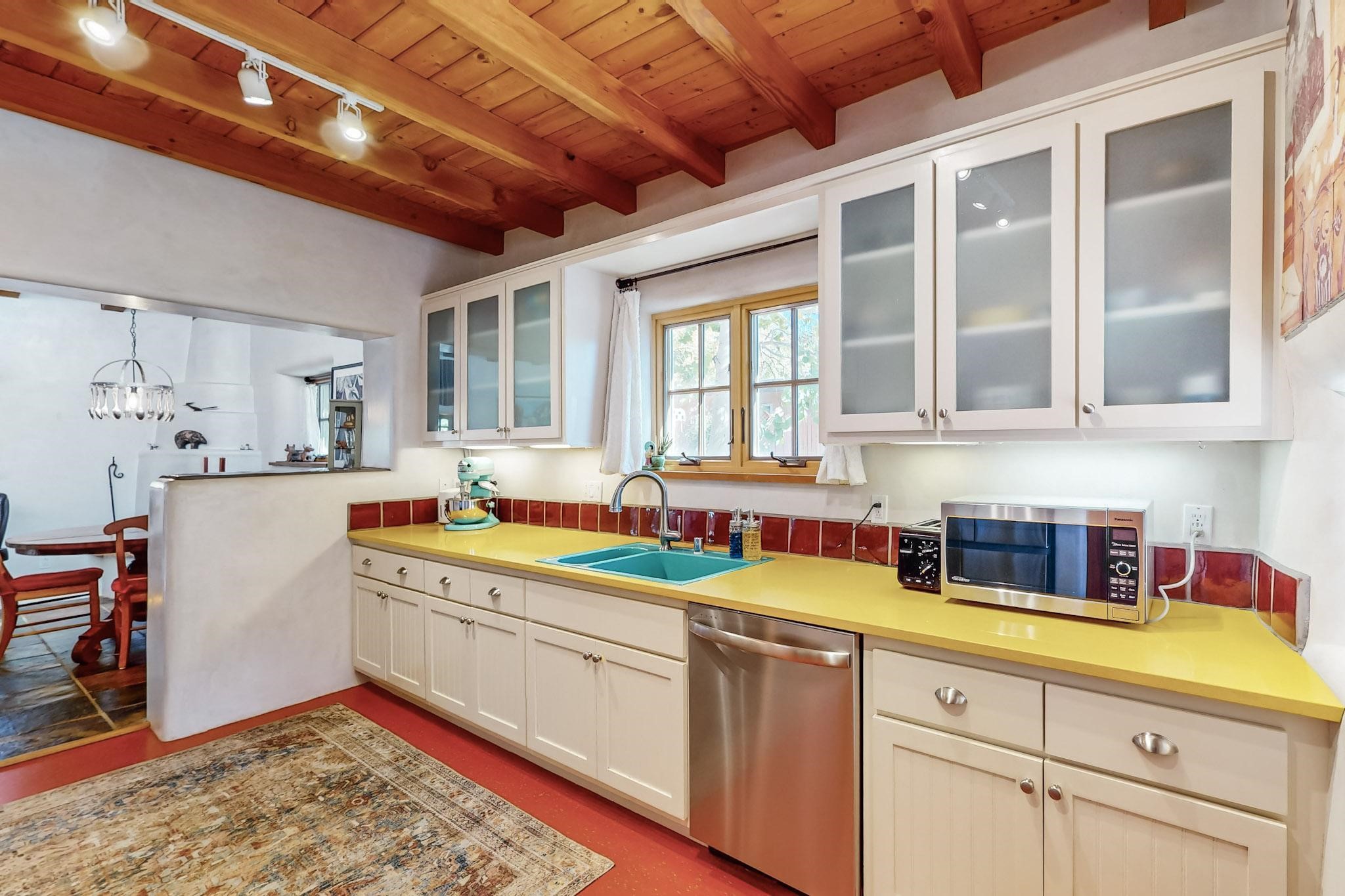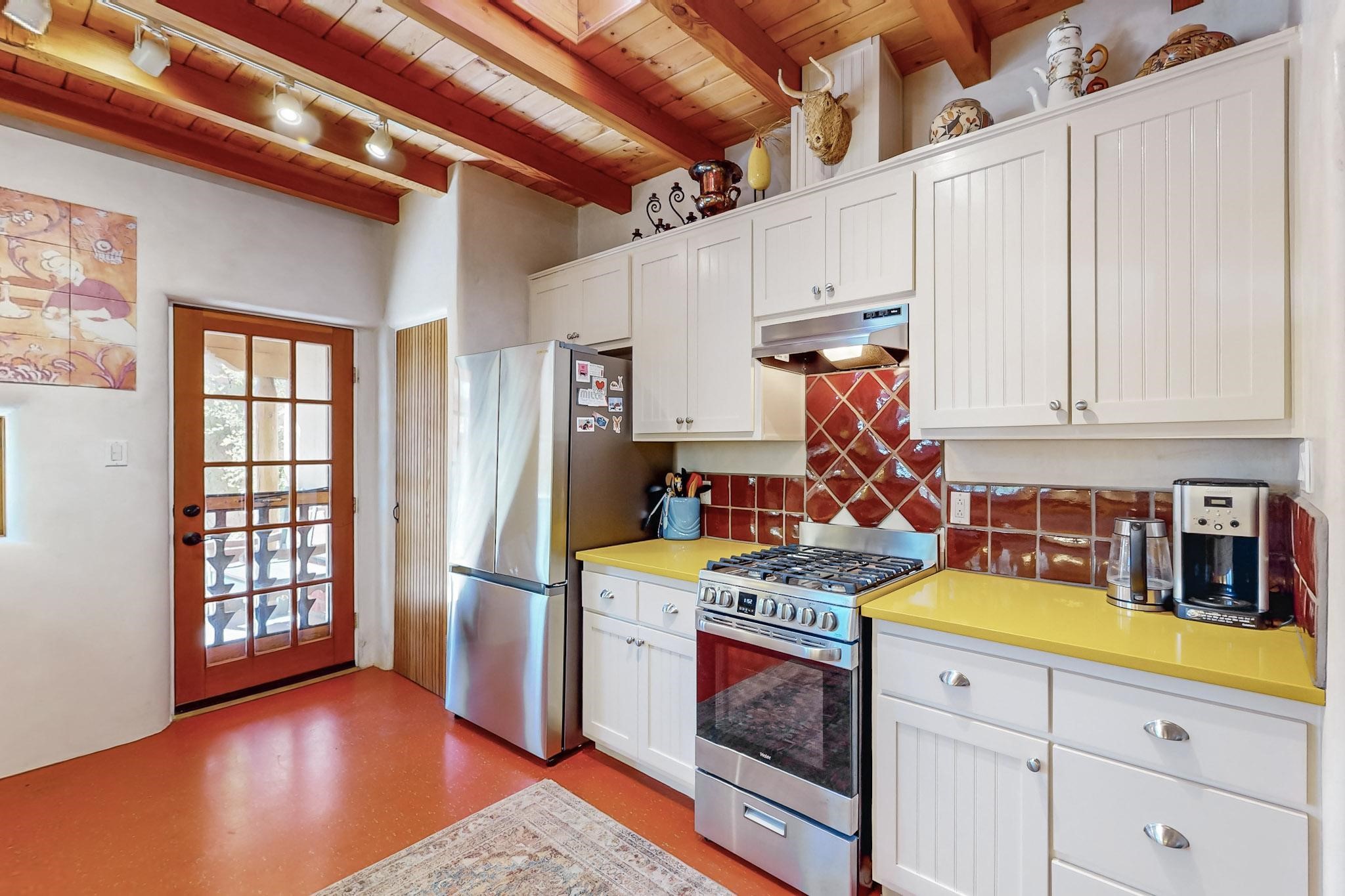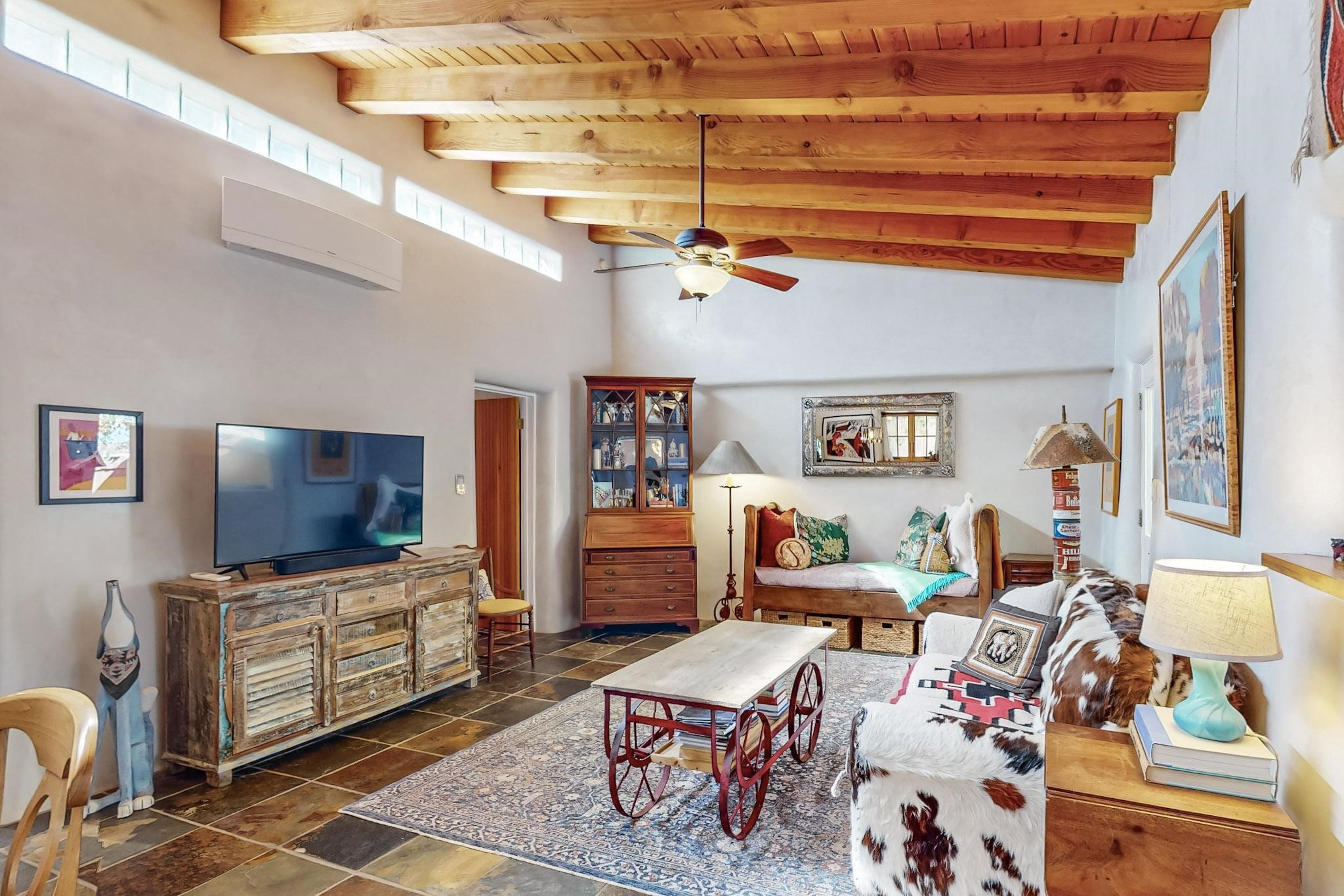 Rarely does a condo in the gated Assisi Compound become available. The Compound is beautifully maintained, landscaped and located in the vibrant Railyard/Guadalupe area. Oozing with charm, character and attention to detail, Casa Wren is one of the seven distinctively unique units. A gracious vigas and beamed portal shelters the front entrance. Inside, elegant architectural details including rounded bullnose corners, clerestory windows, beamed ceilings, Venetian plaster, skylights and a Kiva fireplace. Galley-style kitchen with wood cabinetry, Quartz countertops, ceramic double sink, tile backsplash and new appliances. Open and bright Living/Dining with a wood burning Kiva fireplace and stone flooring that continues into the en-suite bedroom. Matisse wall tiles, slate floors, new mini-splits, bathroom tub and tankless hot water. Private garden, off the living room, with its' own secret entrance. Water feature, fire pit, landscaping and storage shed. Stucco walls enclose the property. 1 parking place and no street parking permit required.