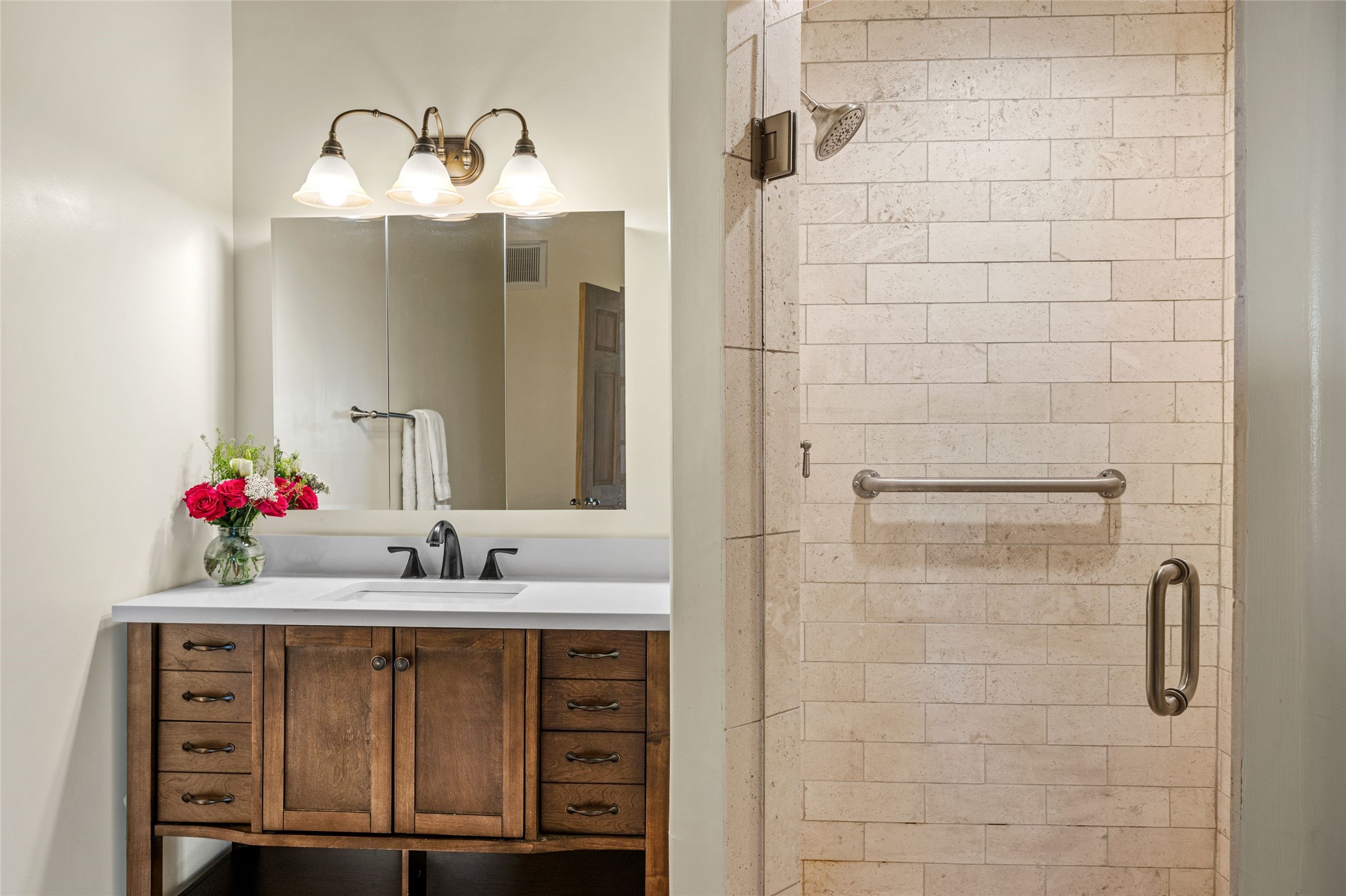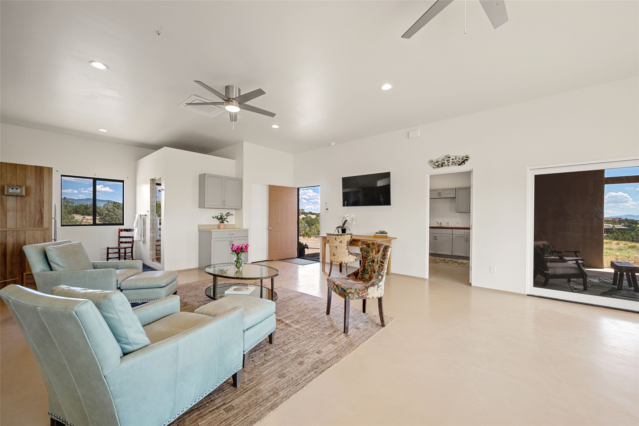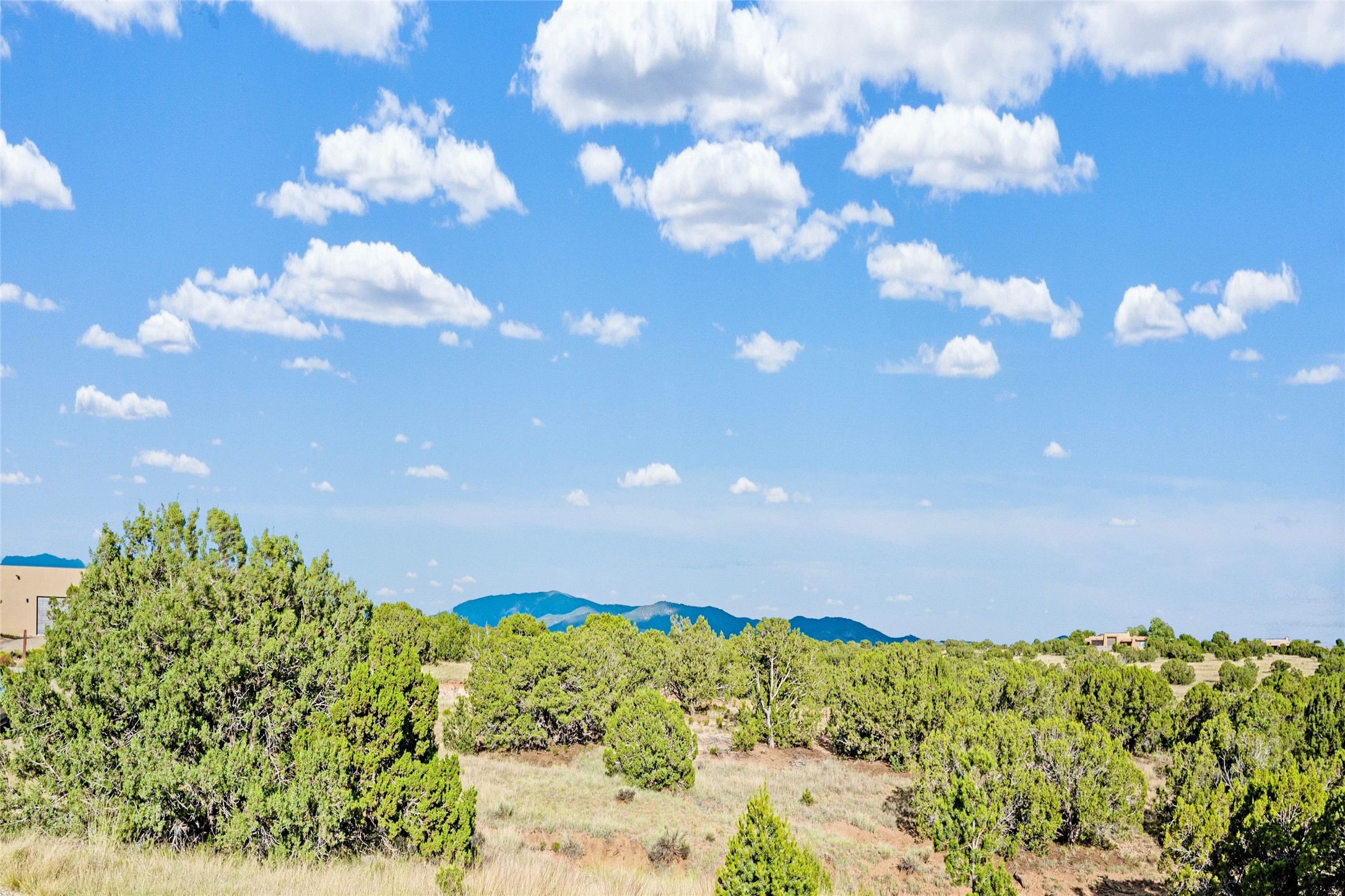 Light and bright two-bedroom home with large studio or guesthouse and Sangre de Cristo Mountain views. Set in a gated and peaceful compound between Aldea and Las Campanas, this beautifully designed home offers a rare combination of natural beauty, privacy, and versatile living. This 2,215 square foot residence, built in 2021 and feels brand new! The home enjoys a modern floor plan featuring high ceilings with light wood vigas, travertine tile floors, a gas fireplace and a lovely modern kitchen. The separate studio/office or guest house provides many options for a flexible lifestyle. Surrounded by pion and juniper trees but just minutes from town, this property is a true Santa Fe retreat, set on 2.5 acres that provide dramatic sunsets, and the quiet serenity of open skies. The large windows welcome natural light for style and comfortable living space, perfect for relaxing or entertaining. The kitchen is both functional and stylish, featuring stainless steel appliances, custom wood cabinetry, and room for a large dining table. Two bedrooms in the main house share a spacious bathroom. From the front portal, enjoy breathtaking mountain views and morning light. On the back portal, the property opens to quiet nature and big-sky vistas. Connected to the home, but with a private entrance, the large, attached studio offers endless possibilities. Whether used as a guest suite, creative workspace, home office, gym, or wellness retreat this generous space includes a kitchenette, large living/sleeping area, dry sauna, steam shower, and access to a private covered portal perfect for enjoying stunning Santa Fe sunsets. Comfortable year-round with radiant floor heating and mini-splits, this home is ideal for those seeking beauty, versatility, and a connection to the land--all without sacrificing convenience. Located just minutes from downtown Santa Fe, yet worlds away from the hustle and bustle, this unique property captures the essence of peaceful living in the high desert.