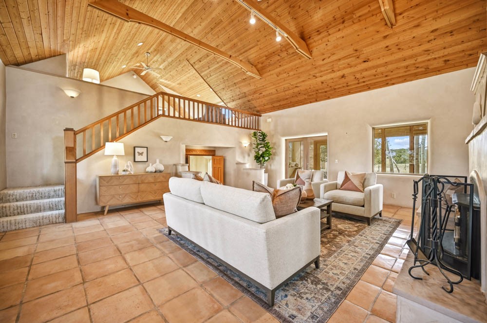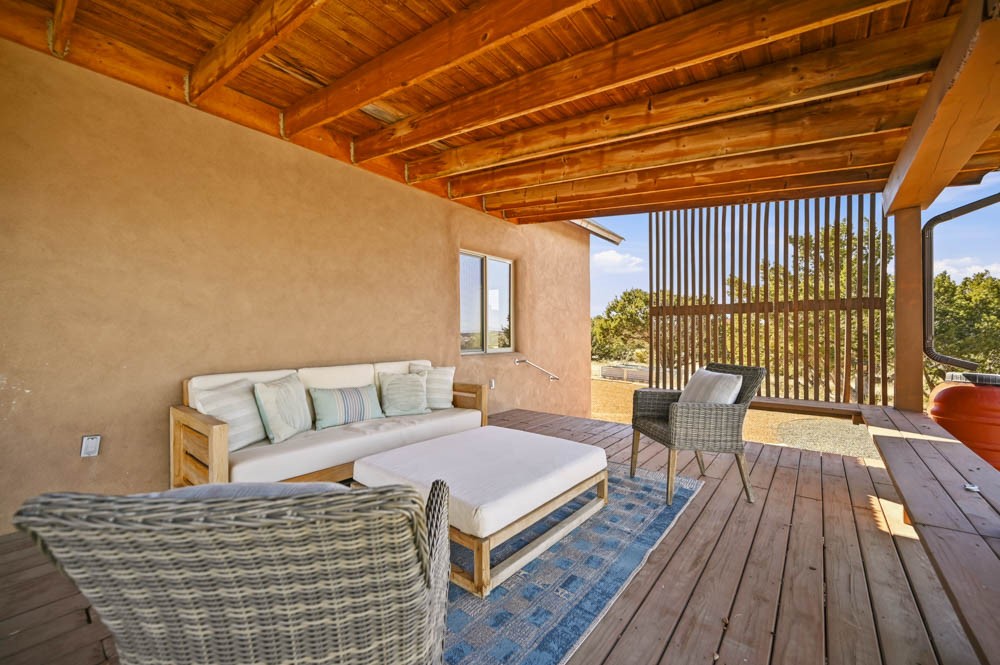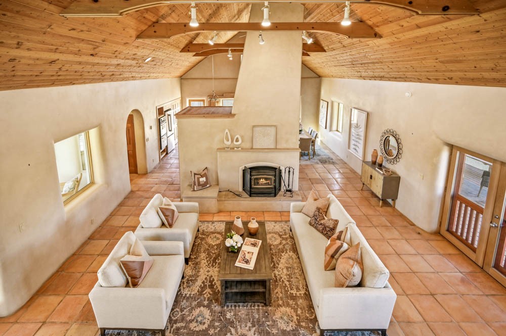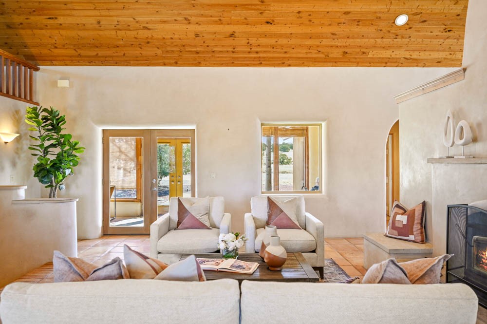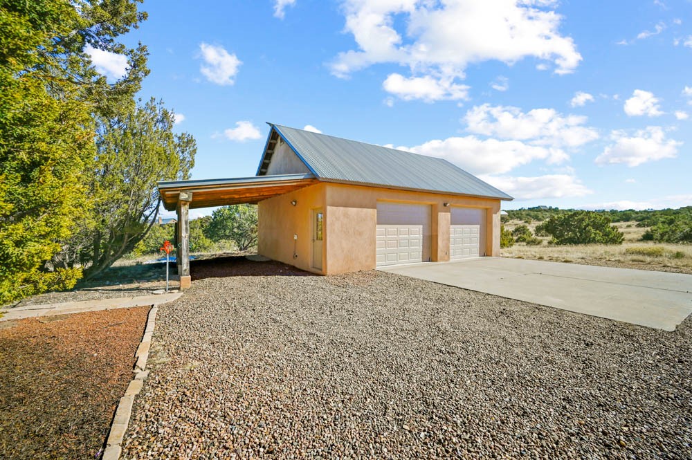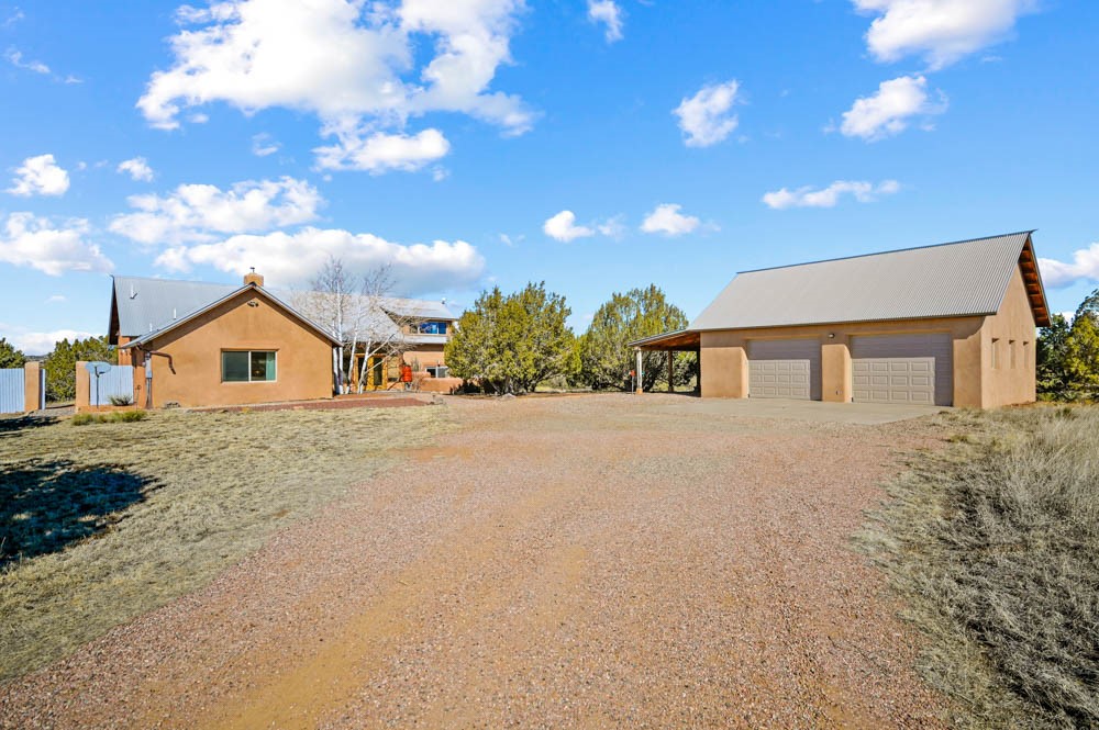 Nestled in the sought-after Art Barns area of Lamy, just a scenic 20-minute drive from Santa Fe, this distinctive 2-bedroom, 2-bath home offers a rare blend of privacy, character, and sweeping mountain views on 5.86 acres. Spanning 2,563 square feet, the residence features beautiful Saltillo tile flooring, comfortable in-floor radiant heating, and a flexible loft space ideal for a home office or family room. A pitched roof and classic Southwestern styling complement the surrounding landscape, while recent 2025 updates--including a new boiler, stucco repairs on the home, and brand-new stucco on the detached oversized 2-car garage--provide peace of mind. With expansive outdoor space, stunning vistas, and easy access to Eldorado's and Santa Fe's amenities, this property is an exceptional opportunity to enjoy serene high-desert living at its finest.