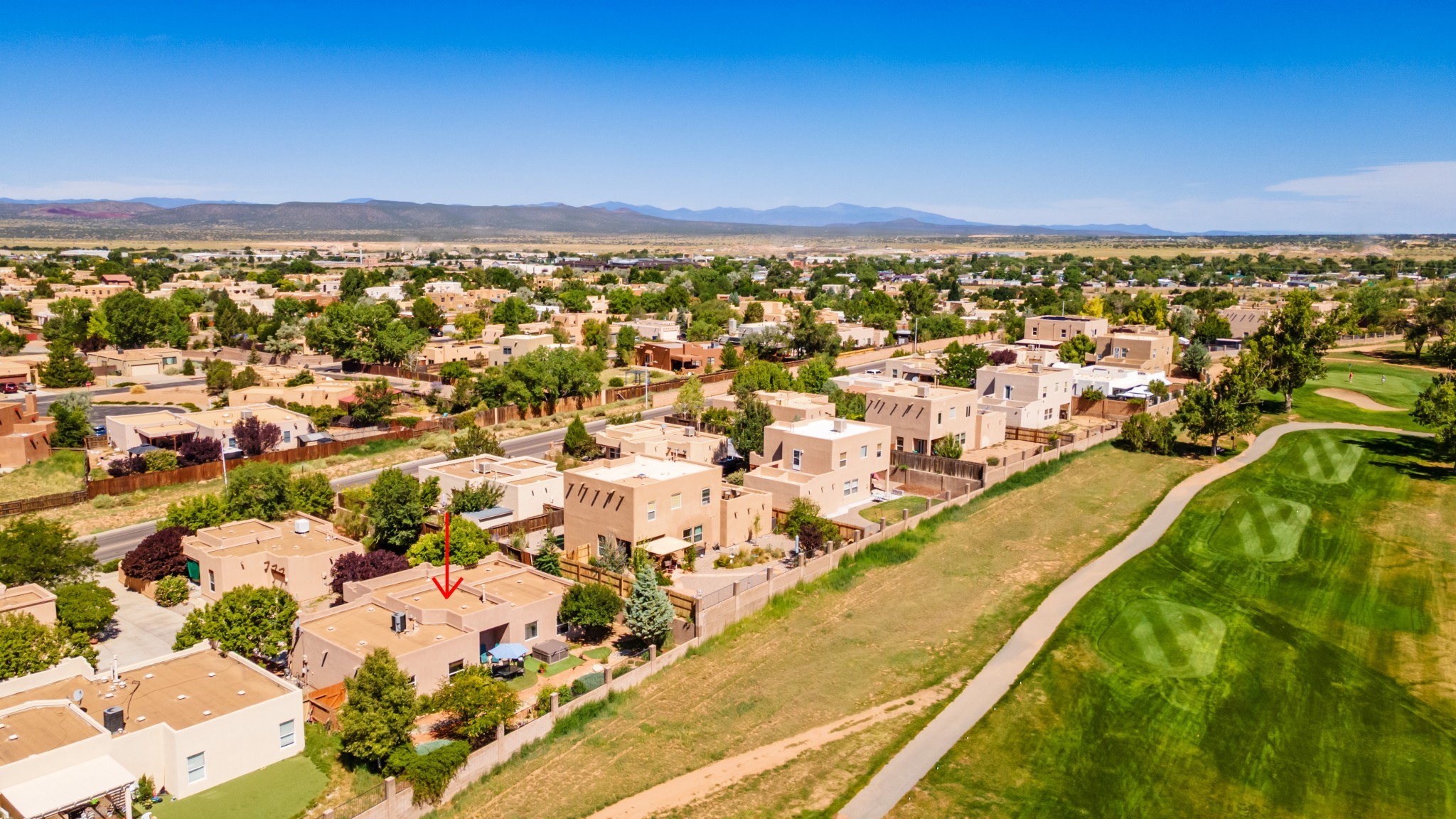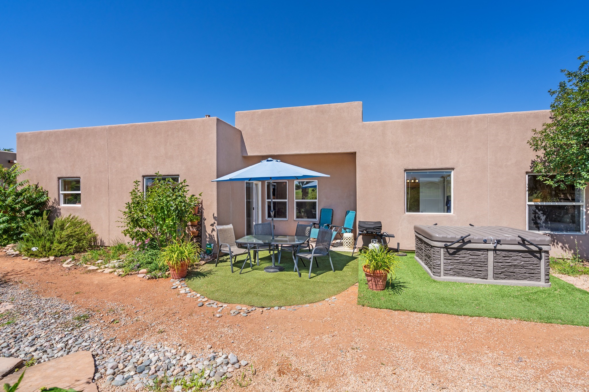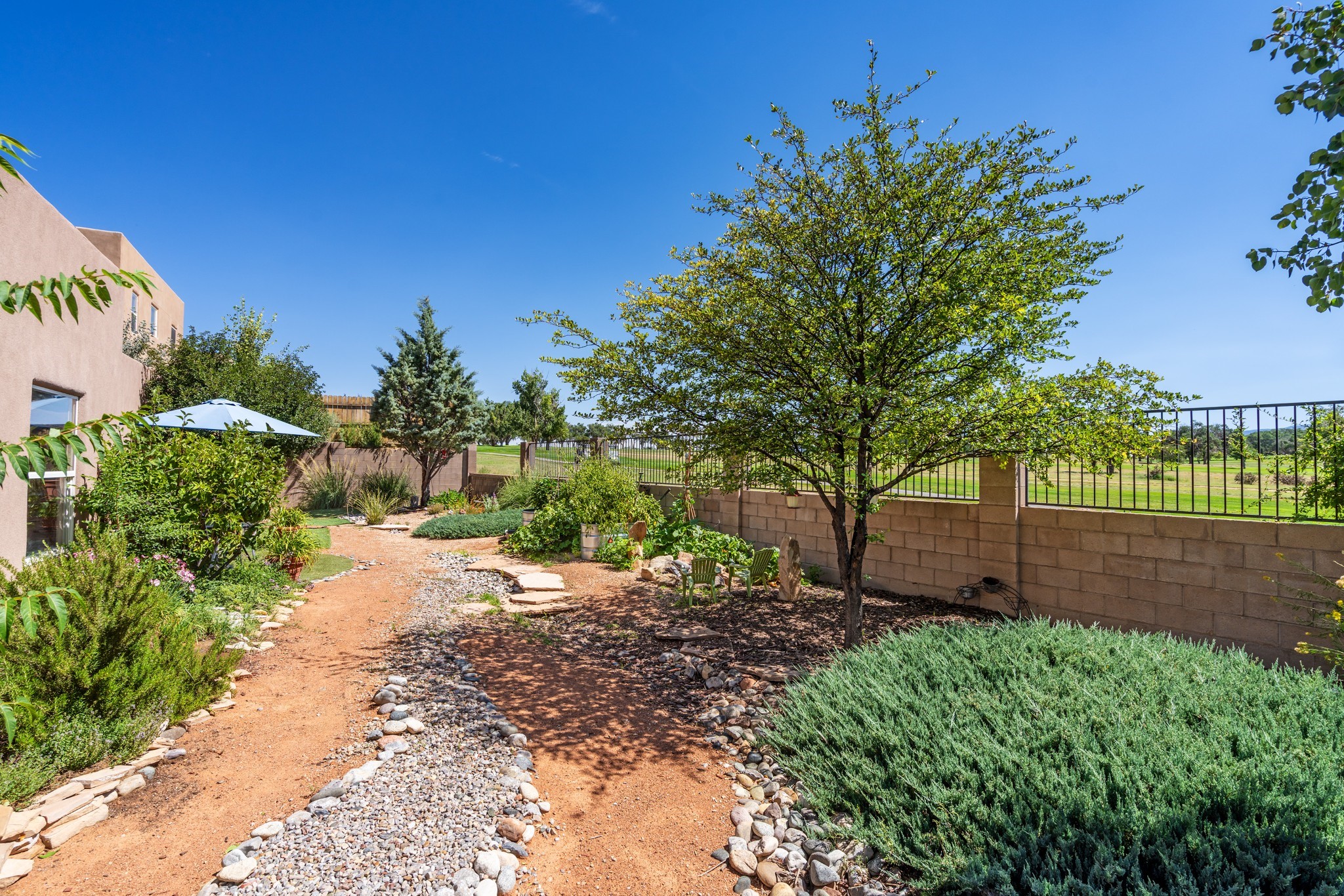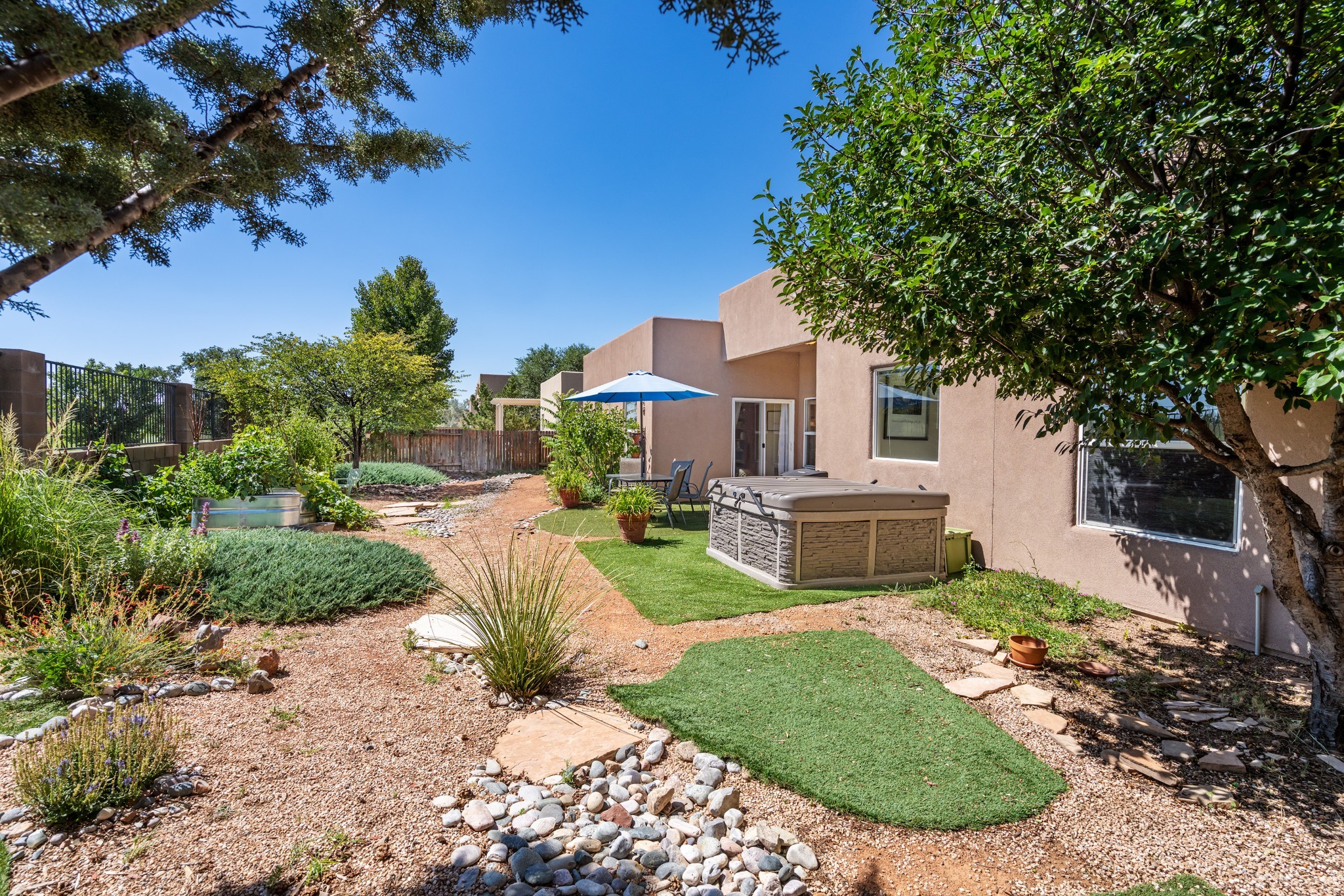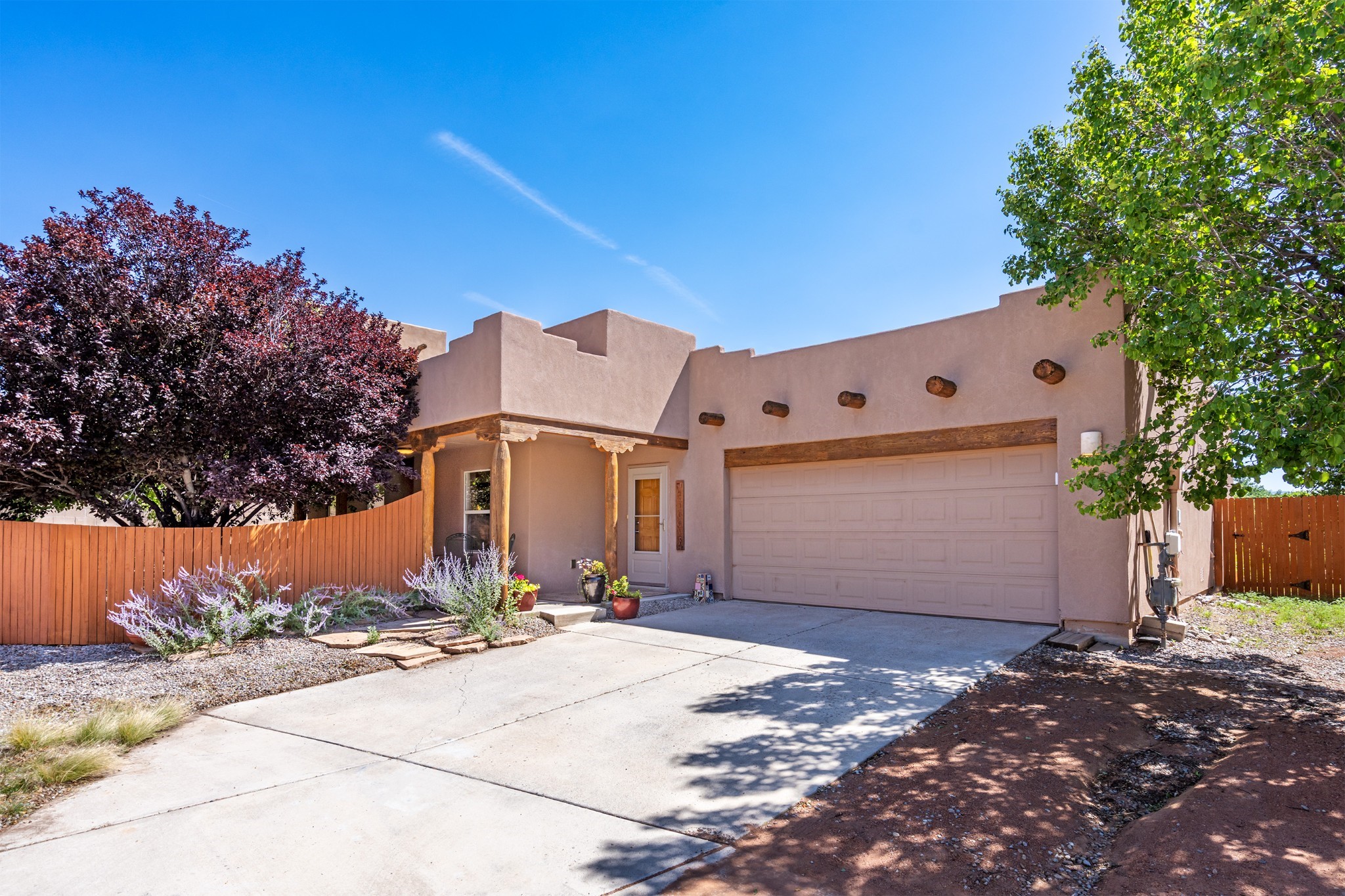 Beauty and peace abound in this light-filled home. Enjoy drinking coffee from the beautifully landscaped backyard adjacent to the cool, grassy, Santa Fe Country Club, where beautiful sunsets and sunrises are sure to delight. This home is sweetly positioned and tucked back off the road and nestled into a delightful backdrop. It's private and the home has an airy quality to it with its tall viga ceiling. The kitchen is spacious and has an eat in kitchen area. The oversized living room has a large window that looks out to the golf course and a lovely, gas fireplace. The main bedroom is gorgeous and spacious; the main bath has a stunning window over the soaking tub. Also you can enjoy soaking under the stars in the hot tub, which conveys. The home has ample storage, a 2 -car garage, a large laundry with pantry. The kitchen appliances are newer and there is a newer water heater. Conveniently located to the I-25 and 599 and there is no HOA! Visit this link to see interactive floor plan: https://visithome.ai/nJyyRSYqzomNteFuAd7J7r?mu=ft