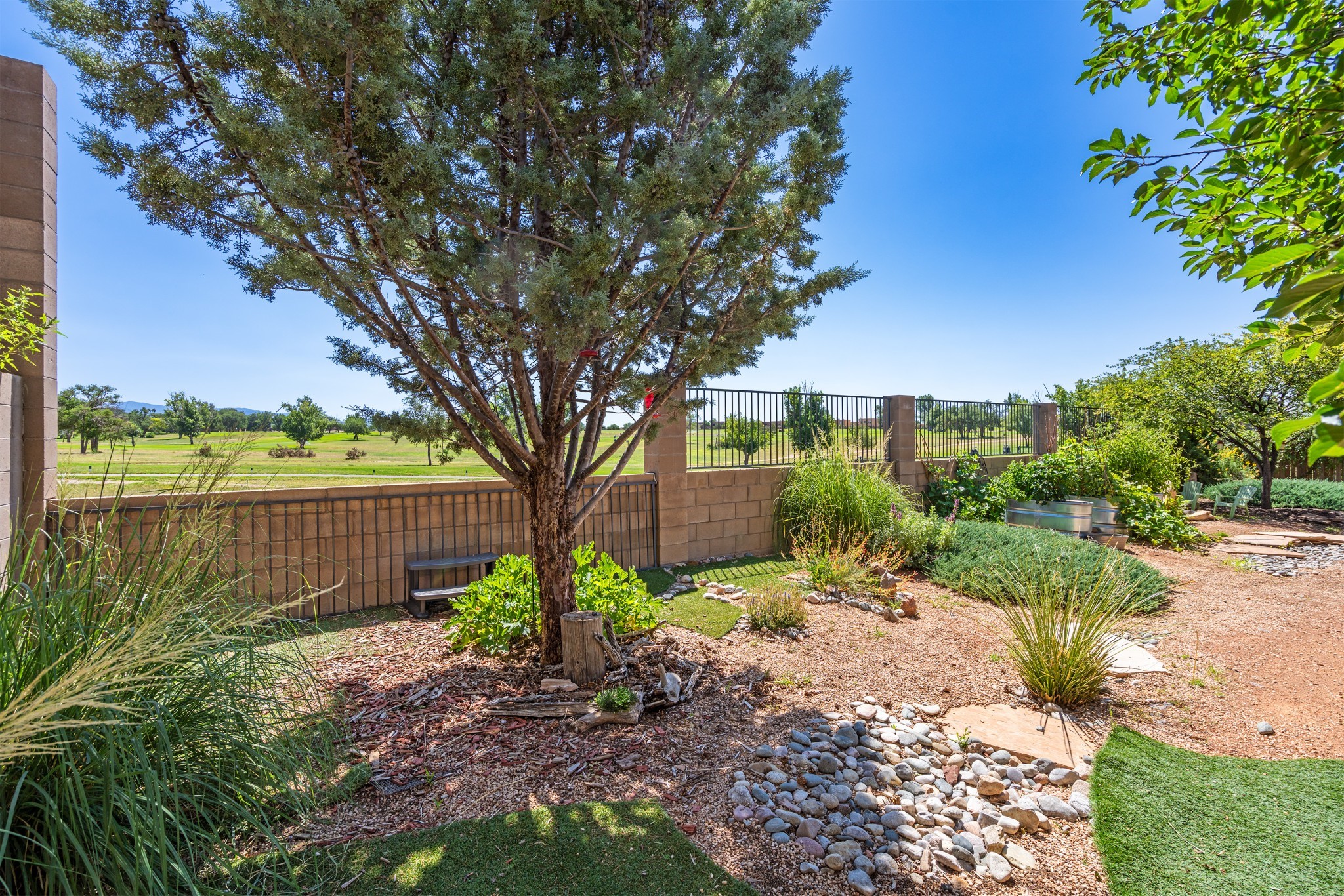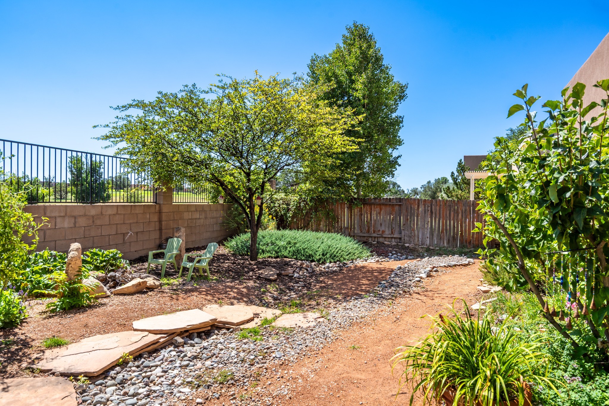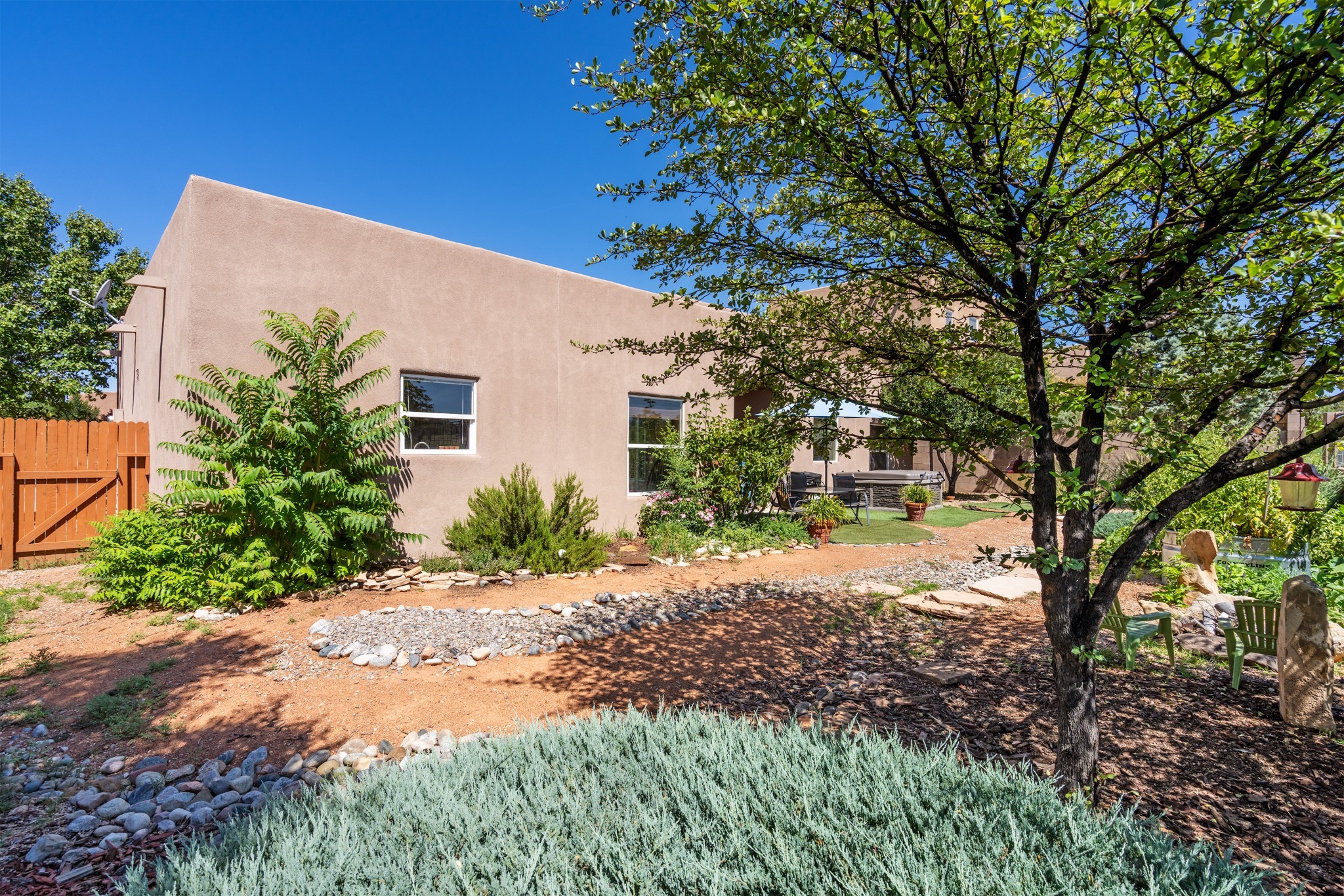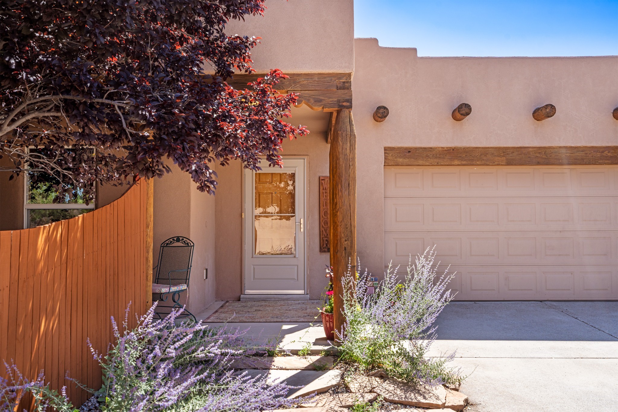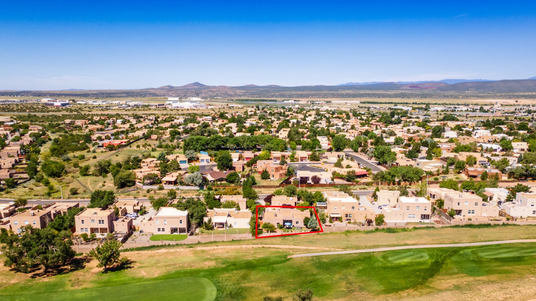 Beauty and peace abound in this light-filled home. Enjoy drinking coffee from the beautifully landscaped backyard adjacent to the cool, grassy, Santa Fe Country Club, where beautiful sunsets and sunrises are sure to delight. This home is sweetly positioned and tucked back off the road and nestled into a delightful backdrop. It's private and the home has an airy quality to it with its tall viga ceiling. The kitchen is spacious and has an eat in kitchen area. The oversized living room has a large window that looks out to the golf course and a lovely, gas fireplace. The main bedroom is gorgeous and spacious; the main bath has a stunning window over the soaking tub. Also you can enjoy soaking under the stars in the hot tub, which conveys. The home has ample storage, a 2 -car garage, a large laundry with pantry. The kitchen appliances are newer and there is a newer water heater. Conveniently located to the I-25 and 599 and there is no HOA! Visit this link to see interactive floor plan: https://visithome.ai/nJyyRSYqzomNteFuAd7J7r?mu=ft