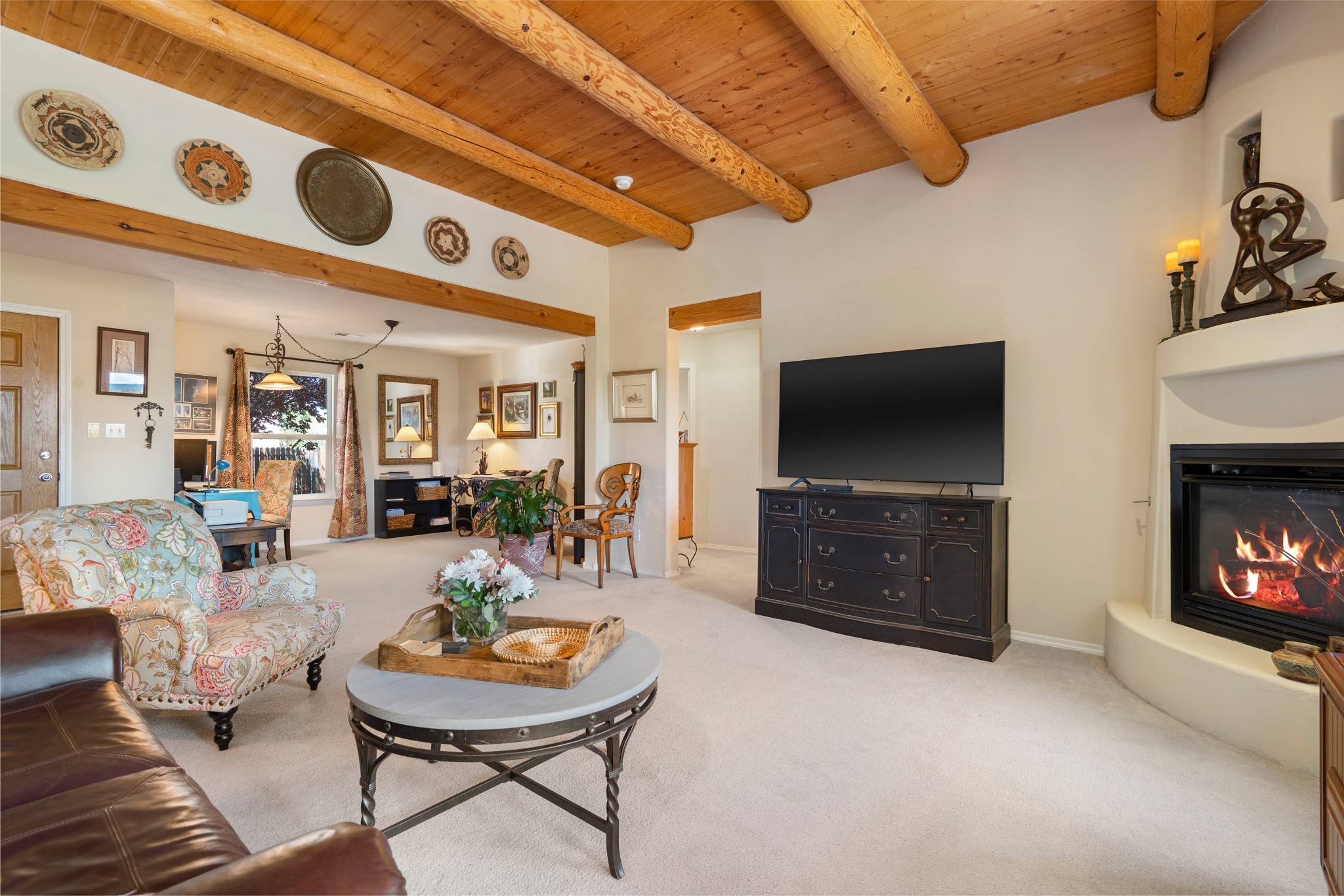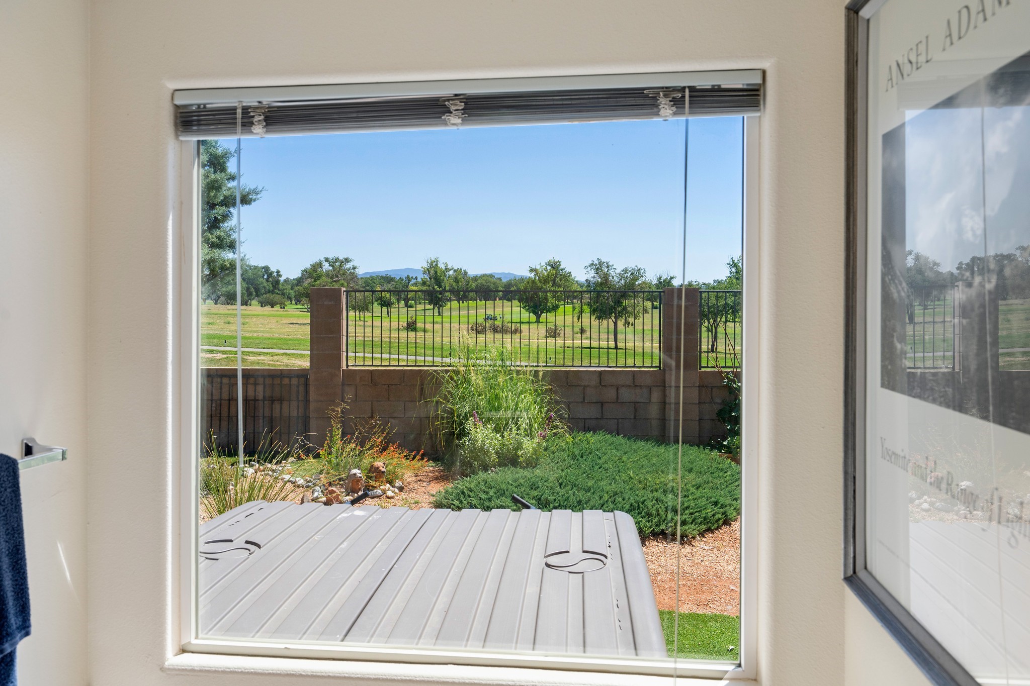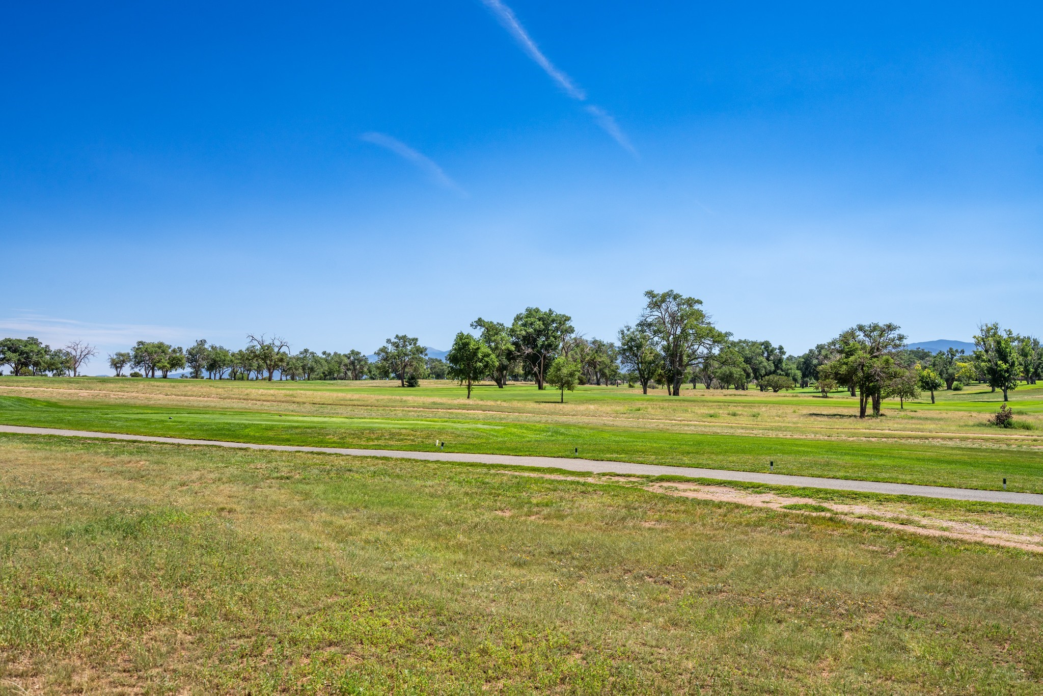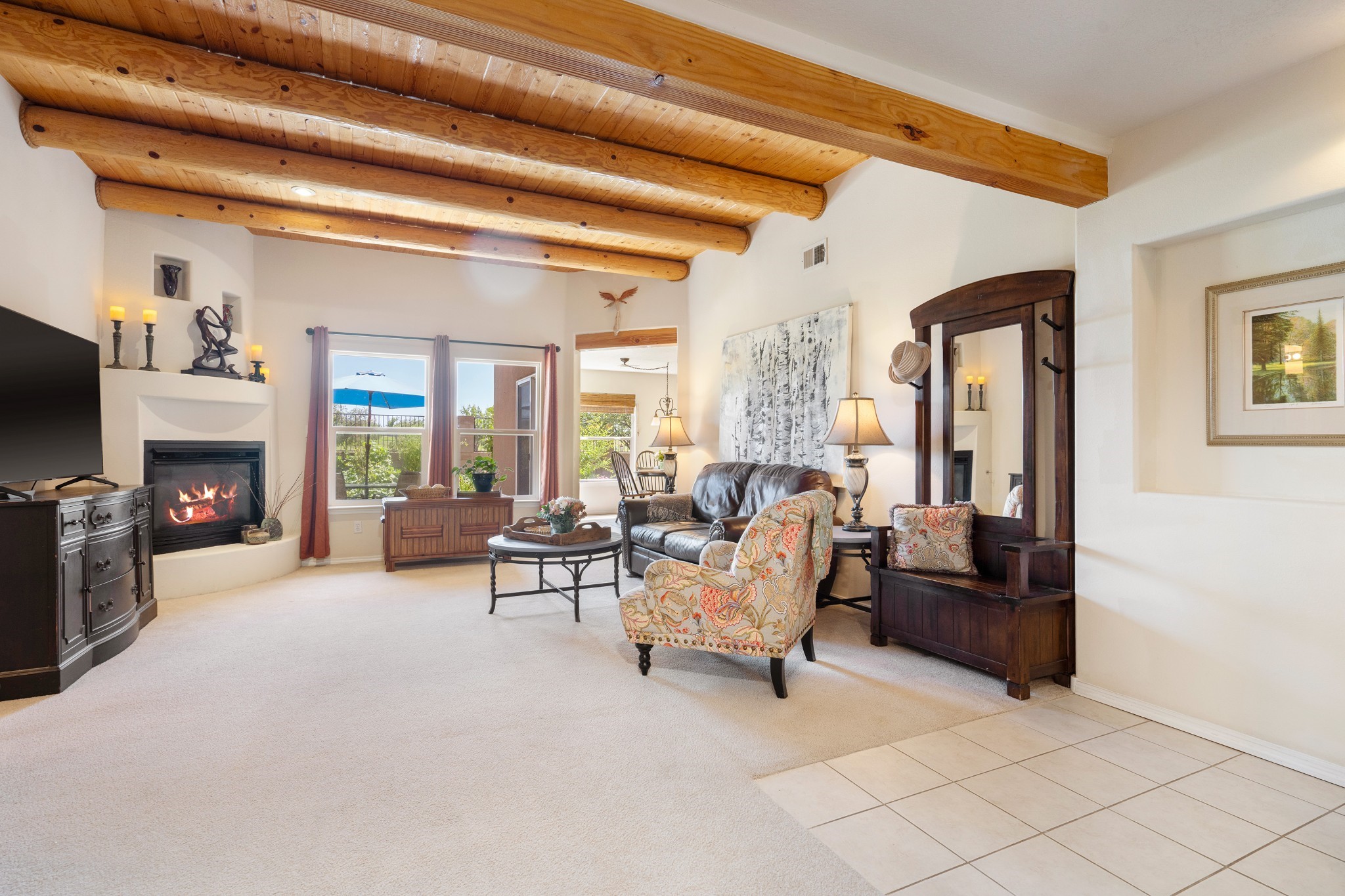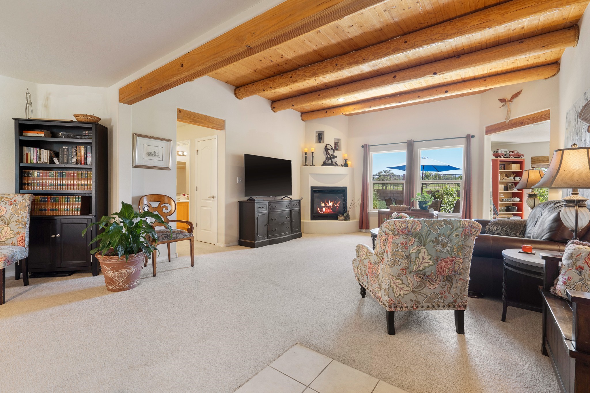 Beauty and peace abound in this light-filled home. Enjoy drinking coffee from the beautifully landscaped backyard adjacent to the cool, grassy, Santa Fe Country Club, where beautiful sunsets and sunrises are sure to delight. This home is sweetly positioned and tucked back off the road and nestled into a delightful backdrop. It's private and the home has an airy quality to it with its tall viga ceiling. The kitchen is spacious and has an eat in kitchen area. The oversized living room has a large window that looks out to the golf course and a lovely, gas fireplace. The main bedroom is gorgeous and spacious; the main bath has a stunning window over the soaking tub. Also you can enjoy soaking under the stars in the hot tub, which conveys. The home has ample storage, a 2 -car garage, a large laundry with pantry. The kitchen appliances are newer and there is a newer water heater. Conveniently located to the I-25 and 599 and there is no HOA! Visit this link to see interactive floor plan: https://visithome.ai/nJyyRSYqzomNteFuAd7J7r?mu=ft