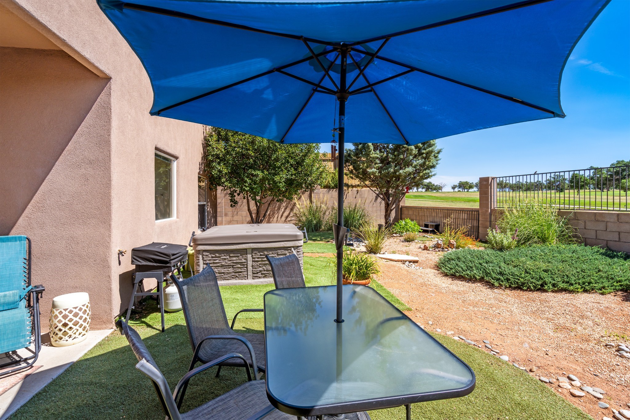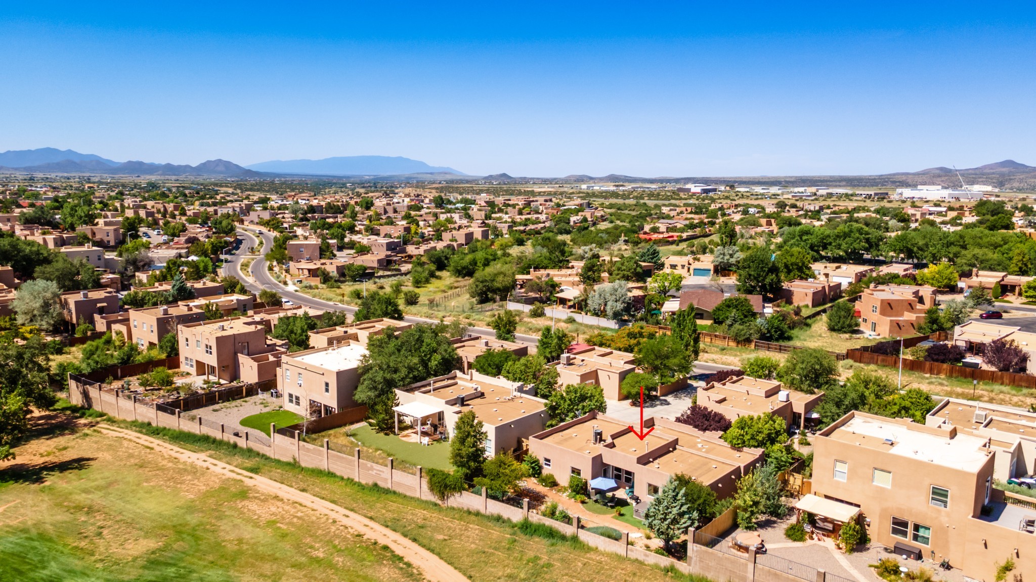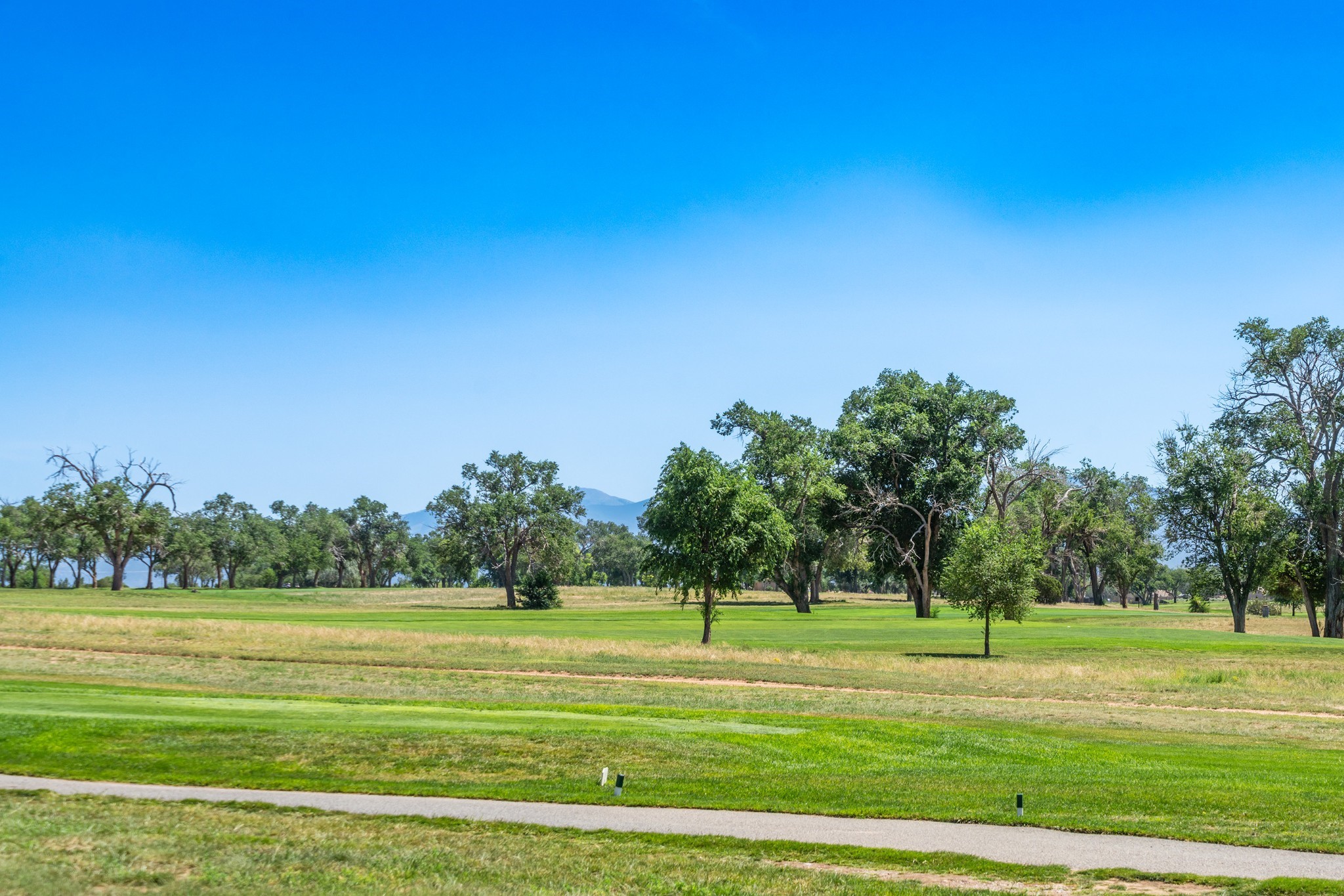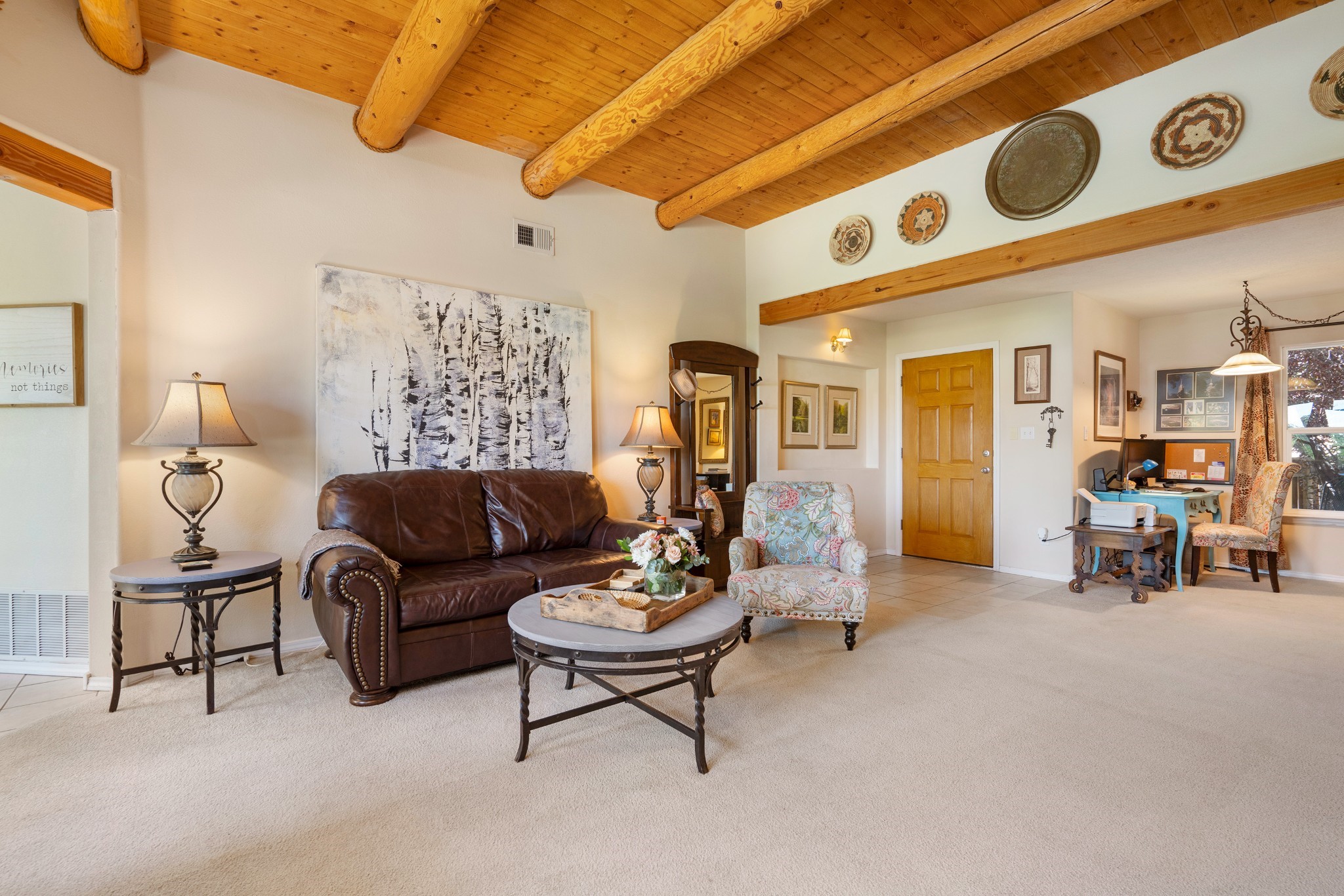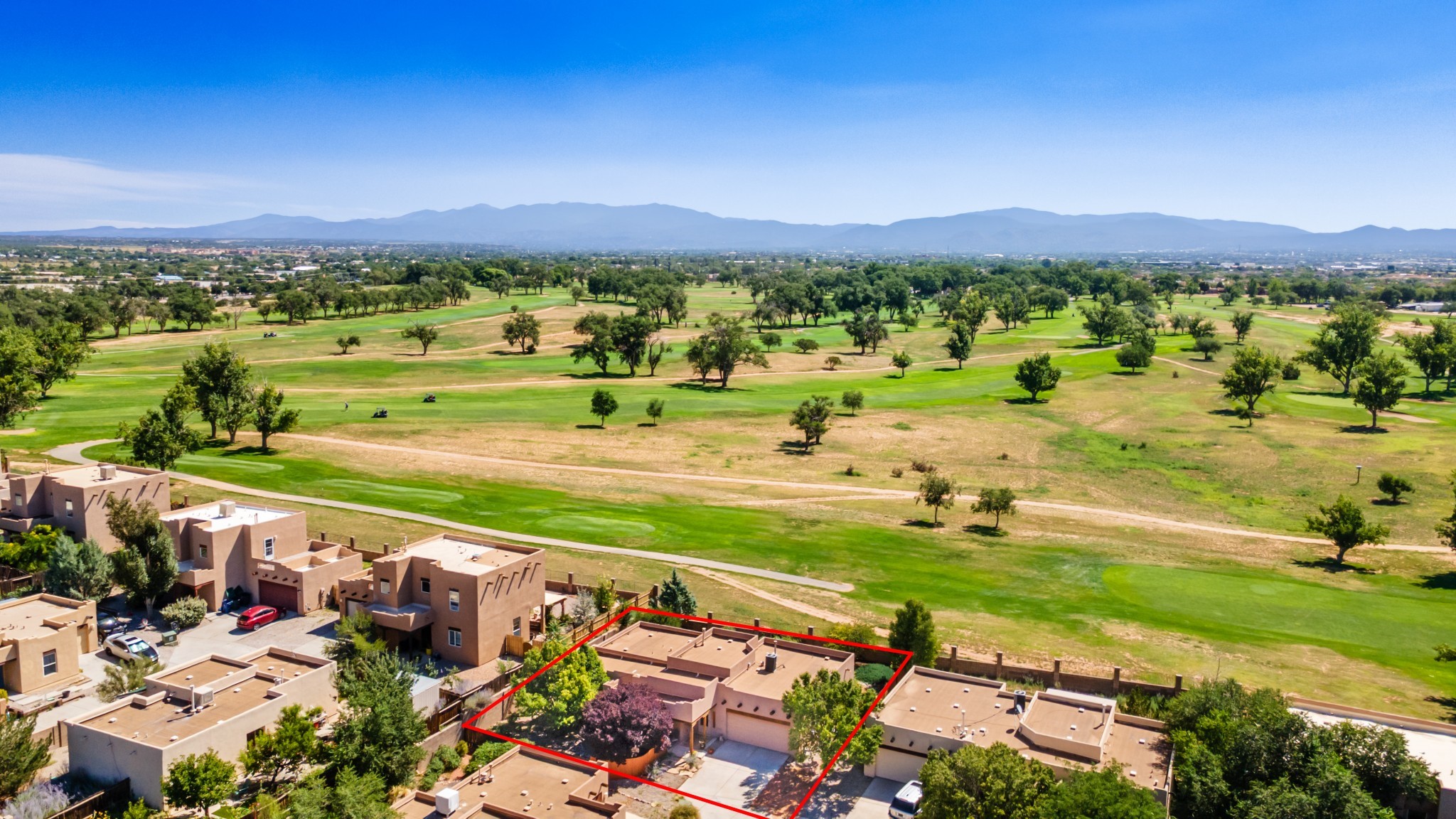 Beauty and peace abound in this light-filled home. Enjoy drinking coffee from the beautifully landscaped backyard adjacent to the cool, grassy, Santa Fe Country Club, where beautiful sunsets and sunrises are sure to delight. This home is sweetly positioned and tucked back off the road and nestled into a delightful backdrop. It's private and the home has an airy quality to it with its tall viga ceiling. The kitchen is spacious and has an eat in kitchen area. The oversized living room has a large window that looks out to the golf course and a lovely, gas fireplace. The main bedroom is gorgeous and spacious; the main bath has a stunning window over the soaking tub. Also you can enjoy soaking under the stars in the hot tub, which conveys. The home has ample storage, a 2 -car garage, a large laundry with pantry. The kitchen appliances are newer and there is a newer water heater. Conveniently located to the I-25 and 599 and there is no HOA! Visit this link to see interactive floor plan: https://visithome.ai/nJyyRSYqzomNteFuAd7J7r?mu=ft