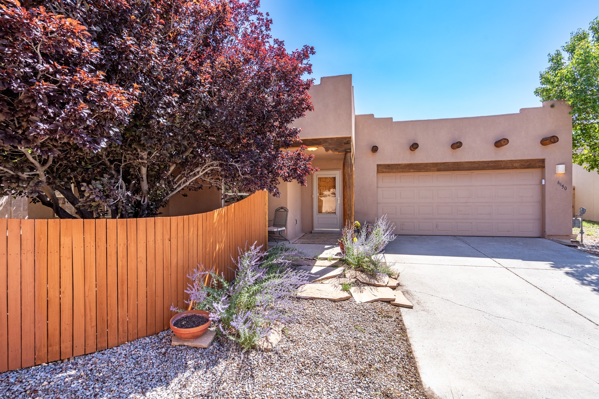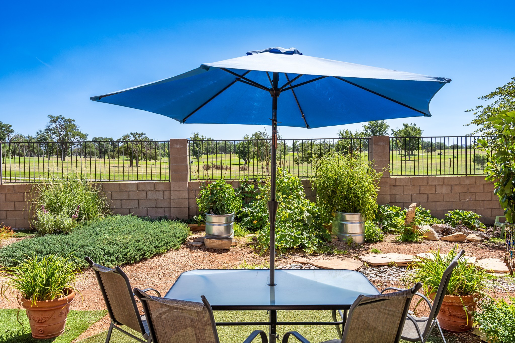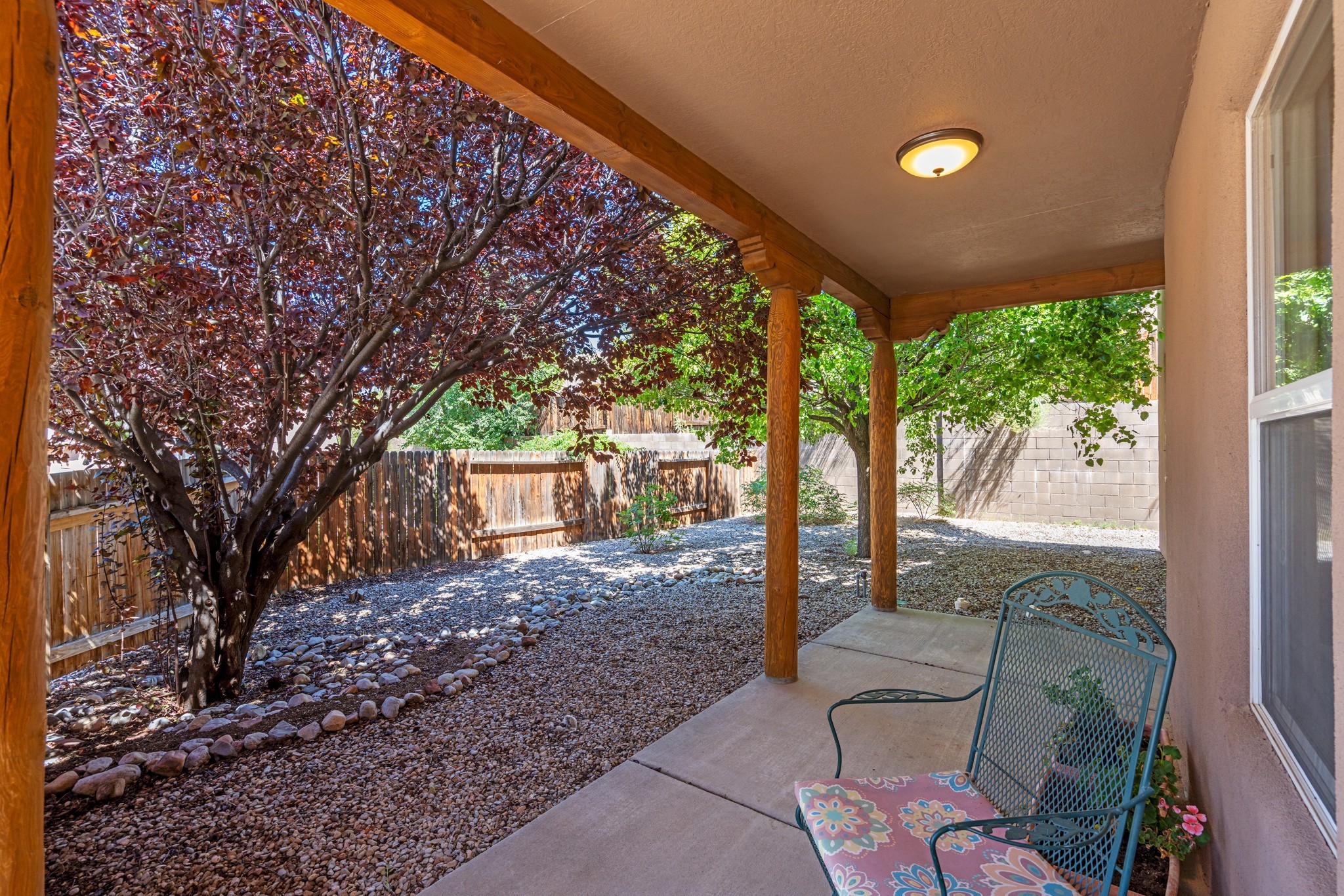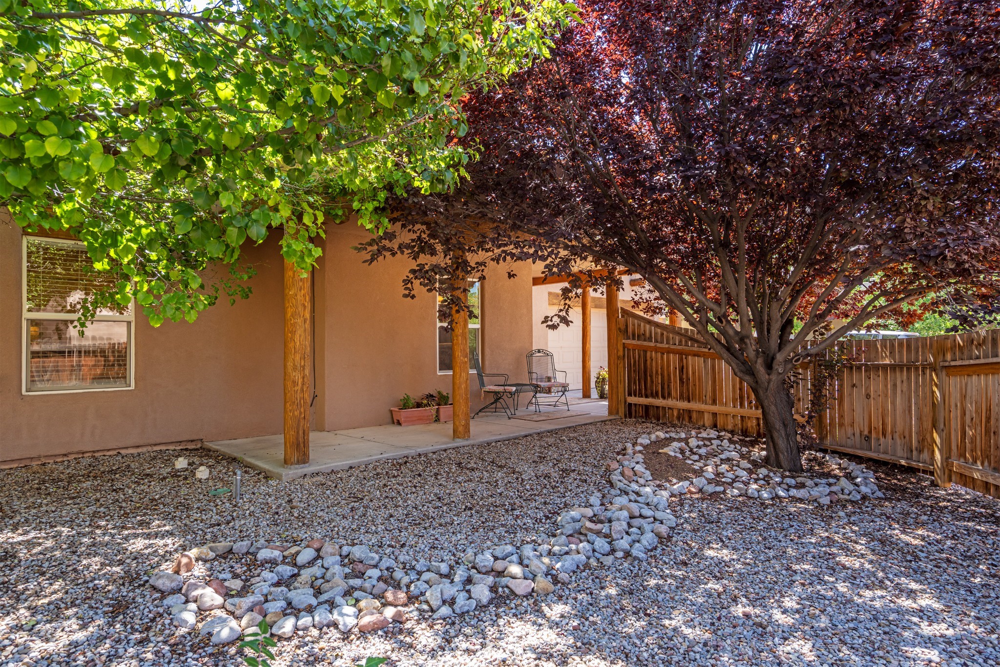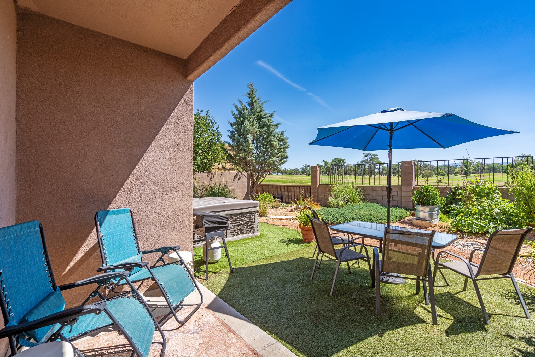Beauty and peace abound in this light-filled home. Enjoy drinking coffee from the beautifully landscaped backyard adjacent to the cool, grassy, Santa Fe Country Club, where beautiful sunsets and sunrises are sure to delight. This home is sweetly positioned and tucked back off the road and nestled into a delightful backdrop. It's private and the home has an airy quality to it with its tall viga ceiling. The kitchen is spacious and has an eat in kitchen area. The oversized living room has a large window that looks out to the golf course and a lovely, gas fireplace. The main bedroom is gorgeous and spacious; the main bath has a stunning window over the soaking tub. Also you can enjoy soaking under the stars in the hot tub, which conveys. The home has ample storage, a 2 -car garage, a large laundry with pantry. The kitchen appliances are newer and there is a newer water heater. Conveniently located to the I-25 and 599 and there is no HOA! Visit this link to see interactive floor plan: https://visithome.ai/nJyyRSYqzomNteFuAd7J7r?mu=ft
