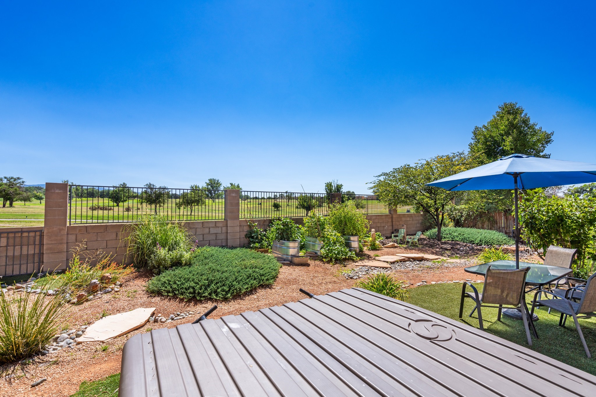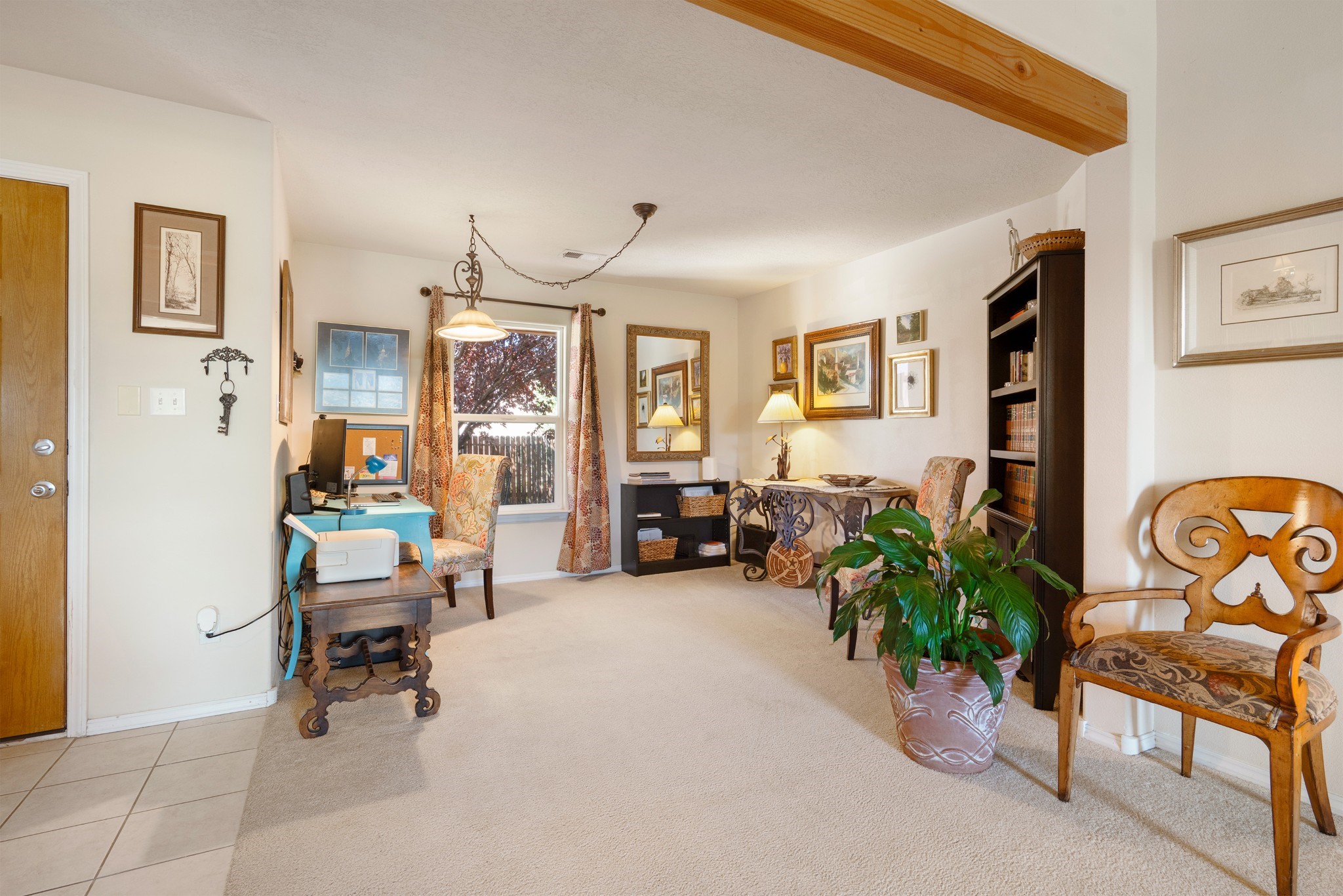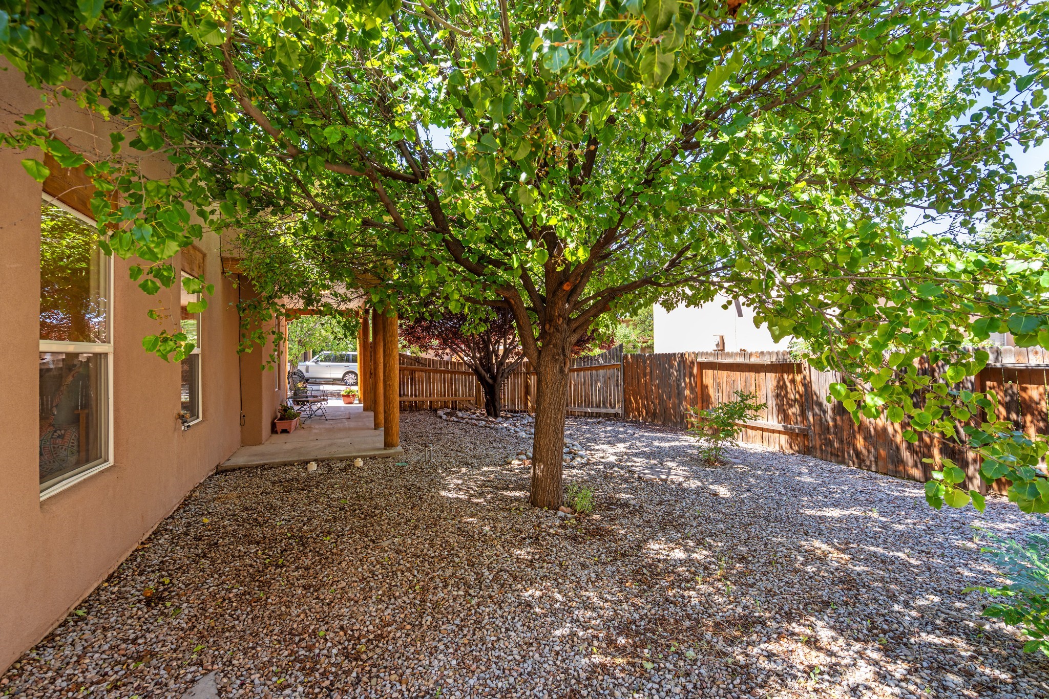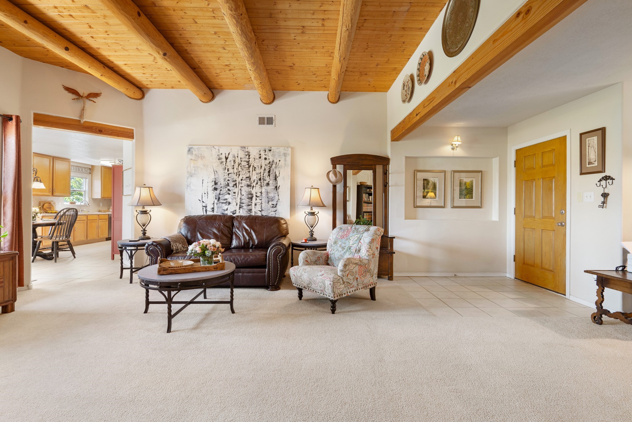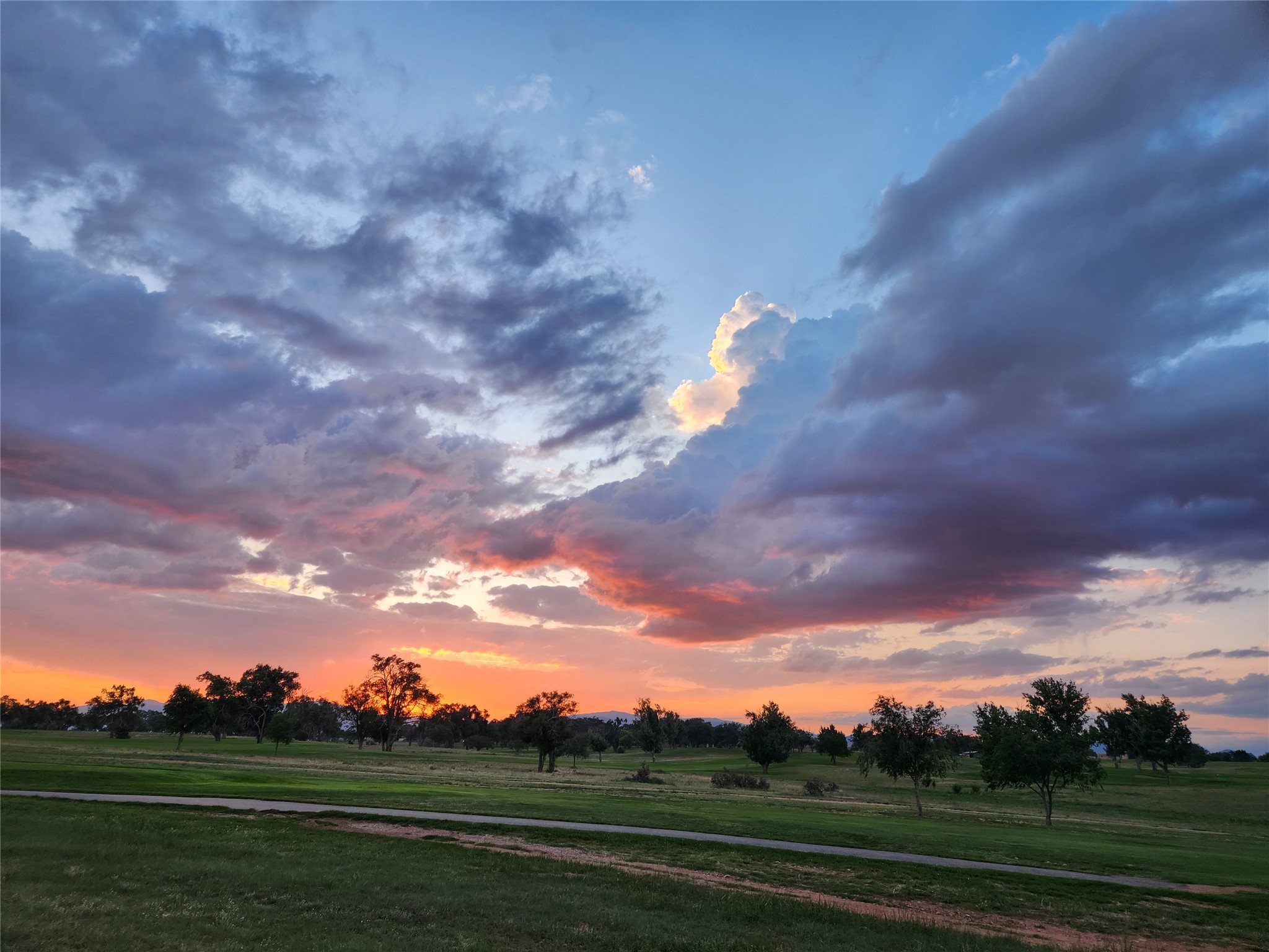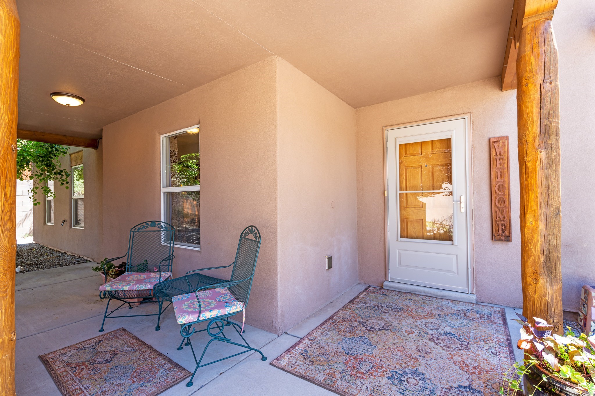 Beauty and peace abound in this light-filled home. Enjoy drinking coffee from the beautifully landscaped backyard adjacent to the cool, grassy, Santa Fe Country Club, where beautiful sunsets and sunrises are sure to delight. This home is sweetly positioned and tucked back off the road and nestled into a delightful backdrop. It's private and the home has an airy quality to it with its tall viga ceiling. The kitchen is spacious and has an eat in kitchen area. The oversized living room has a large window that looks out to the golf course and a lovely, gas fireplace. The main bedroom is gorgeous and spacious; the main bath has a stunning window over the soaking tub. Also you can enjoy soaking under the stars in the hot tub, which conveys. The home has ample storage, a 2 -car garage, a large laundry with pantry. The kitchen appliances are newer and there is a newer water heater. Conveniently located to the I-25 and 599 and there is no HOA! Visit this link to see interactive floor plan: https://visithome.ai/nJyyRSYqzomNteFuAd7J7r?mu=ft