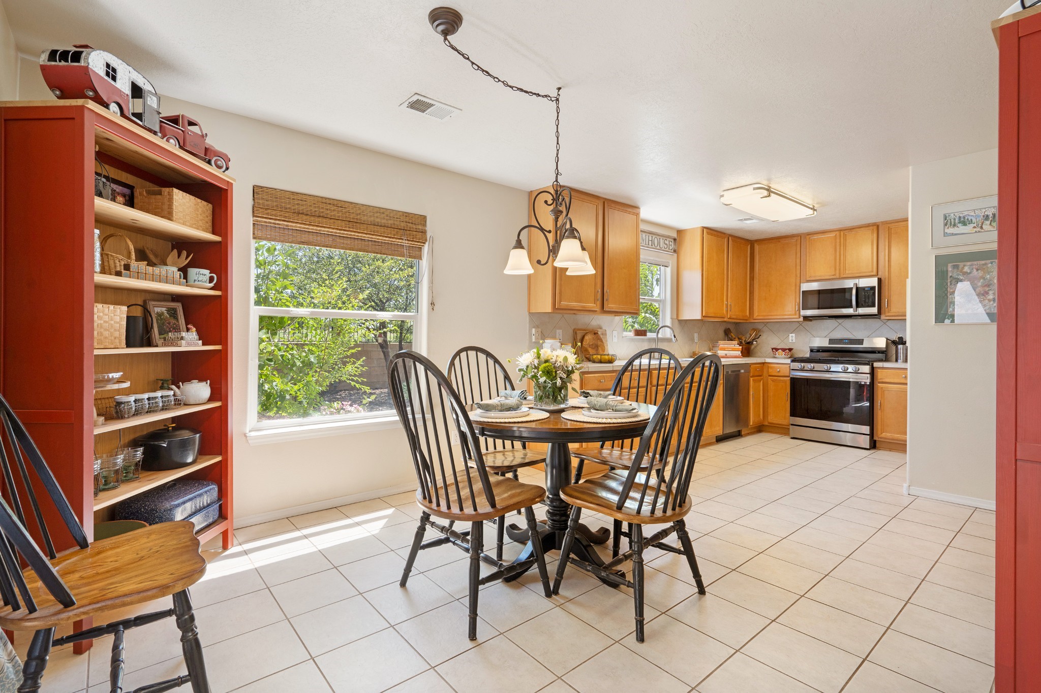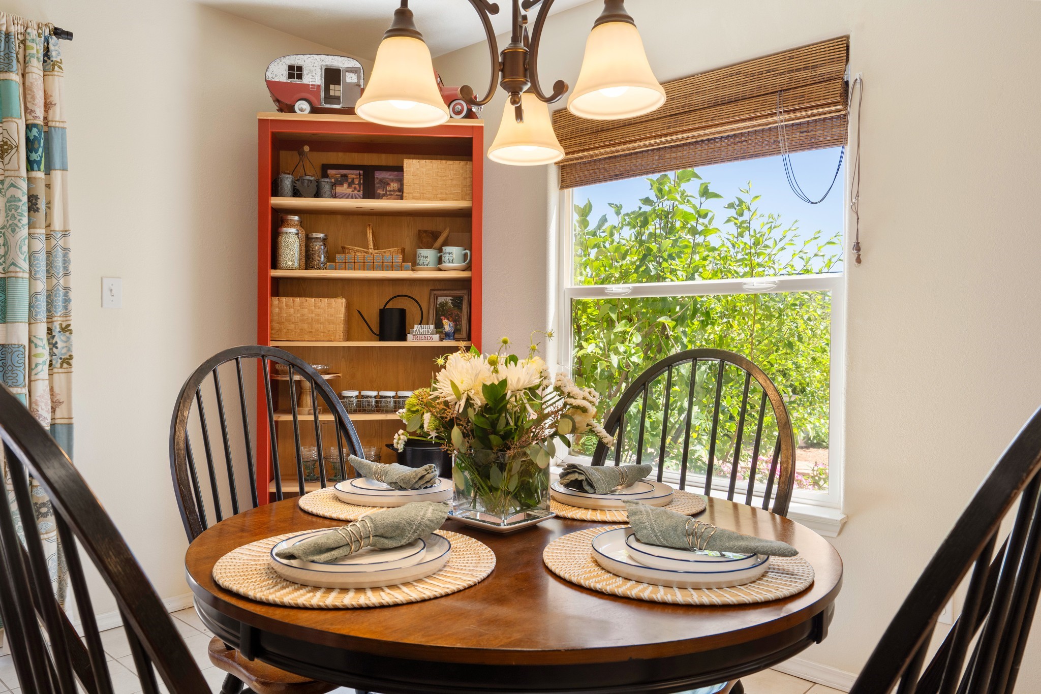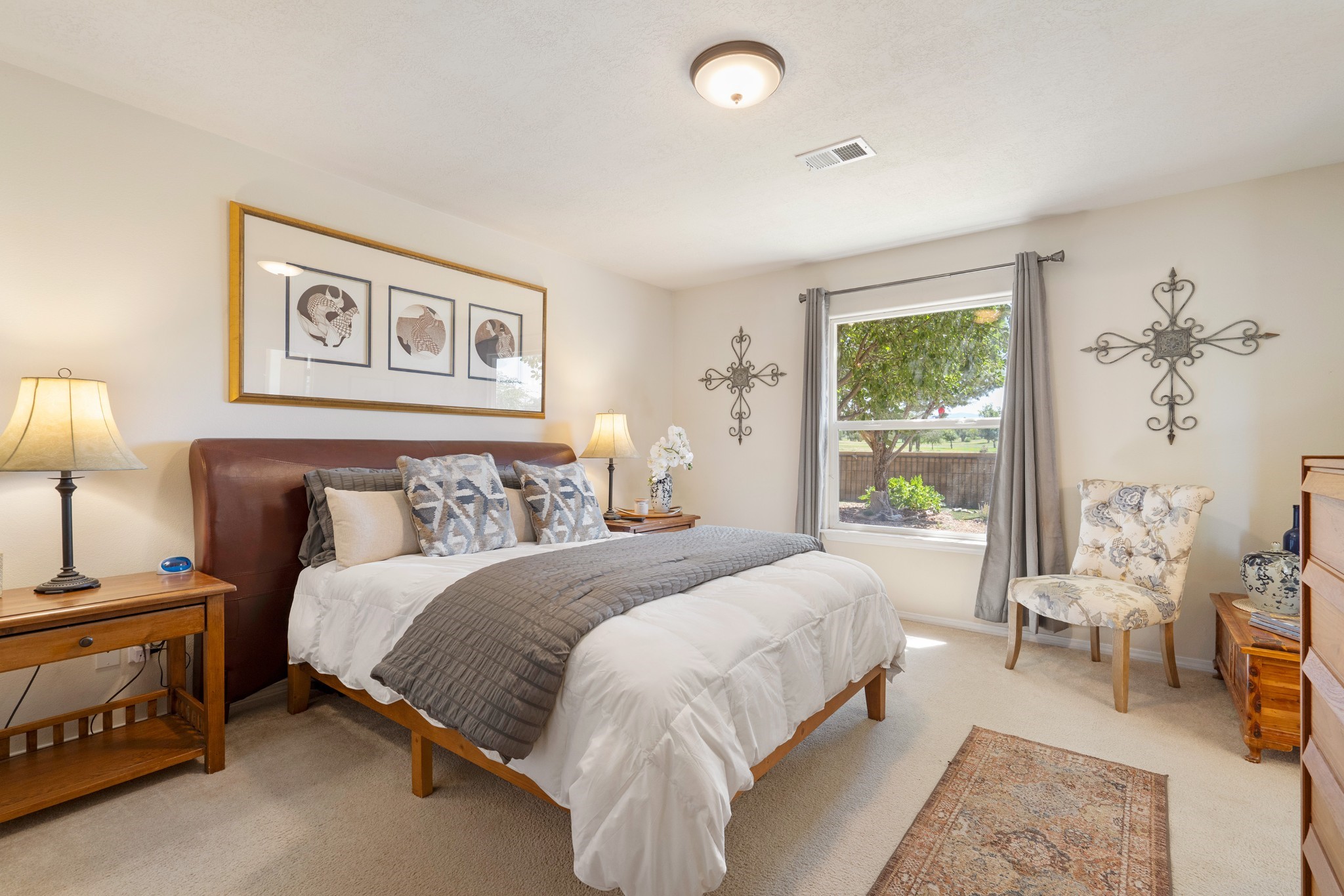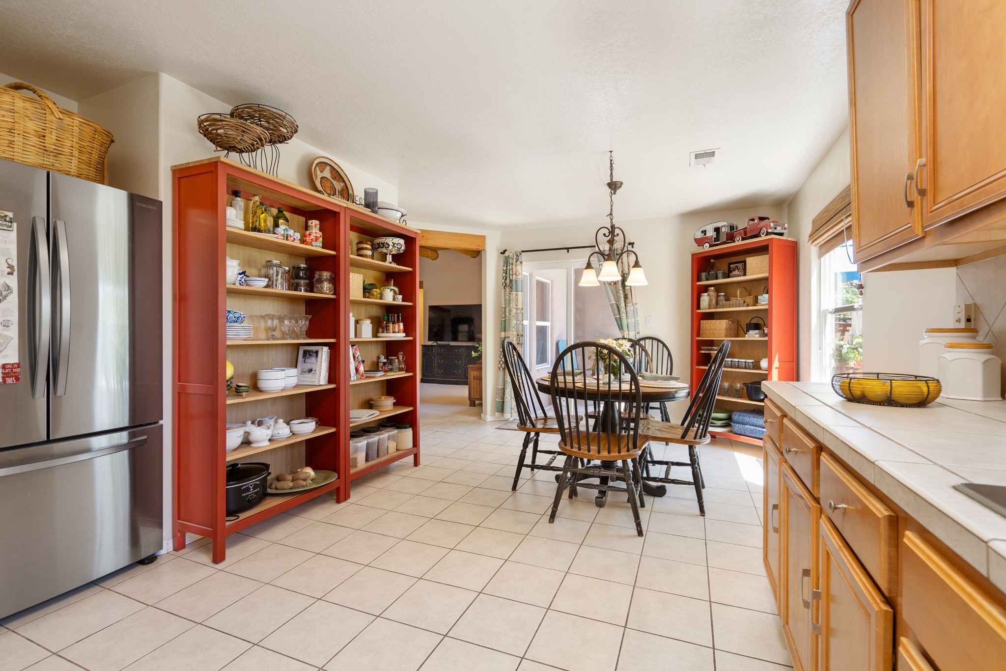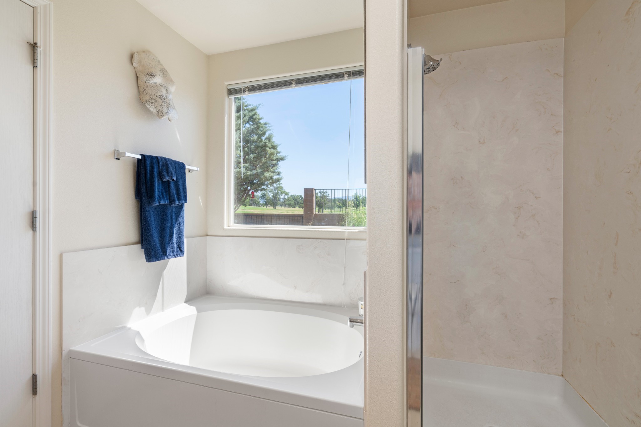 Beauty and peace abound in this light-filled home. Enjoy drinking coffee from the beautifully landscaped backyard adjacent to the cool, grassy, Santa Fe Country Club, where beautiful sunsets and sunrises are sure to delight. This home is sweetly positioned and tucked back off the road and nestled into a delightful backdrop. It's private and the home has an airy quality to it with its tall viga ceiling. The kitchen is spacious and has an eat in kitchen area. The oversized living room has a large window that looks out to the golf course and a lovely, gas fireplace. The main bedroom is gorgeous and spacious; the main bath has a stunning window over the soaking tub. Also you can enjoy soaking under the stars in the hot tub, which conveys. The home has ample storage, a 2 -car garage, a large laundry with pantry. The kitchen appliances are newer and there is a newer water heater. Conveniently located to the I-25 and 599 and there is no HOA! Visit this link to see interactive floor plan: https://visithome.ai/nJyyRSYqzomNteFuAd7J7r?mu=ft
