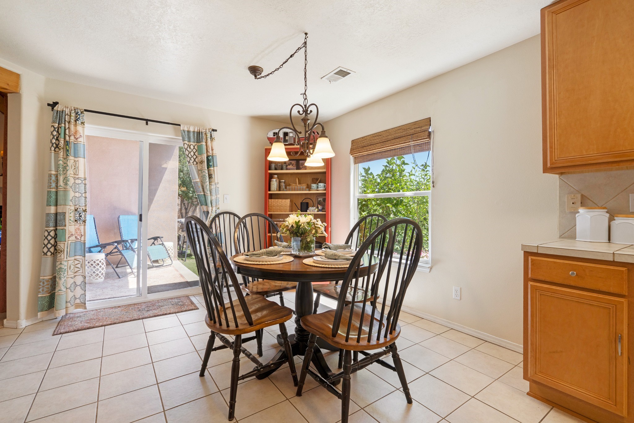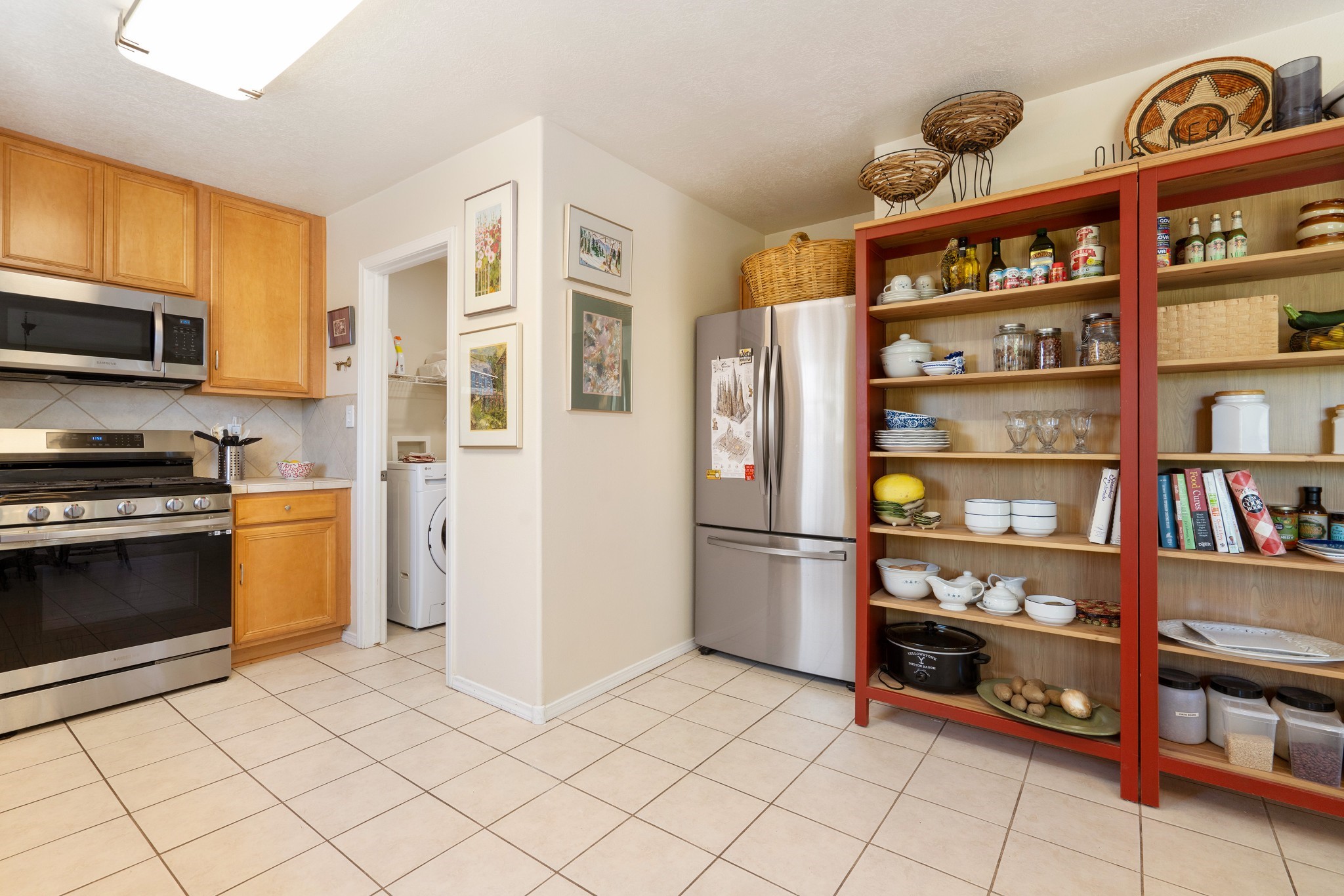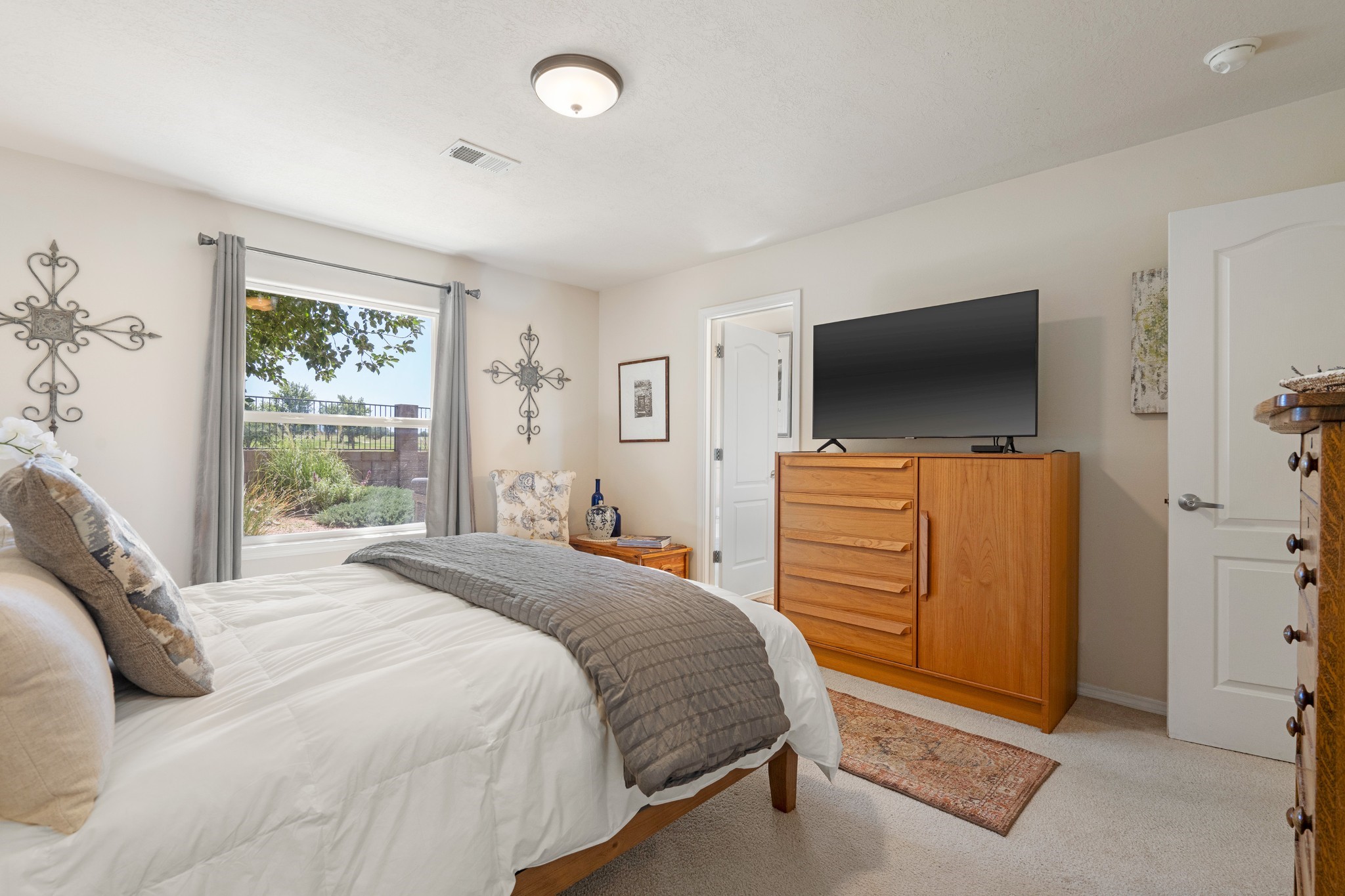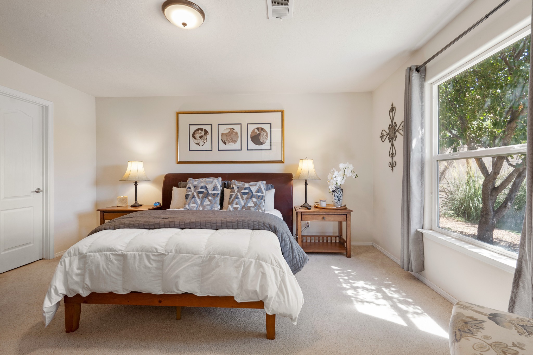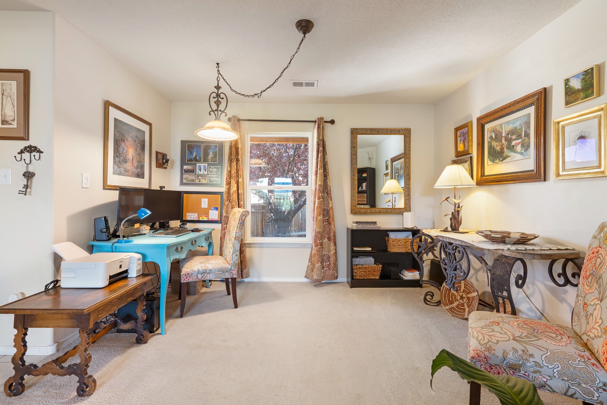 Beauty and peace abound in this light-filled home. Enjoy drinking coffee from the beautifully landscaped backyard adjacent to the cool, grassy, Santa Fe Country Club, where beautiful sunsets and sunrises are sure to delight. This home is sweetly positioned and tucked back off the road and nestled into a delightful backdrop. It's private and the home has an airy quality to it with its tall viga ceiling. The kitchen is spacious and has an eat in kitchen area. The oversized living room has a large window that looks out to the golf course and a lovely, gas fireplace. The main bedroom is gorgeous and spacious; the main bath has a stunning window over the soaking tub. Also you can enjoy soaking under the stars in the hot tub, which conveys. The home has ample storage, a 2 -car garage, a large laundry with pantry. The kitchen appliances are newer and there is a newer water heater. Conveniently located to the I-25 and 599 and there is no HOA! Visit this link to see interactive floor plan: https://visithome.ai/nJyyRSYqzomNteFuAd7J7r?mu=ft