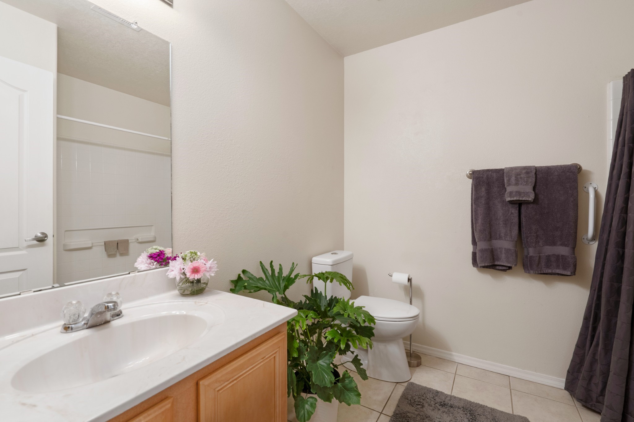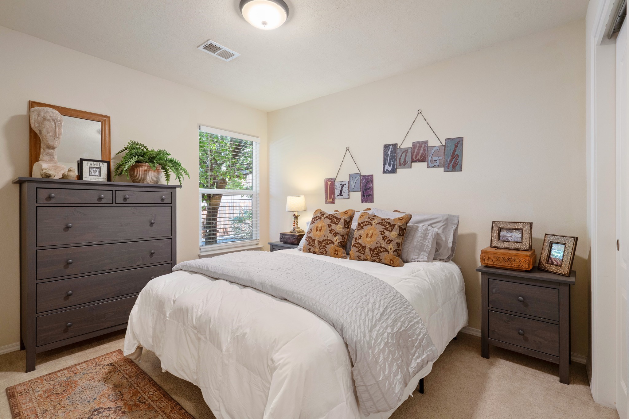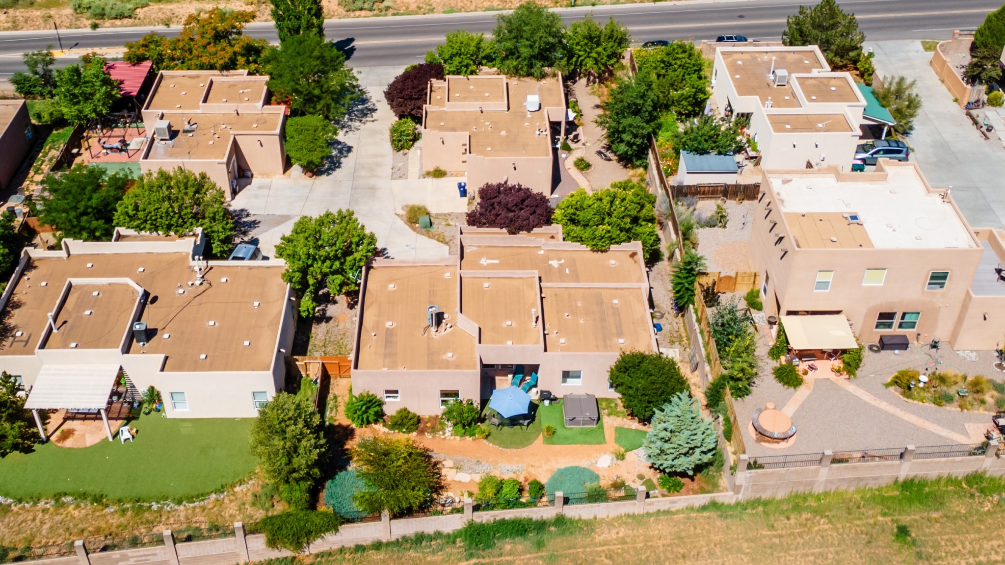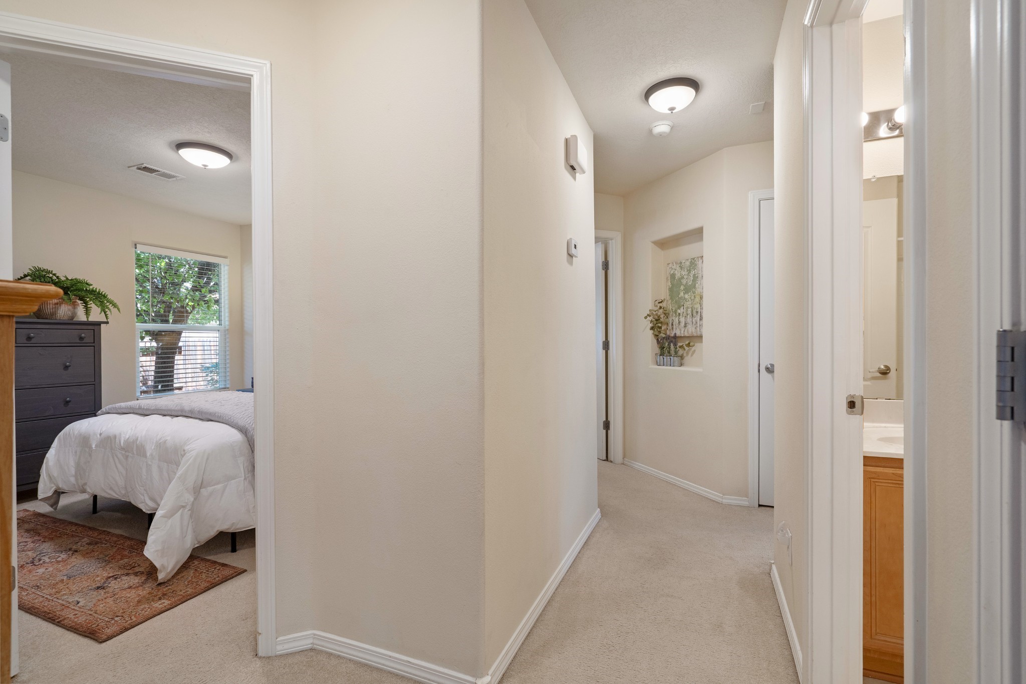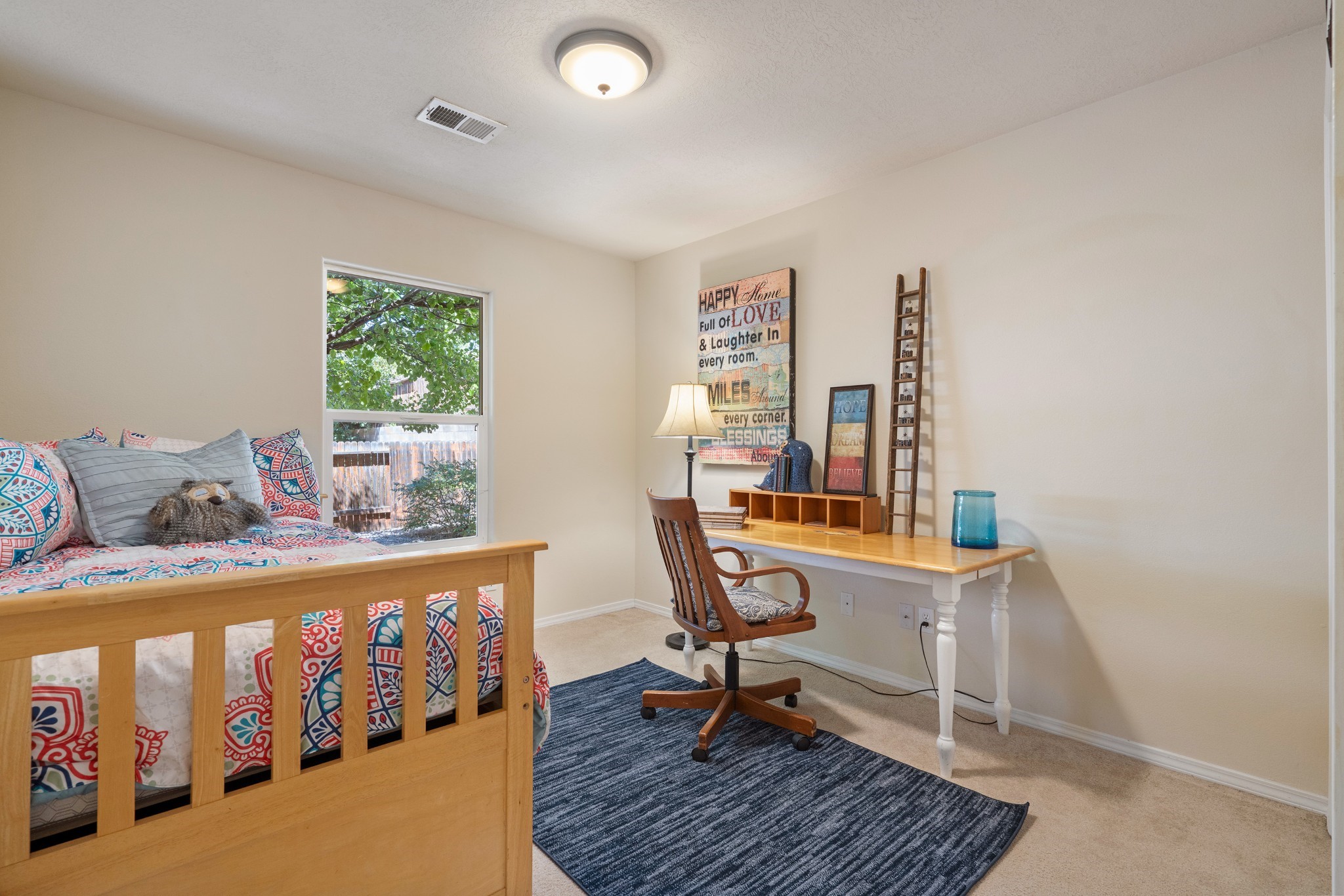 Beauty and peace abound in this light-filled home. Enjoy drinking coffee from the beautifully landscaped backyard adjacent to the cool, grassy, Santa Fe Country Club, where beautiful sunsets and sunrises are sure to delight. This home is sweetly positioned and tucked back off the road and nestled into a delightful backdrop. It's private and the home has an airy quality to it with its tall viga ceiling. The kitchen is spacious and has an eat in kitchen area. The oversized living room has a large window that looks out to the golf course and a lovely, gas fireplace. The main bedroom is gorgeous and spacious; the main bath has a stunning window over the soaking tub. Also you can enjoy soaking under the stars in the hot tub, which conveys. The home has ample storage, a 2 -car garage, a large laundry with pantry. The kitchen appliances are newer and there is a newer water heater. Conveniently located to the I-25 and 599 and there is no HOA! Visit this link to see interactive floor plan: https://visithome.ai/nJyyRSYqzomNteFuAd7J7r?mu=ft