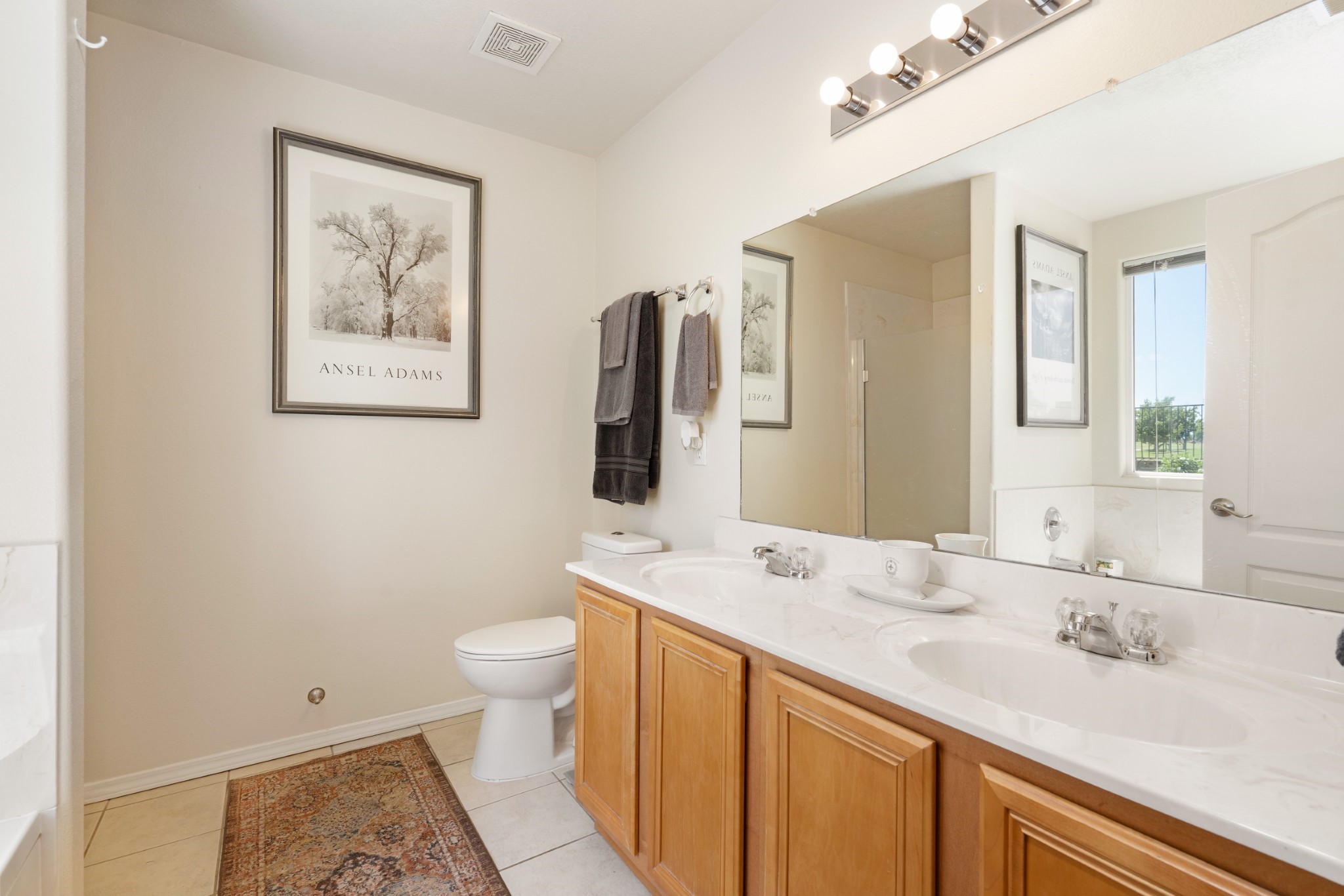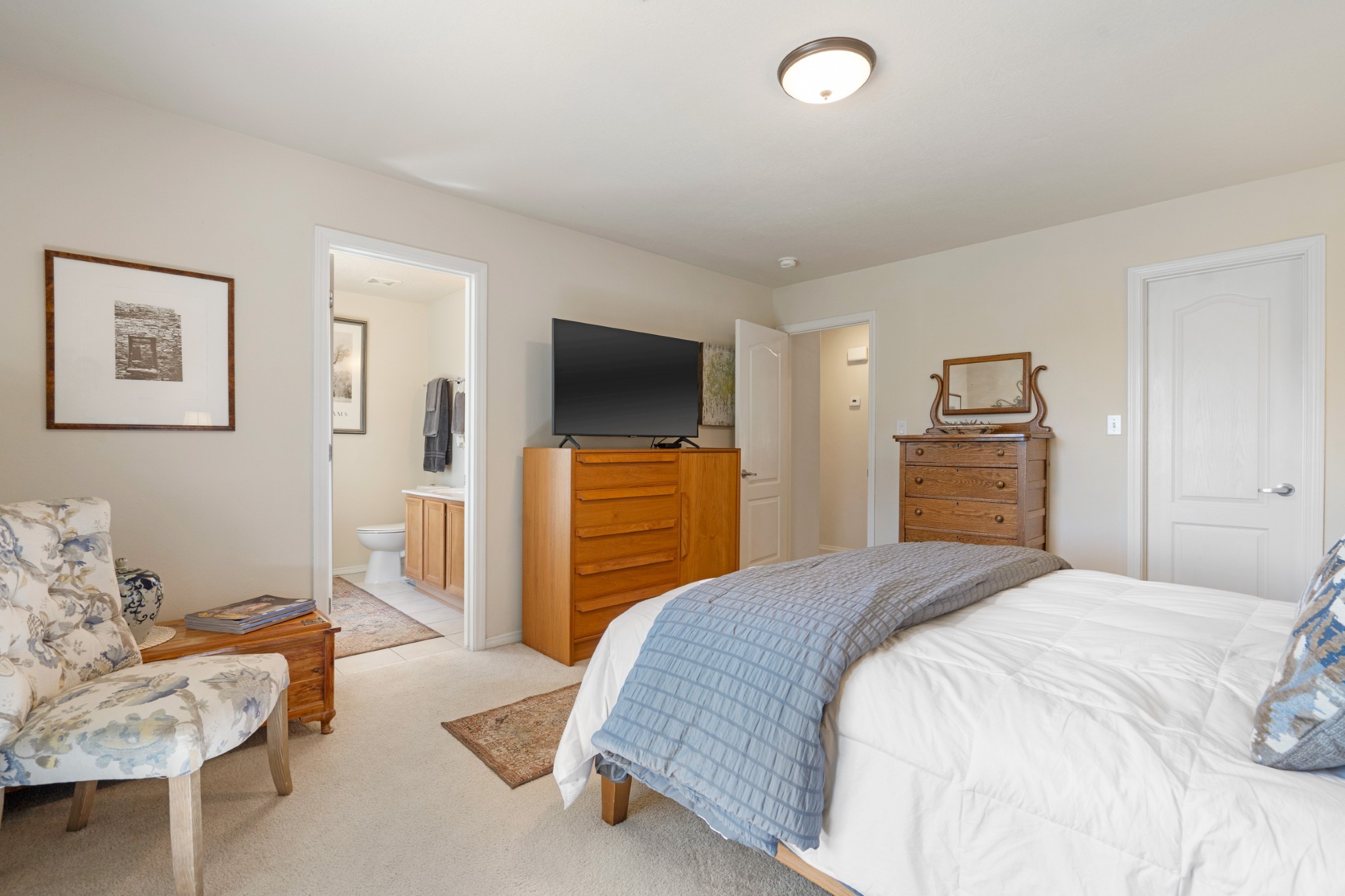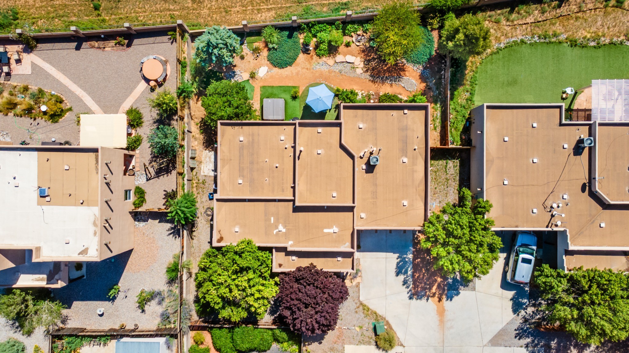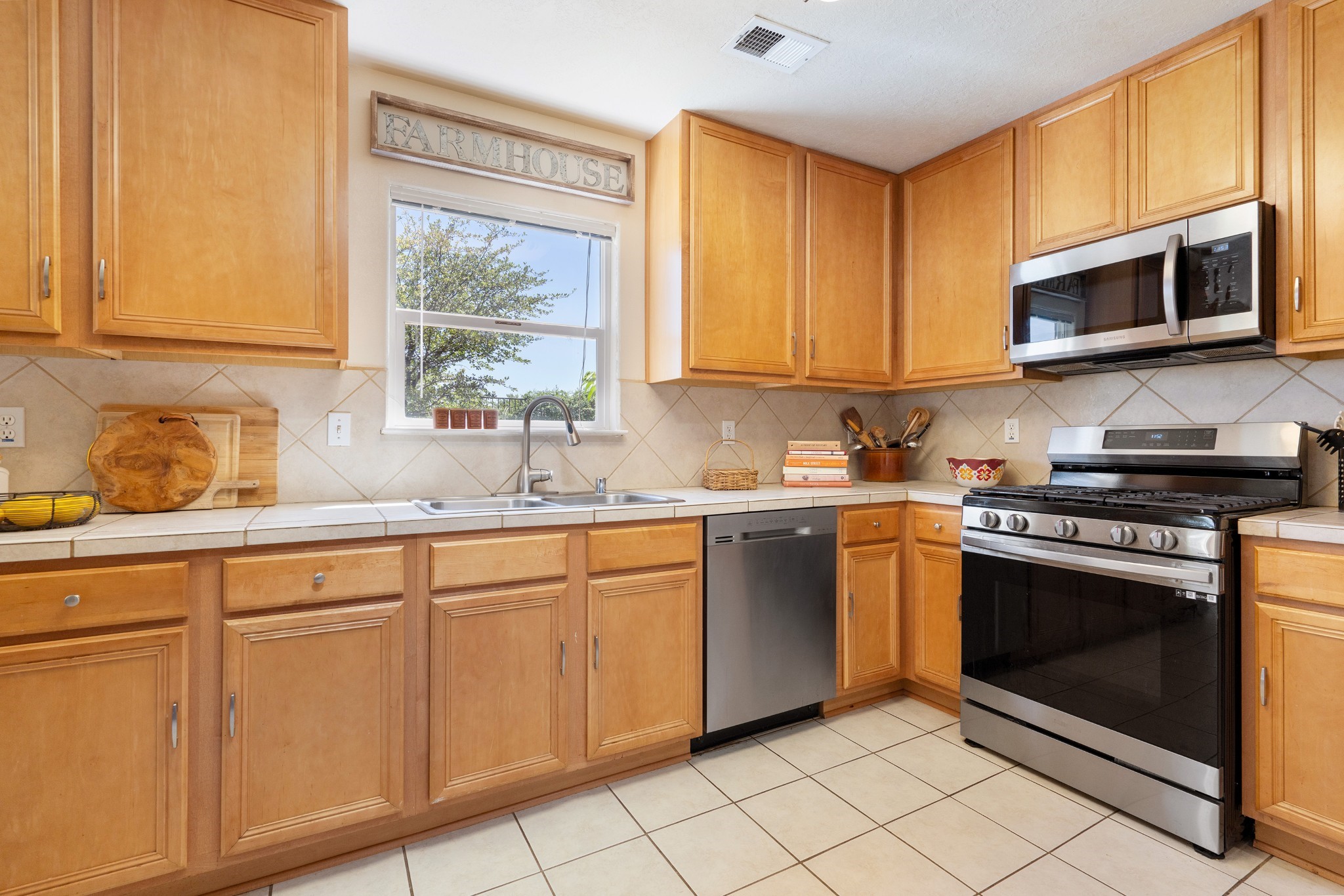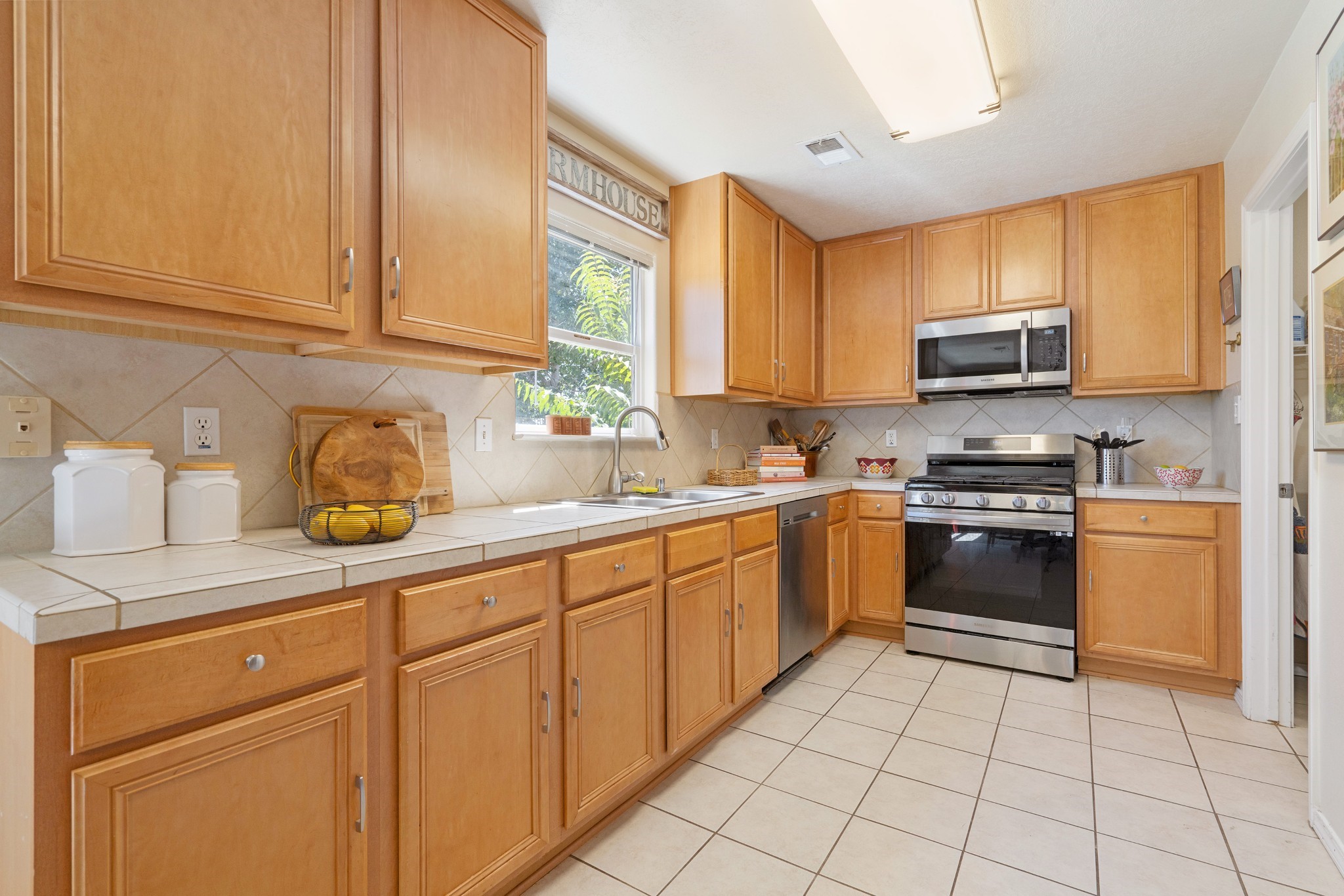Beauty and peace abound in this light-filled home. Enjoy drinking coffee from the beautifully landscaped backyard adjacent to the cool, grassy, Santa Fe Country Club, where beautiful sunsets and sunrises are sure to delight. This home is sweetly positioned and tucked back off the road and nestled into a delightful backdrop. It's private and the home has an airy quality to it with its tall viga ceiling. The kitchen is spacious and has an eat in kitchen area. The oversized living room has a large window that looks out to the golf course and a lovely, gas fireplace. The main bedroom is gorgeous and spacious; the main bath has a stunning window over the soaking tub. Also you can enjoy soaking under the stars in the hot tub, which conveys. The home has ample storage, a 2 -car garage, a large laundry with pantry. The kitchen appliances are newer and there is a newer water heater. Conveniently located to the I-25 and 599 and there is no HOA! Visit this link to see interactive floor plan: https://visithome.ai/nJyyRSYqzomNteFuAd7J7r?mu=ft