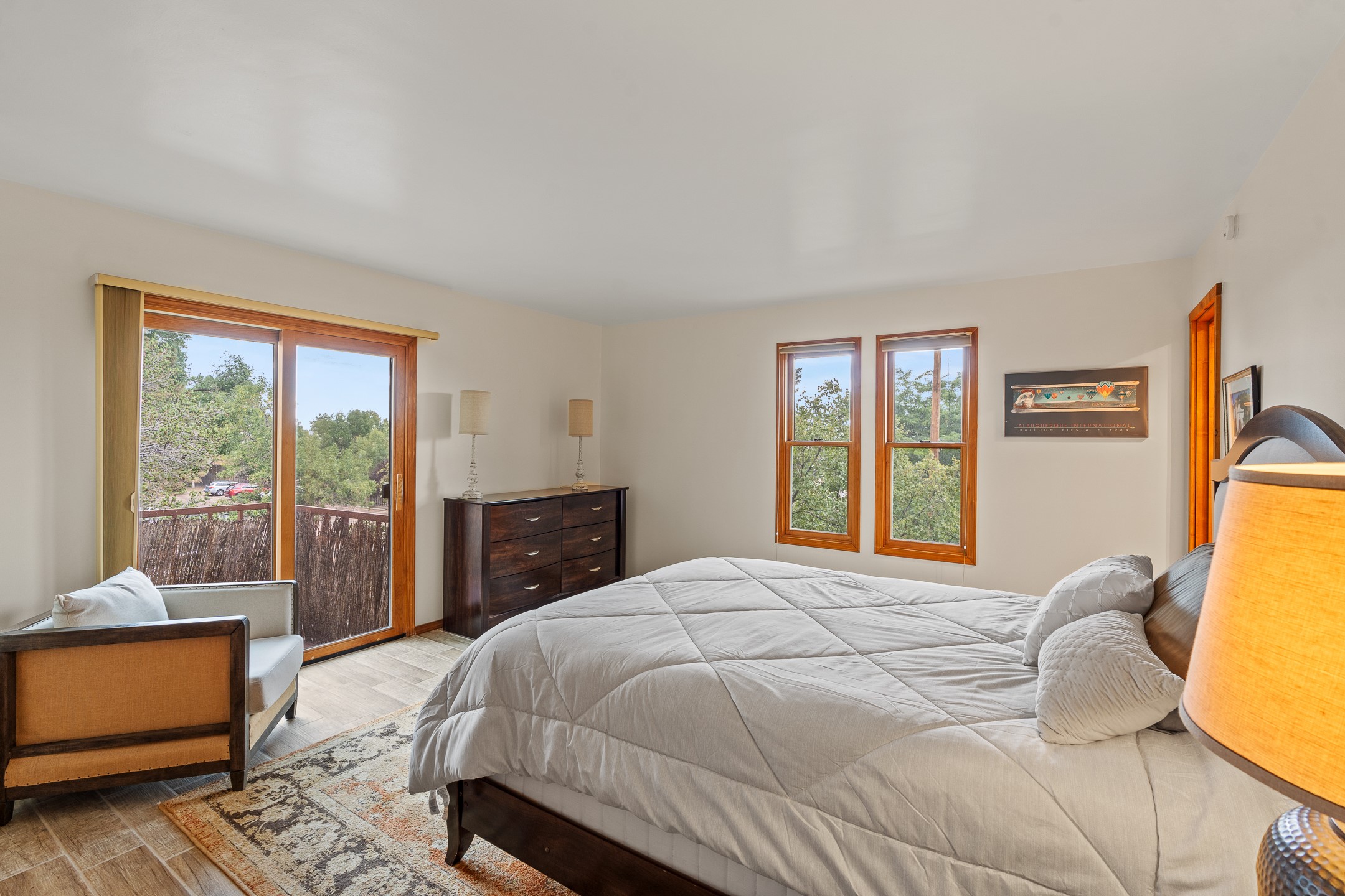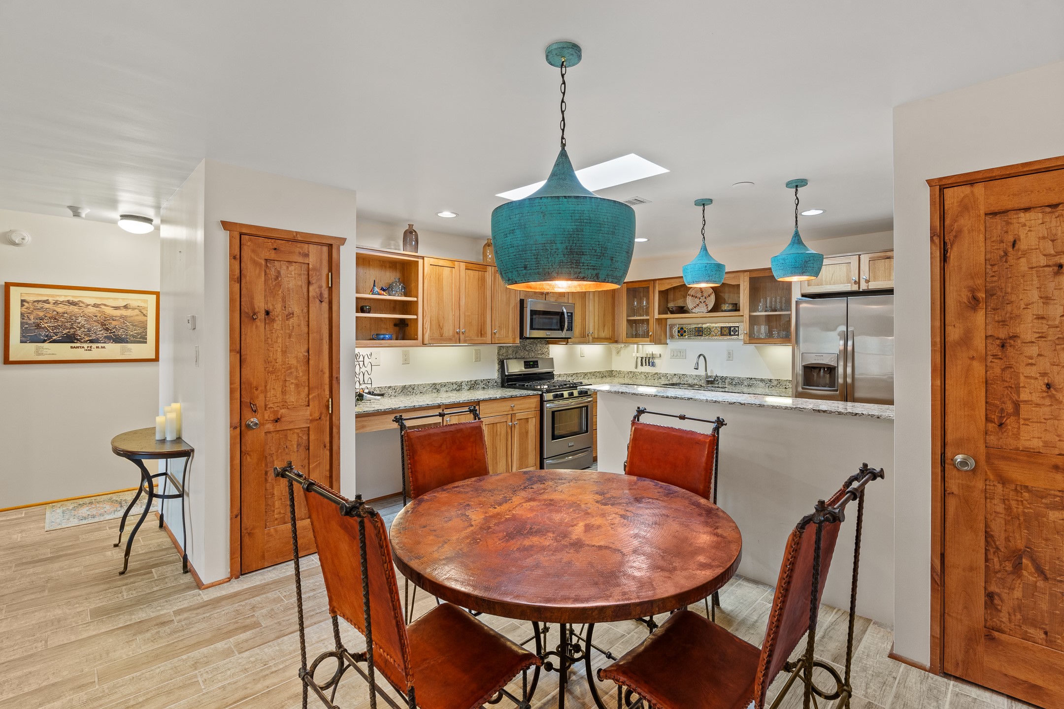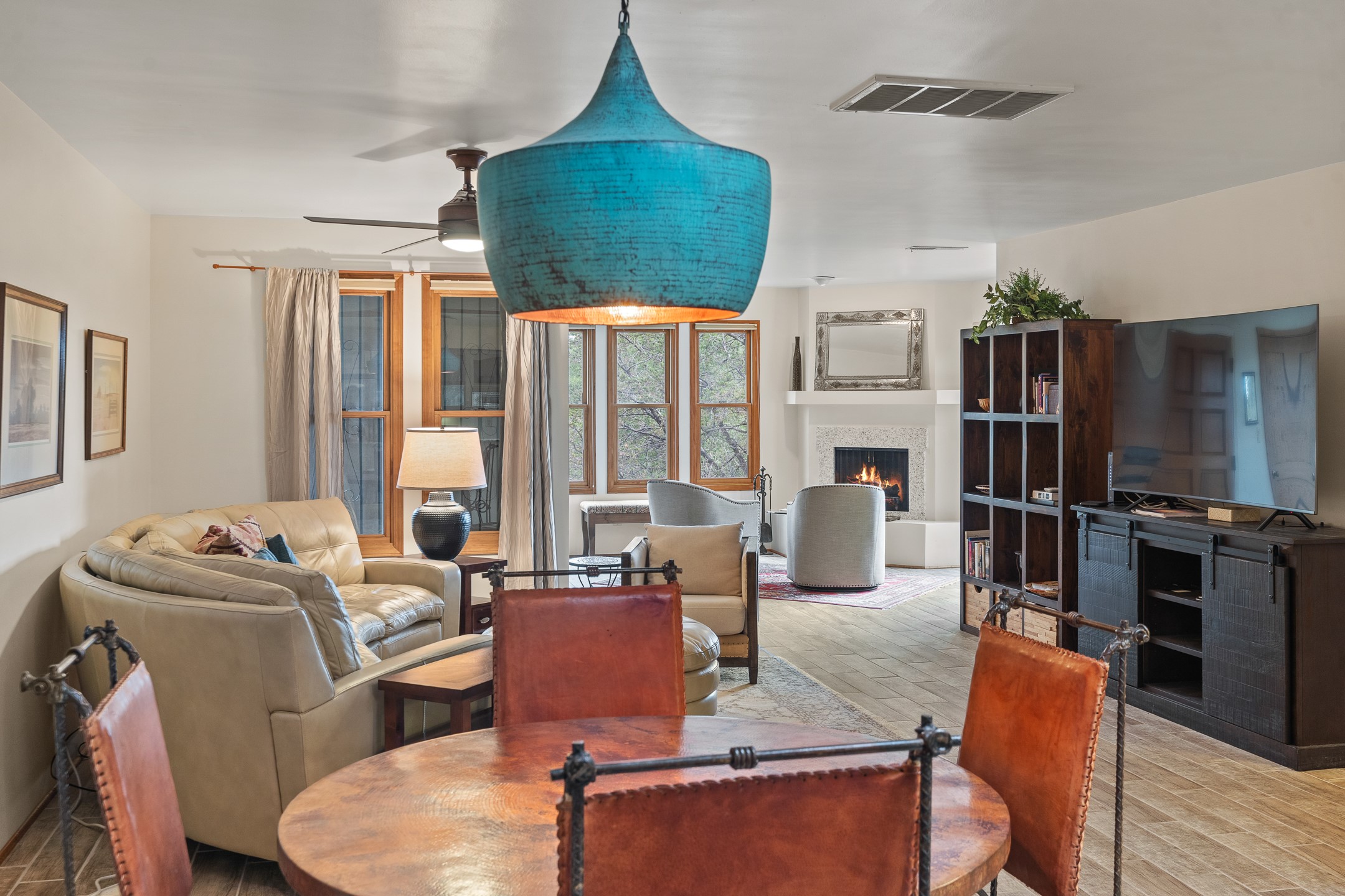 Located in the sought-after South Capital neighborhood, this beautifully updated condo in Los Pueblos is a hidden gem offering both comfort and convenience. Just under 1.5 miles to the Santa Fe Plaza and less than a mile to the Railyard District, enjoy easy access to Whole Foods, Trader Joe's, Natural Grocers, popular restaurants, and local amenities.Spanning 1,472 sqft, this 2-bedroom, 1-bath home (originally a 2-bath and still plumbed for a second bath) features a spacious open-concept layout that seamlessly blends the kitchen, dining, and living areas. A cozy sitting area with a fireplace and sliding glass doors opens to a private balcony, also accessible from the primary bedroom--perfect for relaxing.The home is tiled throughout, offering ease of maintenance and a clean, cohesive look. The tastefully updated kitchen is a standout with granite countertops, a bar-top counter, pantry, and chic lighting fixtures over both the kitchen and dining areas. Newer double-paned windows and a ceiling fan in the living room add comfort and energy efficiency.The large primary suite connects directly to the oversized bathroom, which also serves as the guest bath with a secondary entrance from the hallway. The bathroom includes a walk-in shower and generous space for comfort. The guest bedroom is privately situated down the hall.A former second bathroom has been thoughtfully converted into a large laundry and storage room, complete with a stackable washer and dryer (included) and ample closet space throughout.Additional highlights include:An 8x8 storage unit in the secure underground garage,furniture package available,prime location near Santa Fe's best shopping, dining, and cultural attractions.Whether you're looking for a full-time residence, weekend retreat, or investment opportunity, this stylish condo offers the best of Santa Fe living in an unbeatable location.