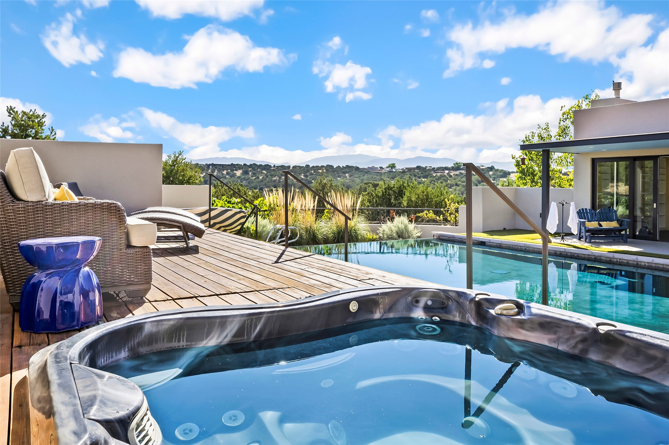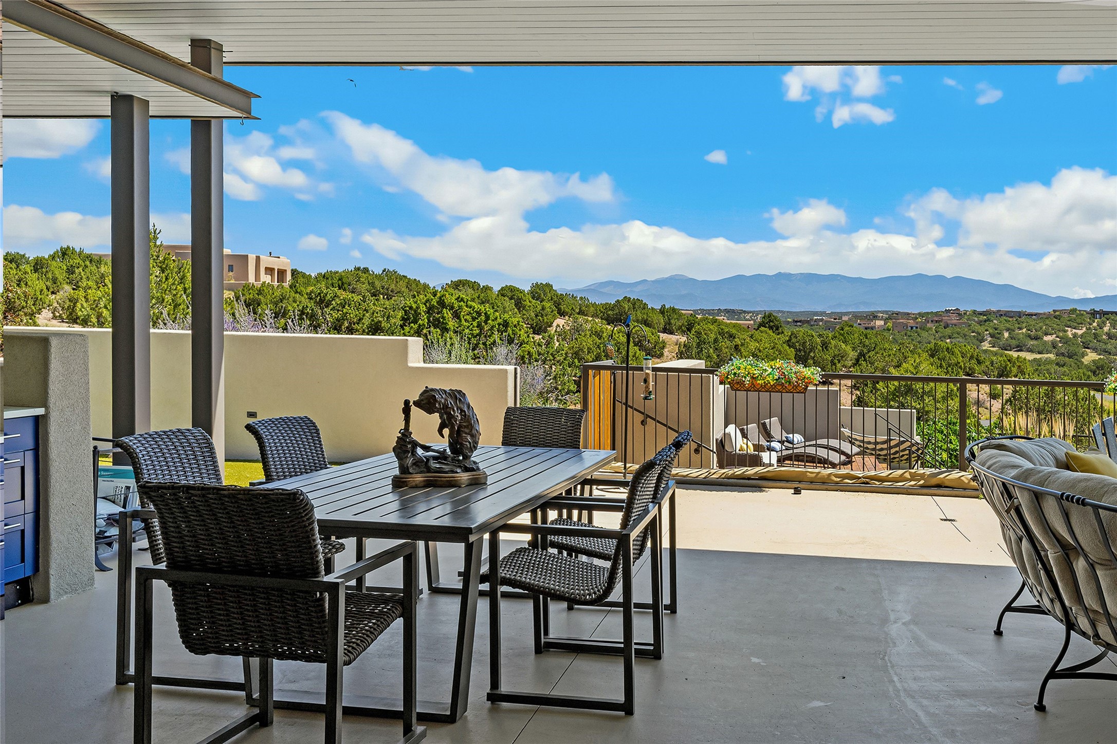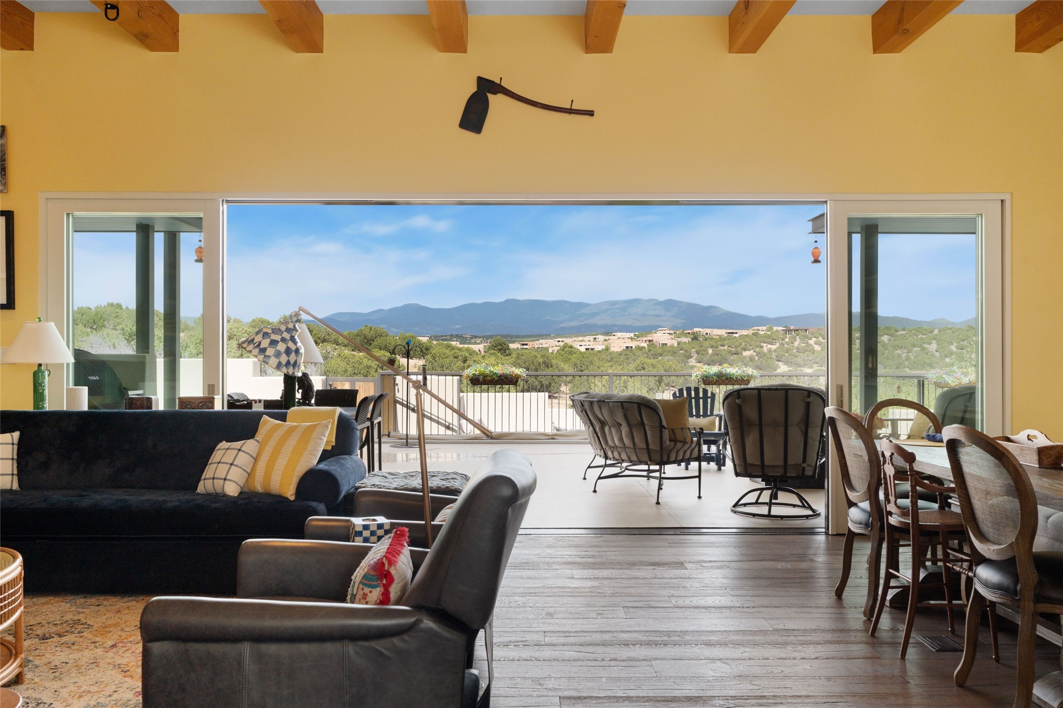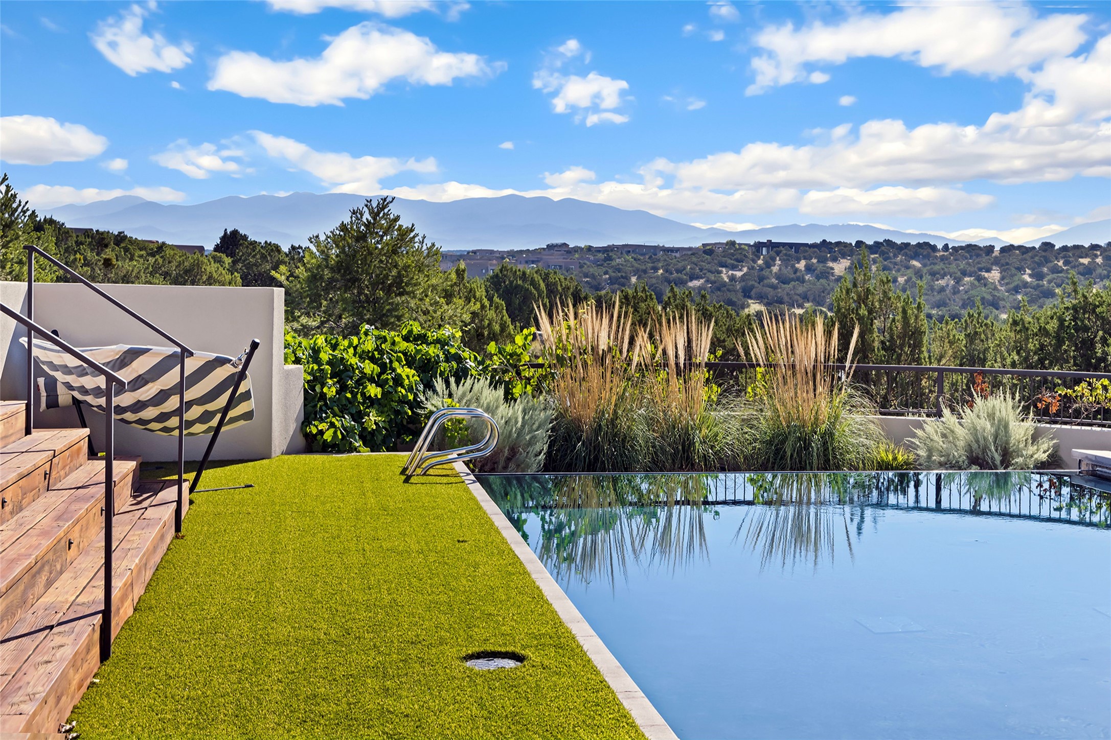 Set within the secure gates of Las Campanas, 96 Sunflower Drive pairs a clean contemporary design with unexpected Victorian-inspired details, where rich wall colors and patterned wallpapers bring warmth and character to the interiors. The four-bedroom main residence and one-bedroom casita are oriented to capture protected, unobstructed views of the Sangre de Cristo Mountains--most dramatically enjoyed from the home's two-tiered outdoor living spaces. The lower terrace centers on an infinity-edged pool, outdoor shower, and wood deck for sunbathing or lounging. Above, an expansive east-facing portal and patio feature a turf lawn, fully equipped outdoor kitchen, and generous dining and seating areas, all framed by the same striking mountain panorama. Inside, the open living, dining, and kitchen area flows naturally for gatherings, with the kitchen offering Wolf appliances, abundant counter space, and bar seating. The primary suite includes two closets, dual vanities, a soaking tub, mountain views, and direct portal access, while three guest suites are privately positioned across the home. A gated driveway leads to the three-car garage. This property is modern yet unexpected with exceptionally polished and inviting outdoor spaces. In one of the closest parts of Las Campanas to town, the next owner gets the benefit of Las Campanas' 24-hour security and on-site emergency medical services while being only 10 minutes from downtown.