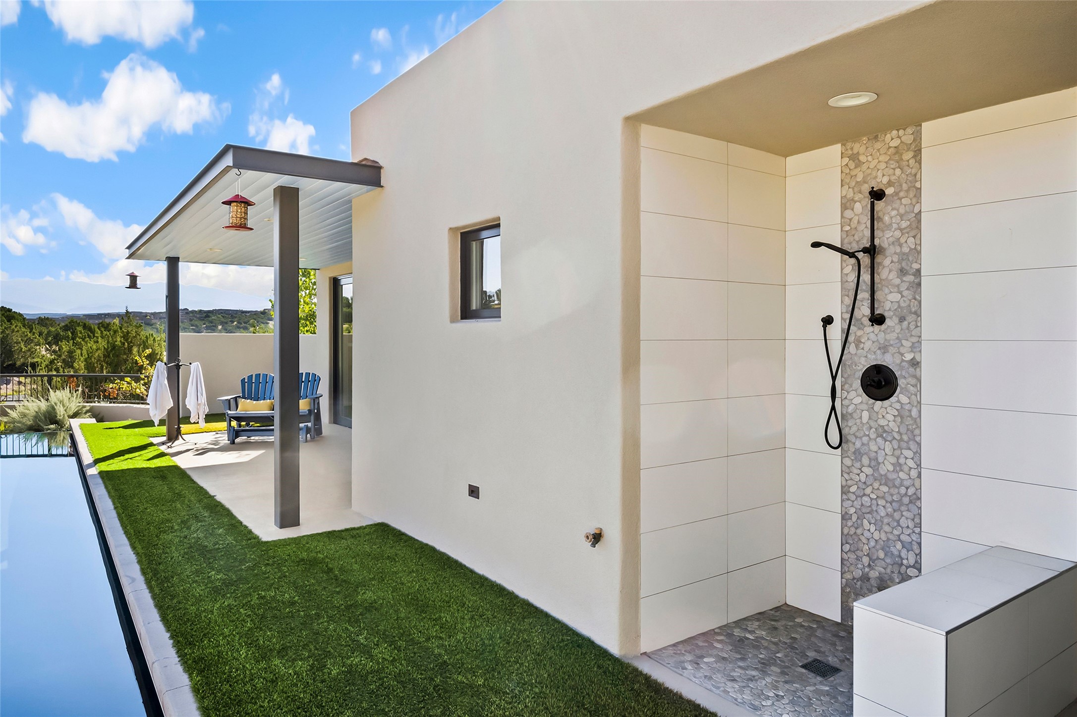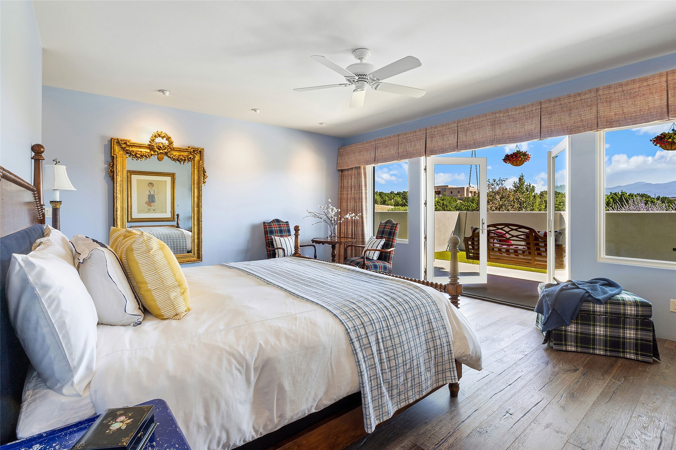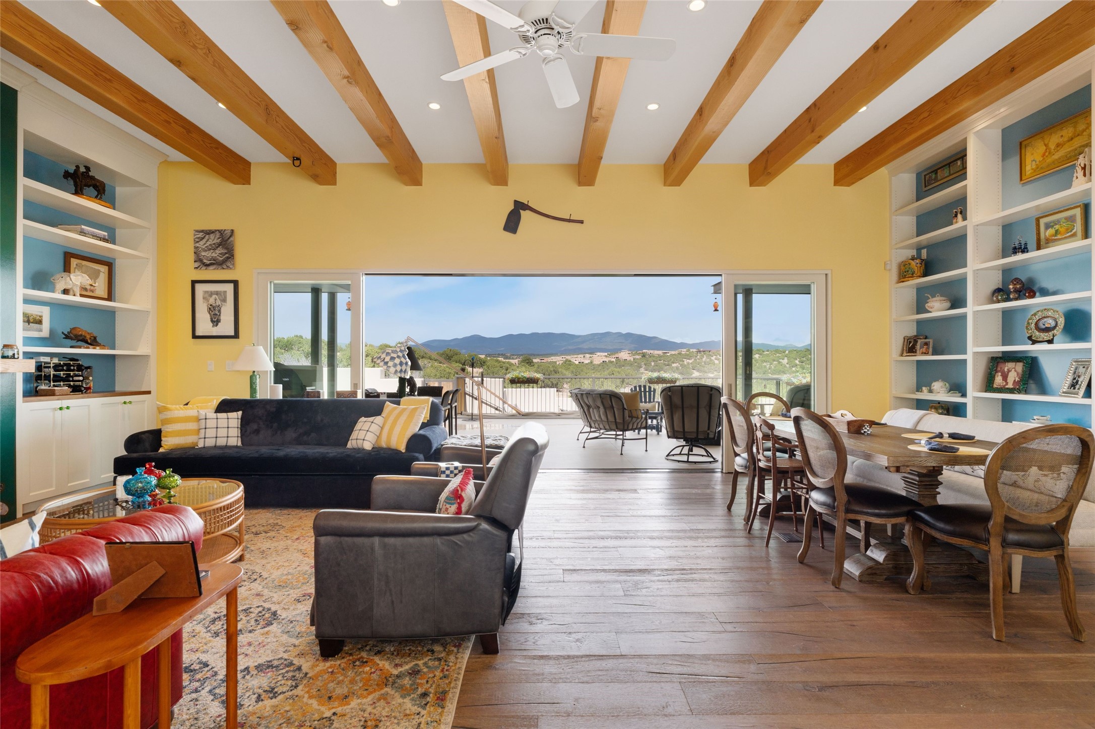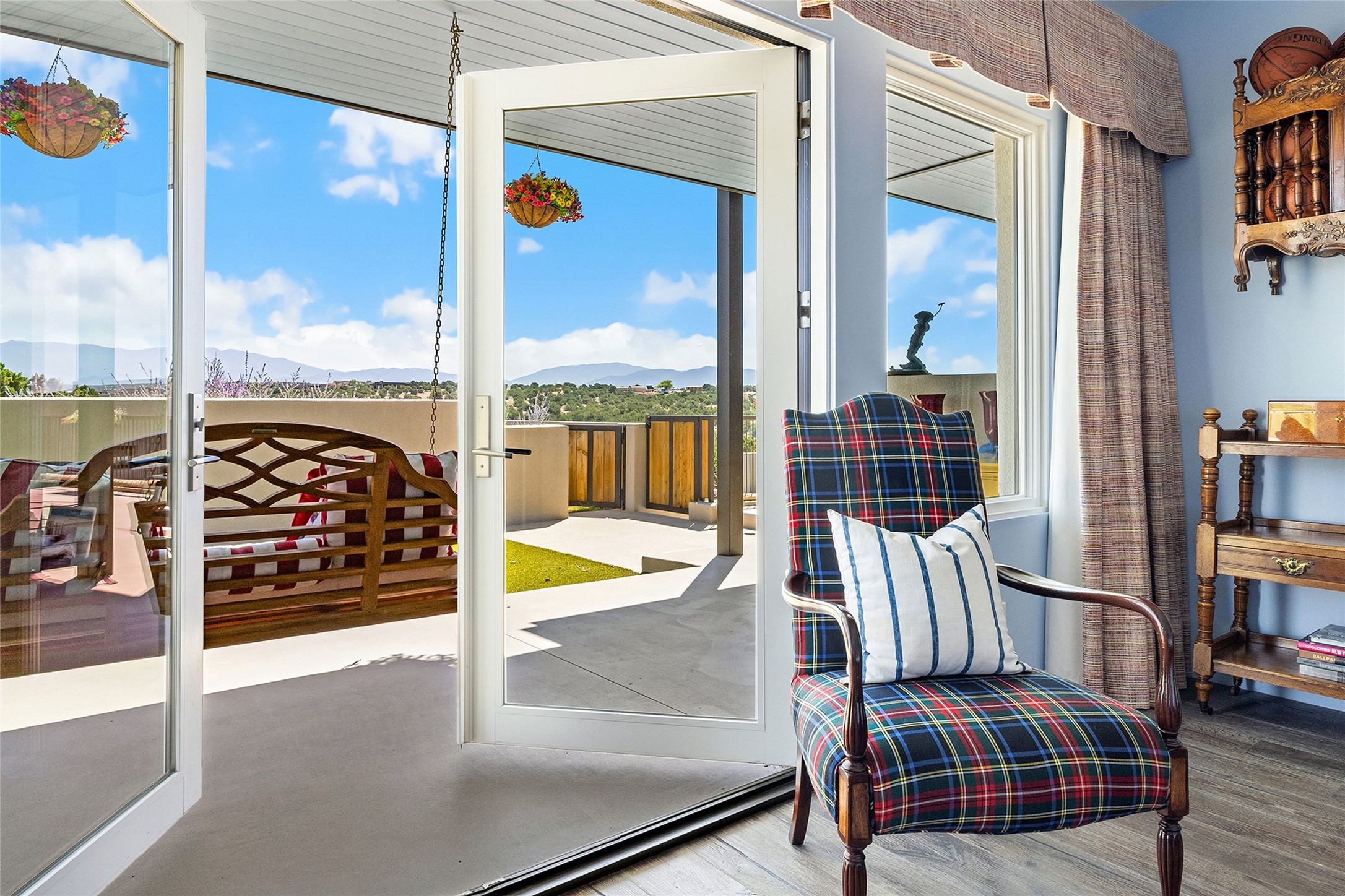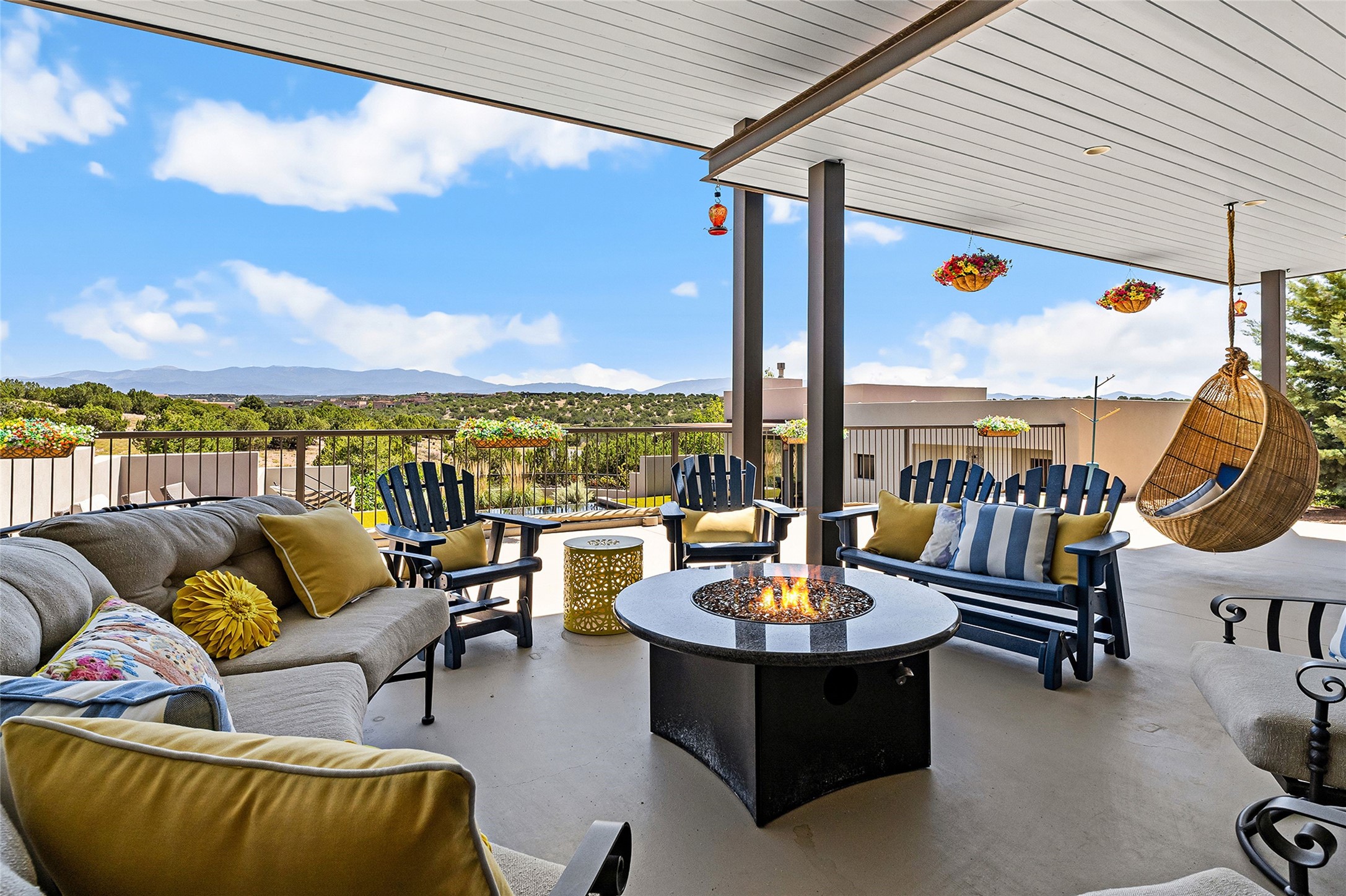 Set within the secure gates of Las Campanas, 96 Sunflower Drive pairs a clean contemporary design with unexpected Victorian-inspired details, where rich wall colors and patterned wallpapers bring warmth and character to the interiors. The four-bedroom main residence and one-bedroom casita are oriented to capture protected, unobstructed views of the Sangre de Cristo Mountains--most dramatically enjoyed from the home's two-tiered outdoor living spaces. The lower terrace centers on an infinity-edged pool, outdoor shower, and wood deck for sunbathing or lounging. Above, an expansive east-facing portal and patio feature a turf lawn, fully equipped outdoor kitchen, and generous dining and seating areas, all framed by the same striking mountain panorama. Inside, the open living, dining, and kitchen area flows naturally for gatherings, with the kitchen offering Wolf appliances, abundant counter space, and bar seating. The primary suite includes two closets, dual vanities, a soaking tub, mountain views, and direct portal access, while three guest suites are privately positioned across the home. A gated driveway leads to the three-car garage. This property is modern yet unexpected with exceptionally polished and inviting outdoor spaces. In one of the closest parts of Las Campanas to town, the next owner gets the benefit of Las Campanas' 24-hour security and on-site emergency medical services while being only 10 minutes from downtown.
