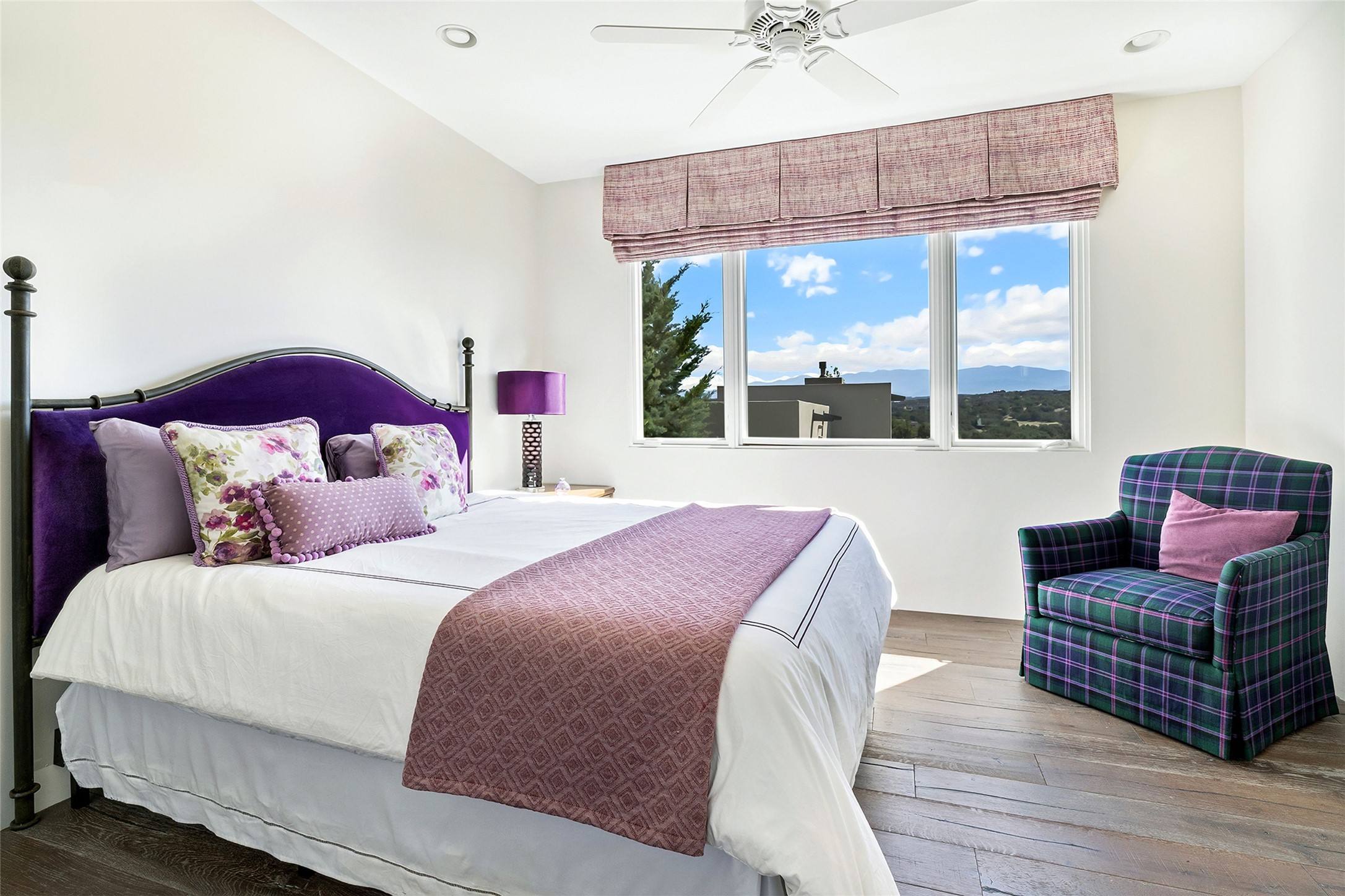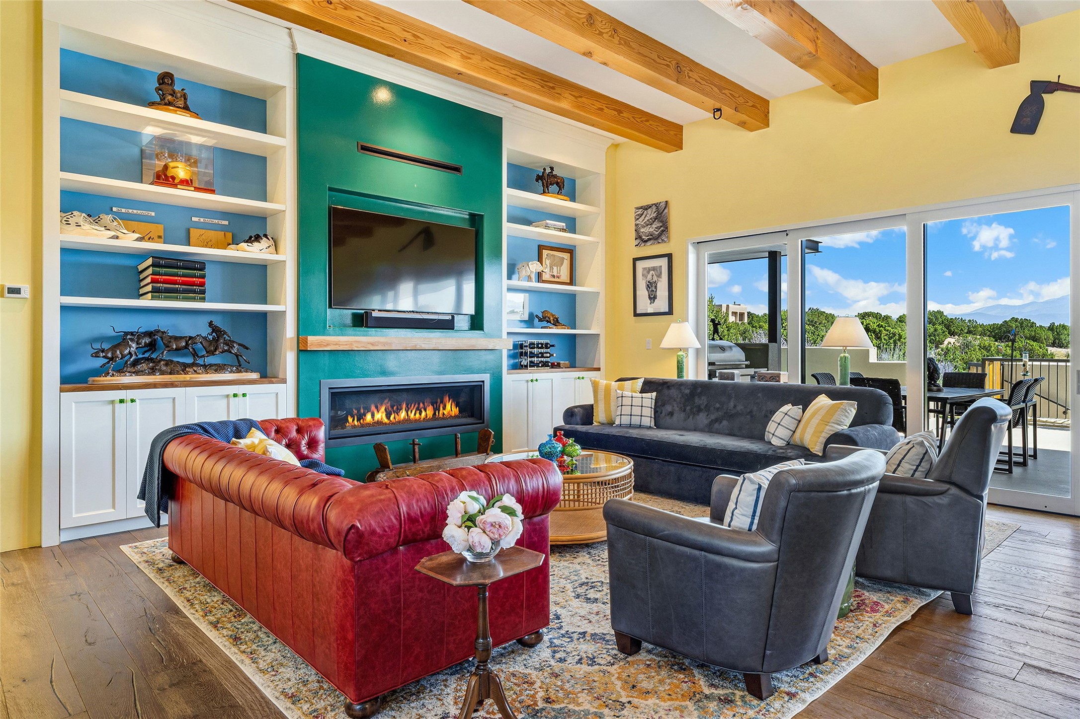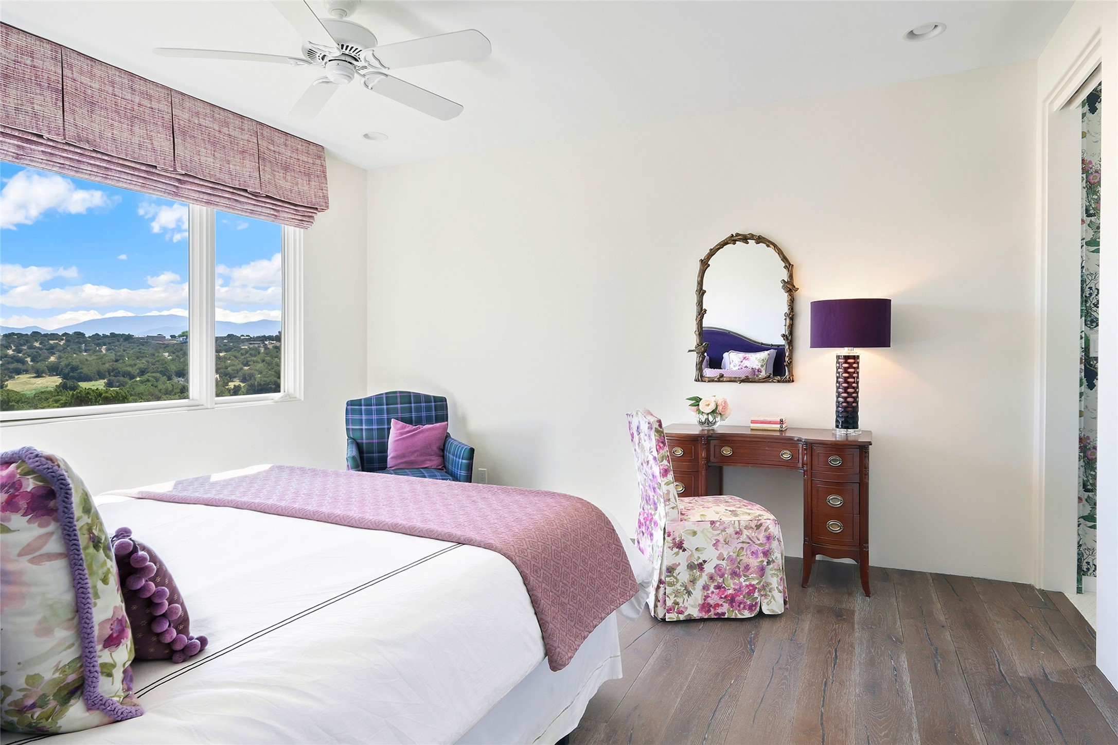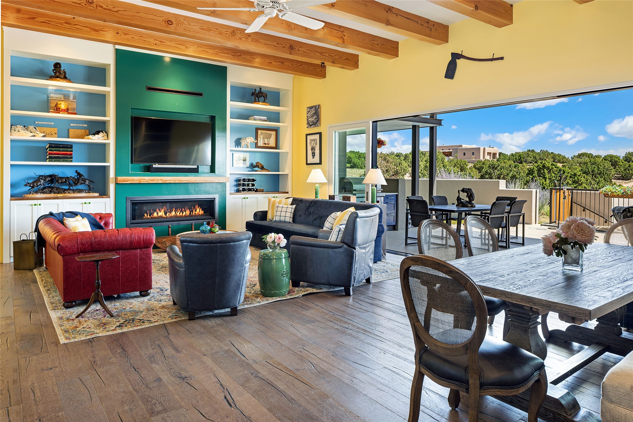 Set within the secure gates of Las Campanas, 96 Sunflower Drive pairs a clean contemporary design with unexpected Victorian-inspired details, where rich wall colors and patterned wallpapers bring warmth and character to the interiors. The four-bedroom main residence and one-bedroom casita are oriented to capture protected, unobstructed views of the Sangre de Cristo Mountains--most dramatically enjoyed from the home's two-tiered outdoor living spaces. The lower terrace centers on an infinity-edged pool, outdoor shower, and wood deck for sunbathing or lounging. Above, an expansive east-facing portal and patio feature a turf lawn, fully equipped outdoor kitchen, and generous dining and seating areas, all framed by the same striking mountain panorama. Inside, the open living, dining, and kitchen area flows naturally for gatherings, with the kitchen offering Wolf appliances, abundant counter space, and bar seating. The primary suite includes two closets, dual vanities, a soaking tub, mountain views, and direct portal access, while three guest suites are privately positioned across the home. A gated driveway leads to the three-car garage. This property is modern yet unexpected with exceptionally polished and inviting outdoor spaces. In one of the closest parts of Las Campanas to town, the next owner gets the benefit of Las Campanas' 24-hour security and on-site emergency medical services while being only 10 minutes from downtown.
