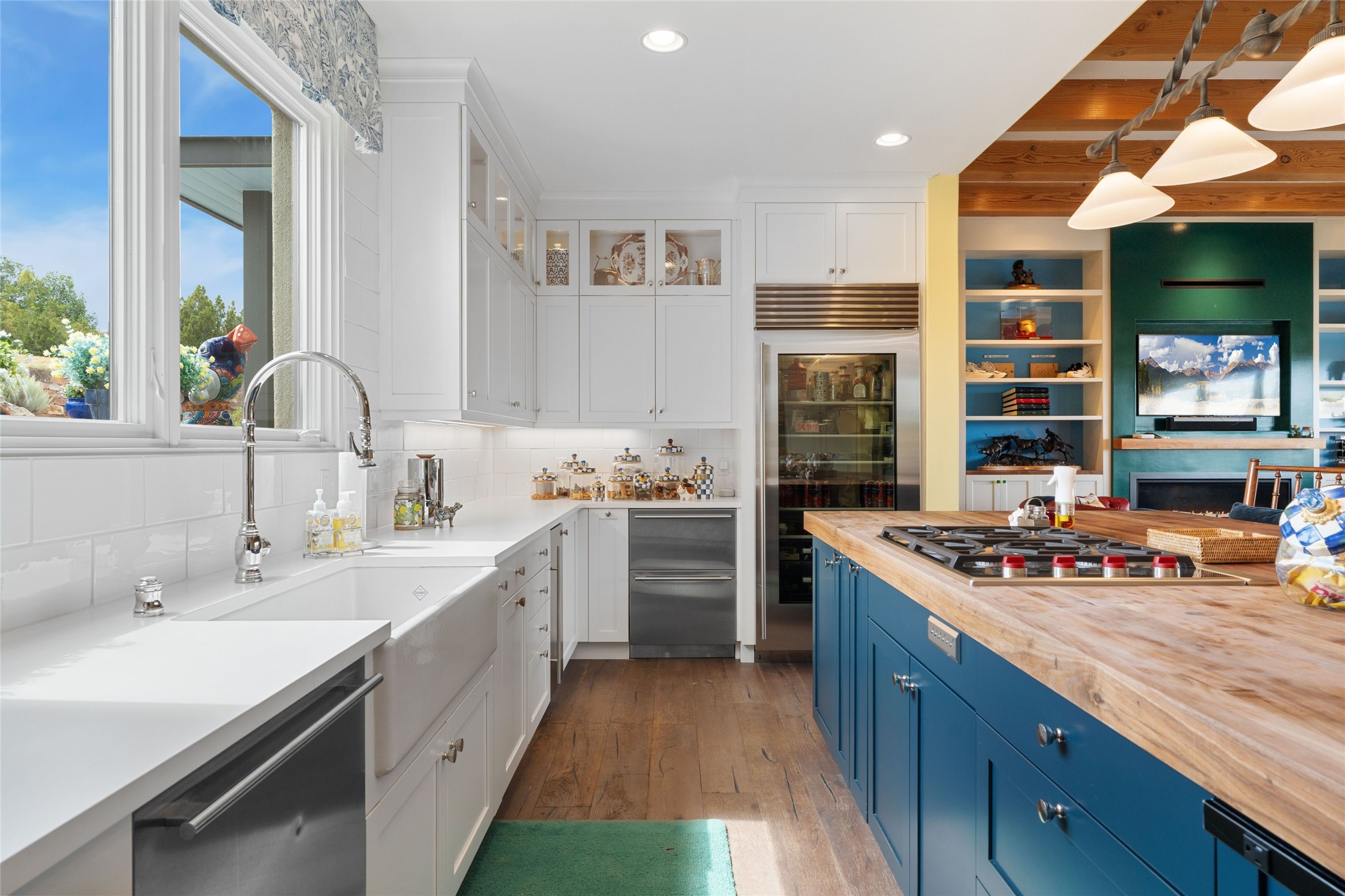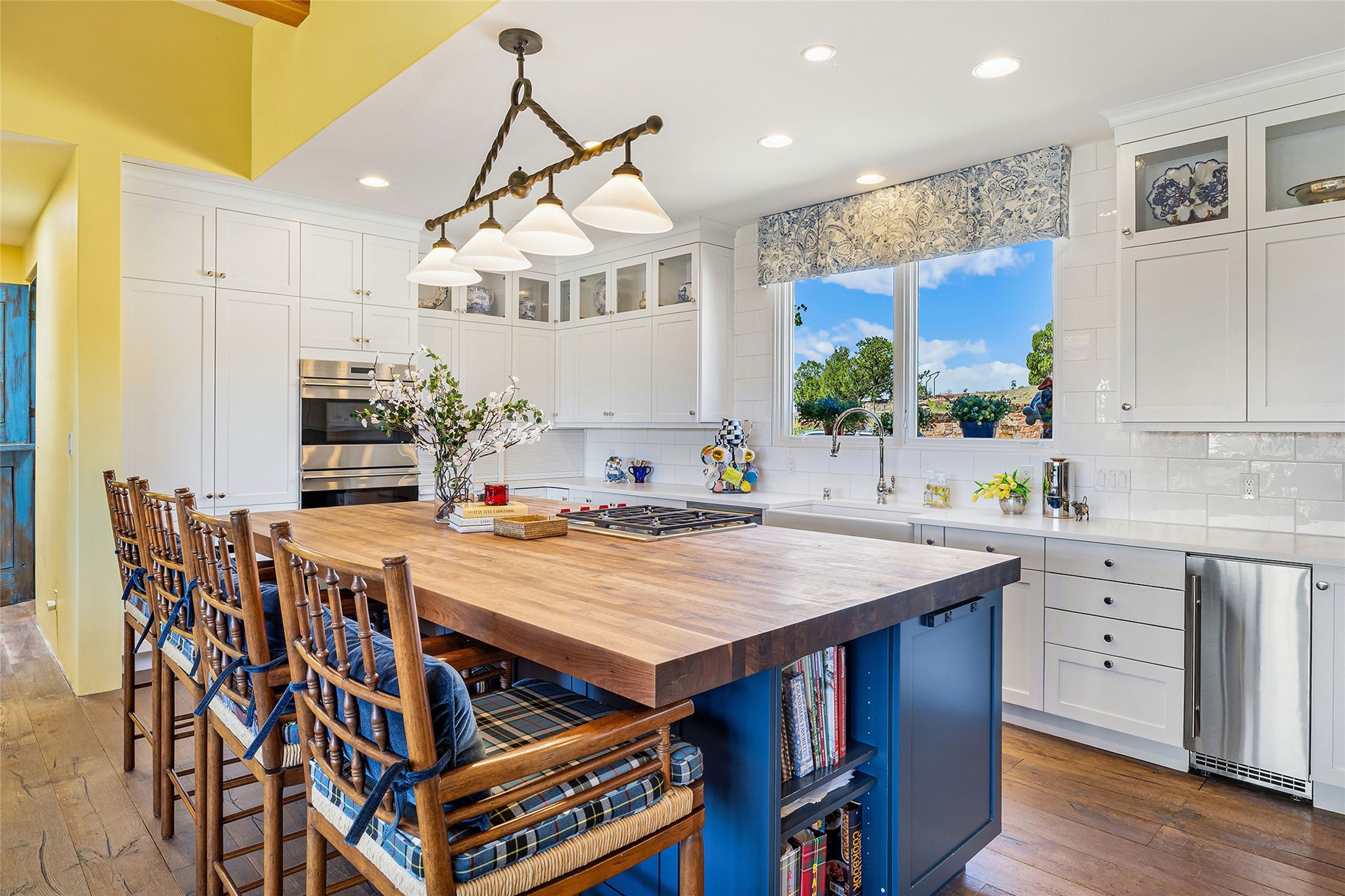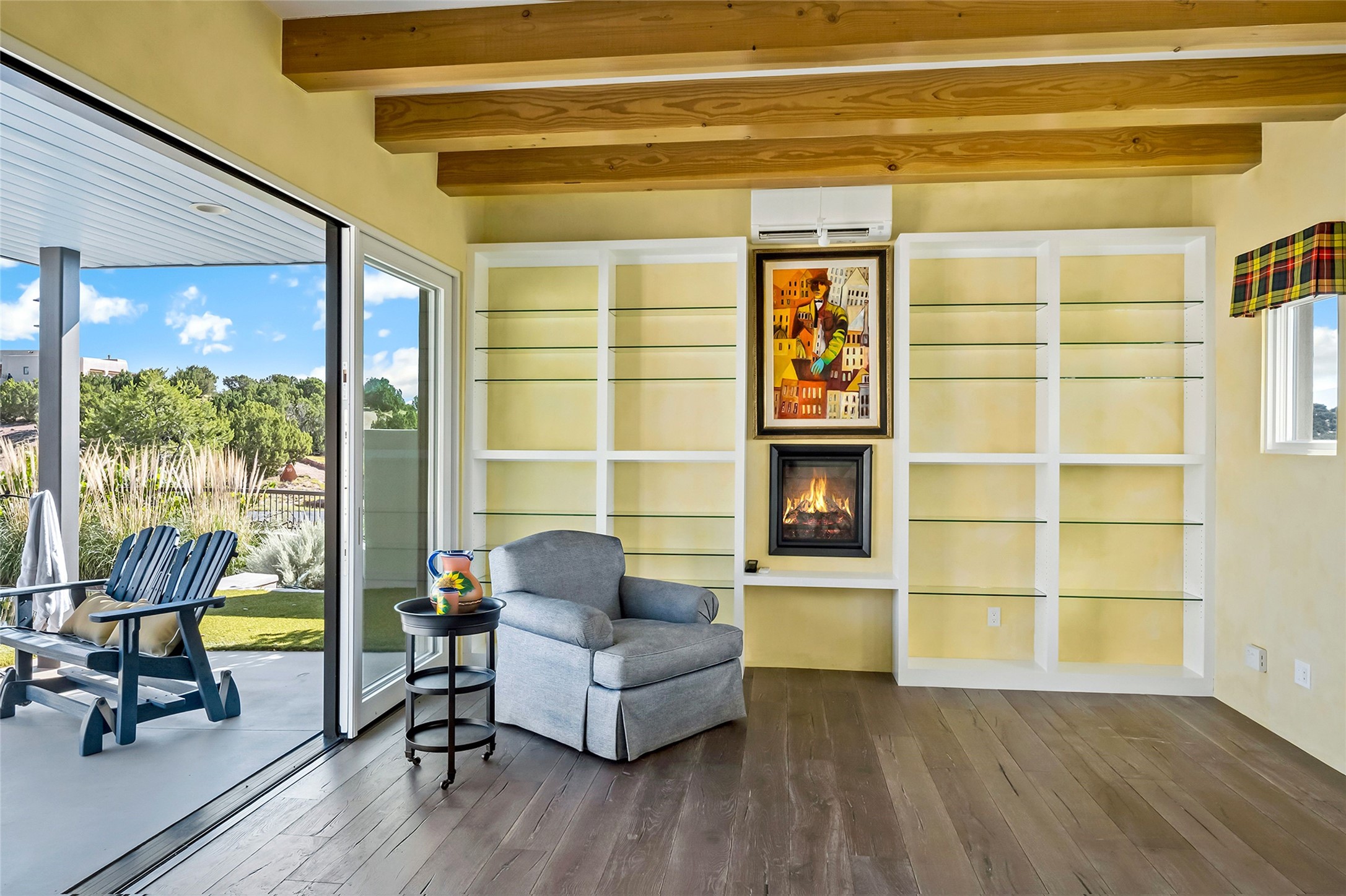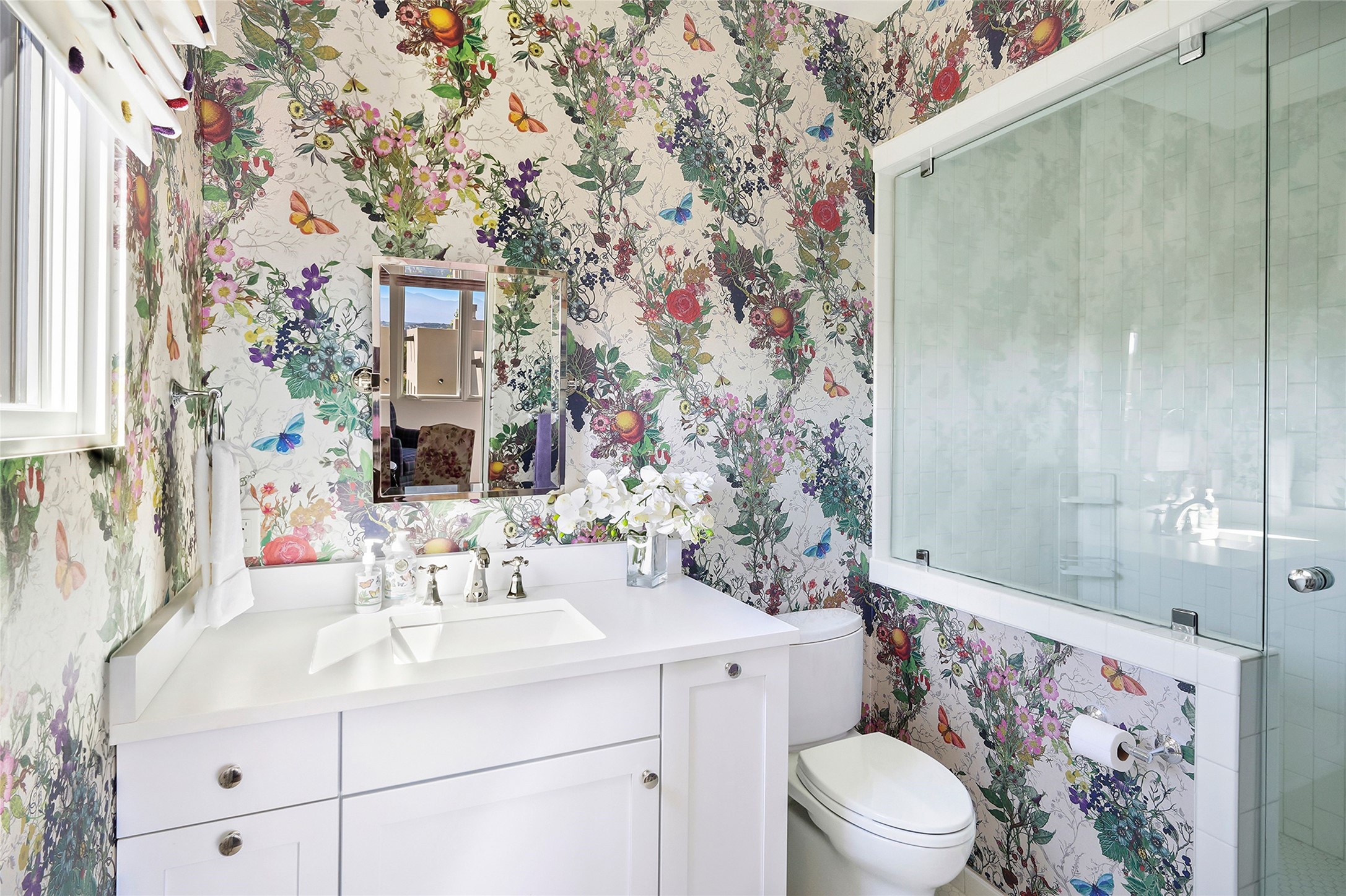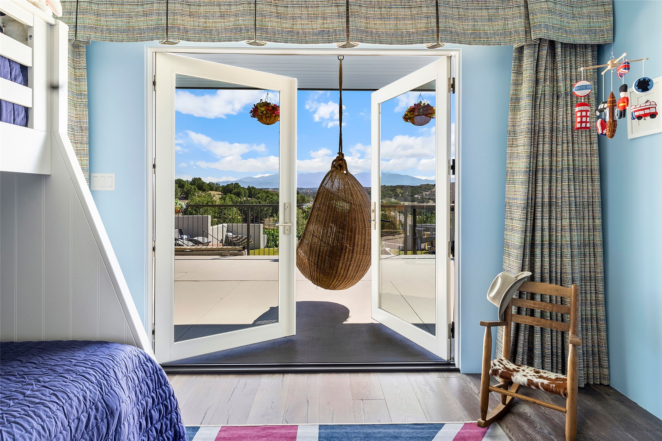 Set within the secure gates of Las Campanas, 96 Sunflower Drive pairs a clean contemporary design with unexpected Victorian-inspired details, where rich wall colors and patterned wallpapers bring warmth and character to the interiors. The four-bedroom main residence and one-bedroom casita are oriented to capture protected, unobstructed views of the Sangre de Cristo Mountains--most dramatically enjoyed from the home's two-tiered outdoor living spaces. The lower terrace centers on an infinity-edged pool, outdoor shower, and wood deck for sunbathing or lounging. Above, an expansive east-facing portal and patio feature a turf lawn, fully equipped outdoor kitchen, and generous dining and seating areas, all framed by the same striking mountain panorama. Inside, the open living, dining, and kitchen area flows naturally for gatherings, with the kitchen offering Wolf appliances, abundant counter space, and bar seating. The primary suite includes two closets, dual vanities, a soaking tub, mountain views, and direct portal access, while three guest suites are privately positioned across the home. A gated driveway leads to the three-car garage. This property is modern yet unexpected with exceptionally polished and inviting outdoor spaces. In one of the closest parts of Las Campanas to town, the next owner gets the benefit of Las Campanas' 24-hour security and on-site emergency medical services while being only 10 minutes from downtown.