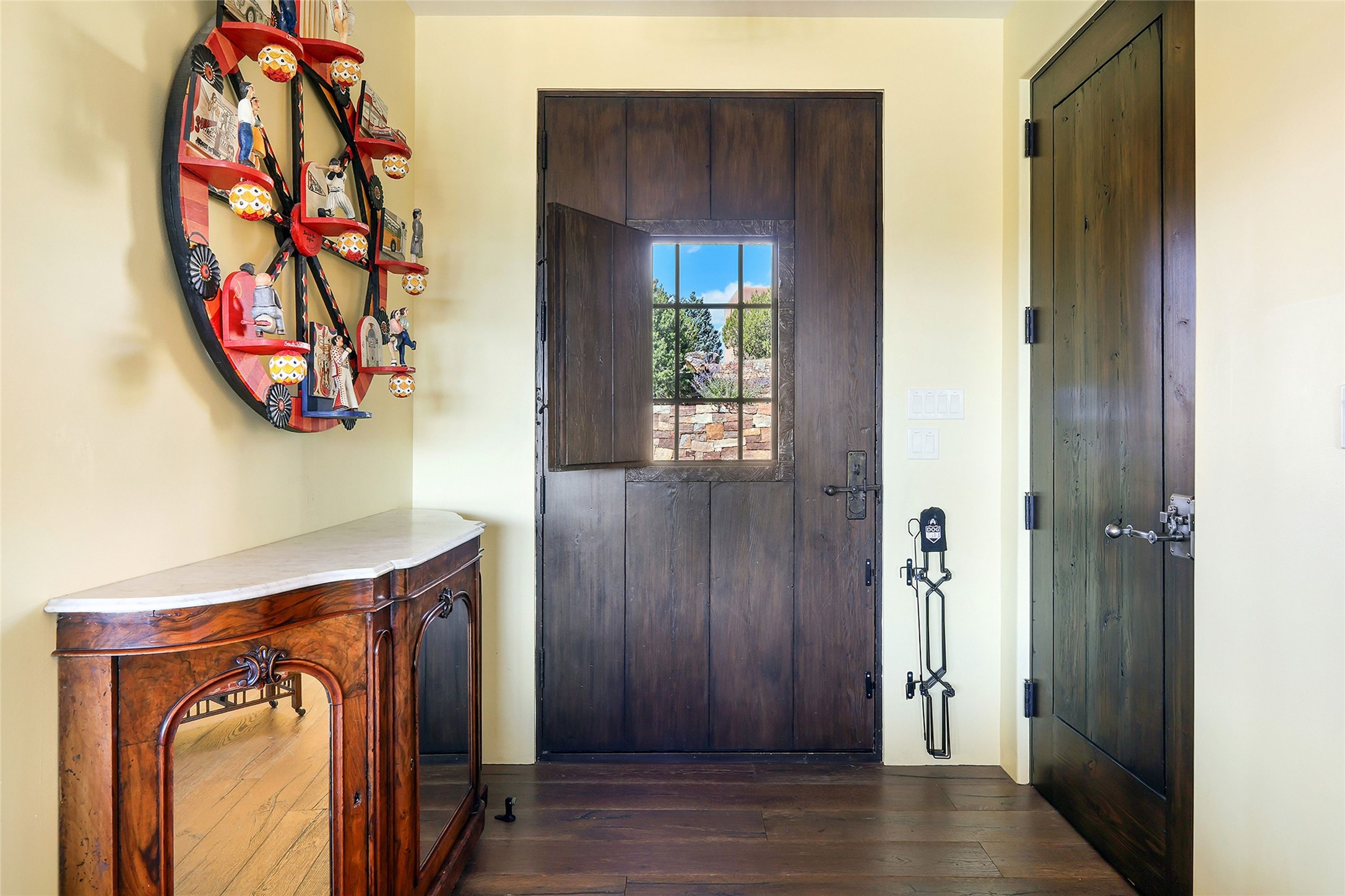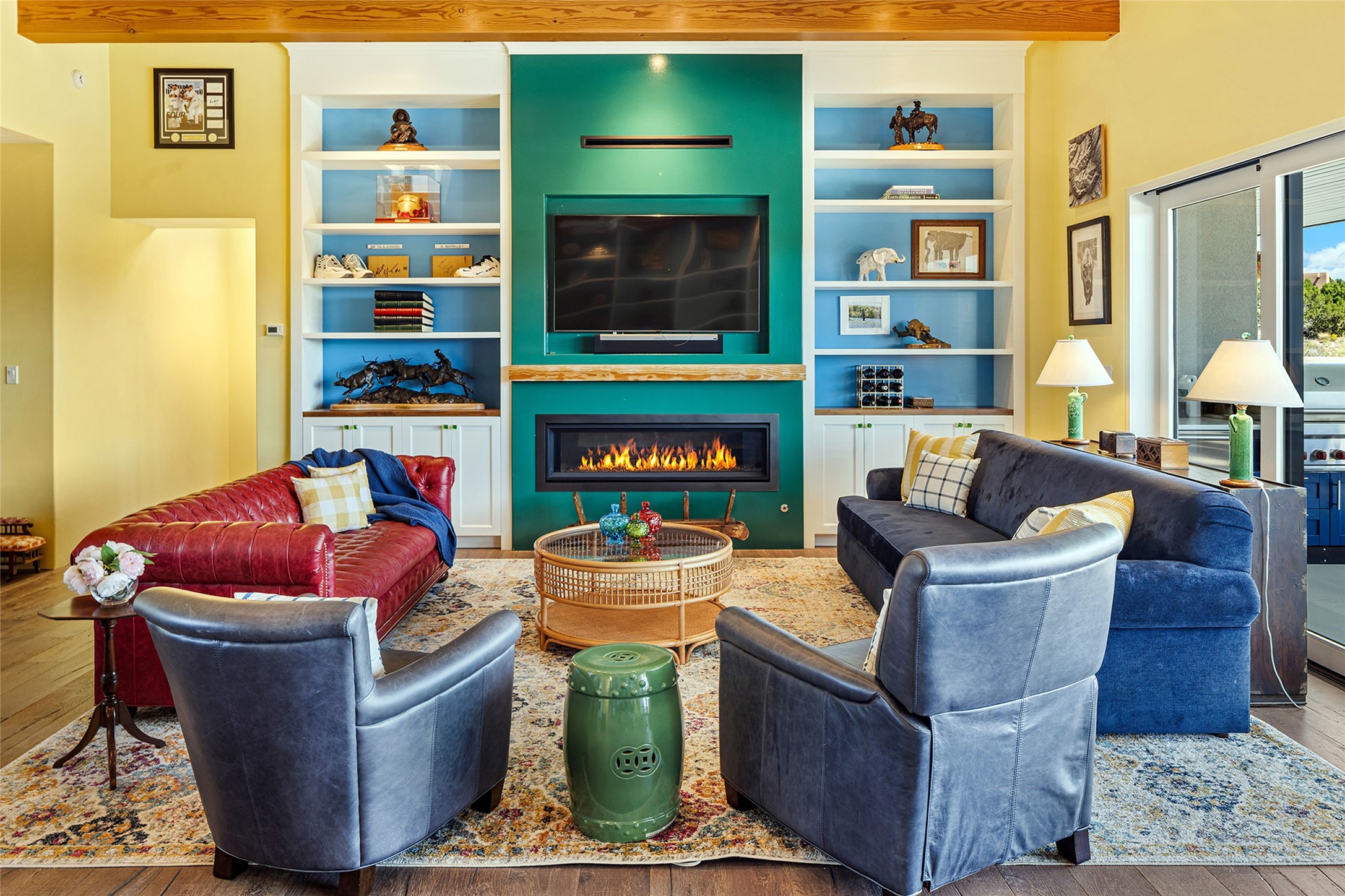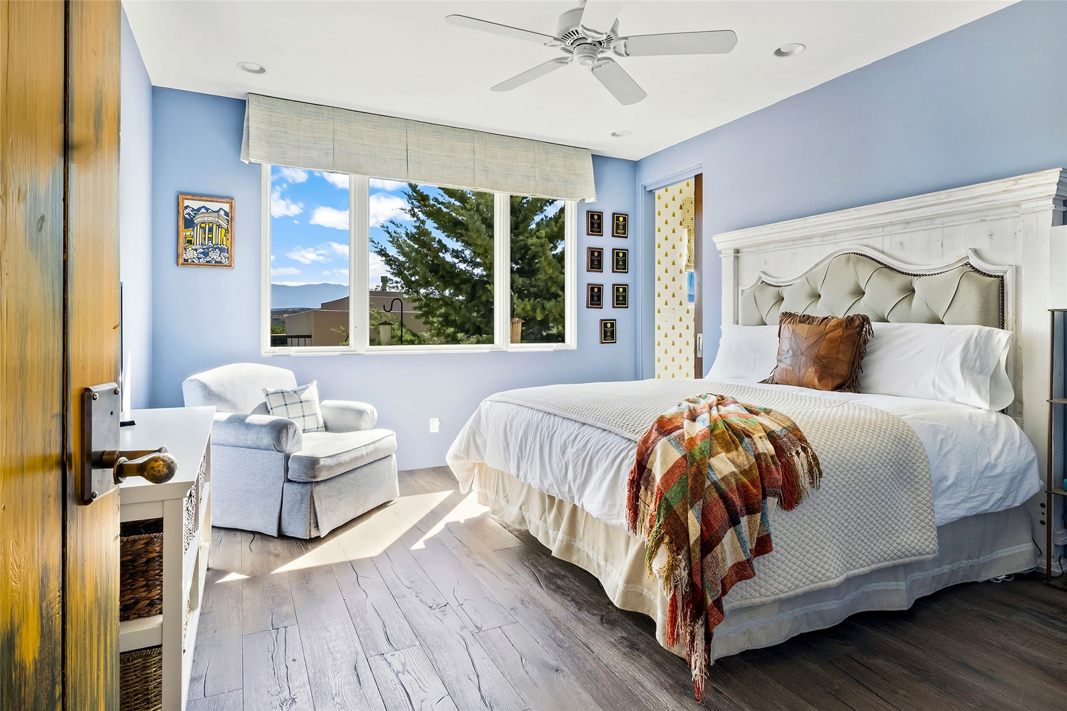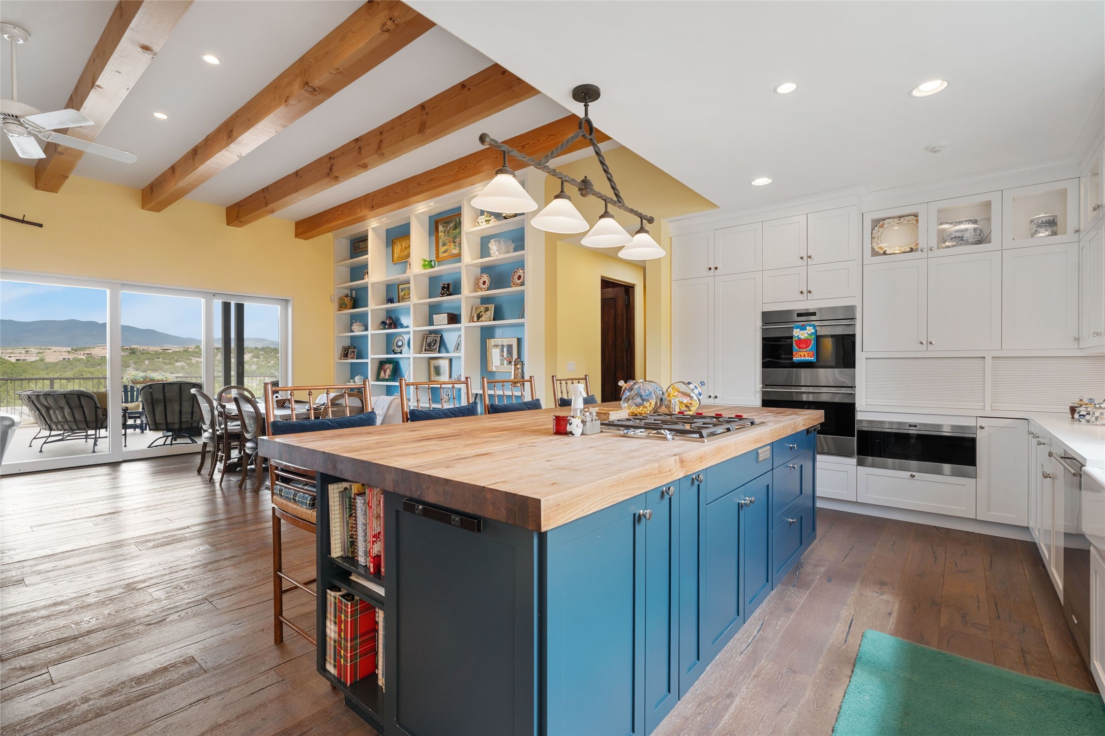Set within the secure gates of Las Campanas, 96 Sunflower Drive pairs a clean contemporary design with unexpected Victorian-inspired details, where rich wall colors and patterned wallpapers bring warmth and character to the interiors. The four-bedroom main residence and one-bedroom casita are oriented to capture protected, unobstructed views of the Sangre de Cristo Mountains--most dramatically enjoyed from the home's two-tiered outdoor living spaces. The lower terrace centers on an infinity-edged pool, outdoor shower, and wood deck for sunbathing or lounging. Above, an expansive east-facing portal and patio feature a turf lawn, fully equipped outdoor kitchen, and generous dining and seating areas, all framed by the same striking mountain panorama. Inside, the open living, dining, and kitchen area flows naturally for gatherings, with the kitchen offering Wolf appliances, abundant counter space, and bar seating. The primary suite includes two closets, dual vanities, a soaking tub, mountain views, and direct portal access, while three guest suites are privately positioned across the home. A gated driveway leads to the three-car garage. This property is modern yet unexpected with exceptionally polished and inviting outdoor spaces. In one of the closest parts of Las Campanas to town, the next owner gets the benefit of Las Campanas' 24-hour security and on-site emergency medical services while being only 10 minutes from downtown.