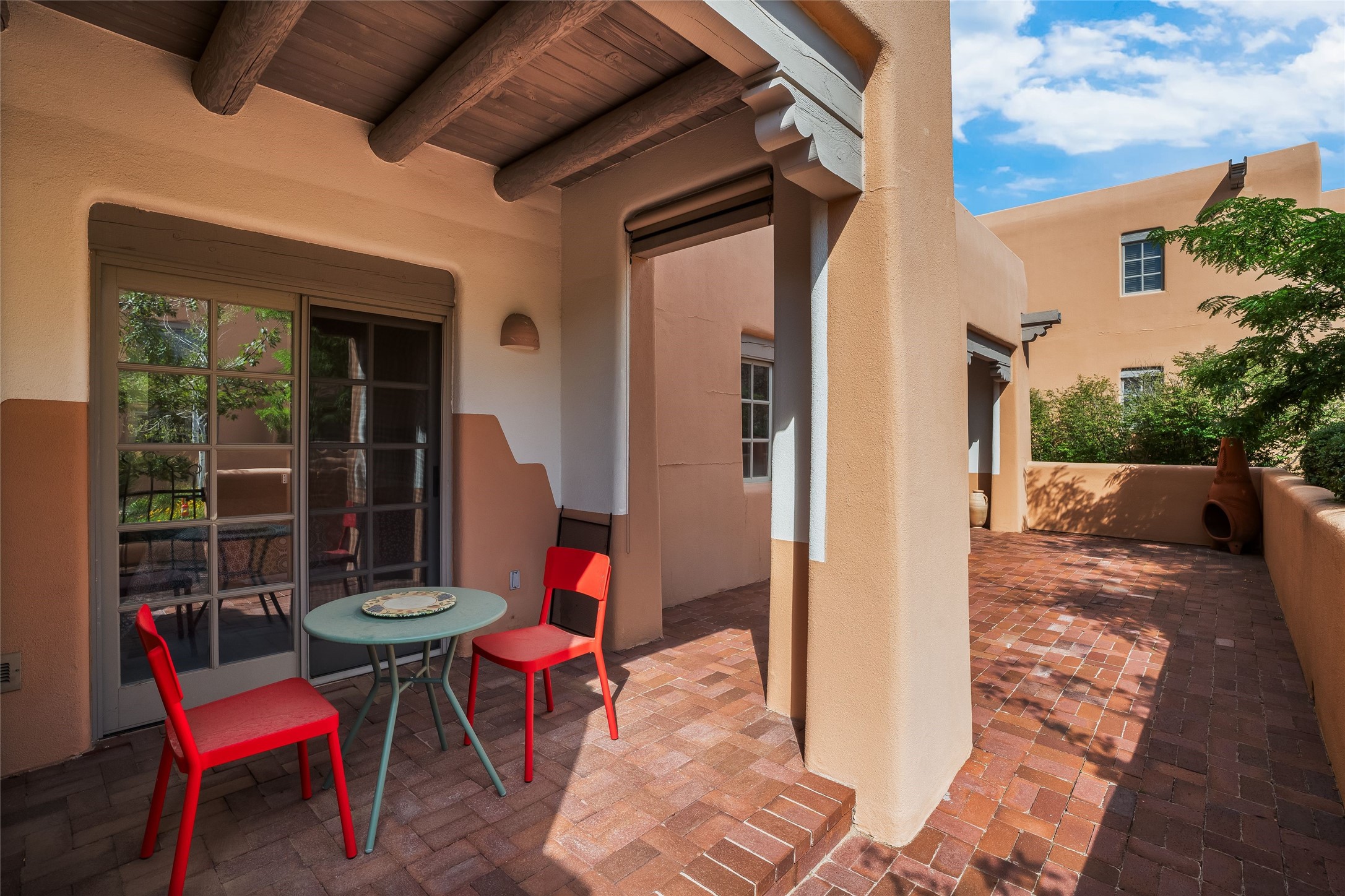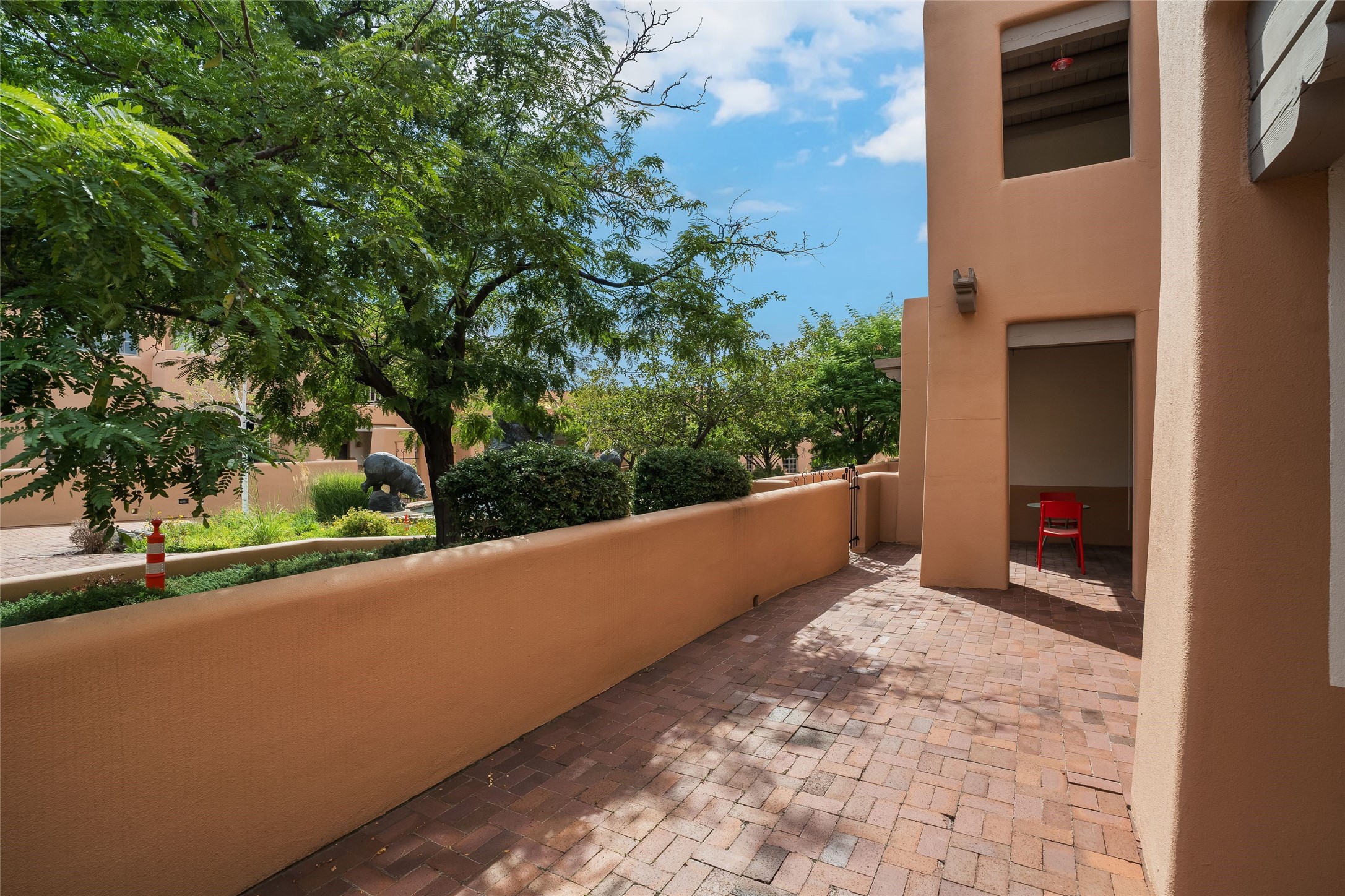 Easy living in this highly coveted Plaza Condo location at Quail Run! Not only is this home a first floor unit, it is the end unit by the bear sculpture fountain with beautiful southern light alignment for the spacious living room windows and private patio. The home has no steps, 2 bedrooms separated by a large living room with door and generous windows opening to the sizeable patio. The second bedroom is currently furnished as an office. The condo is being sold turn-key, with furniture and kitchenware included. Quail Run is a beautiful, gated community that is designed and equipped for convenient access. The HOA fee covers all amenities: golf, indoor pool, gym, fitness classes, tennis, pickle ball, 24 hour hosted security, exterior maintenance, stucco, roof, windows, patio bricks, courtyard wall. This residence is perfect for full-time living or as a lock and leave. Reside close to all Santa Fe has to offer-restaurants, galleries, museums, the Santa Fe Opera, hiking, skiing, year-round festivals, music concerts, lectures, theatre performances.