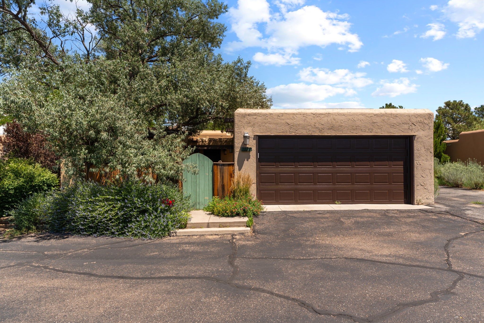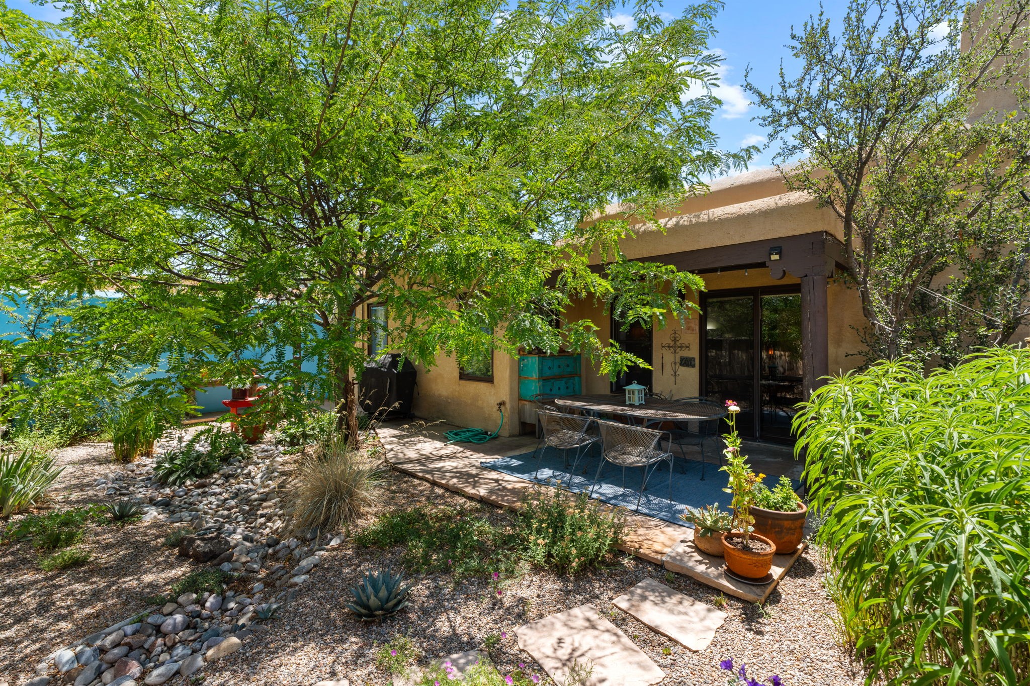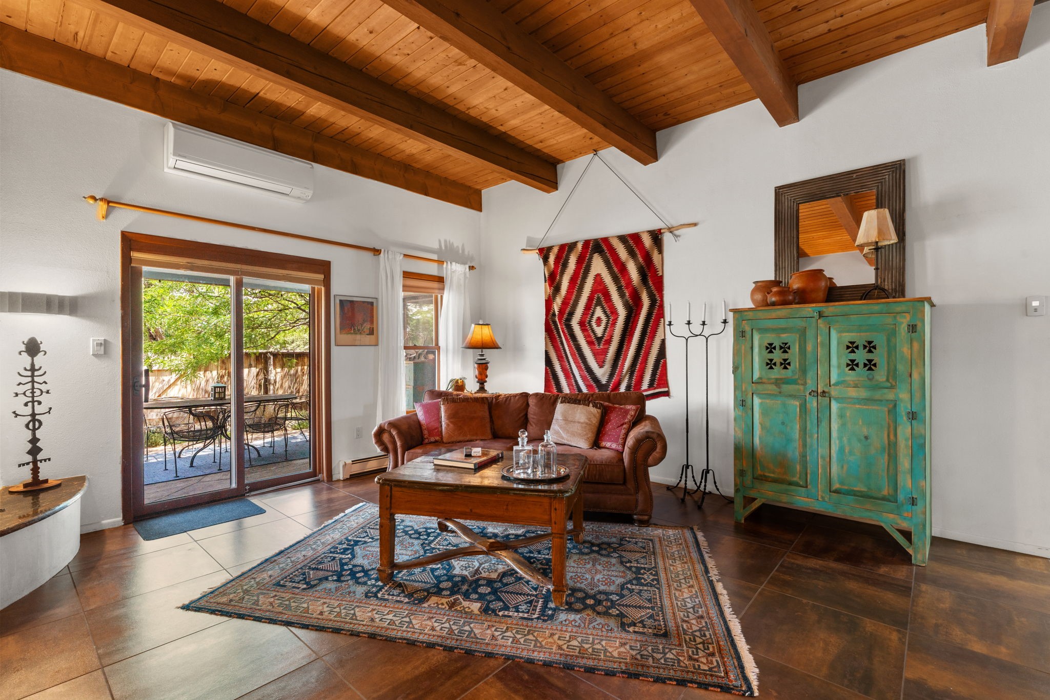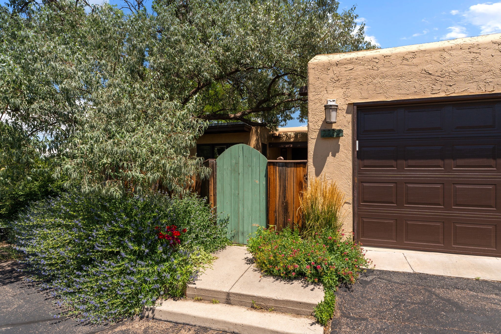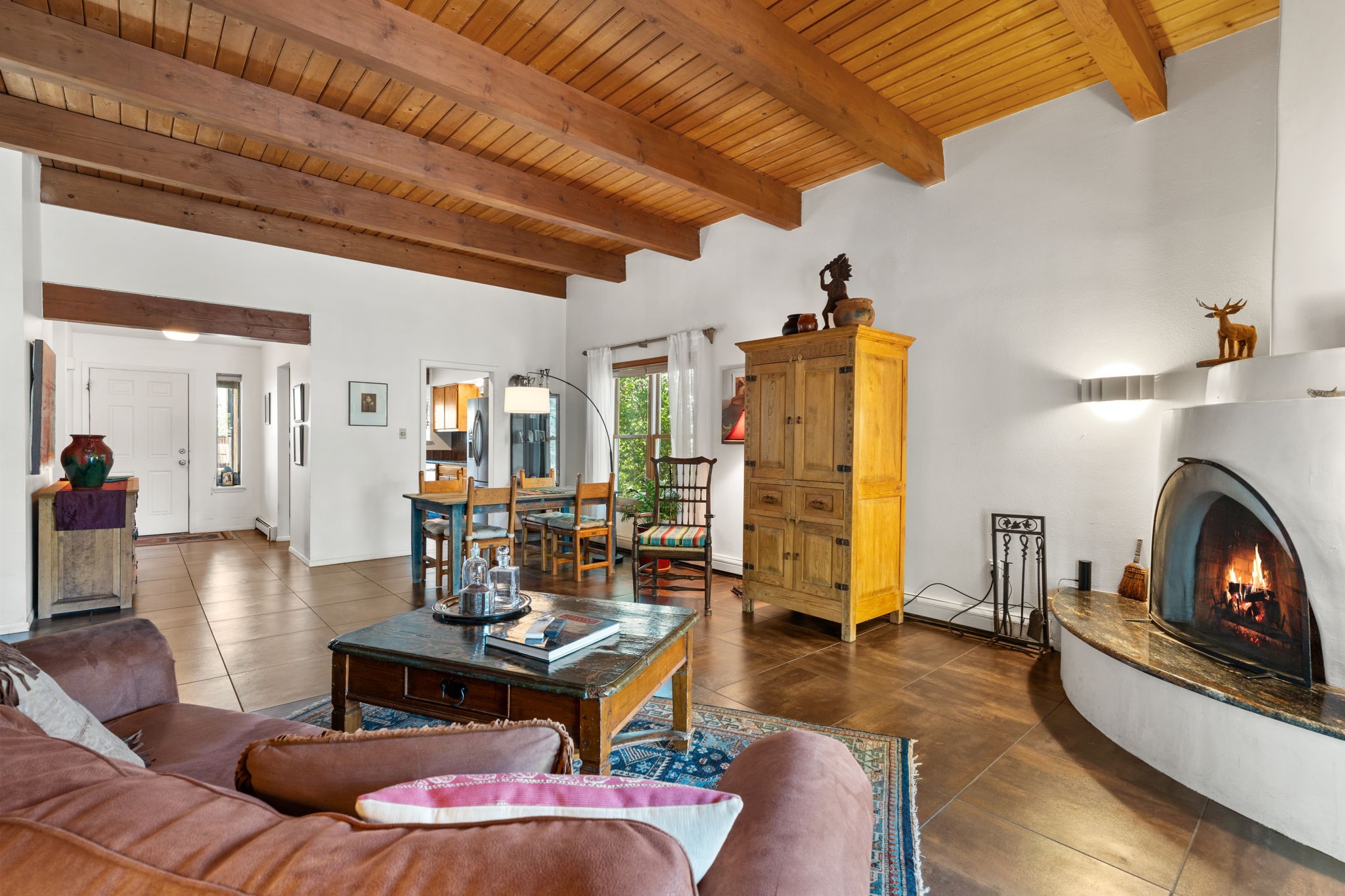 Tucked into a quiet, private cul-de-sac in the sought-after Park Plazas community, this beautifully updated 1,806 sq. ft. home offers the perfect blend of Santa Fe charm and modern comfort. With 2 spacious bedrooms, plus a versatile library or office featuring exquisite built-in bookshelves, this home provides both elegance and flexibility.Step inside to find 2-foot by 2-foot tile floors flowing throughout, enhancing the clean lines and warm ambiance of the interior. The inviting living and dining area boasts a high beamed ceiling over rich tongue-and-groove wood, anchored by a stunning corner Kiva fireplace -- the ideal spot to gather on crisp Santa Fe evenings. Sliding doors open to a covered portal and a flagstone patio that overlooks lush landscaping lovingly designed by the seller, a Master Gardener, creating a tranquil outdoor sanctuary.The kitchen is a chef's delight, thoughtfully renovated with sleek granite countertops, stainless steel appliances, and abundant cabinetry. Just off the kitchen, a charming breakfast nook/sunroom is bathed in natural light from three sides -- perfect for morning coffee or an afternoon read.Additional highlights include a two-year-old boiler and water heater, a recently installed mini-split A/C (1 year old), and a newer garage door with updated motor. The private entry courtyard is beautifully landscaped, setting a peaceful tone before you even step inside.The home also includes a 2-car garage and access to the exceptional amenities of Park Plazas: tennis courts, miles of walking trails, an off-leash dog park, community garden, and more -- all just 15 minutes from the heart of Santa Fe.This is more than a home -- it's a lifestyle. Come experience the comfort, beauty, and serenity this special property offers.