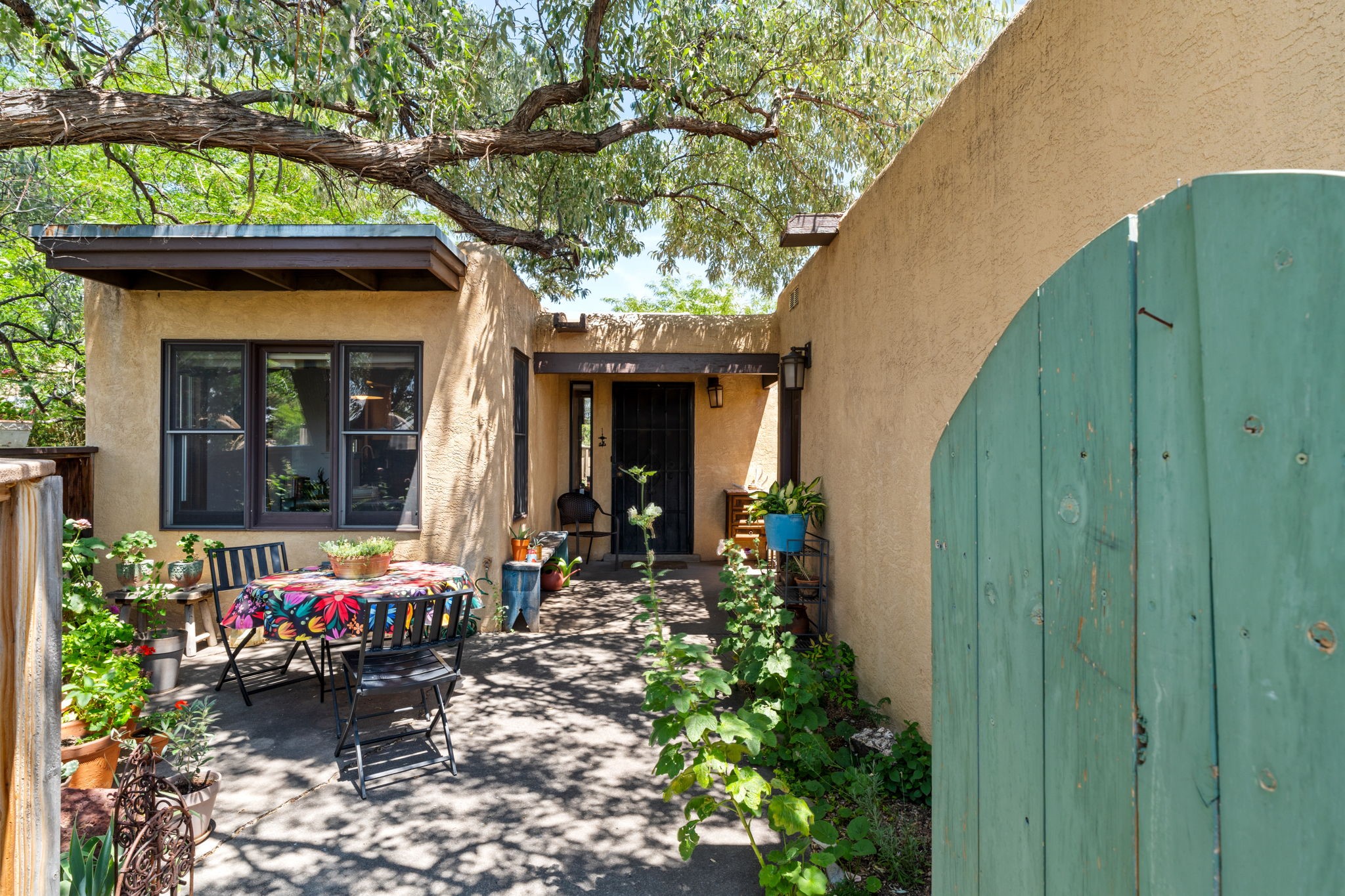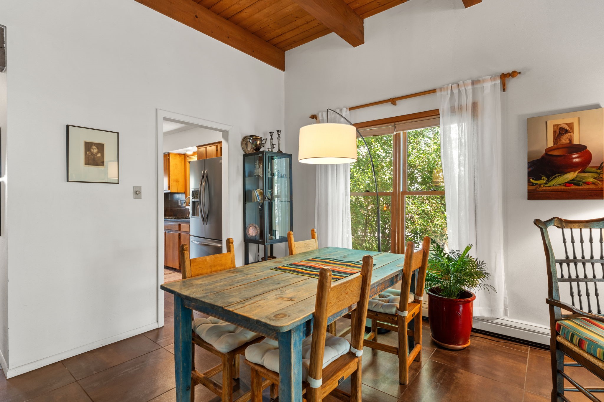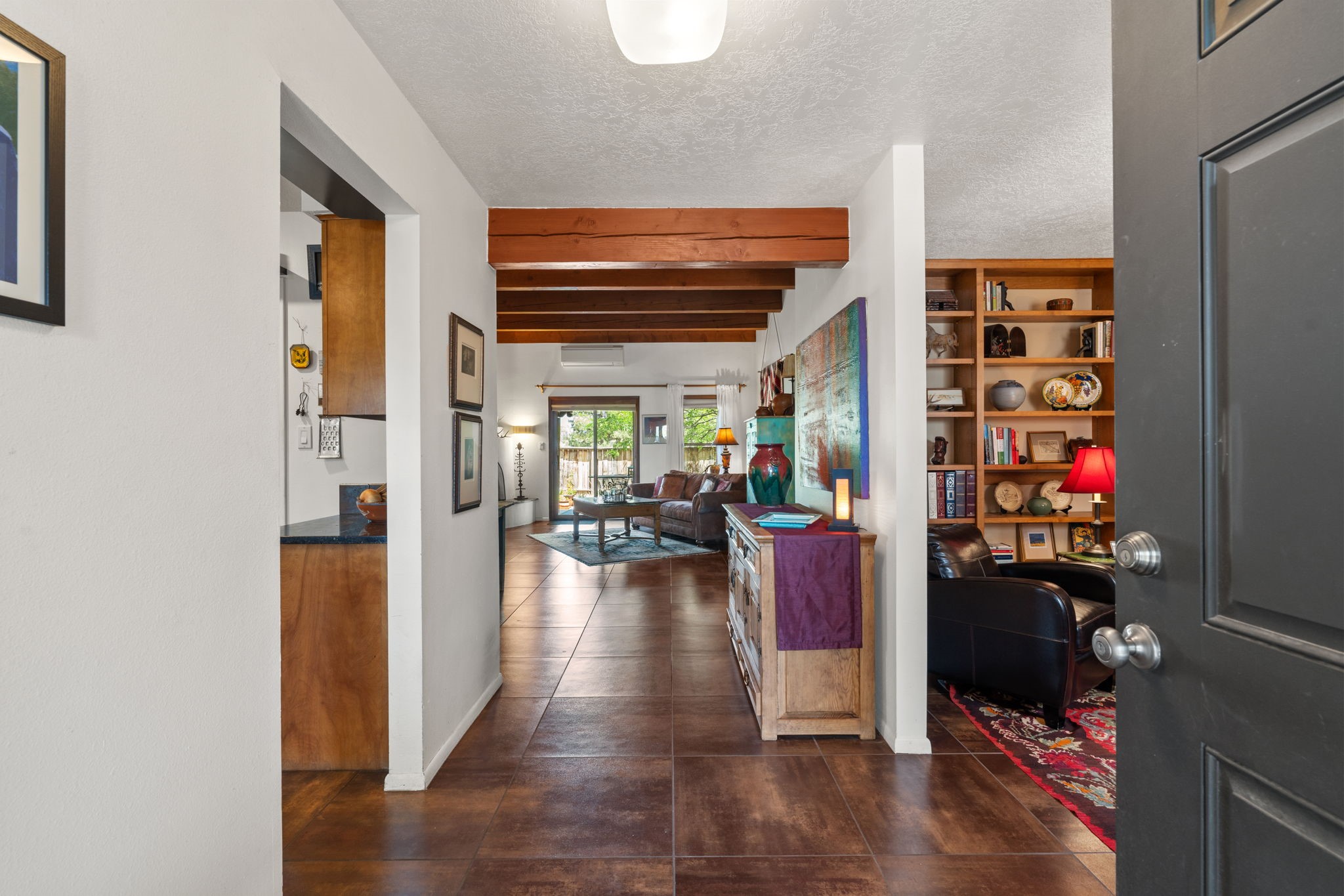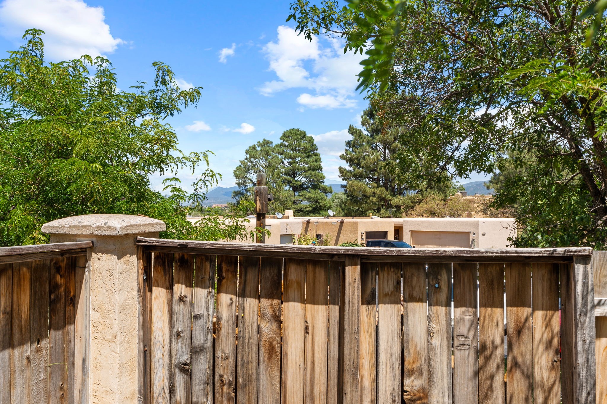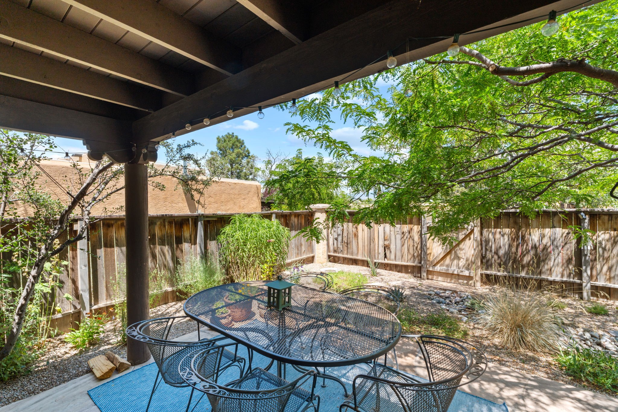 Tucked into a quiet, private cul-de-sac in the sought-after Park Plazas community, this beautifully updated 1,806 sq. ft. home offers the perfect blend of Santa Fe charm and modern comfort. With 2 spacious bedrooms, plus a versatile library or office featuring exquisite built-in bookshelves, this home provides both elegance and flexibility.Step inside to find 2-foot by 2-foot tile floors flowing throughout, enhancing the clean lines and warm ambiance of the interior. The inviting living and dining area boasts a high beamed ceiling over rich tongue-and-groove wood, anchored by a stunning corner Kiva fireplace -- the ideal spot to gather on crisp Santa Fe evenings. Sliding doors open to a covered portal and a flagstone patio that overlooks lush landscaping lovingly designed by the seller, a Master Gardener, creating a tranquil outdoor sanctuary.The kitchen is a chef's delight, thoughtfully renovated with sleek granite countertops, stainless steel appliances, and abundant cabinetry. Just off the kitchen, a charming breakfast nook/sunroom is bathed in natural light from three sides -- perfect for morning coffee or an afternoon read.Additional highlights include a two-year-old boiler and water heater, a recently installed mini-split A/C (1 year old), and a newer garage door with updated motor. The private entry courtyard is beautifully landscaped, setting a peaceful tone before you even step inside.The home also includes a 2-car garage and access to the exceptional amenities of Park Plazas: tennis courts, miles of walking trails, an off-leash dog park, community garden, and more -- all just 15 minutes from the heart of Santa Fe.This is more than a home -- it's a lifestyle. Come experience the comfort, beauty, and serenity this special property offers.