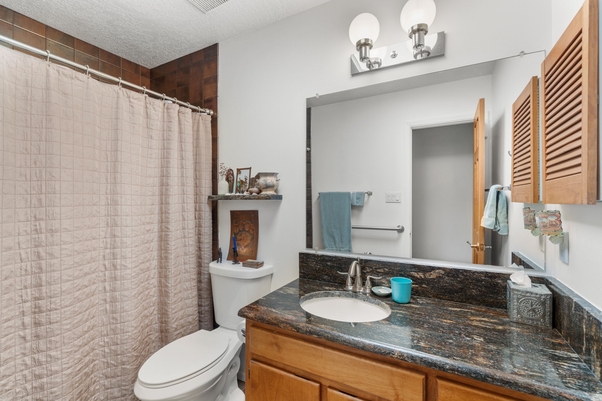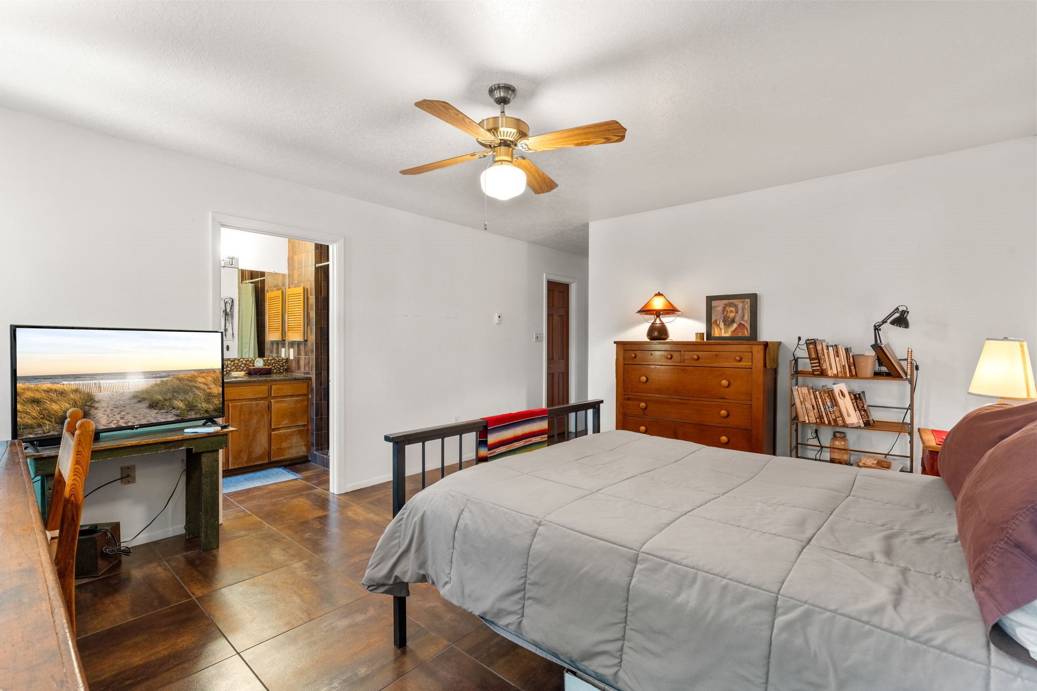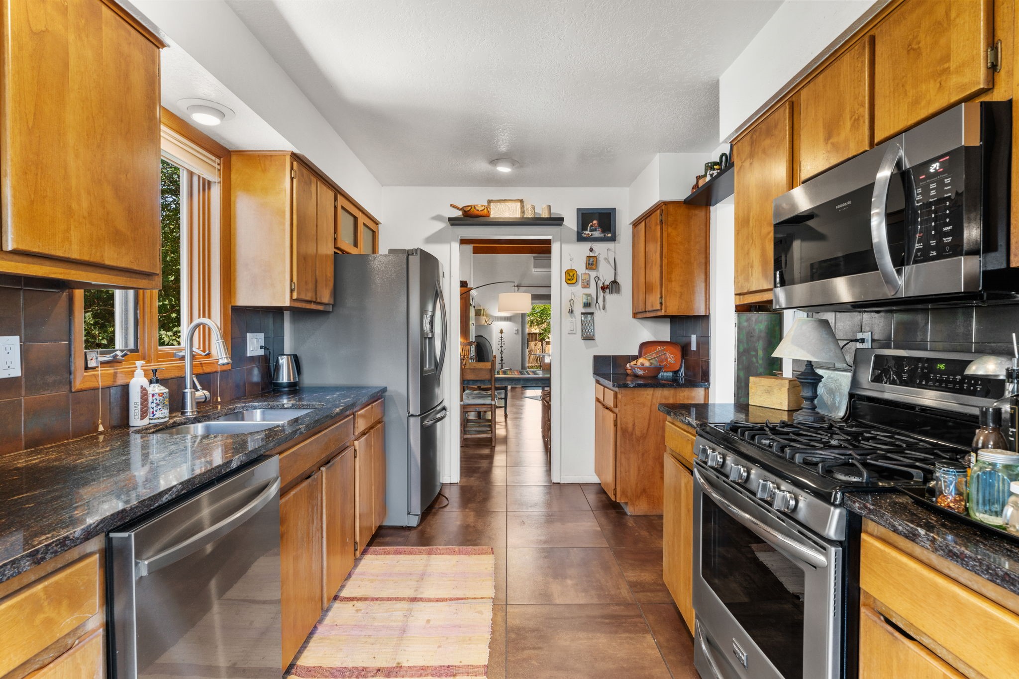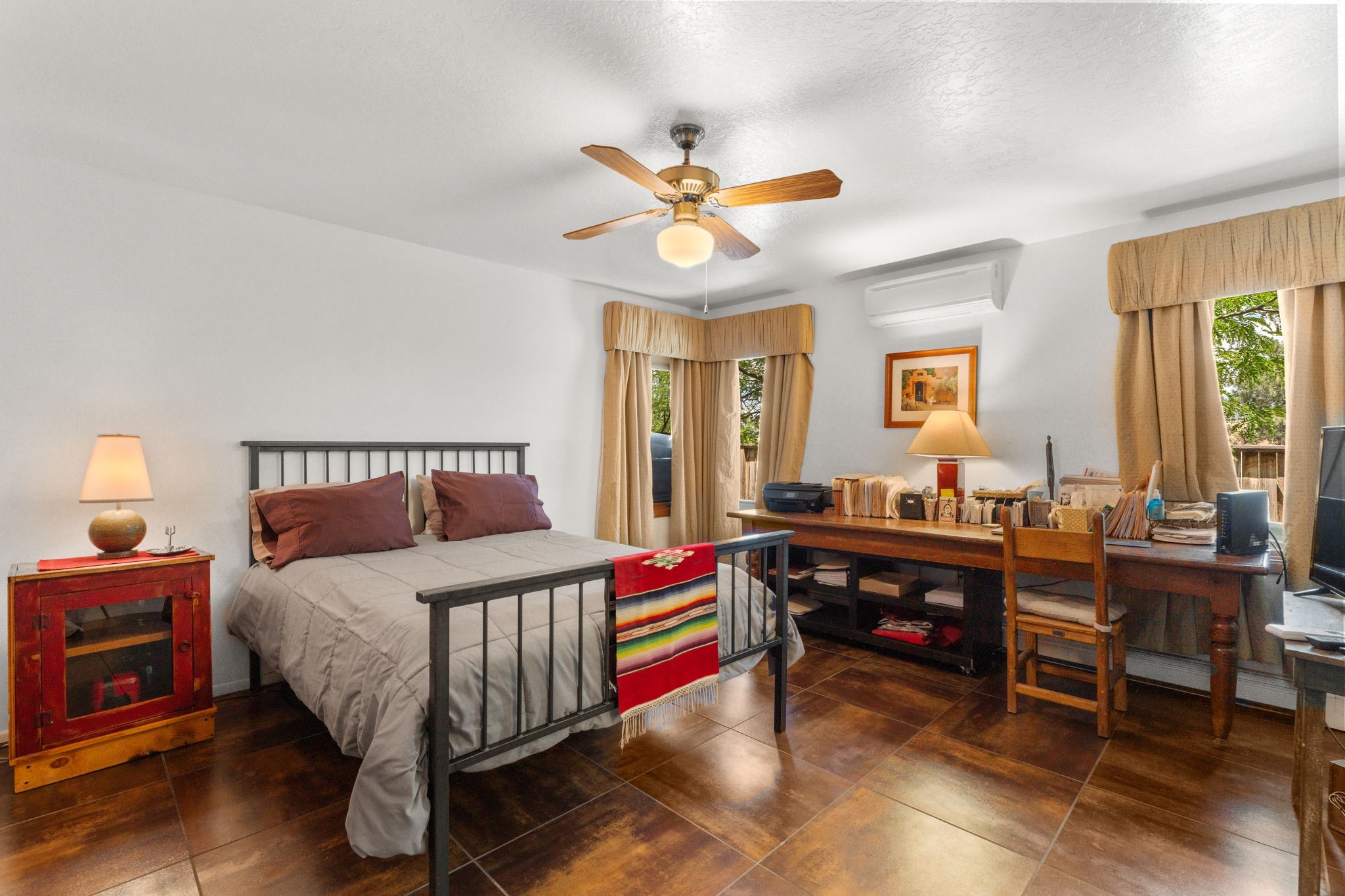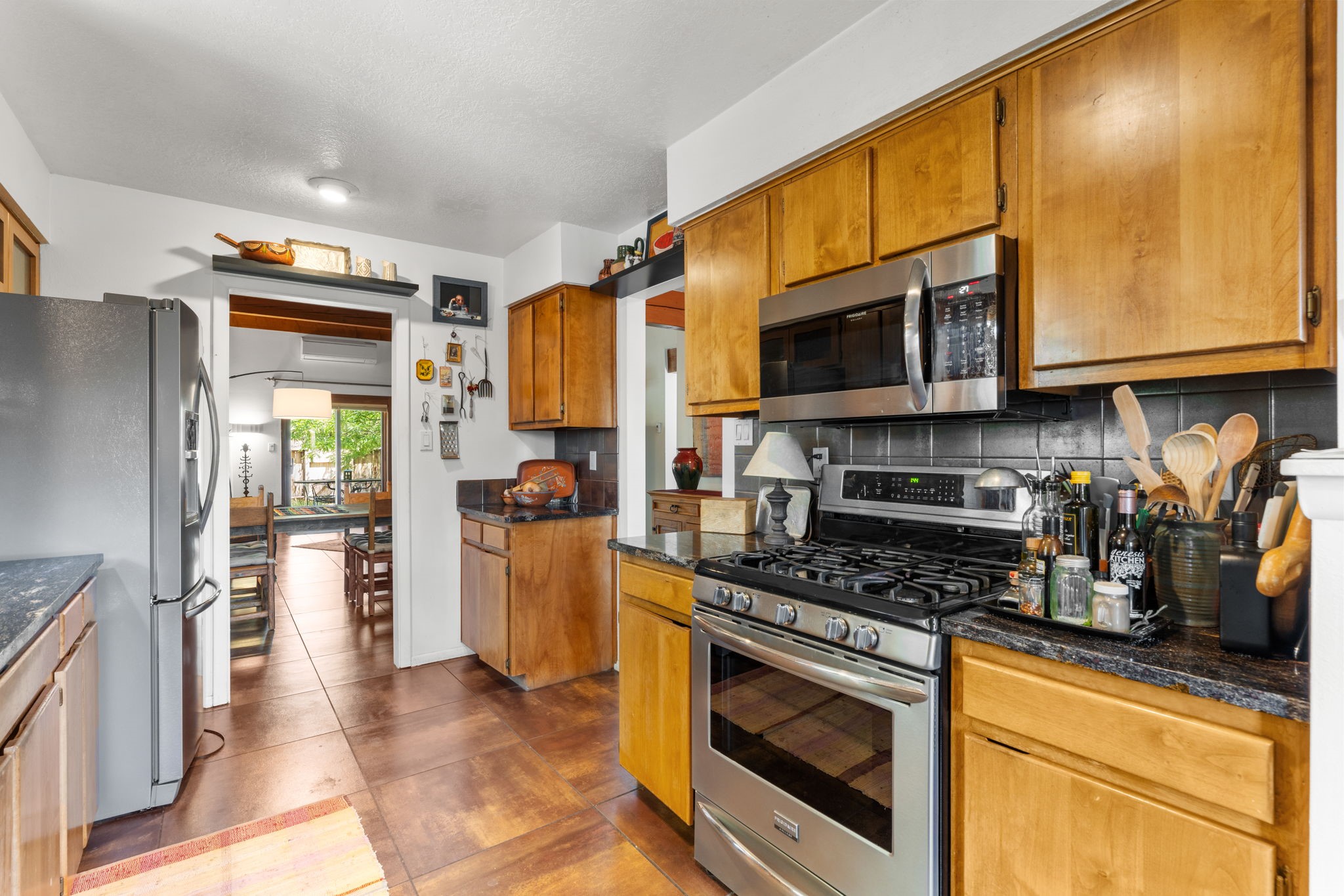 Tucked into a quiet, private cul-de-sac in the sought-after Park Plazas community, this beautifully updated 1,806 sq. ft. home offers the perfect blend of Santa Fe charm and modern comfort. With 2 spacious bedrooms, plus a versatile library or office featuring exquisite built-in bookshelves, this home provides both elegance and flexibility.Step inside to find 2-foot by 2-foot tile floors flowing throughout, enhancing the clean lines and warm ambiance of the interior. The inviting living and dining area boasts a high beamed ceiling over rich tongue-and-groove wood, anchored by a stunning corner Kiva fireplace -- the ideal spot to gather on crisp Santa Fe evenings. Sliding doors open to a covered portal and a flagstone patio that overlooks lush landscaping lovingly designed by the seller, a Master Gardener, creating a tranquil outdoor sanctuary.The kitchen is a chef's delight, thoughtfully renovated with sleek granite countertops, stainless steel appliances, and abundant cabinetry. Just off the kitchen, a charming breakfast nook/sunroom is bathed in natural light from three sides -- perfect for morning coffee or an afternoon read.Additional highlights include a two-year-old boiler and water heater, a recently installed mini-split A/C (1 year old), and a newer garage door with updated motor. The private entry courtyard is beautifully landscaped, setting a peaceful tone before you even step inside.The home also includes a 2-car garage and access to the exceptional amenities of Park Plazas: tennis courts, miles of walking trails, an off-leash dog park, community garden, and more -- all just 15 minutes from the heart of Santa Fe.This is more than a home -- it's a lifestyle. Come experience the comfort, beauty, and serenity this special property offers.