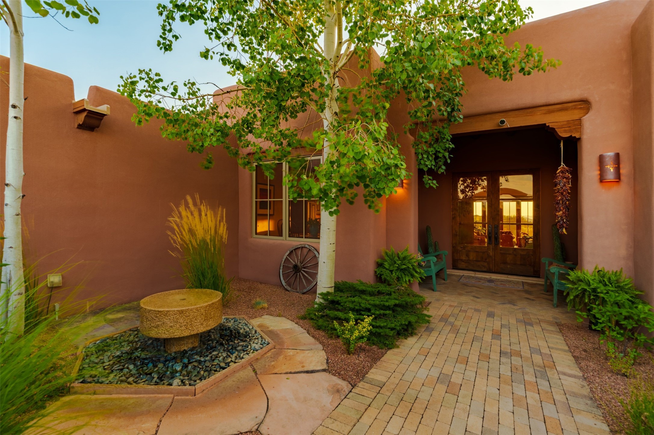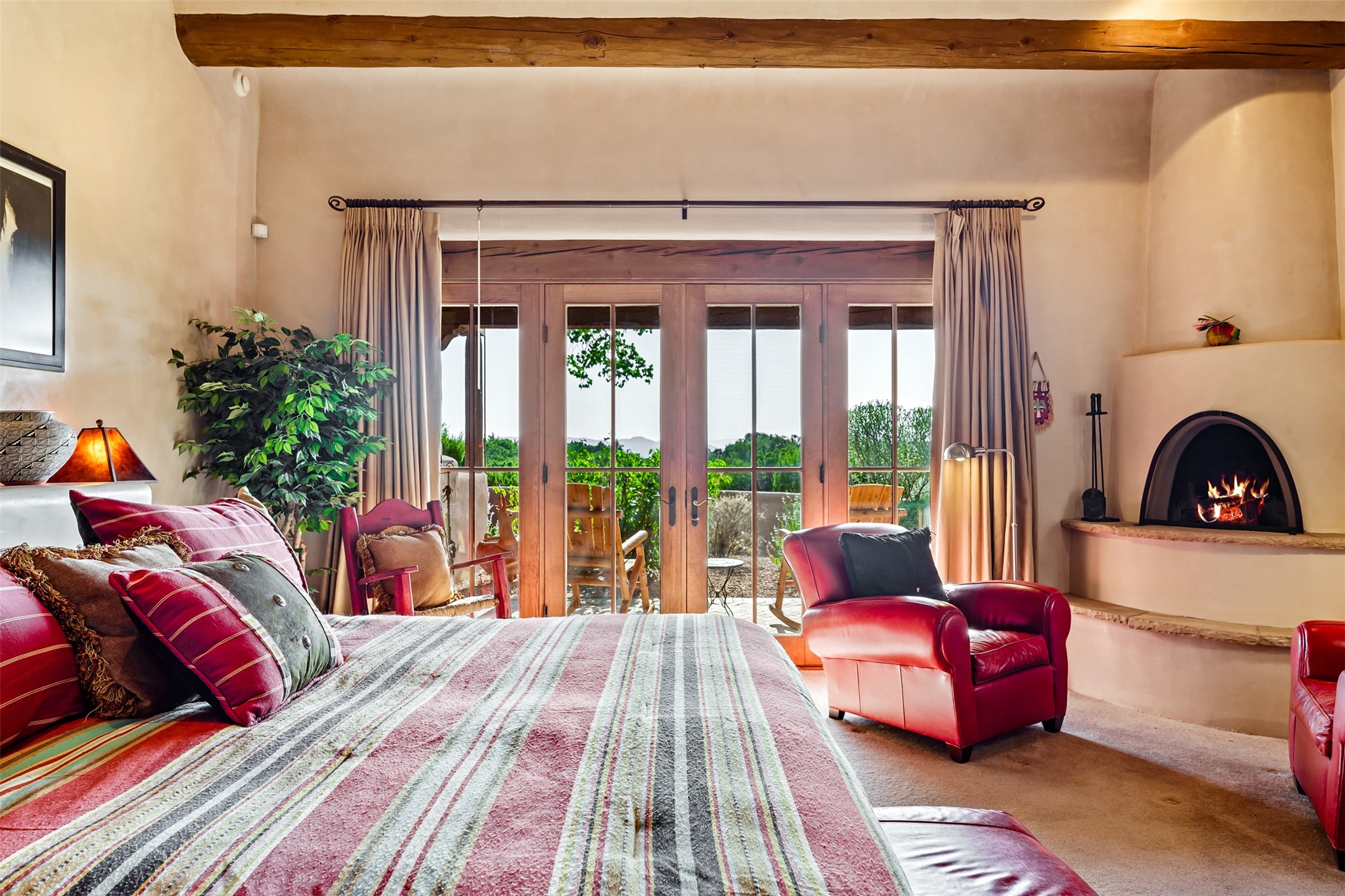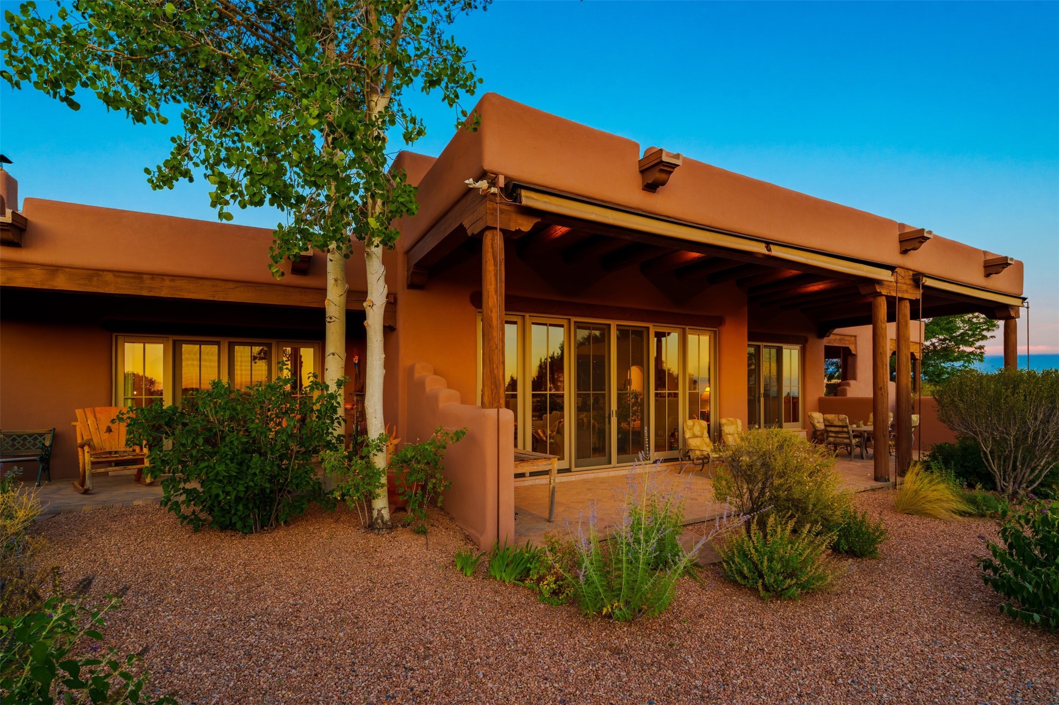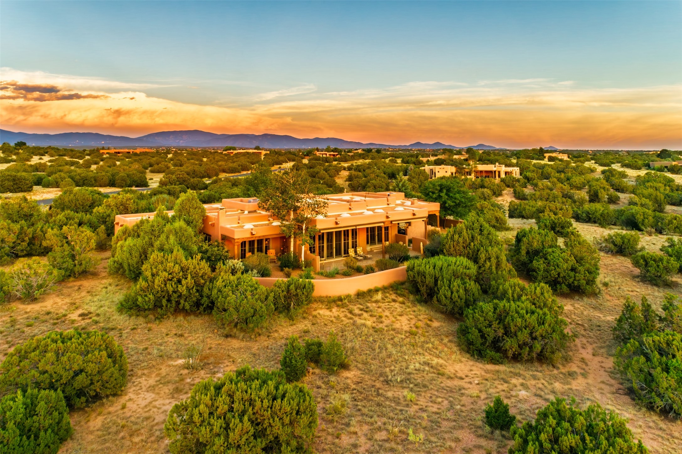 Experience Timeless Santa Fe Elegance in Las Campanas. Approach this exceptional Las Campanas residence through a walled courtyard shaded by mature aspens and graced with fruit trees. Step through the grand rustic wood double doors into a spacious, light-filled central living area that seamlessly unites the living room, dining space, gourmet kitchen, and breakfast nook. The home's layout offers perfect privacy: the primary suite and office are thoughtfully situated in one wing, while two guest suites occupy the opposite side. Throughout, traditional Santa Fe craftsmanship shines--diamond plaster walls, vigas, carved corbels, and built-in shelving and nichos that invite you to showcase art and treasured objects. The living room centers around a large kiva fireplace and frames views of the Jemez Mountains. Glass doors open to an expansive portale, ideal for entertaining or simply savoring the views. The gourmet kitchen features a six-burner Wolf range, wine cooler, granite countertops, center island, and connects to a charming breakfast nook with its own kiva fireplace. The primary suite is a serene retreat with a kiva fireplace, two large walk-in California Closets with built-in storage, and a luxurious bathroom featuring a bidet toilet, steam shower, and jetted tub. Step directly from the suite onto a private portale for morning coffee or evening stargazing. A spacious office with a built-in double desk completes this private wing. Each guest suite offers an en-suite bathroom, and access to a shaded portale; one bathroom includes a double vanity and jetted tub. Outdoor living is enhanced by large, shaded portales with high viga ceilings. The main portale features a built-in gas grill and automated shades. Mature aspens, fruit trees, and lush landscaping create a peaceful, private sanctuary. This home blends the soul of traditional Santa Fe design with the comfort and functionality of modern luxury--all in the heart of Las Campanas.