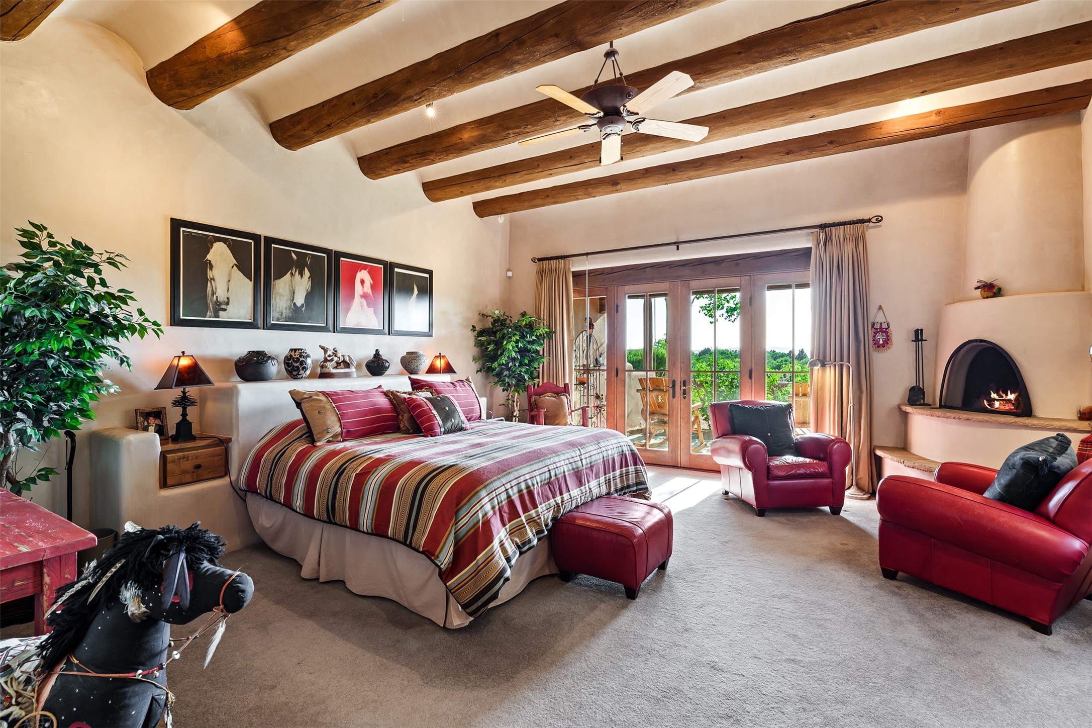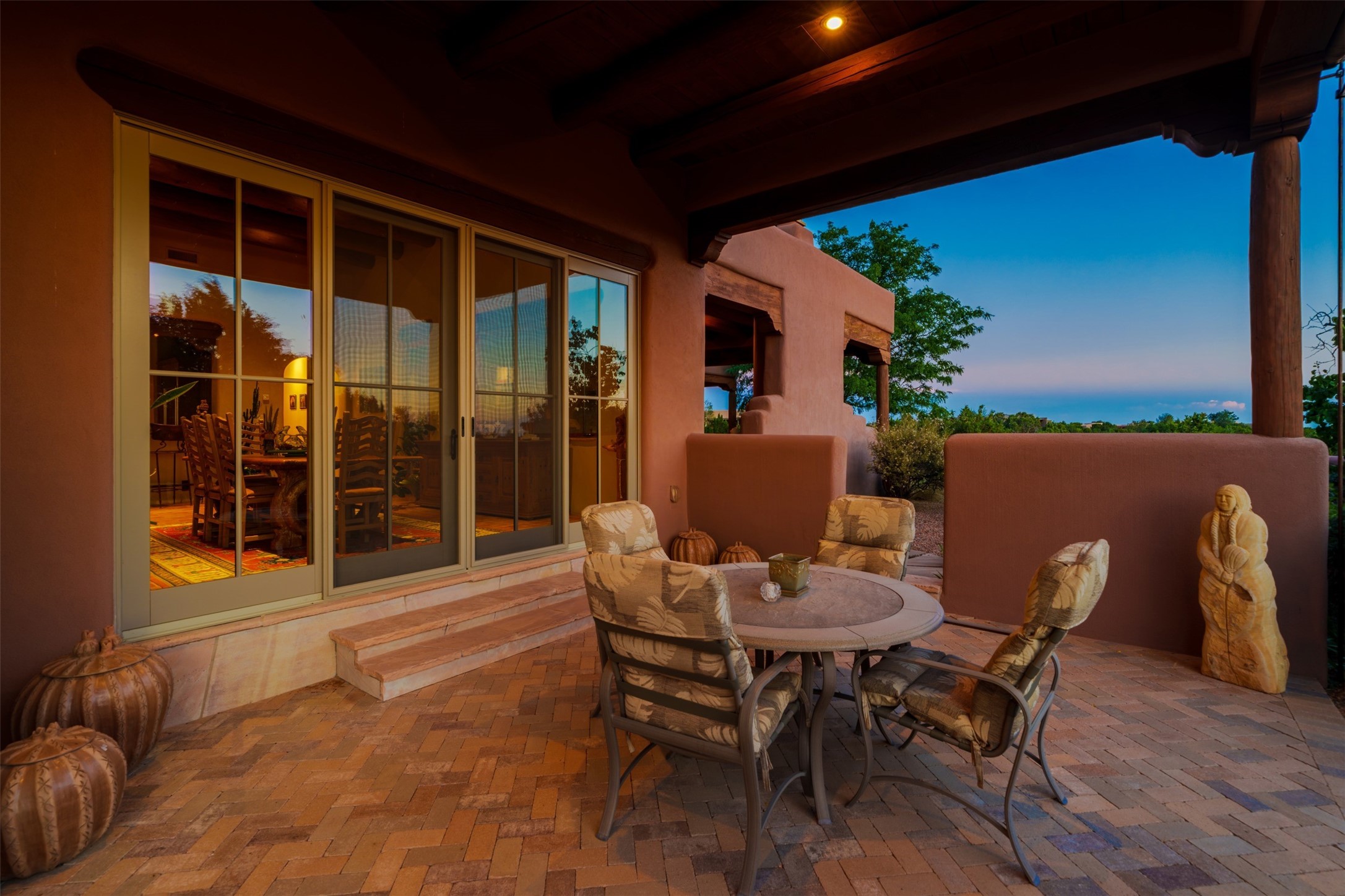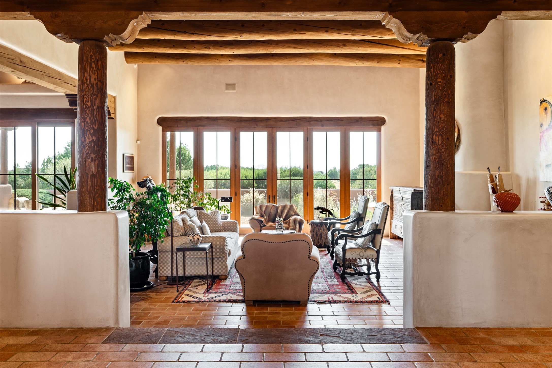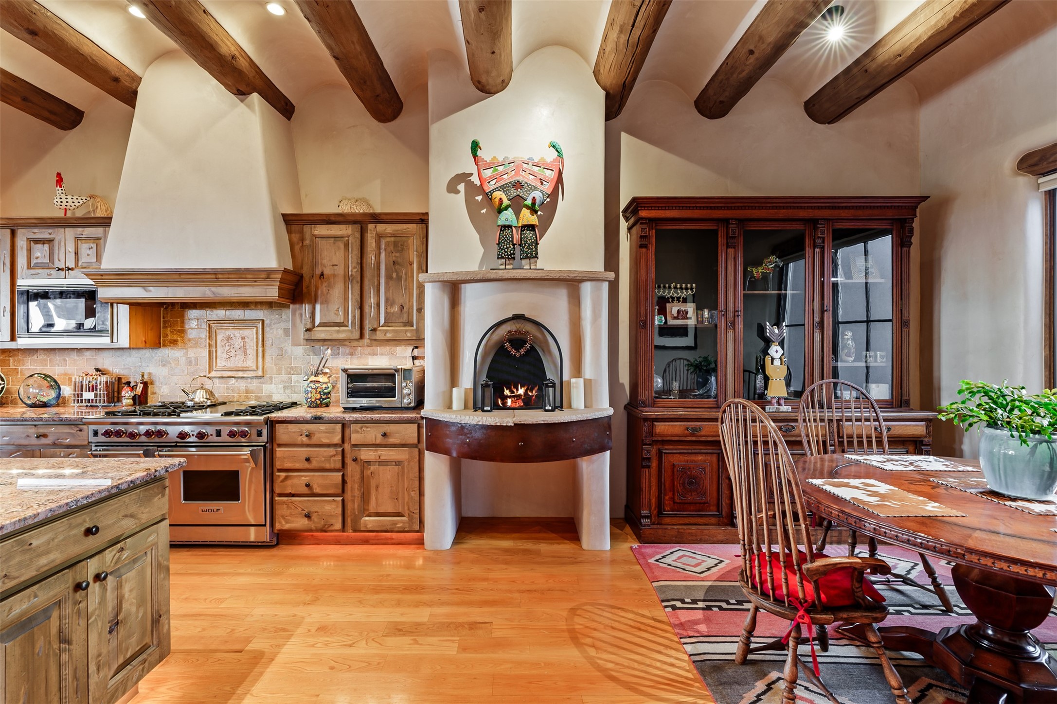 Experience Timeless Santa Fe Elegance in Las Campanas. Approach this exceptional Las Campanas residence through a walled courtyard shaded by mature aspens and graced with fruit trees. Step through the grand rustic wood double doors into a spacious, light-filled central living area that seamlessly unites the living room, dining space, gourmet kitchen, and breakfast nook. The home's layout offers perfect privacy: the primary suite and office are thoughtfully situated in one wing, while two guest suites occupy the opposite side. Throughout, traditional Santa Fe craftsmanship shines--diamond plaster walls, vigas, carved corbels, and built-in shelving and nichos that invite you to showcase art and treasured objects. The living room centers around a large kiva fireplace and frames views of the Jemez Mountains. Glass doors open to an expansive portale, ideal for entertaining or simply savoring the views. The gourmet kitchen features a six-burner Wolf range, wine cooler, granite countertops, center island, and connects to a charming breakfast nook with its own kiva fireplace. The primary suite is a serene retreat with a kiva fireplace, two large walk-in California Closets with built-in storage, and a luxurious bathroom featuring a bidet toilet, steam shower, and jetted tub. Step directly from the suite onto a private portale for morning coffee or evening stargazing. A spacious office with a built-in double desk completes this private wing. Each guest suite offers an en-suite bathroom, and access to a shaded portale; one bathroom includes a double vanity and jetted tub. Outdoor living is enhanced by large, shaded portales with high viga ceilings. The main portale features a built-in gas grill and automated shades. Mature aspens, fruit trees, and lush landscaping create a peaceful, private sanctuary. This home blends the soul of traditional Santa Fe design with the comfort and functionality of modern luxury--all in the heart of Las Campanas.