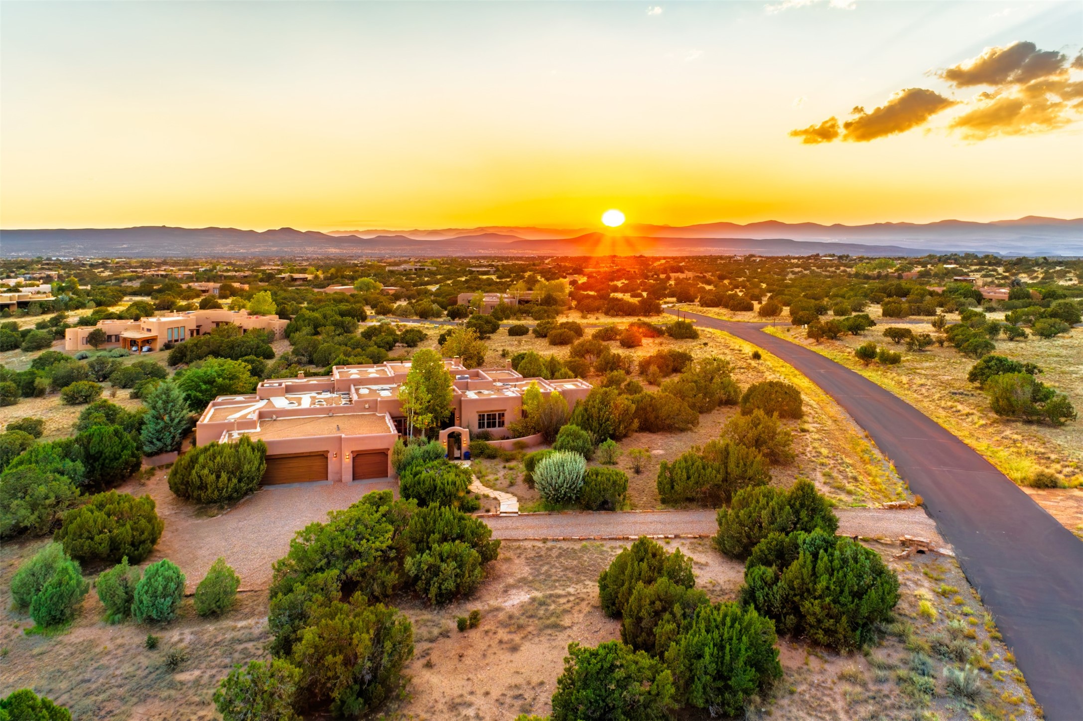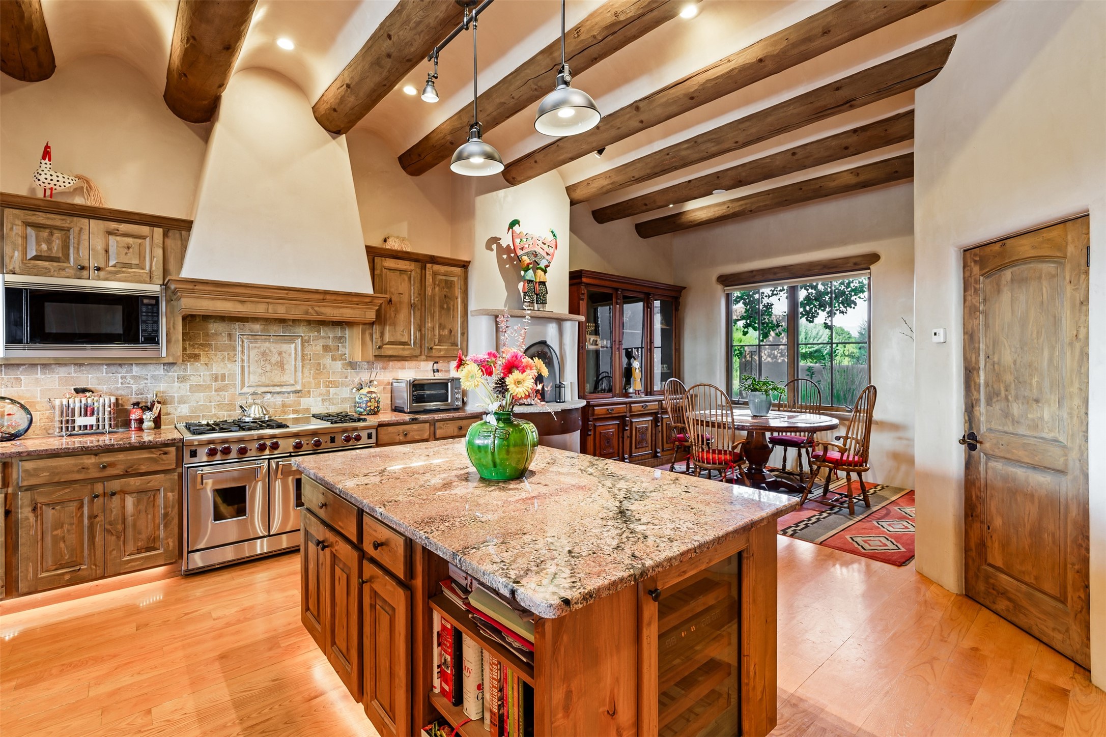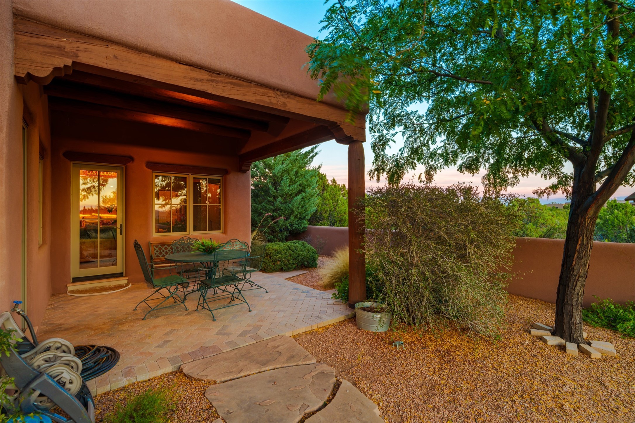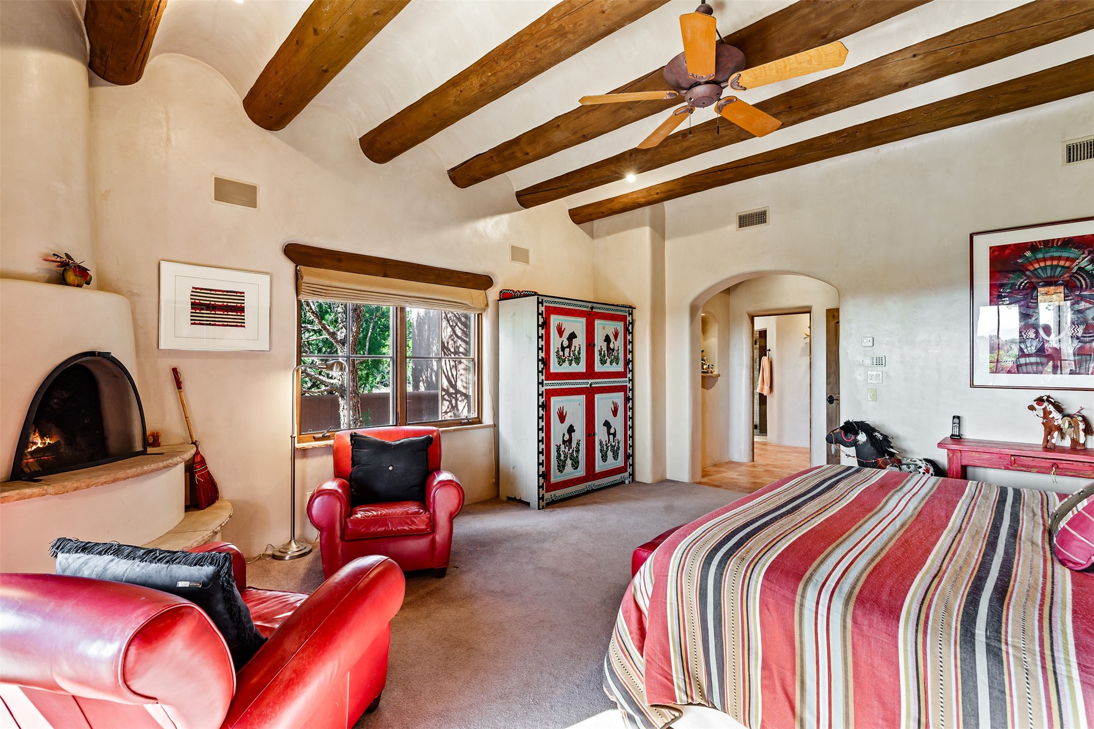 Experience Timeless Santa Fe Elegance in Las Campanas. Approach this exceptional Las Campanas residence through a walled courtyard shaded by mature aspens and graced with fruit trees. Step through the grand rustic wood double doors into a spacious, light-filled central living area that seamlessly unites the living room, dining space, gourmet kitchen, and breakfast nook. The home's layout offers perfect privacy: the primary suite and office are thoughtfully situated in one wing, while two guest suites occupy the opposite side. Throughout, traditional Santa Fe craftsmanship shines--diamond plaster walls, vigas, carved corbels, and built-in shelving and nichos that invite you to showcase art and treasured objects. The living room centers around a large kiva fireplace and frames views of the Jemez Mountains. Glass doors open to an expansive portale, ideal for entertaining or simply savoring the views. The gourmet kitchen features a six-burner Wolf range, wine cooler, granite countertops, center island, and connects to a charming breakfast nook with its own kiva fireplace. The primary suite is a serene retreat with a kiva fireplace, two large walk-in California Closets with built-in storage, and a luxurious bathroom featuring a bidet toilet, steam shower, and jetted tub. Step directly from the suite onto a private portale for morning coffee or evening stargazing. A spacious office with a built-in double desk completes this private wing. Each guest suite offers an en-suite bathroom, and access to a shaded portale; one bathroom includes a double vanity and jetted tub. Outdoor living is enhanced by large, shaded portales with high viga ceilings. The main portale features a built-in gas grill and automated shades. Mature aspens, fruit trees, and lush landscaping create a peaceful, private sanctuary. This home blends the soul of traditional Santa Fe design with the comfort and functionality of modern luxury--all in the heart of Las Campanas.