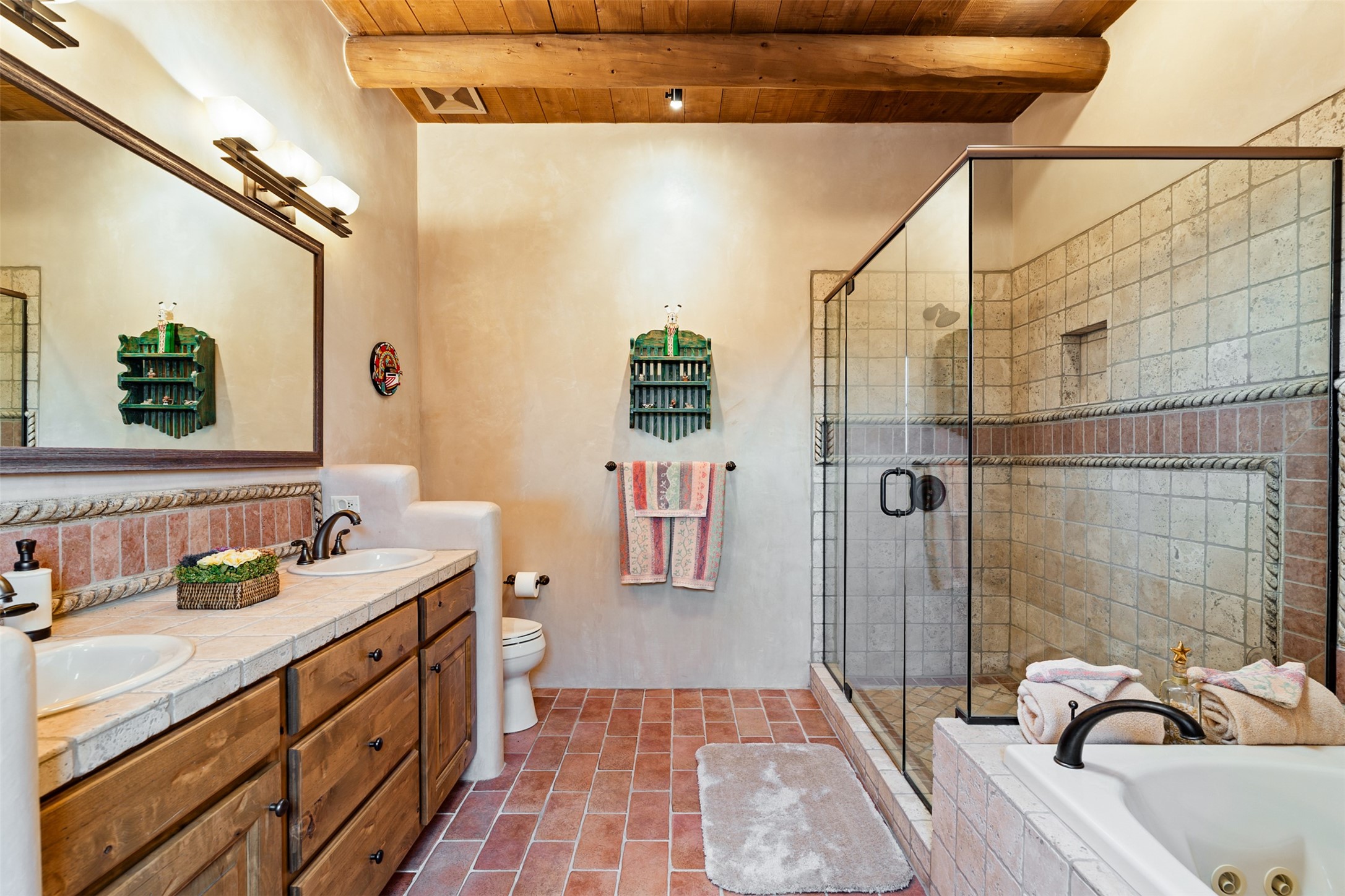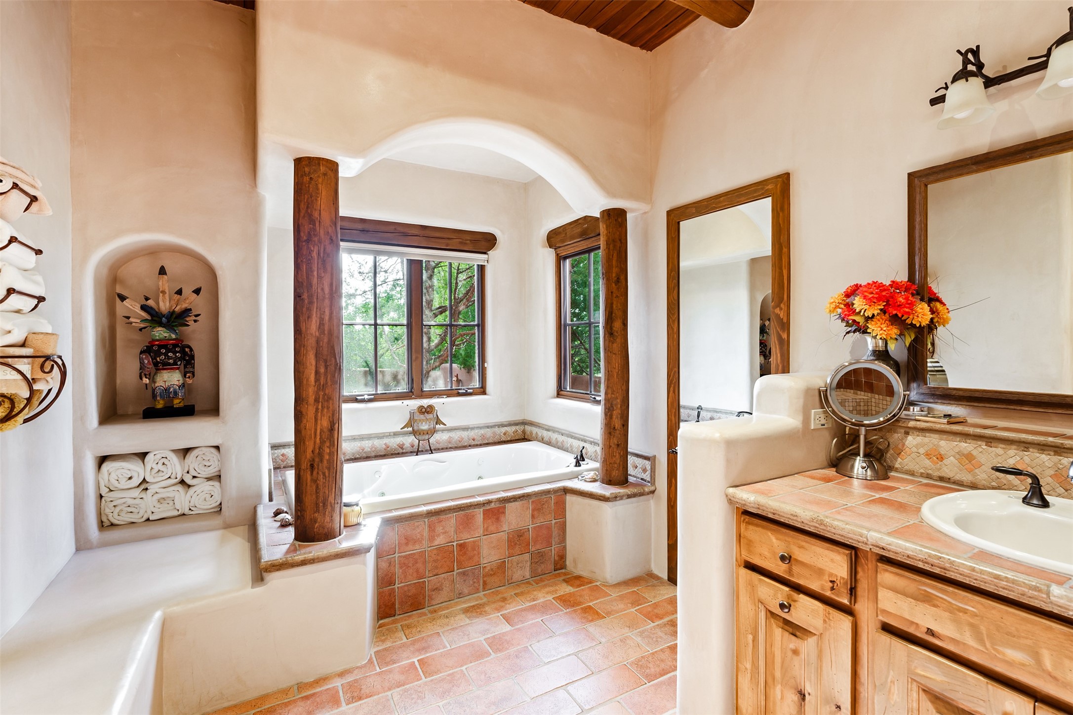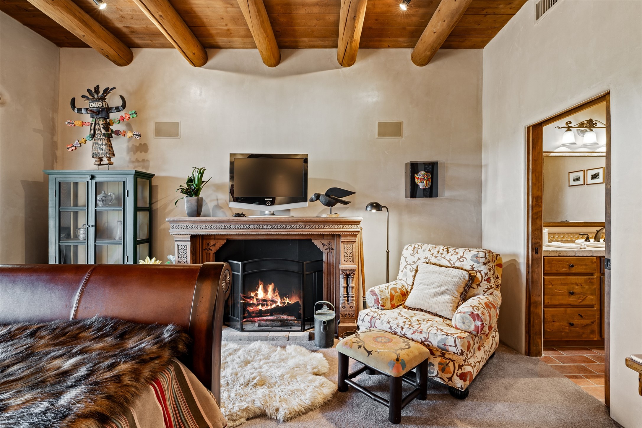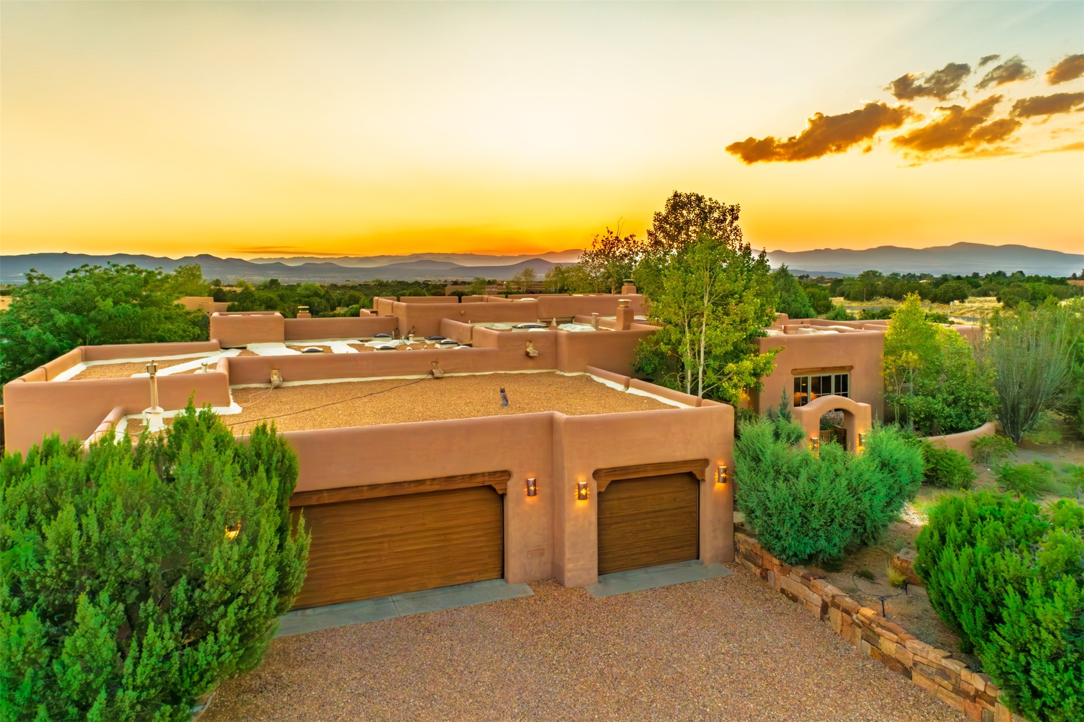 Experience Timeless Santa Fe Elegance in Las Campanas. Approach this exceptional Las Campanas residence through a walled courtyard shaded by mature aspens and graced with fruit trees. Step through the grand rustic wood double doors into a spacious, light-filled central living area that seamlessly unites the living room, dining space, gourmet kitchen, and breakfast nook. The home's layout offers perfect privacy: the primary suite and office are thoughtfully situated in one wing, while two guest suites occupy the opposite side. Throughout, traditional Santa Fe craftsmanship shines--diamond plaster walls, vigas, carved corbels, and built-in shelving and nichos that invite you to showcase art and treasured objects. The living room centers around a large kiva fireplace and frames views of the Jemez Mountains. Glass doors open to an expansive portale, ideal for entertaining or simply savoring the views. The gourmet kitchen features a six-burner Wolf range, wine cooler, granite countertops, center island, and connects to a charming breakfast nook with its own kiva fireplace. The primary suite is a serene retreat with a kiva fireplace, two large walk-in California Closets with built-in storage, and a luxurious bathroom featuring a bidet toilet, steam shower, and jetted tub. Step directly from the suite onto a private portale for morning coffee or evening stargazing. A spacious office with a built-in double desk completes this private wing. Each guest suite offers an en-suite bathroom, and access to a shaded portale; one bathroom includes a double vanity and jetted tub. Outdoor living is enhanced by large, shaded portales with high viga ceilings. The main portale features a built-in gas grill and automated shades. Mature aspens, fruit trees, and lush landscaping create a peaceful, private sanctuary. This home blends the soul of traditional Santa Fe design with the comfort and functionality of modern luxury--all in the heart of Las Campanas.