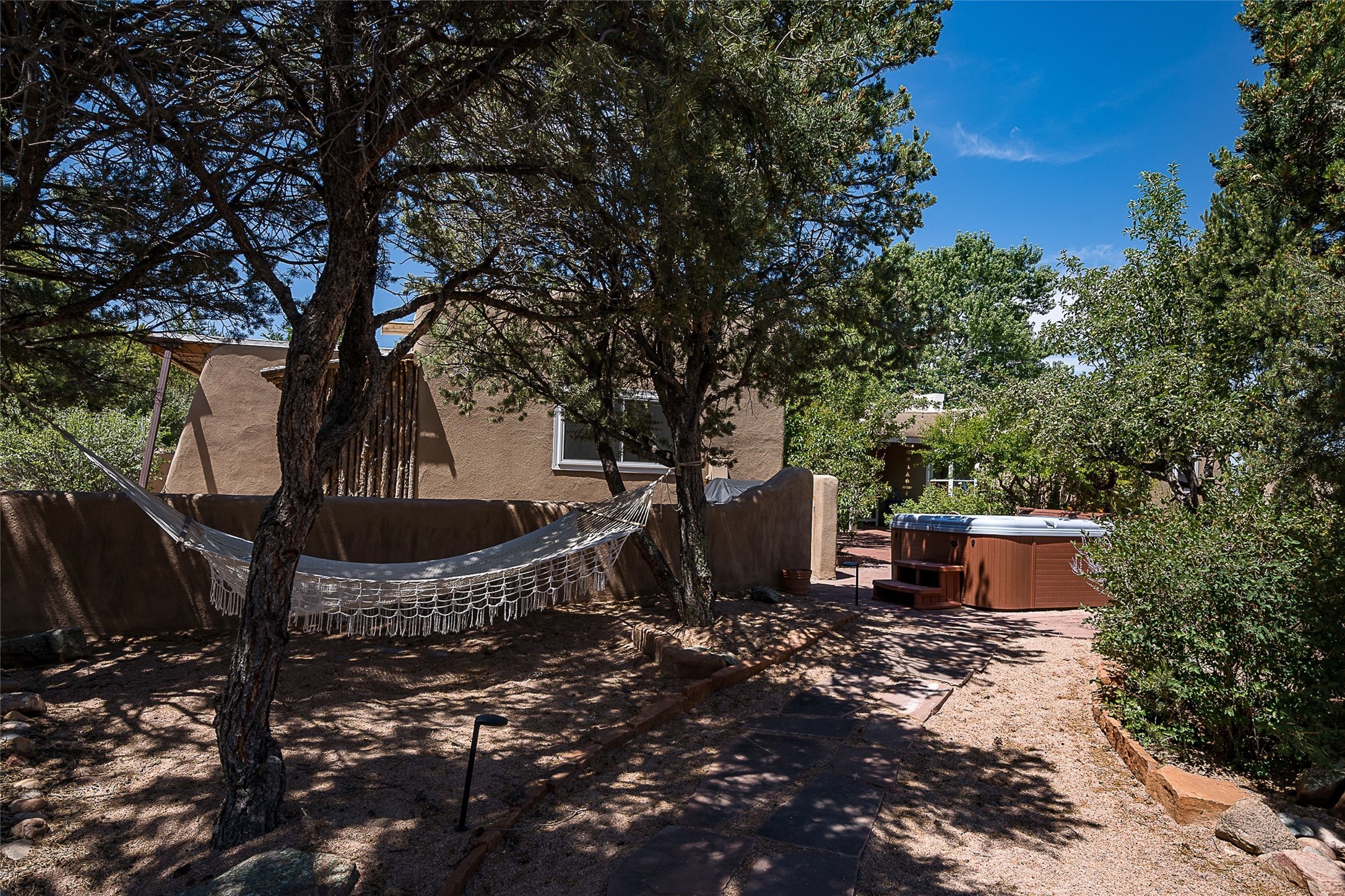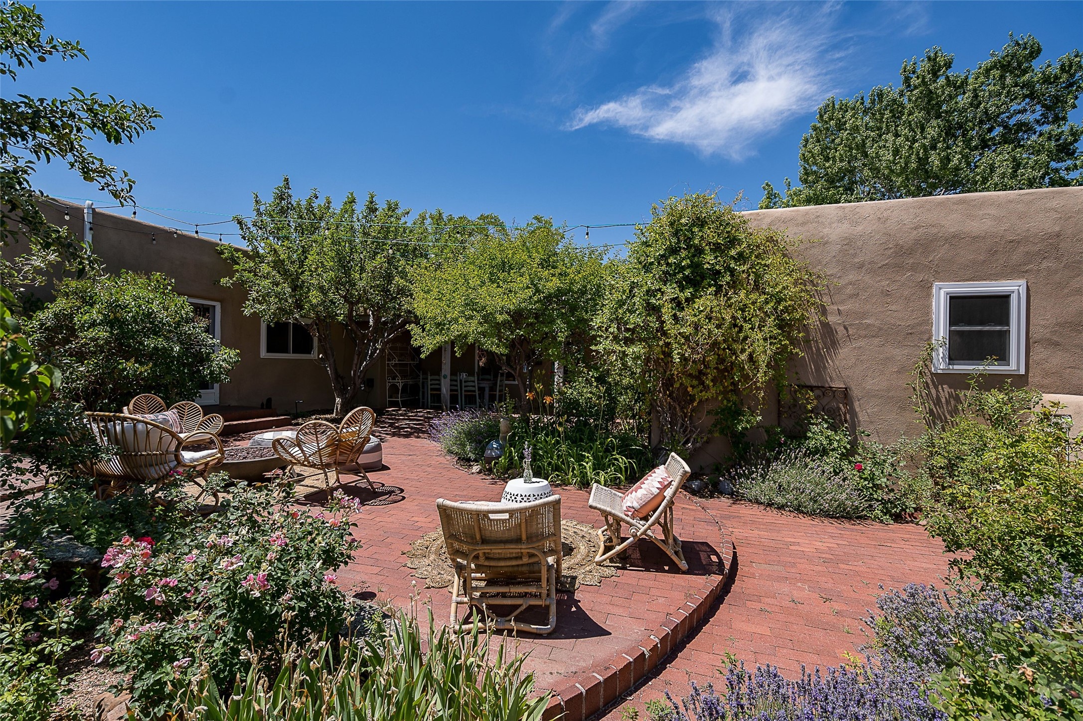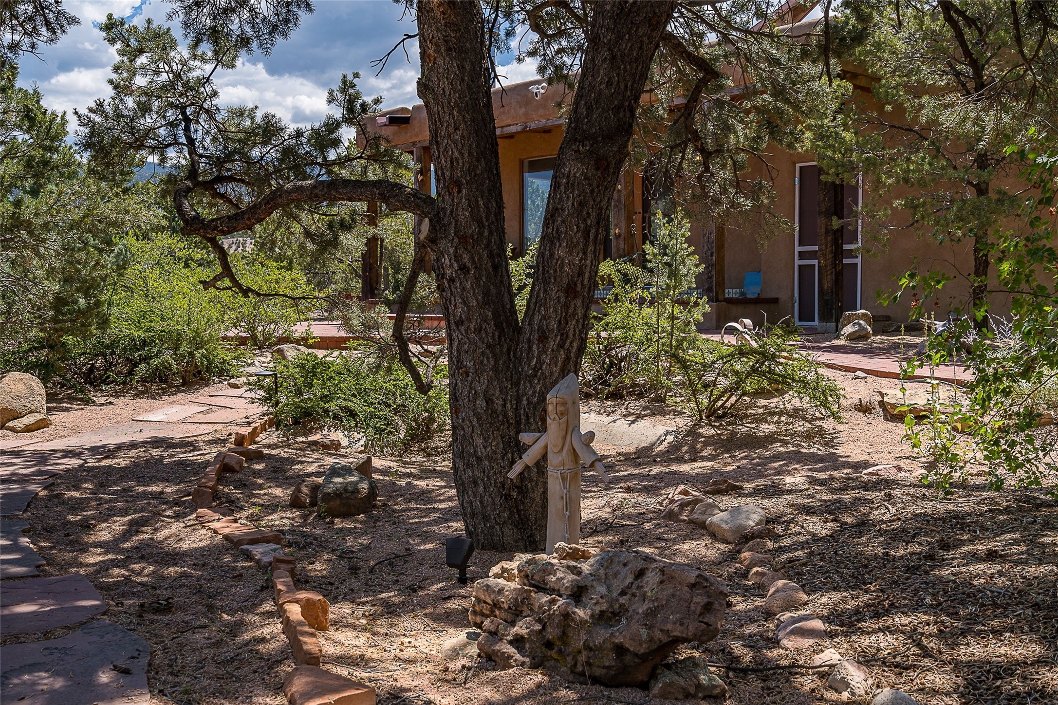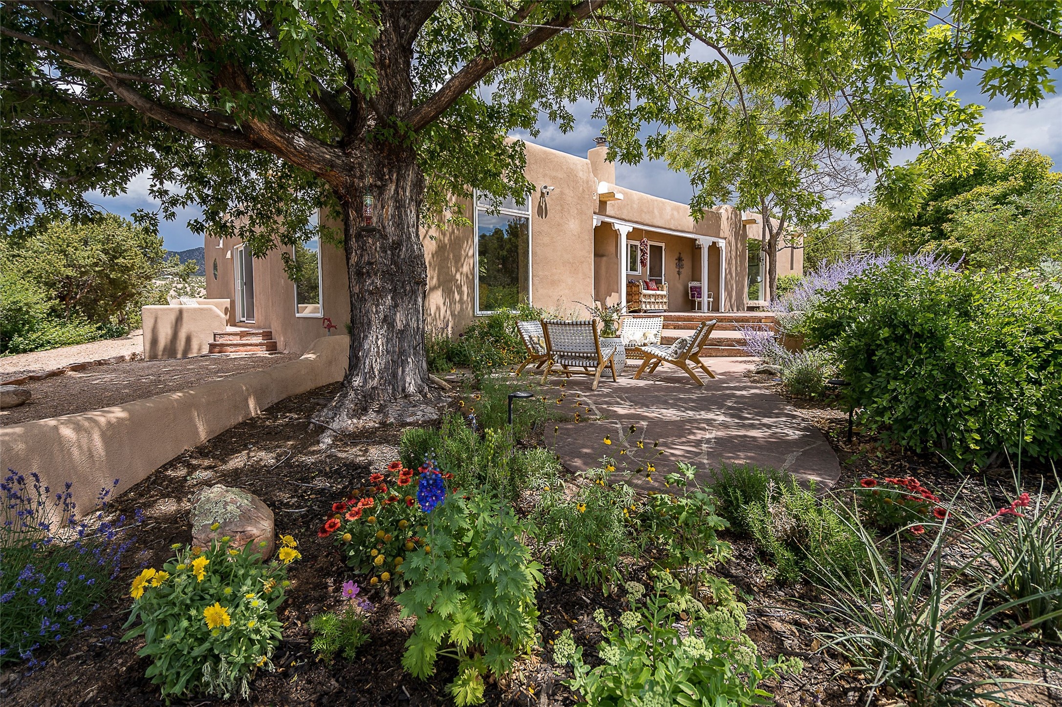 Discover serenity and style in the heart of Vista Redonda where the timeless beauty of Santa Fe-style architecture meets modern luxury in this stunningly remodeled home, set on over 5 acres of private land with awe-inspiring mountain vistas. Main residence boasts three bedrooms and two updated bathrooms. Classic vigas and beams, Saltillo tile and refinished wood floors that radiate Southwestern charm. Custom solid wood doors throughout speak to unmatched craftsmanship, while expansive picture windows bathe every room in natural light. The open-concept kitchen, is a masterpiece of design, blending vintage appliances with modern functionality. Thoughtful split bedroom plan offers privacy. In the primary suite luxury meets heritage with custom Spanish tiles enhancing the updated bathroom. Accommodate guests or tap into rental income potential with the 825 sq. ft casita, featuring one bedroom, a bath, 2 kiva fireplaces, and a kitchenette. Indulge your creative spirit in the 392 sq. ft art, wellness, or music studio. Outside, the grounds are designed with relaxation and natural beauty in mind. Whether soaking in the hot tub, enjoying evenings around the fire pit, or meandering through the labyrinth, you'll find countless ways to reconnect with nature. Mature fruit trees and flowering plants create a garden oasis. Located just moments from the Four Seasons Resort, Tesuque Village Market, Santa Fe Opera, and downtown Santa Fe, this home offers both seclusion and accessibility.