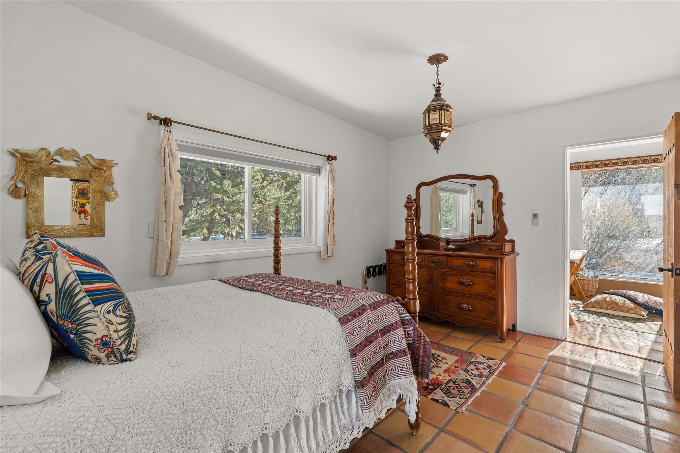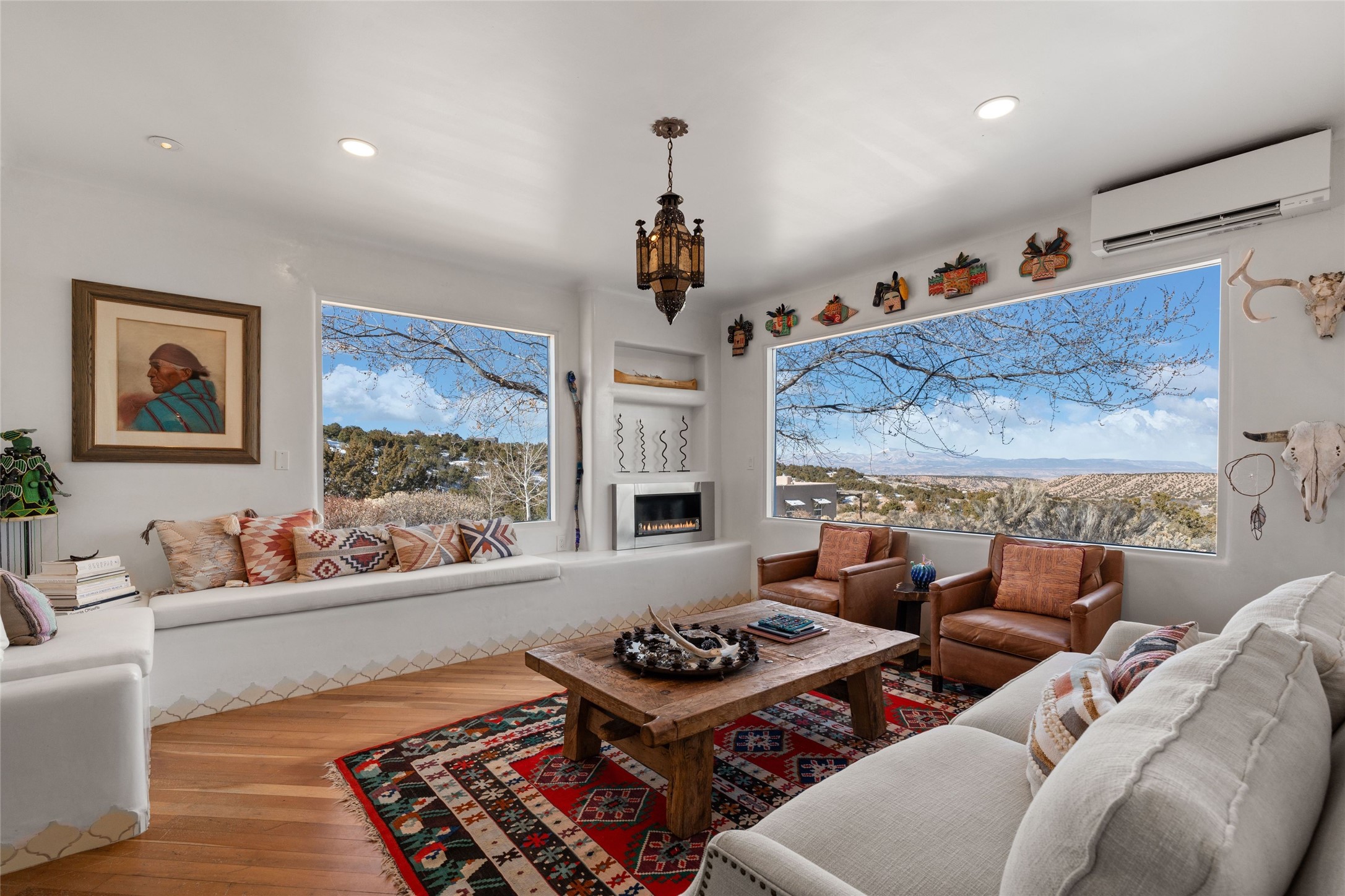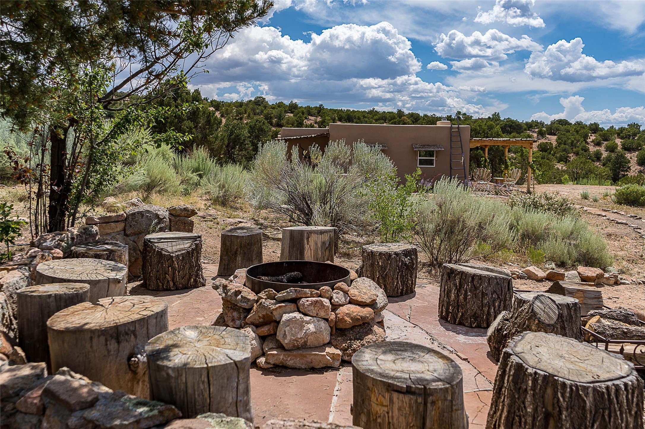 Discover serenity and style in the heart of Vista Redonda where the timeless beauty of Santa Fe-style architecture meets modern luxury in this stunningly remodeled home, set on over 5 acres of private land with awe-inspiring mountain vistas. Main residence boasts three bedrooms and two updated bathrooms. Classic vigas and beams, Saltillo tile and refinished wood floors that radiate Southwestern charm. Custom solid wood doors throughout speak to unmatched craftsmanship, while expansive picture windows bathe every room in natural light. The open-concept kitchen, is a masterpiece of design, blending vintage appliances with modern functionality. Thoughtful split bedroom plan offers privacy. In the primary suite luxury meets heritage with custom Spanish tiles enhancing the updated bathroom. Accommodate guests or tap into rental income potential with the 825 sq. ft casita, featuring one bedroom, a bath, 2 kiva fireplaces, and a kitchenette. Indulge your creative spirit in the 392 sq. ft art, wellness, or music studio. Outside, the grounds are designed with relaxation and natural beauty in mind. Whether soaking in the hot tub, enjoying evenings around the fire pit, or meandering through the labyrinth, you'll find countless ways to reconnect with nature. Mature fruit trees and flowering plants create a garden oasis. Located just moments from the Four Seasons Resort, Tesuque Village Market, Santa Fe Opera, and downtown Santa Fe, this home offers both seclusion and accessibility.