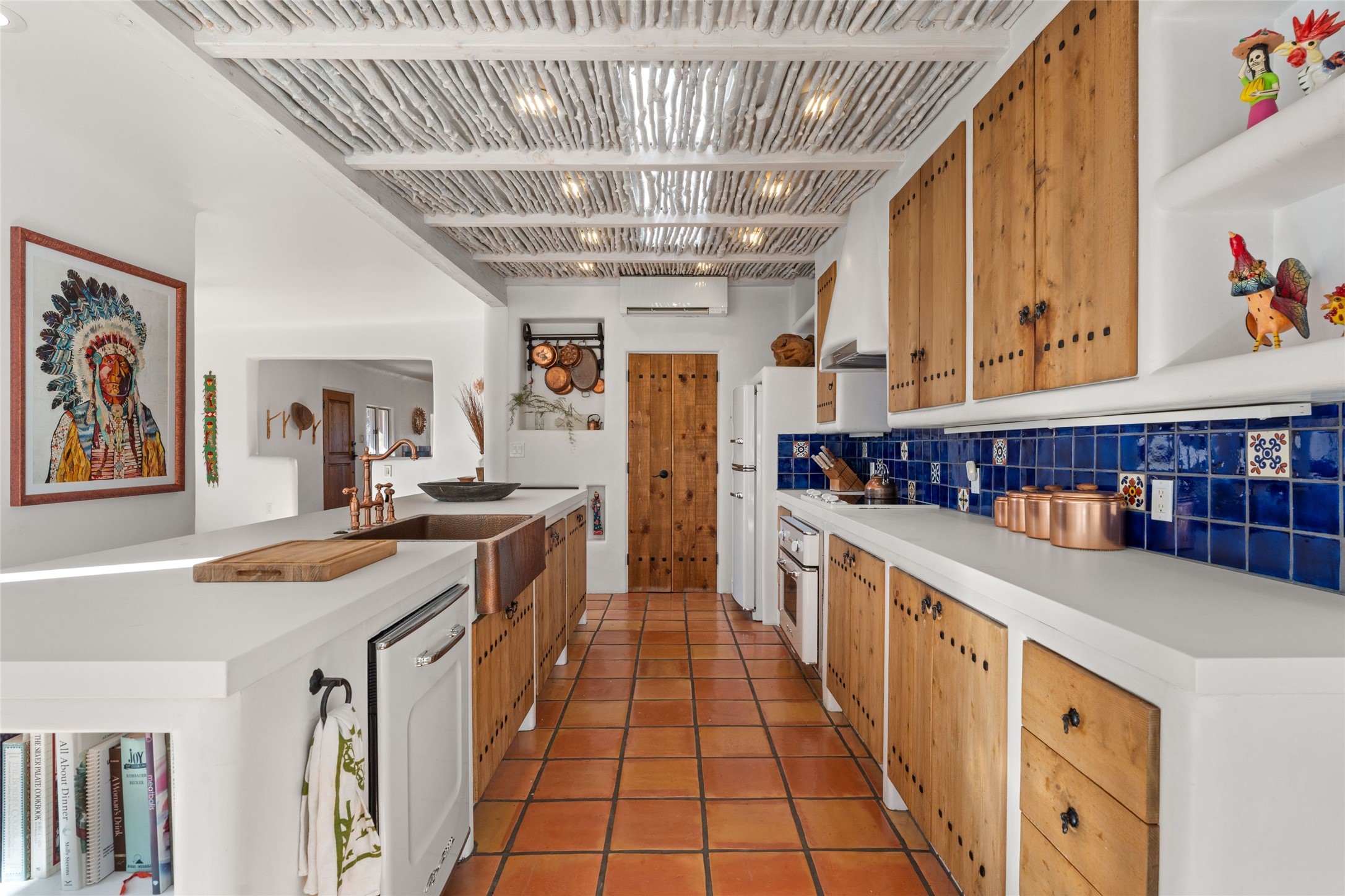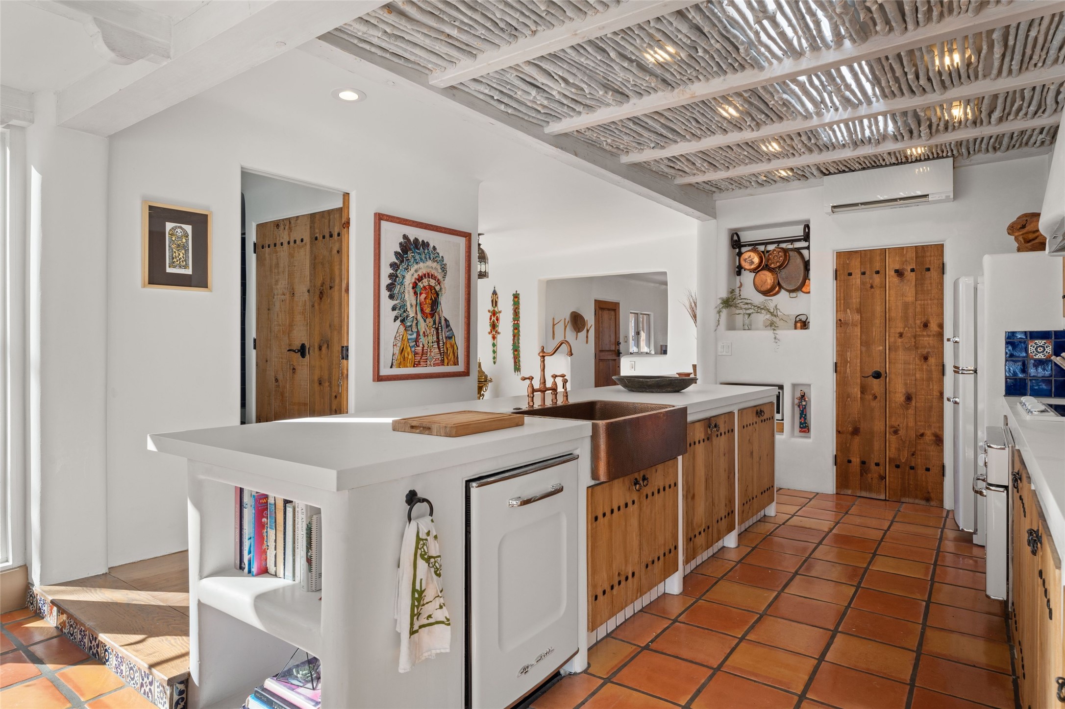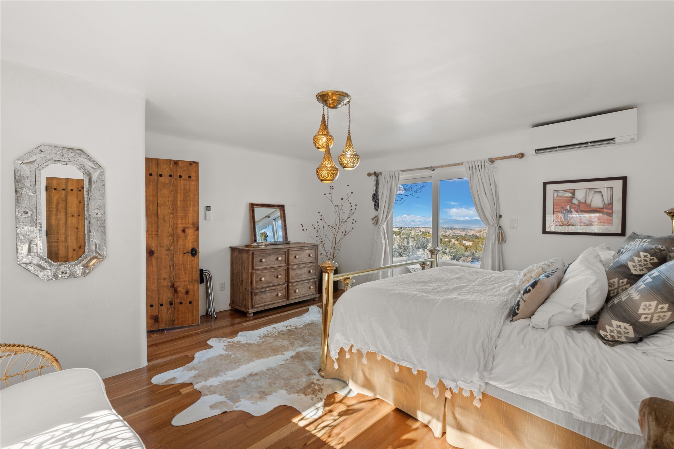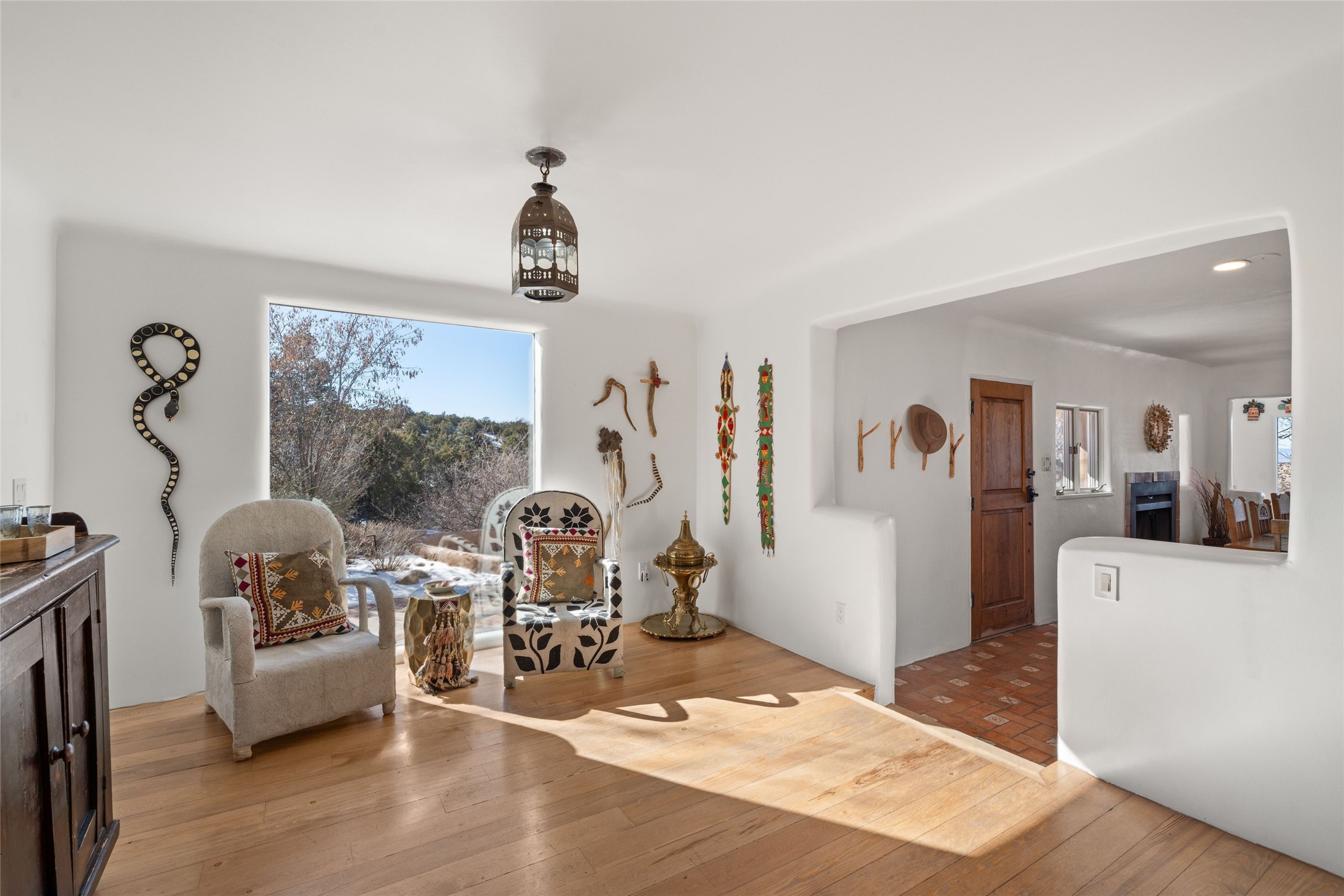 Discover serenity and style in the heart of Vista Redonda where the timeless beauty of Santa Fe-style architecture meets modern luxury in this stunningly remodeled home, set on over 5 acres of private land with awe-inspiring mountain vistas. Main residence boasts three bedrooms and two updated bathrooms. Classic vigas and beams, Saltillo tile and refinished wood floors that radiate Southwestern charm. Custom solid wood doors throughout speak to unmatched craftsmanship, while expansive picture windows bathe every room in natural light. The open-concept kitchen, is a masterpiece of design, blending vintage appliances with modern functionality. Thoughtful split bedroom plan offers privacy. In the primary suite luxury meets heritage with custom Spanish tiles enhancing the updated bathroom. Accommodate guests or tap into rental income potential with the 825 sq. ft casita, featuring one bedroom, a bath, 2 kiva fireplaces, and a kitchenette. Indulge your creative spirit in the 392 sq. ft art, wellness, or music studio. Outside, the grounds are designed with relaxation and natural beauty in mind. Whether soaking in the hot tub, enjoying evenings around the fire pit, or meandering through the labyrinth, you'll find countless ways to reconnect with nature. Mature fruit trees and flowering plants create a garden oasis. Located just moments from the Four Seasons Resort, Tesuque Village Market, Santa Fe Opera, and downtown Santa Fe, this home offers both seclusion and accessibility.