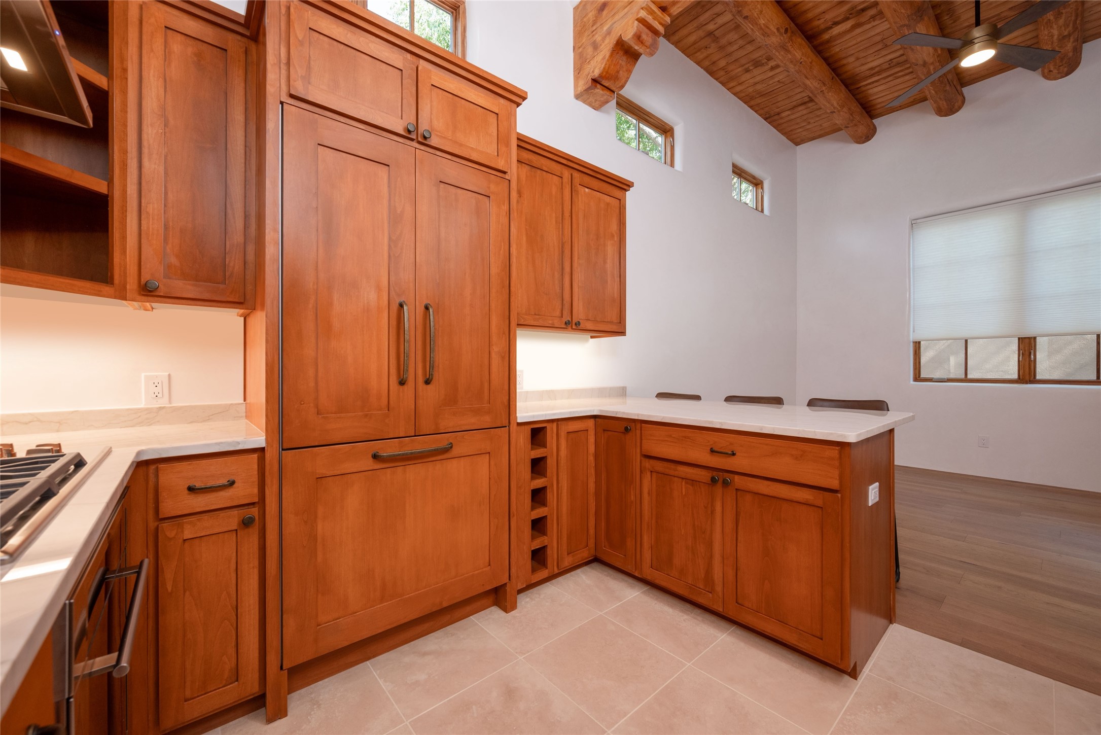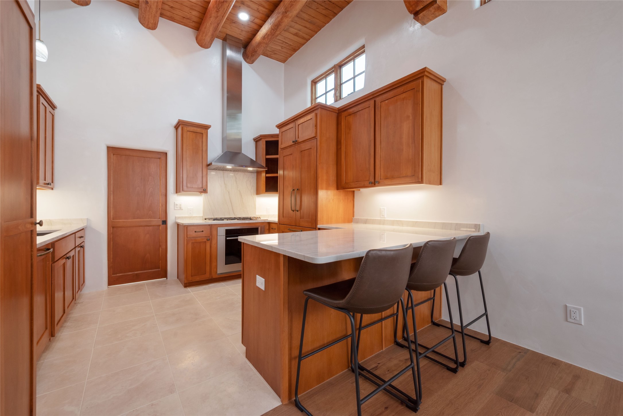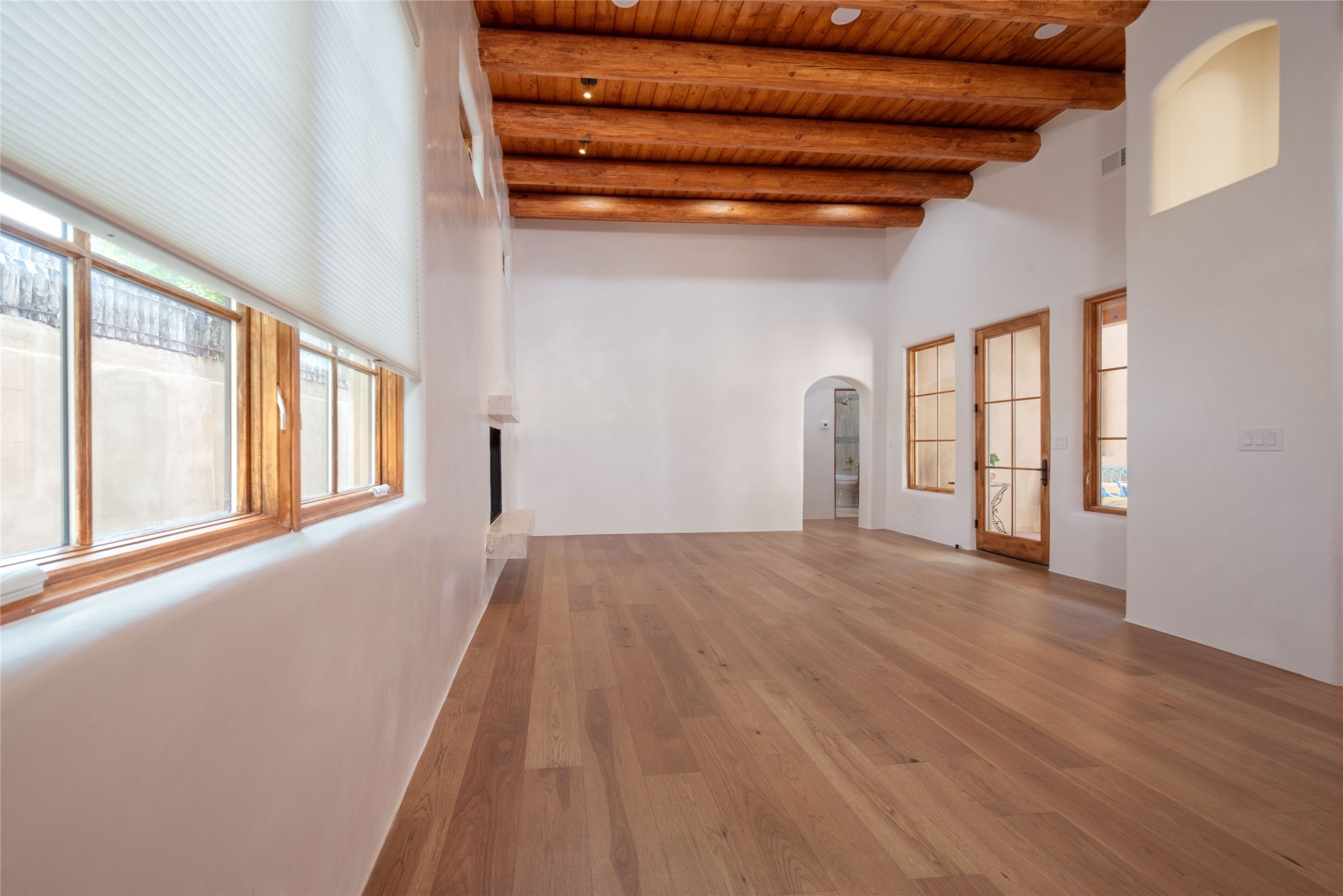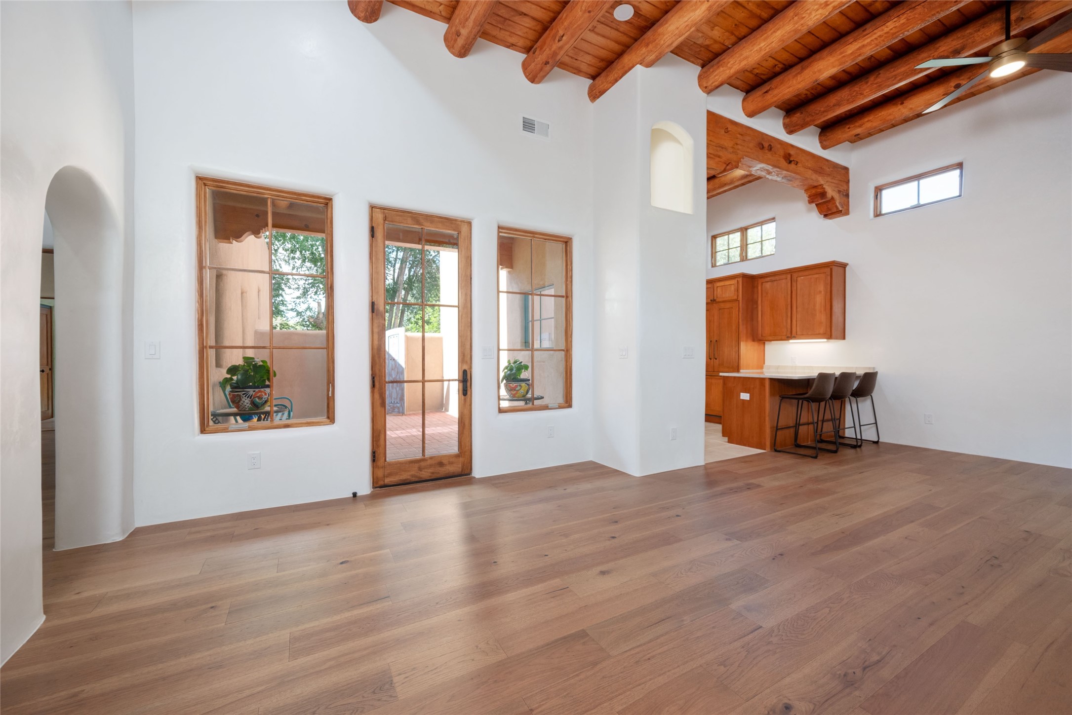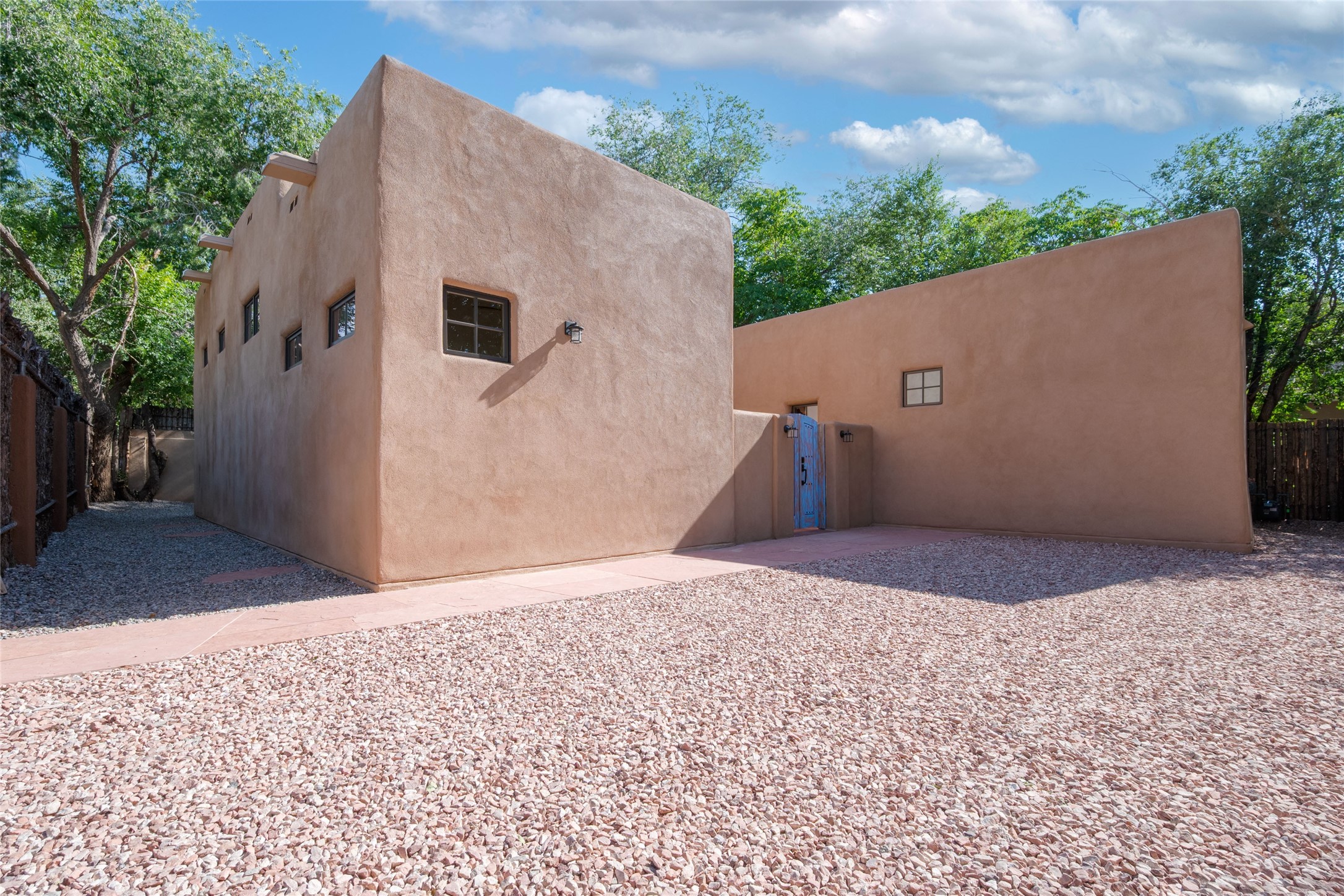 New construction throughout with a beautifully designed and hand-crafted adobe remodel and addition, this home blends classic Santa Fe style with modern comfort. A charming private courtyard greets you before the front door opens to a light-filled living room with high ceilings, exposed vigas, hand-troweled plaster walls, wood floors, and a custom-designed fireplace with quartz stone mantles. The gourmet kitchen features custom Alder cabinets, a built-in Wolf cooktop and oven, Fisher & Paykel refrigerator/freezer, Bosch dishwasher, quartz stone countertops, custom hardware and lighting, and travertine stone tile floors. The thoughtful three-bedroom, two-bath floor plan provides excellent separation between the luxurious primary suite and the additional bedrooms. One bedroom, located near the kitchen with its own entrance, offers flexibility for guests or use as a home office/den, with easy access to the courtyard. The primary suite exudes a spa-like feel, with warm plaster tones, natural wood finishes, custom Alder cabinetry and vanities, Italian porcelain tile surrounds, quartz countertops, a whirlpool bath, and a Kohler shower with body sprays. Additional bath features include mirrored, lighted anti-fog cabinets, a built-in makeup table with a lighted mirror, and elegant fixtures throughout. Other highlights include a custom-built entry gate, solid Alder doors, refrigerated air conditioning and heating, Pella windows, and Hunter Douglas blinds. Ideal as a full-time residence or a Santa Fe getaway, this home combines craftsmanship, comfort, and style in a prime location.