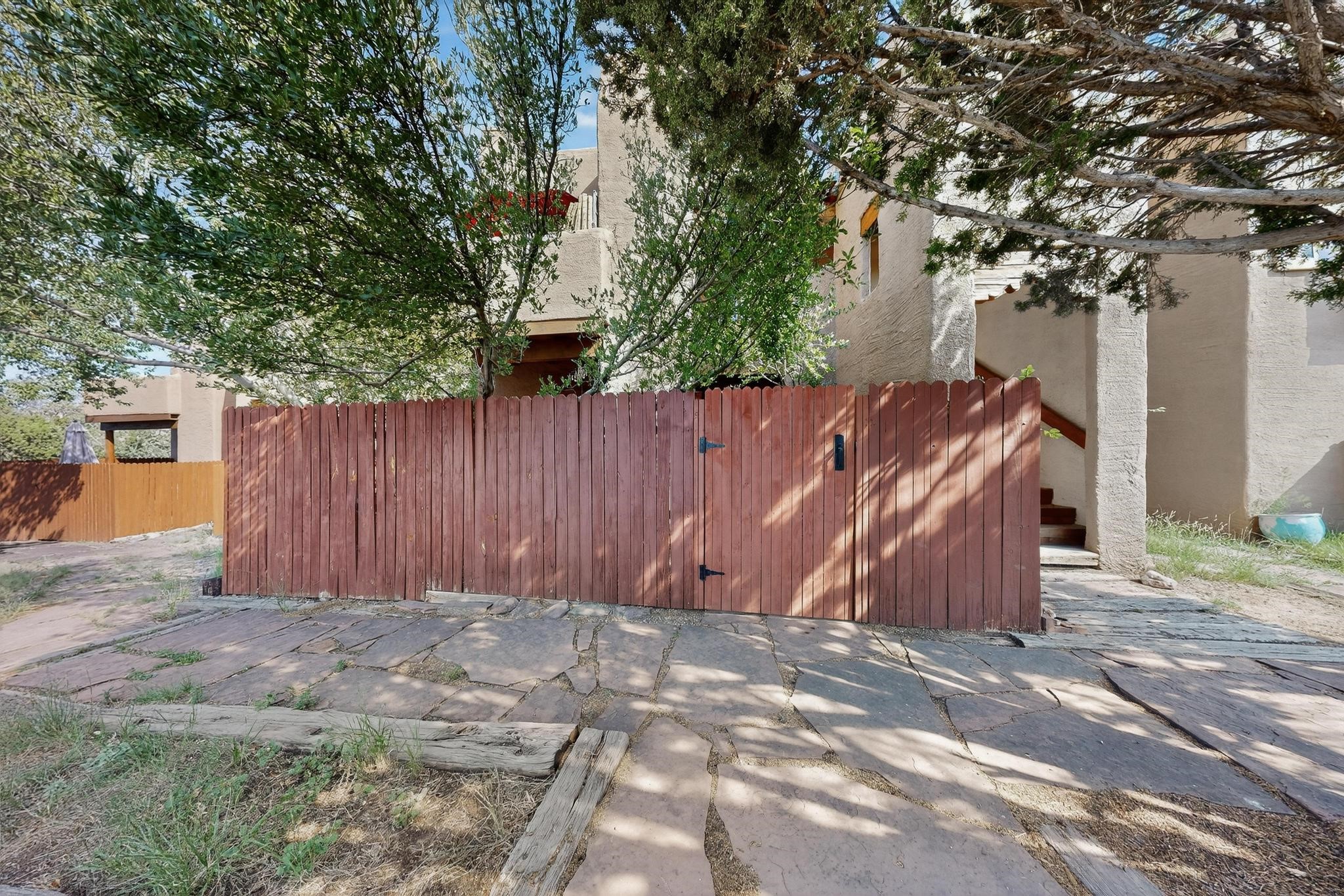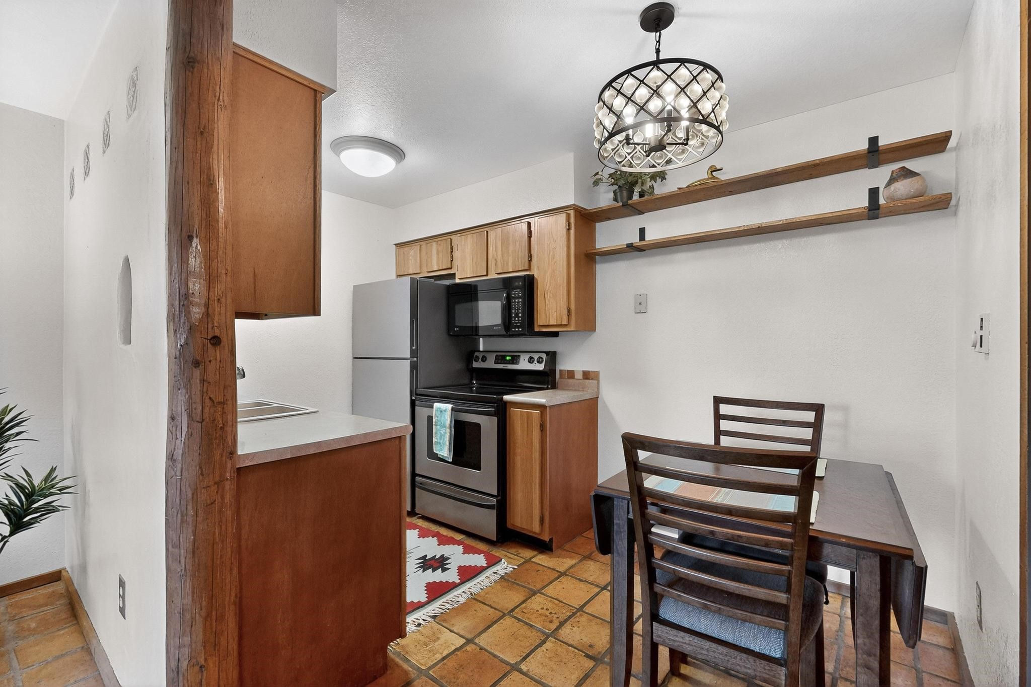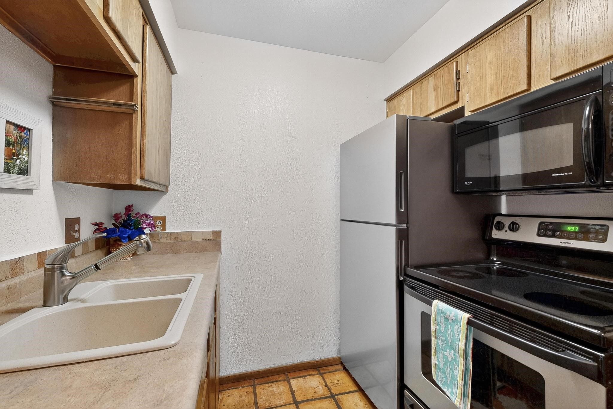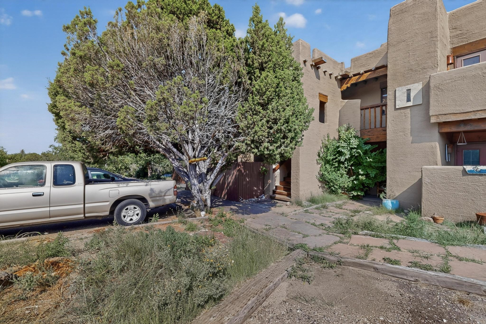 Back on the market, No fault of the Seller." Tierra de Zia ground-floor condo. The living room with a Kiva fireplace leads you into the dining area and a galley kitchen. The bedroom is en-suite with, bathroom. Tub/shower. Designated parking spot. Tierra De Zia is a gated community on 13.5 acres of native trees, plants, arroyos, fish ponds, and wooden bridges along walking trails. Seasonal swimming pool with sauna, clubhouse, outdoor grills, and a laundry facility, all in a park-like setting. Convenient to so many amenities, Restaurants, shopping, and schools.