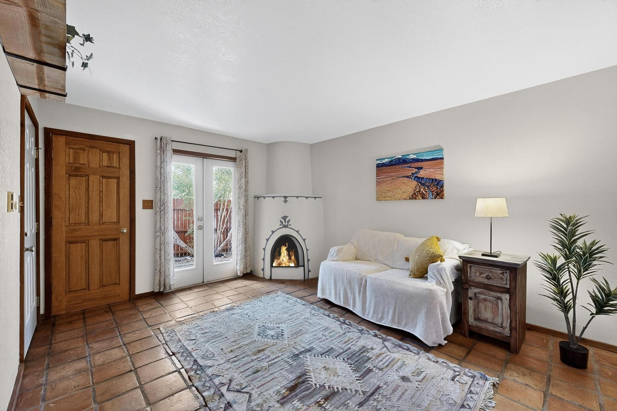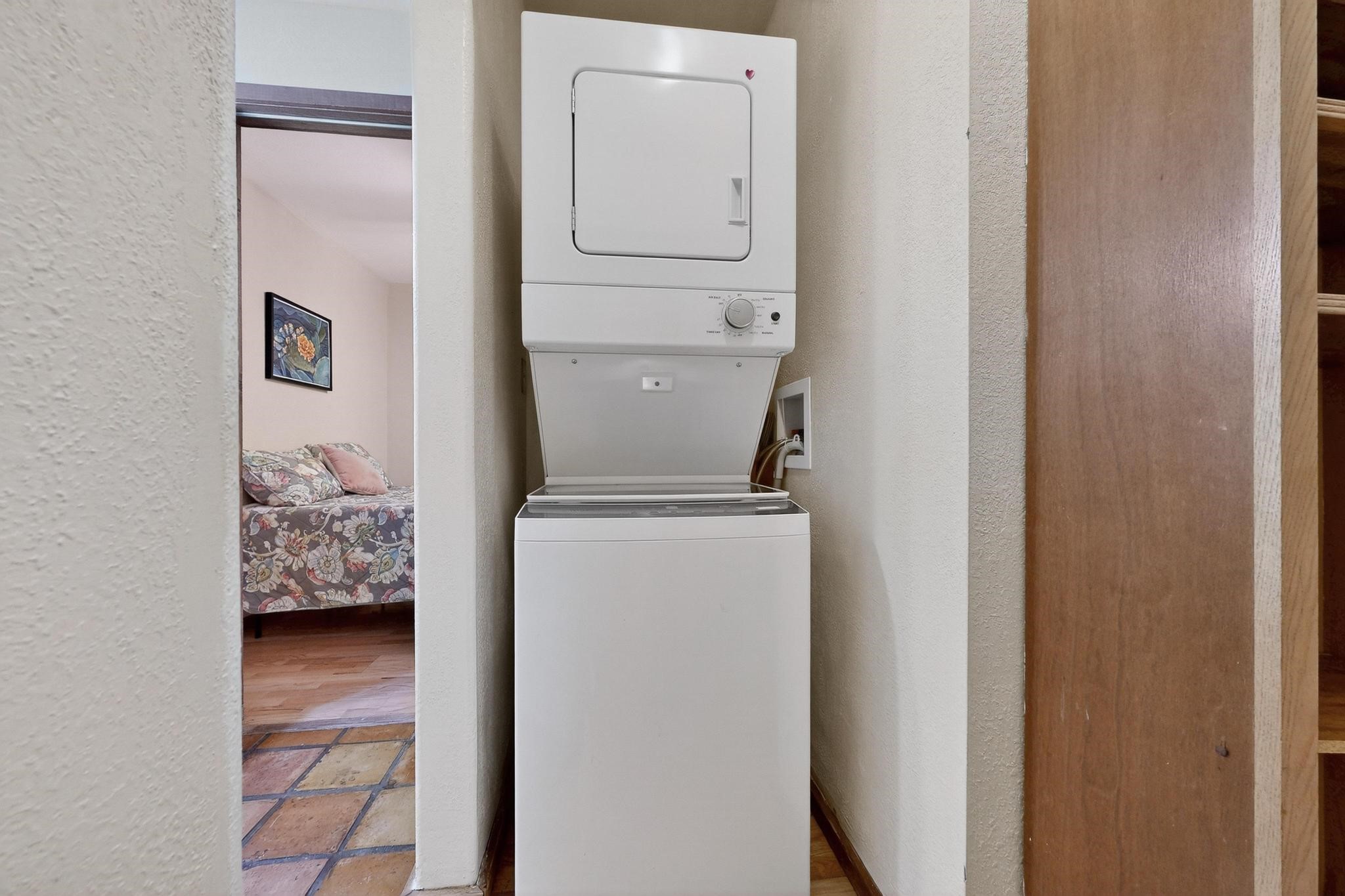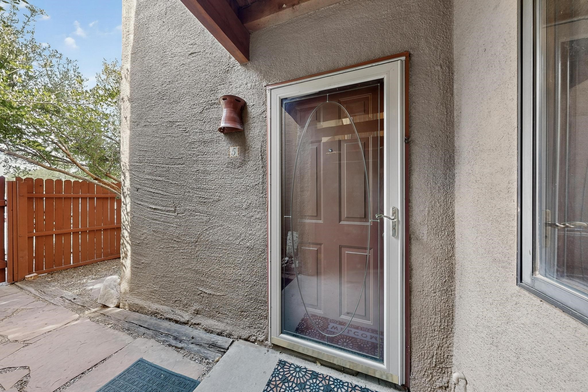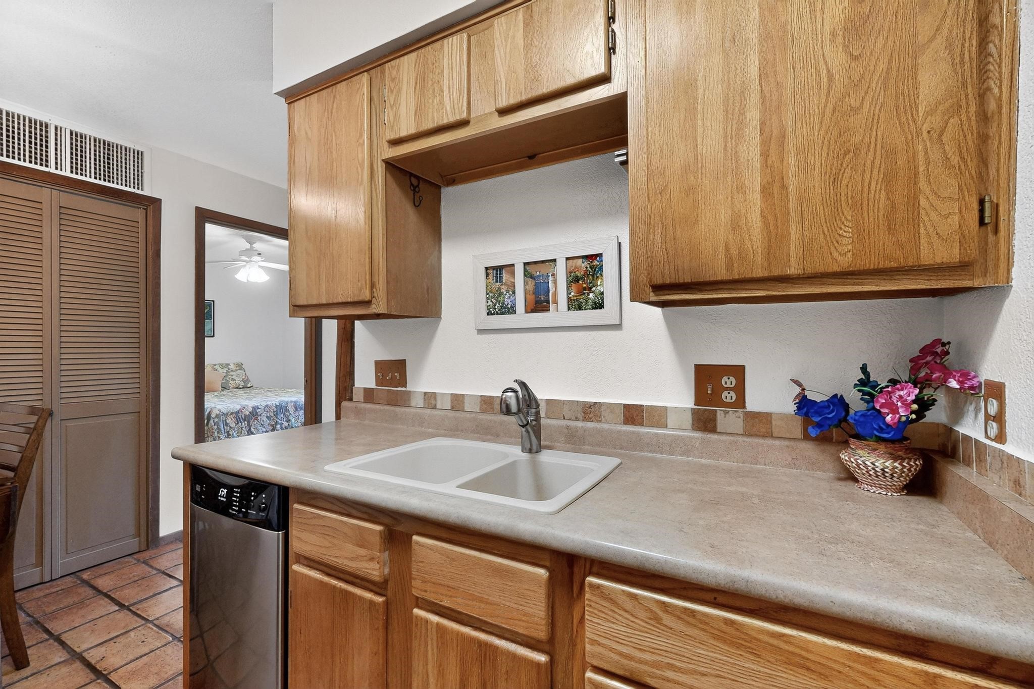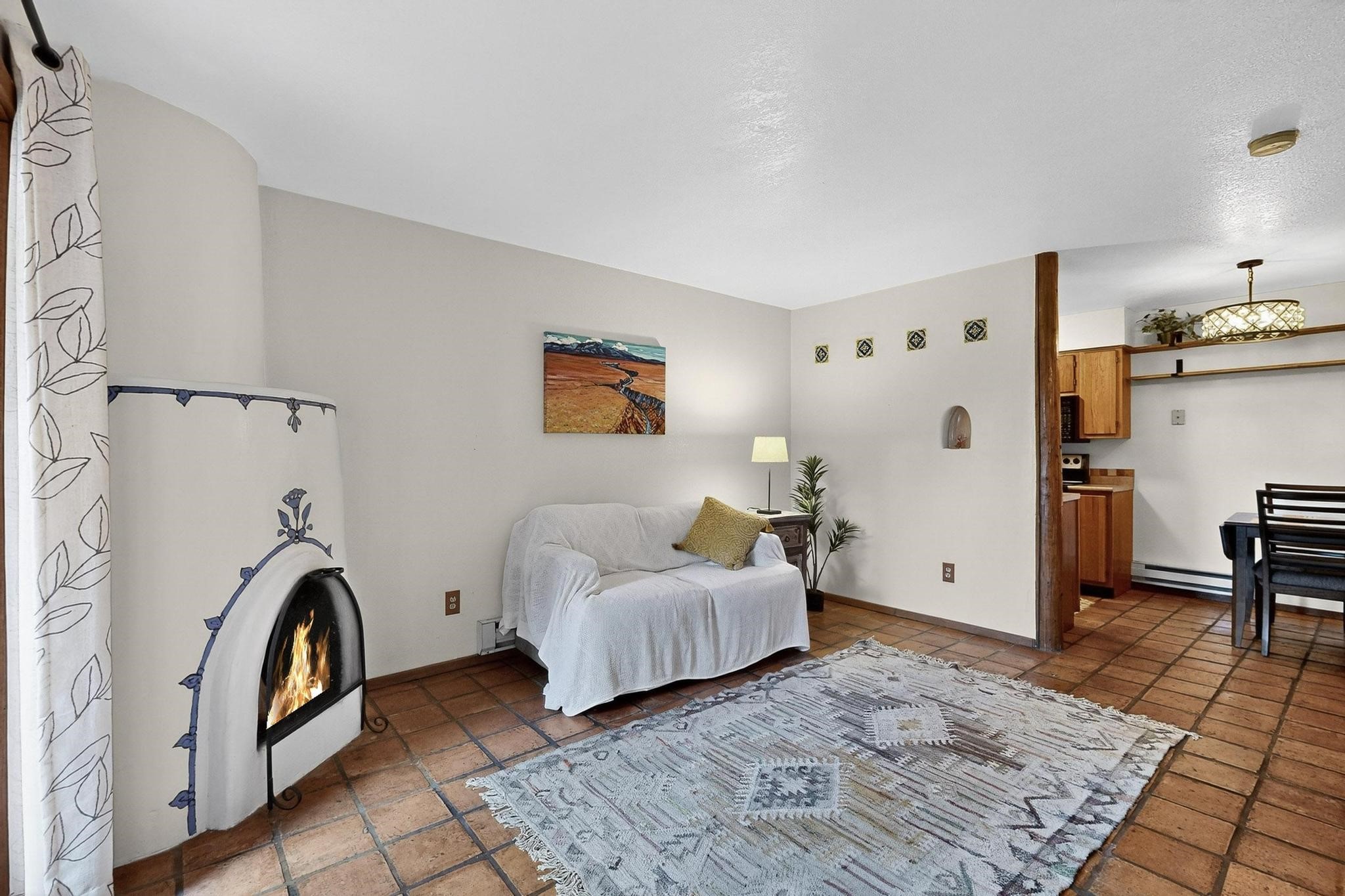 Back on the market, No fault of the Seller." Tierra de Zia ground-floor condo. The living room with a Kiva fireplace leads you into the dining area and a galley kitchen. The bedroom is en-suite with, bathroom. Tub/shower. Designated parking spot. Tierra De Zia is a gated community on 13.5 acres of native trees, plants, arroyos, fish ponds, and wooden bridges along walking trails. Seasonal swimming pool with sauna, clubhouse, outdoor grills, and a laundry facility, all in a park-like setting. Convenient to so many amenities, Restaurants, shopping, and schools.