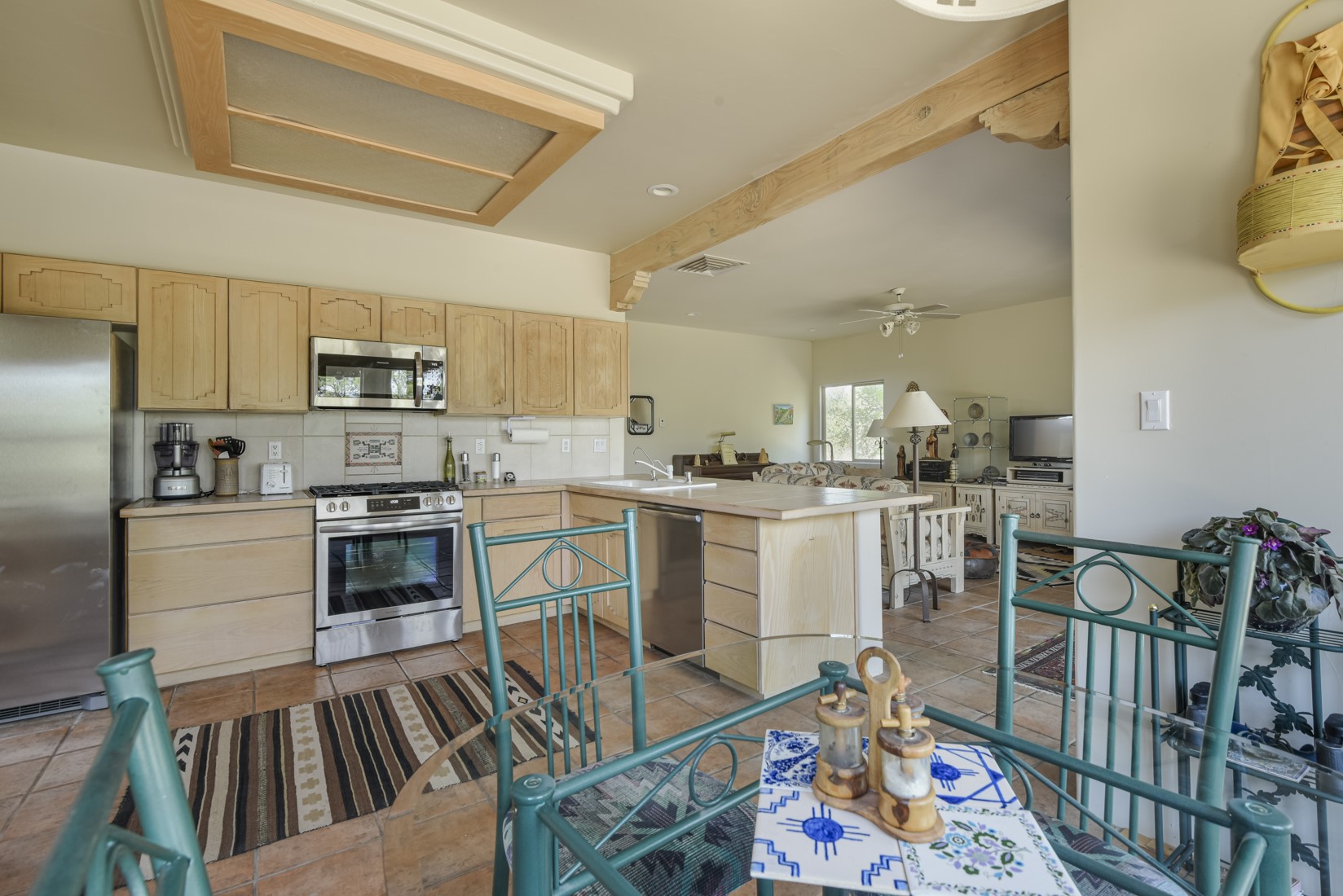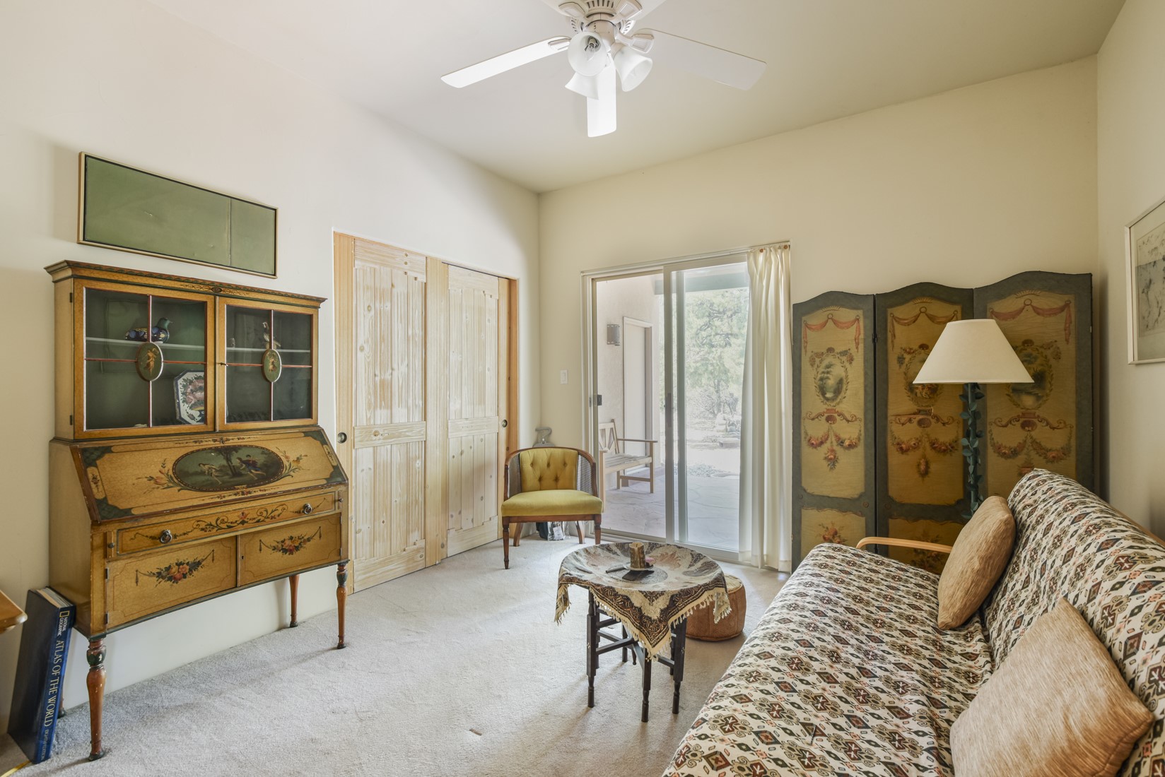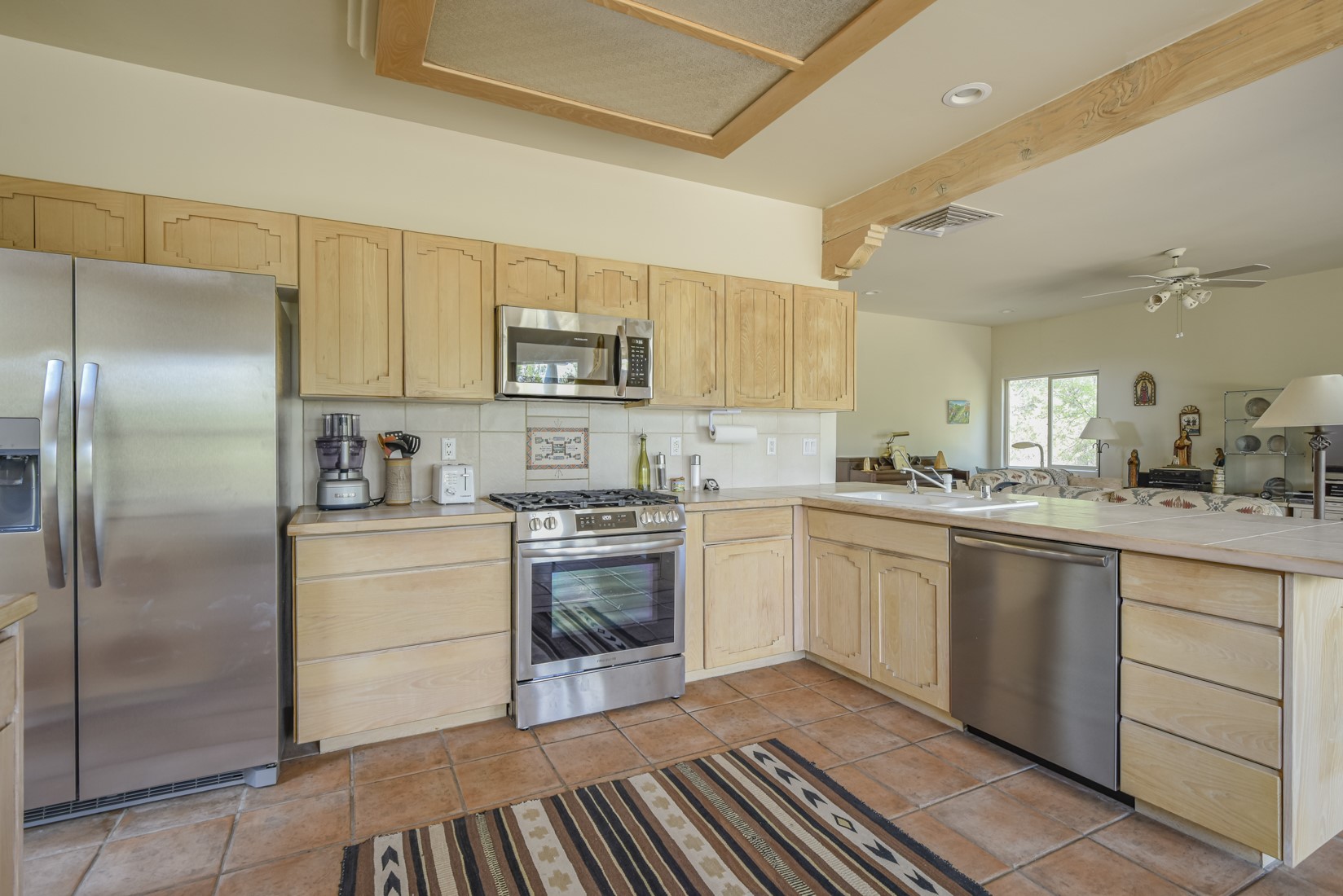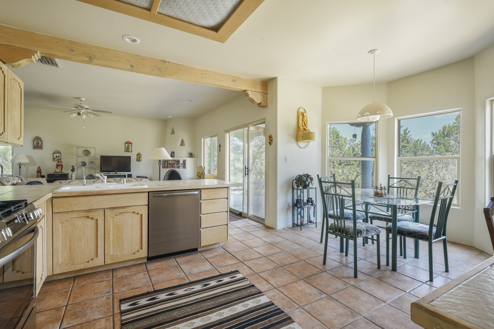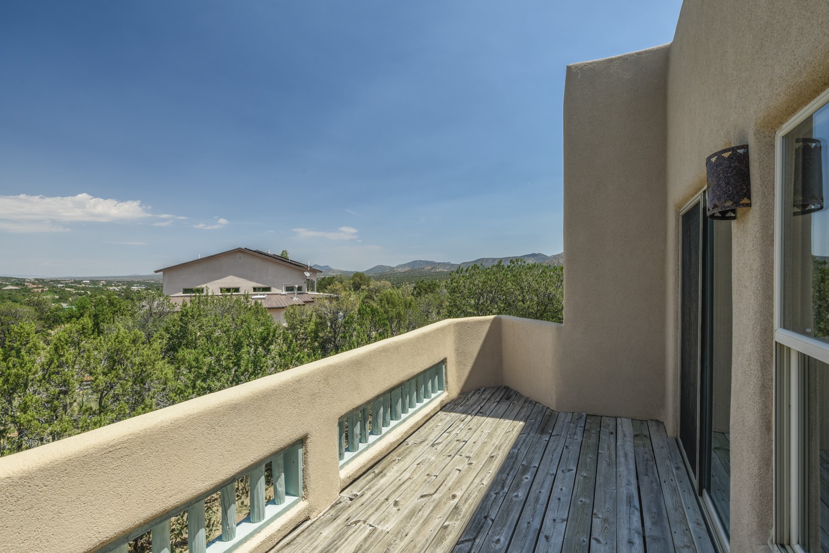 Welcome to this 1995 custom home by Elan Homes, designed and built for the original owner and rich with unique features. A grand Santa Fe Door welcomes you into a light-filled living space with a custom fireplace, exposed wood, and adobe accents. The open kitchen, breakfast area, and informal family room featuring a 2nd custom fireplace flow to a covered patio. A lower-level bedroom with a separate entrance and a close-by 3/4 bath offers flexibility. Upstairs includes a spacious main ensuite with panoramic views, two more bedrooms, a full bath, and two view decks. The 3-car garage includes an oversized bay with a raised door and ceiling for mid-size RV storage. A great Paa-Ko value and A must-see!