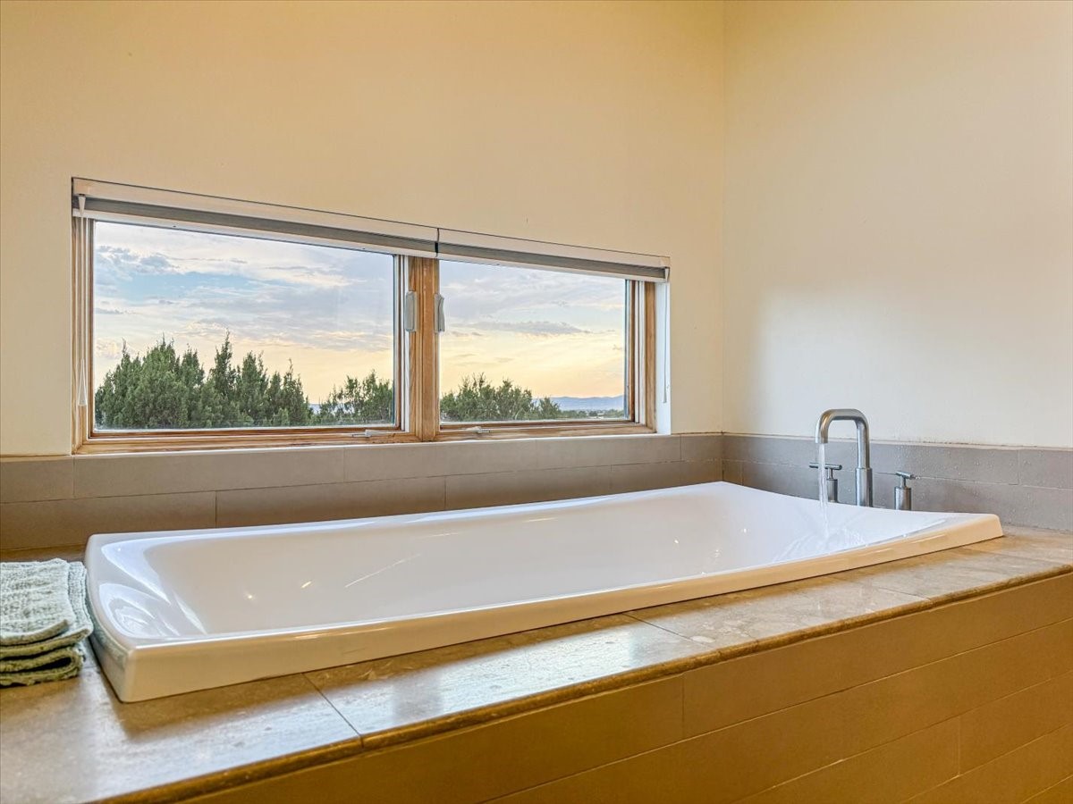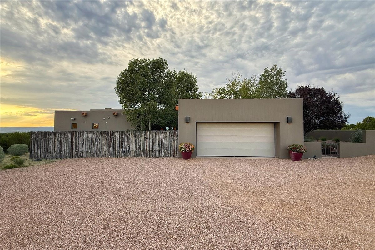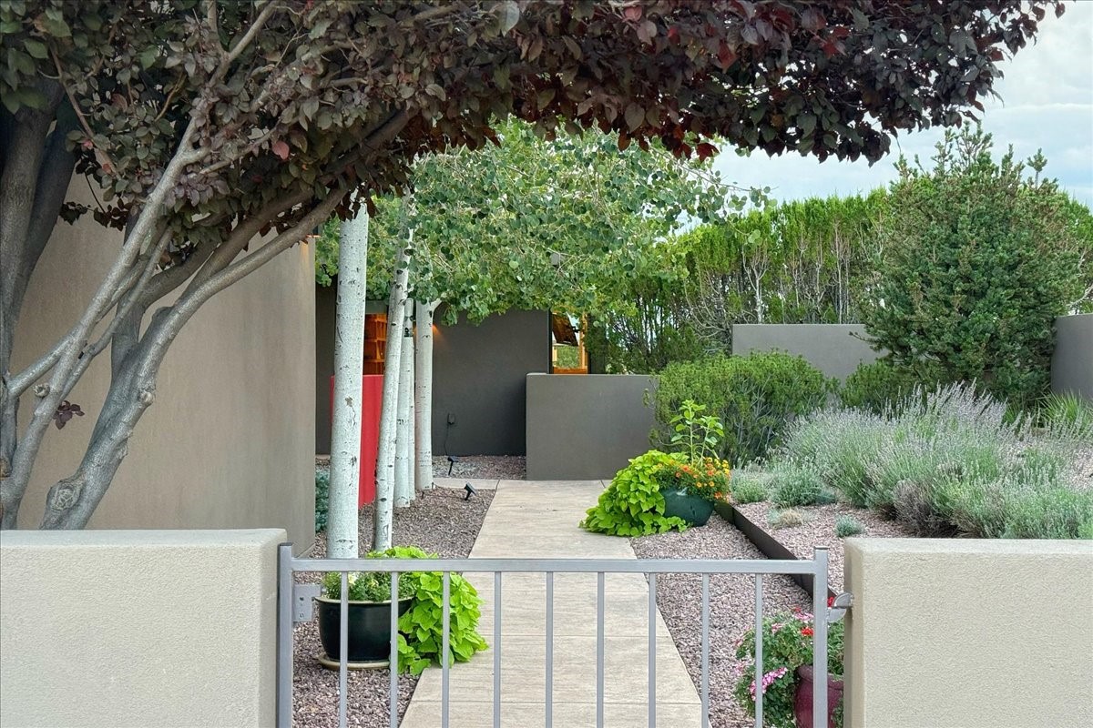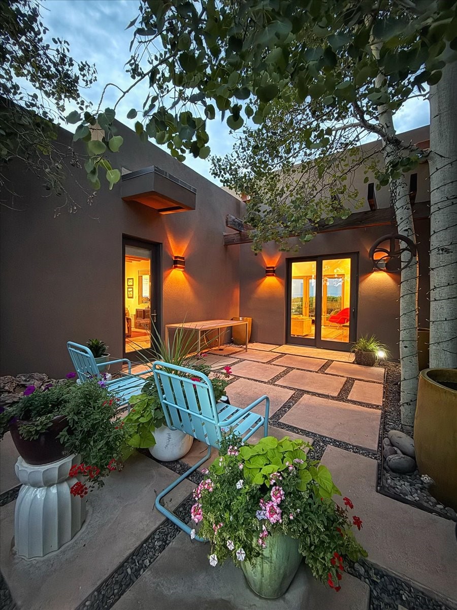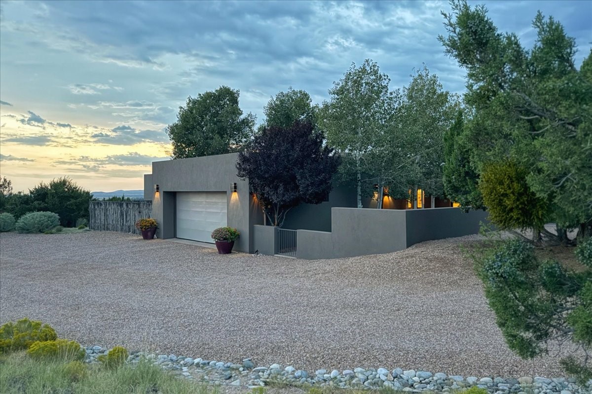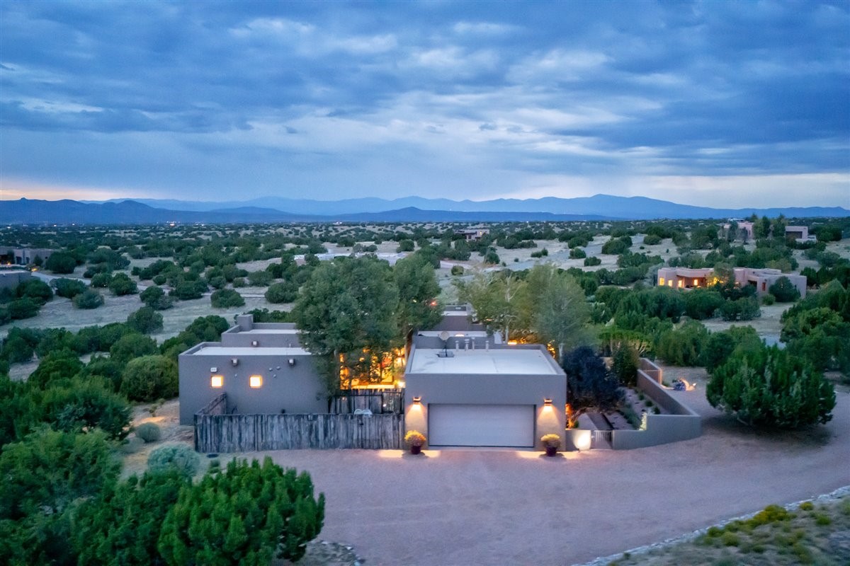 Welcome to this exceptional single-level, custom-built, contemporary-style home, featuring 2,528 sq. ft. of mindfully designed living space on 3.16 acres in the sought-after Tierra Grande subdivision, ~15 minutes from downtown Santa Fe. The home is strategically sited to capture the breathtaking panoramic views from the Jemez to the Sangre de Cristo mountains. This 3-bedroom, 3-bath residence (1 full, 1 three-quarter, and 1 half) boasts a thoughtfully designed floor plan that provides ideal separation between the primary suite and guest suites, offering both privacy and comfort. Blending timeless elegance with everyday livability, the home showcases exceptional craftsmanship throughout. A welcoming courtyard, shaded by mature aspens and enhanced by a serene water feature, sets the tone as you approach the striking 8-foot entry door that invites you into this beautiful home. The great room showcases 12-foot beamed ceilings with tongue-and-groove planking, a striking centerpiece fireplace, and Pella windows that fill the space with natural light while framing sweeping sunset views--also enjoyed from the primary suite, guest bedrooms, and the rear portal with its own fireplace. The kitchen is both functional and stylish, with custom maple cabinetry, Italian porcelain countertops and backsplash, and a wine refrigerator. The owners suite offers sunset exposures, a fireplace, a luxurious full bath, and a spacious walk-in closet with access to the interior courtyard. One guest suite is ensuite with a three-quarter bath and access to the rear portal for outdoor entertaining, while the third guest suite is ideal as an office or additional guest space. The interior courtyard, shaded by mature trees, offers a private, Zen-like retreat--ideal for both relaxation and entertaining. Additional highlights include 8-foot solid-core birch doors throughout, radiant floor heating, an oversized two-car garage, and a newly synthetic stucco system with a 7-year transferable warranty.