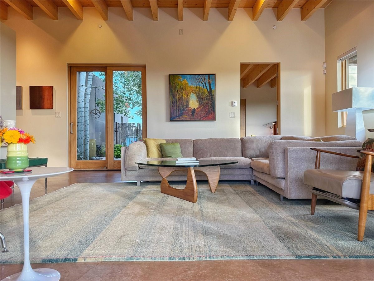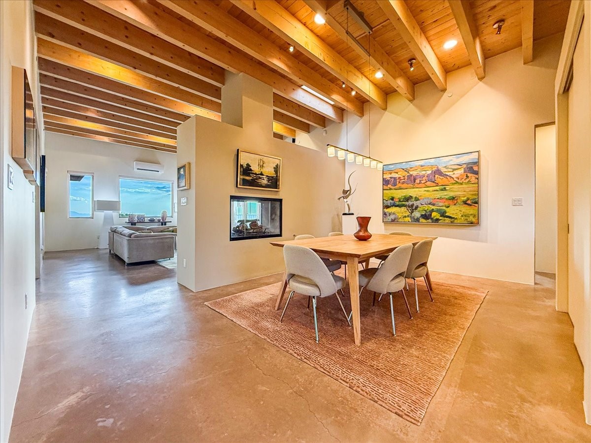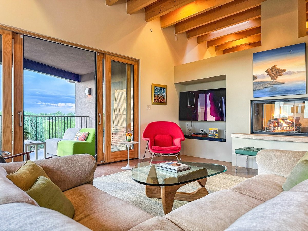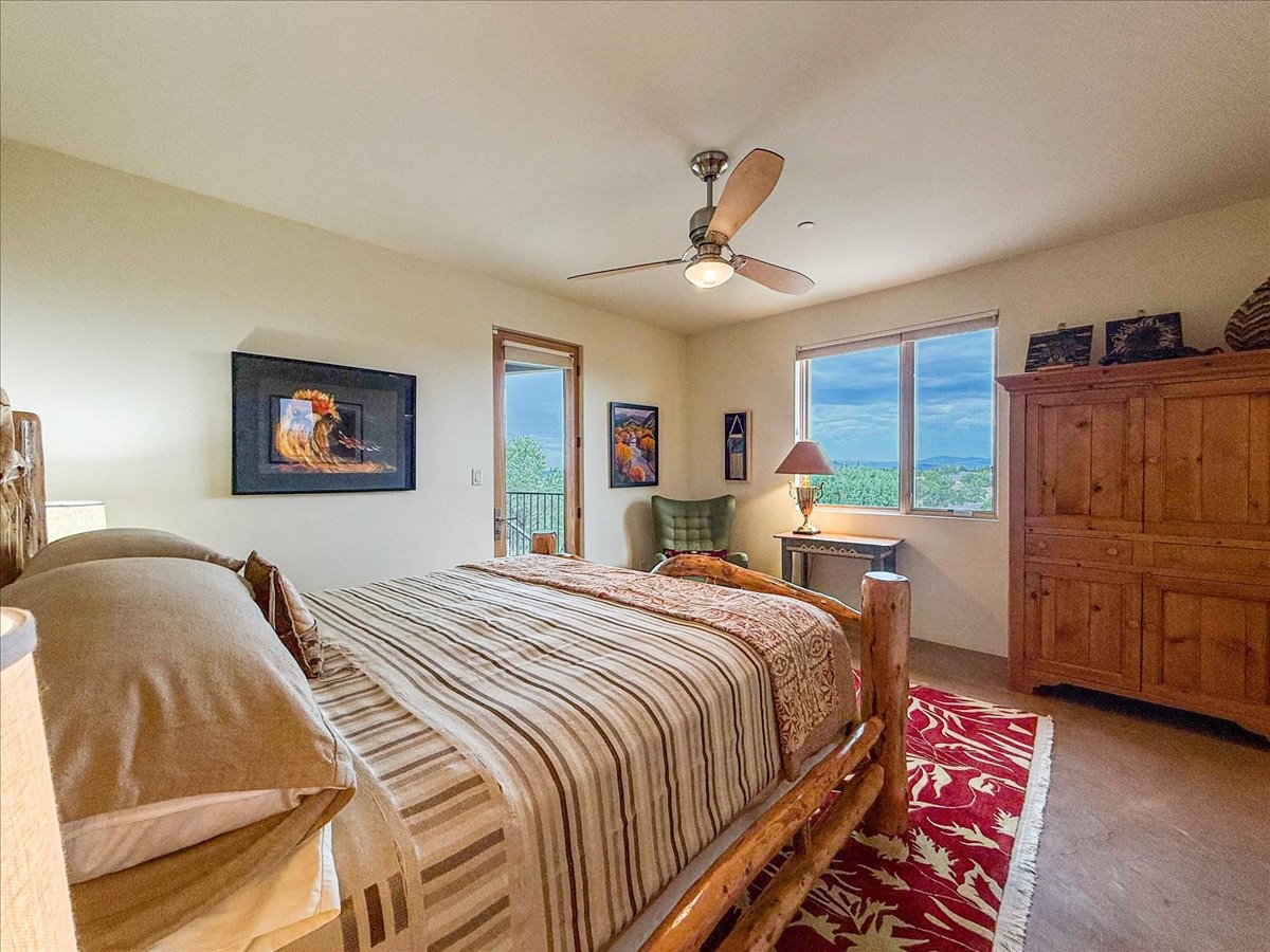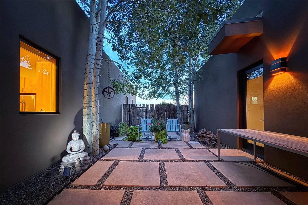 Welcome to this exceptional single-level, custom-built, contemporary-style home, featuring 2,528 sq. ft. of mindfully designed living space on 3.16 acres in the sought-after Tierra Grande subdivision, ~15 minutes from downtown Santa Fe. The home is strategically sited to capture the breathtaking panoramic views from the Jemez to the Sangre de Cristo mountains. This 3-bedroom, 3-bath residence (1 full, 1 three-quarter, and 1 half) boasts a thoughtfully designed floor plan that provides ideal separation between the primary suite and guest suites, offering both privacy and comfort. Blending timeless elegance with everyday livability, the home showcases exceptional craftsmanship throughout. A welcoming courtyard, shaded by mature aspens and enhanced by a serene water feature, sets the tone as you approach the striking 8-foot entry door that invites you into this beautiful home. The great room showcases 12-foot beamed ceilings with tongue-and-groove planking, a striking centerpiece fireplace, and Pella windows that fill the space with natural light while framing sweeping sunset views--also enjoyed from the primary suite, guest bedrooms, and the rear portal with its own fireplace. The kitchen is both functional and stylish, with custom maple cabinetry, Italian porcelain countertops and backsplash, and a wine refrigerator. The owners suite offers sunset exposures, a fireplace, a luxurious full bath, and a spacious walk-in closet with access to the interior courtyard. One guest suite is ensuite with a three-quarter bath and access to the rear portal for outdoor entertaining, while the third guest suite is ideal as an office or additional guest space. The interior courtyard, shaded by mature trees, offers a private, Zen-like retreat--ideal for both relaxation and entertaining. Additional highlights include 8-foot solid-core birch doors throughout, radiant floor heating, an oversized two-car garage, and a newly synthetic stucco system with a 7-year transferable warranty.