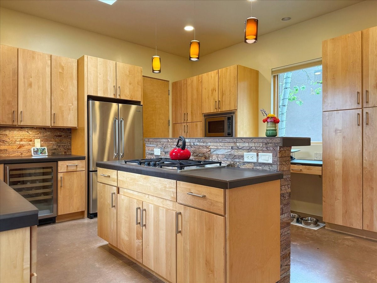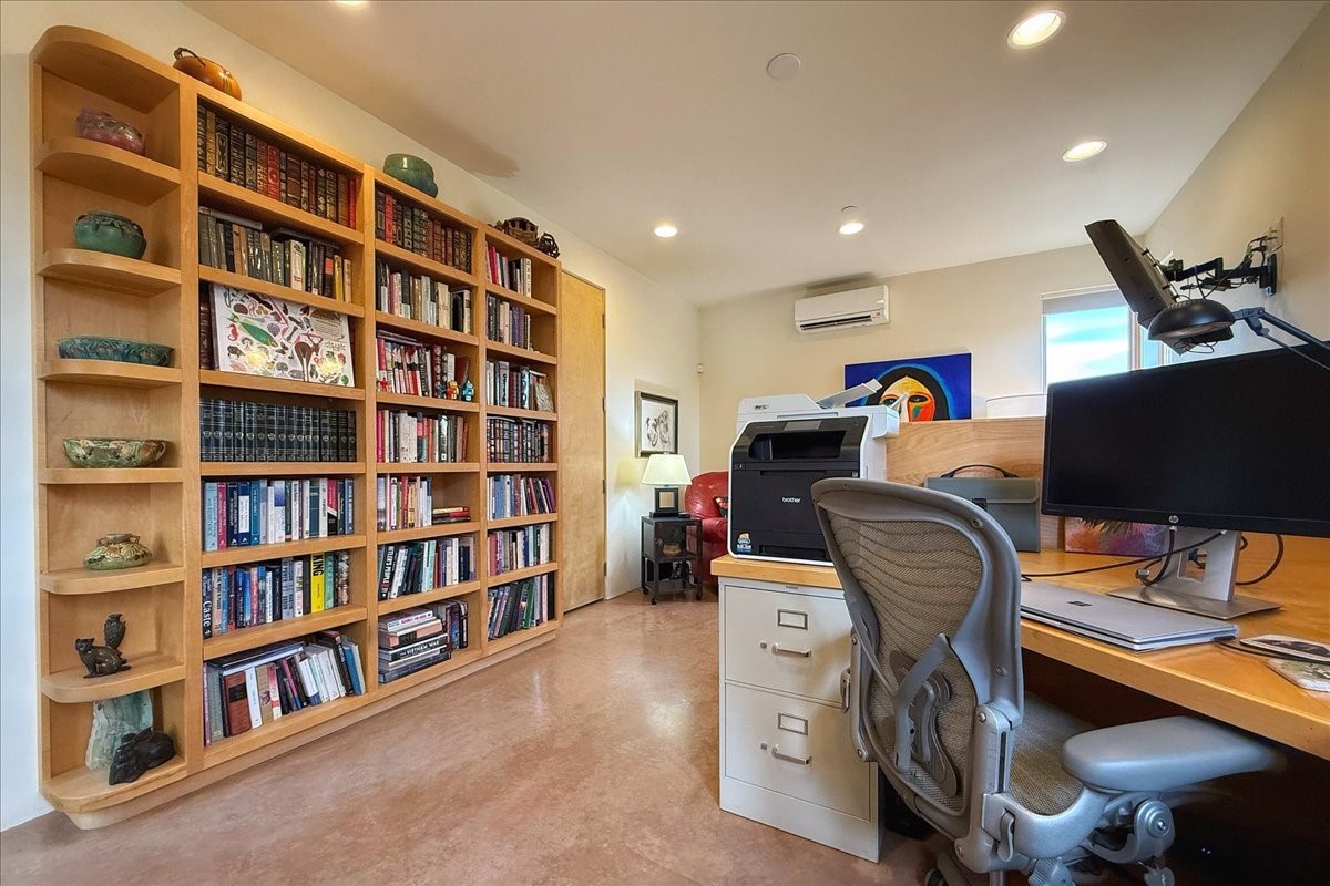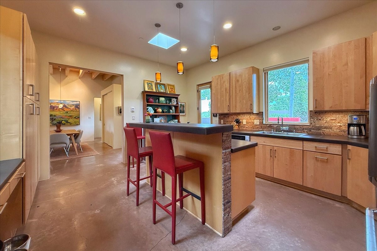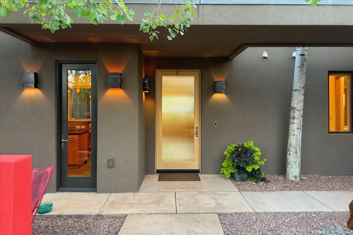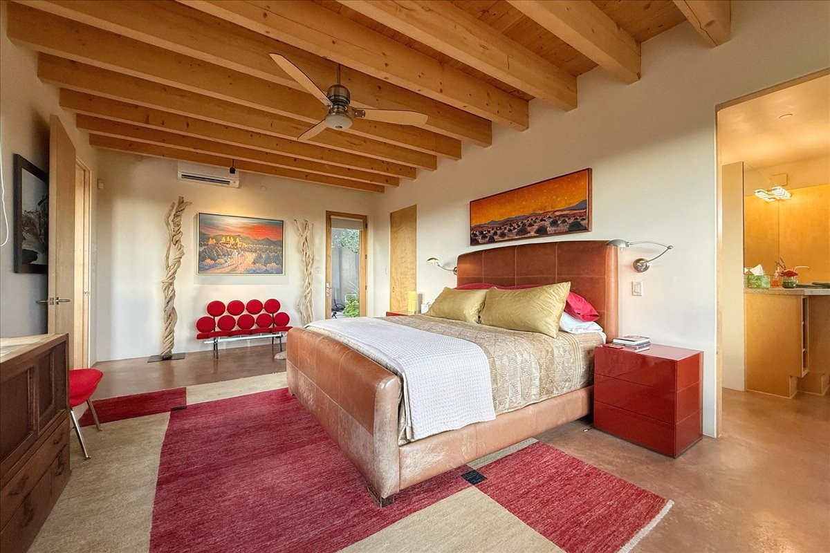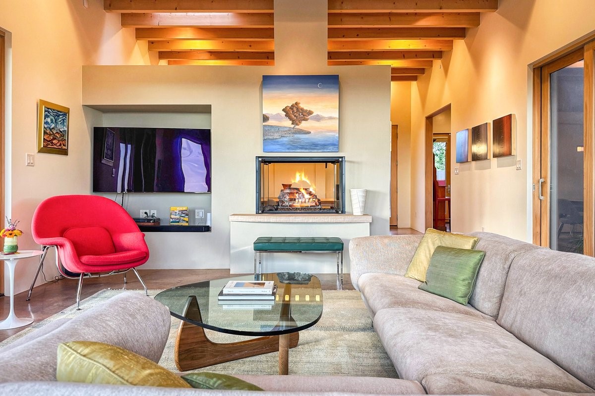 Welcome to this exceptional single-level, custom-built, contemporary-style home, featuring 2,528 sq. ft. of mindfully designed living space on 3.16 acres in the sought-after Tierra Grande subdivision, ~15 minutes from downtown Santa Fe. The home is strategically sited to capture the breathtaking panoramic views from the Jemez to the Sangre de Cristo mountains. This 3-bedroom, 3-bath residence (1 full, 1 three-quarter, and 1 half) boasts a thoughtfully designed floor plan that provides ideal separation between the primary suite and guest suites, offering both privacy and comfort. Blending timeless elegance with everyday livability, the home showcases exceptional craftsmanship throughout. A welcoming courtyard, shaded by mature aspens and enhanced by a serene water feature, sets the tone as you approach the striking 8-foot entry door that invites you into this beautiful home. The great room showcases 12-foot beamed ceilings with tongue-and-groove planking, a striking centerpiece fireplace, and Pella windows that fill the space with natural light while framing sweeping sunset views--also enjoyed from the primary suite, guest bedrooms, and the rear portal with its own fireplace. The kitchen is both functional and stylish, with custom maple cabinetry, Italian porcelain countertops and backsplash, and a wine refrigerator. The owners suite offers sunset exposures, a fireplace, a luxurious full bath, and a spacious walk-in closet with access to the interior courtyard. One guest suite is ensuite with a three-quarter bath and access to the rear portal for outdoor entertaining, while the third guest suite is ideal as an office or additional guest space. The interior courtyard, shaded by mature trees, offers a private, Zen-like retreat--ideal for both relaxation and entertaining. Additional highlights include 8-foot solid-core birch doors throughout, radiant floor heating, an oversized two-car garage, and a newly synthetic stucco system with a 7-year transferable warranty.