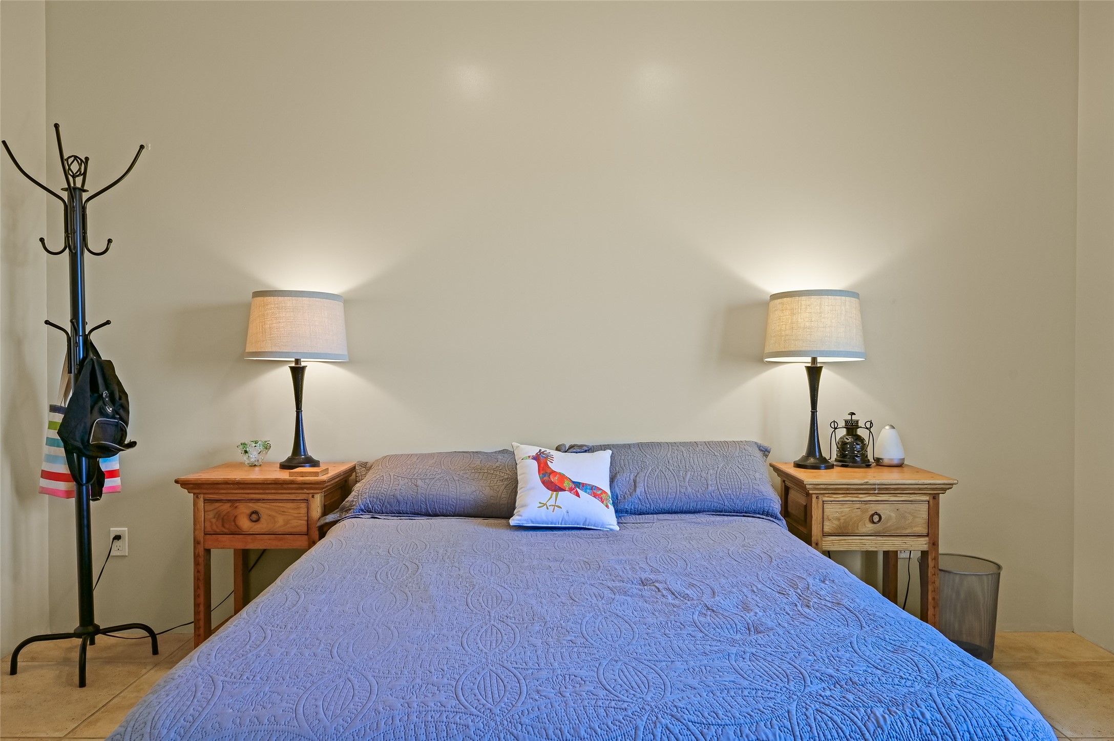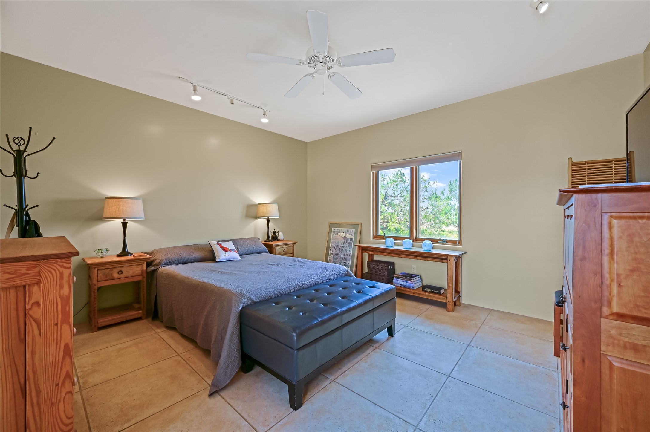 Best views in Eldorado! Built to take advantage of breathtaking views of the Sangre de Cristo, Jemez, Ortiz & Sandia mountain ranges, this pueblo-style, 3 bedroom, 3 bath home has an open layout with 2 bedrooms & 2 full baths arranged around the great room plus a third bedroom/studio/office with half bath & separate entrance. Enjoy outdoor living & dining on the spacious portal with retractable sun shades or in the large, enclosed courtyard. Luxury features include porcelain floor tiles, radiant floor heat, Bosch/Miele appliances, kiva fireplace & an oversized garage. Brand new stucco & exterior paint completed in 2025. Don't miss this one!