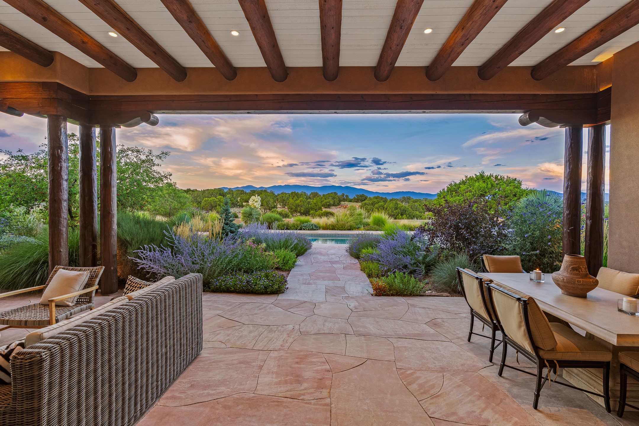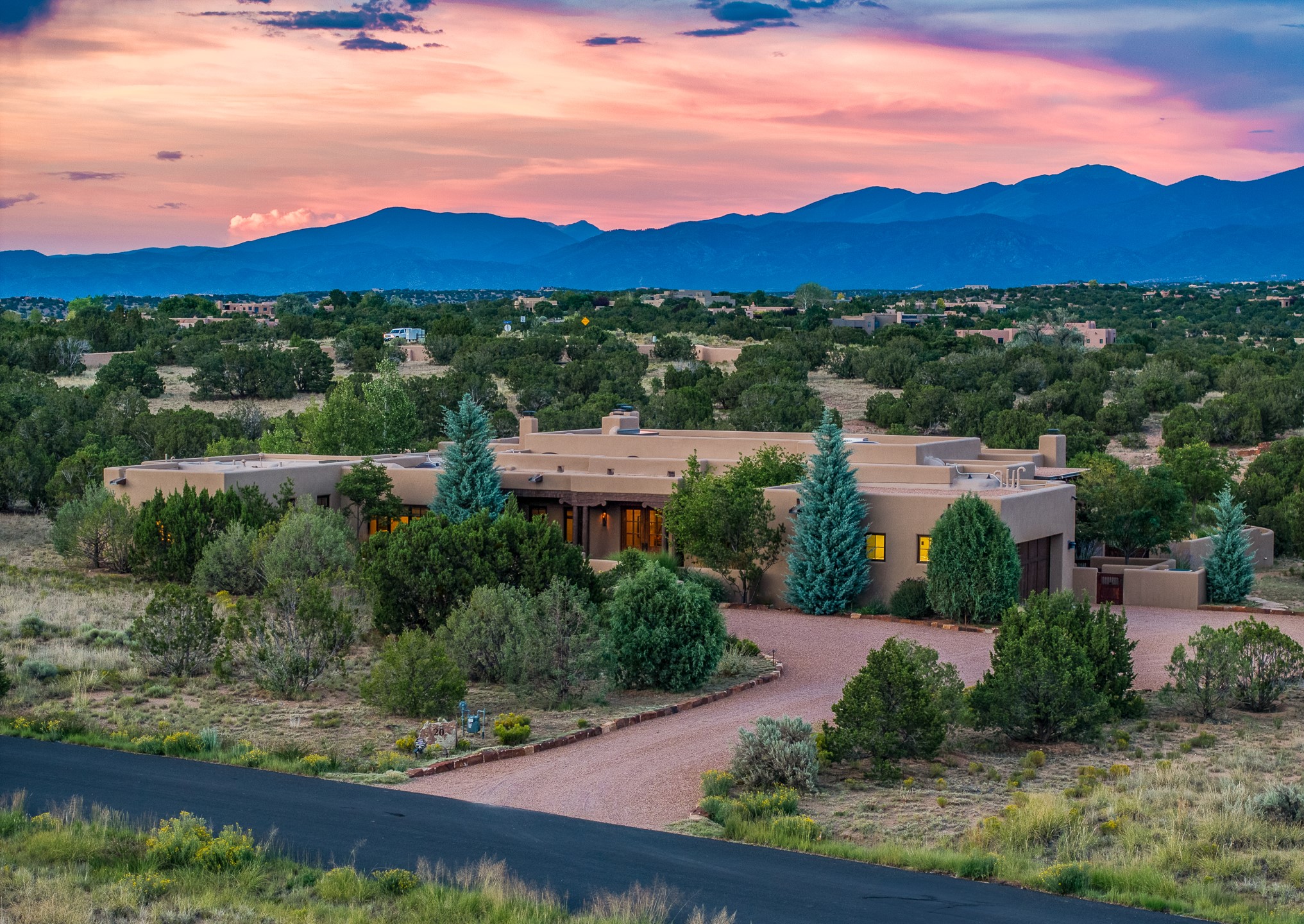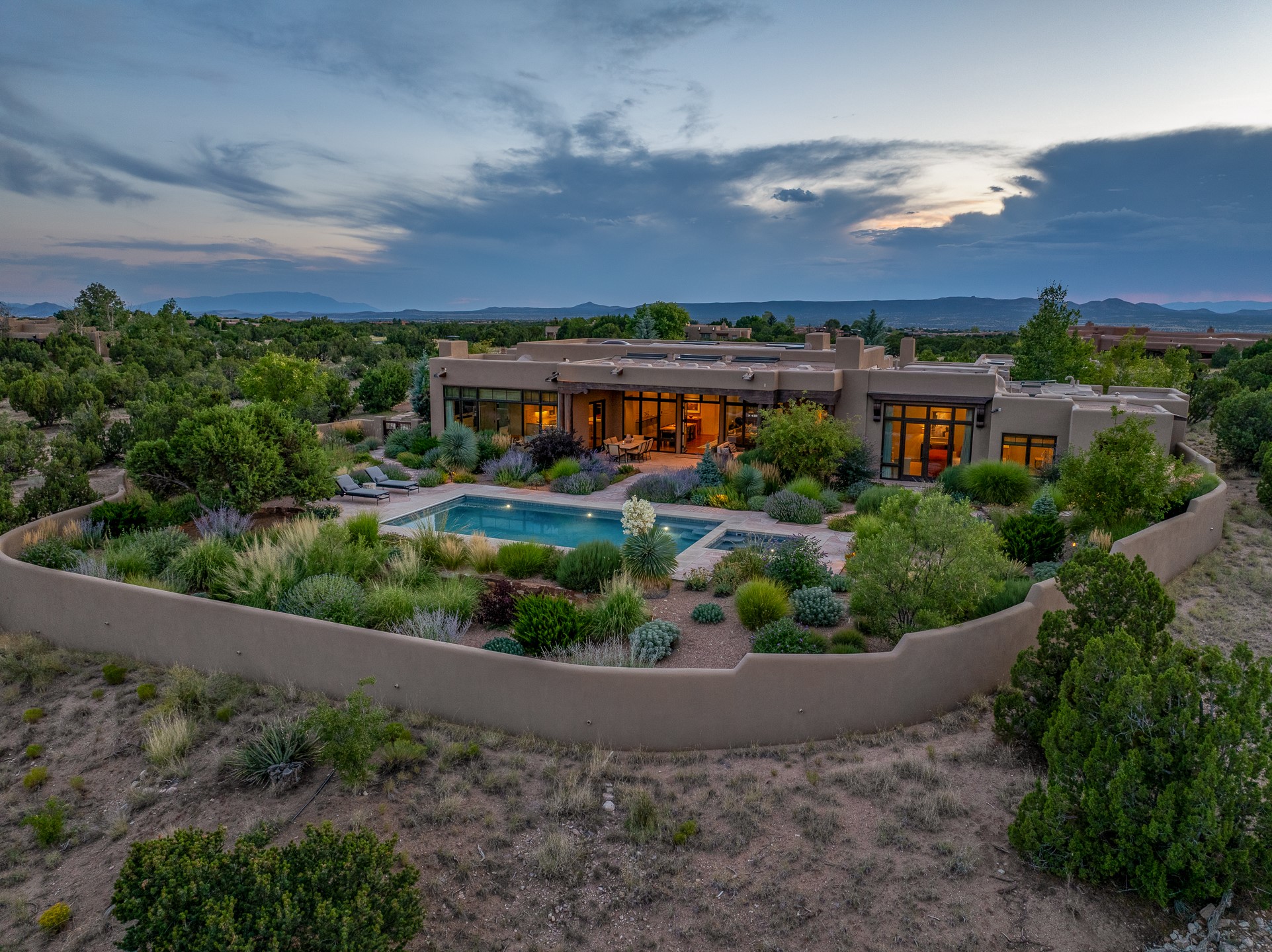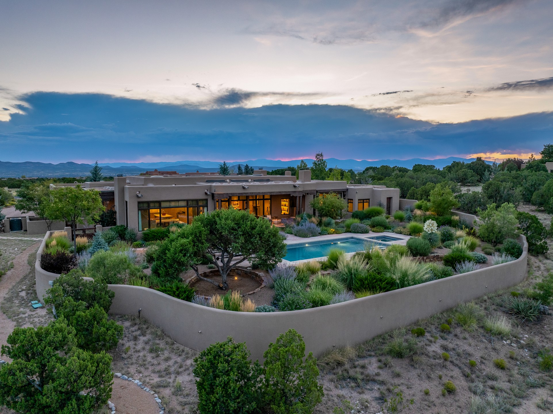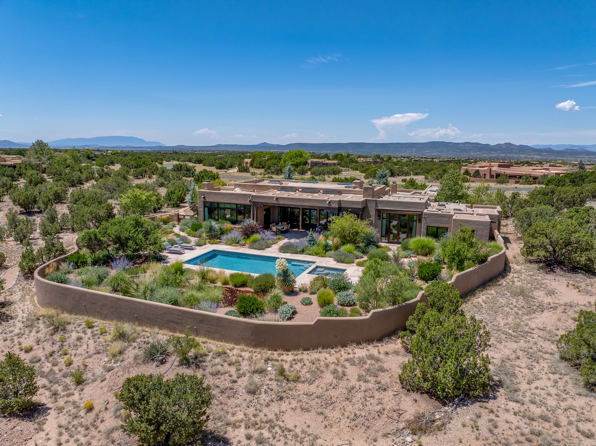 Rarely does a home achieve such a perfect balance of style, quality, natural beauty, and thoughtful design--but 20 Picacho Peak does so with ease. Set on five+ private acres off Wildhorse, this 4,800-square-foot masterpiece by Woods Design Builders offers 3 spacious, private bedrooms, five bathrooms, two dedicated offices, and exceptional indoor-outdoor living. From the primary suite and main living areas, panoramic Sangre de Cristo views create a constant backdrop, while the resort-style backyard--with its stunning in-ground pool, spa, and lush landscaping--invites year-round enjoyment.Completed in 2016 with meticulous attention to detail, the home features warm wood floors and beams, abundant natural light, and a layout that blends openness with intimate spaces. The chef's kitchen is equipped with Miele and Sub-Zero appliances, elegant Taj Mahal quartzite countertops, and a versatile wet bar seamlessly connecting to the living room. A casual den just off the kitchen offers an inviting retreat, while the adjacent great room and open dining area are ideal for entertaining. The primary suite is a true sanctuary, complete with a kiva fireplace, private portal access, a beautifully remodeled spa bath, and a grand walk-in closet. A second kiva graces the adjoining library/office--perfect for quiet work or reading by the fire. Guest quarters are thoughtfully separated, offering generous bedrooms, a private den, and comfort for family or friends. From the pool terrace, a landscaped path leads to a serene seating area - an idyllic spot for stargazing under Santa Fe's expansive skies. Additional amenities include radiant in-floor heating along with central heat & refrigerated air, a spacious two-car garage, abundant storage, and access to Las Campanas' world-class golf, dining, spa, and equestrian facilities. A golf equity membership to the club is available for separate purchase. Las Campanas HOA provides 24 hour security, gates, 24/7 Paramedic services, walking paths and maintenance. A rare offering in one of Santa Fe's most coveted communities - crafted for those who demand both beauty and quality.