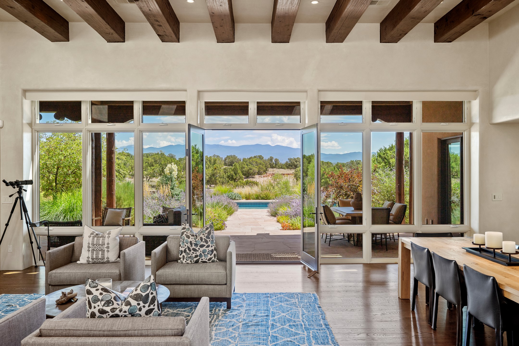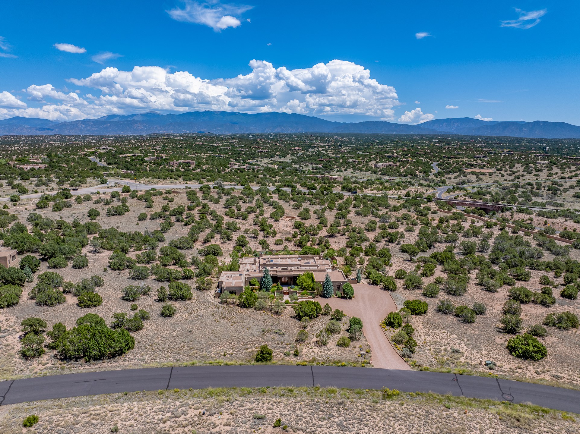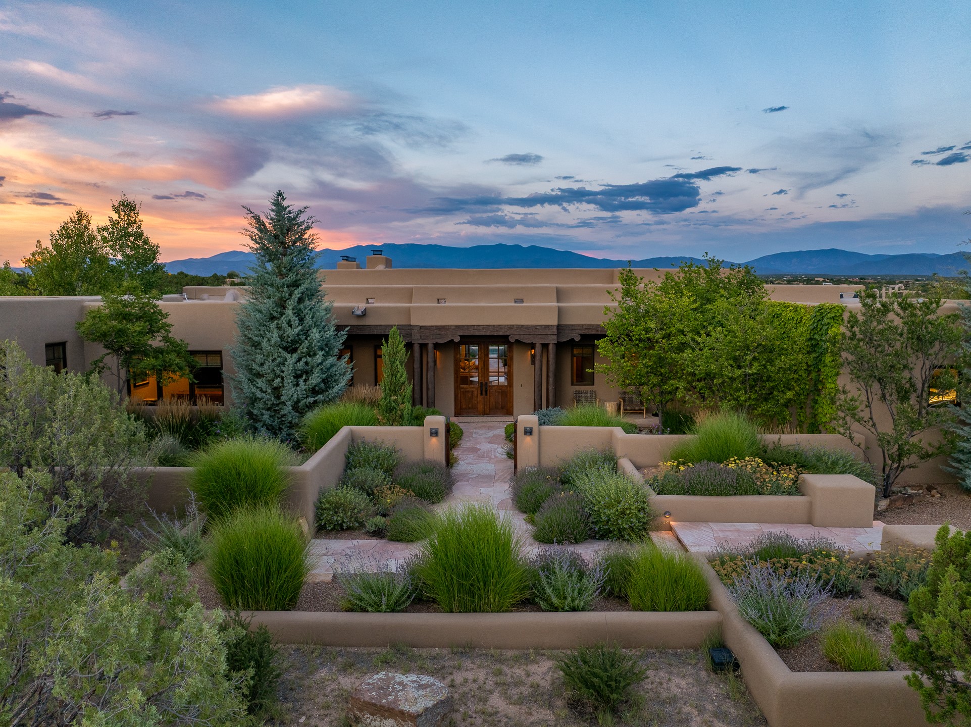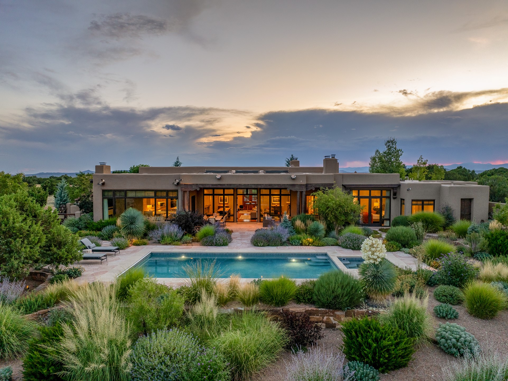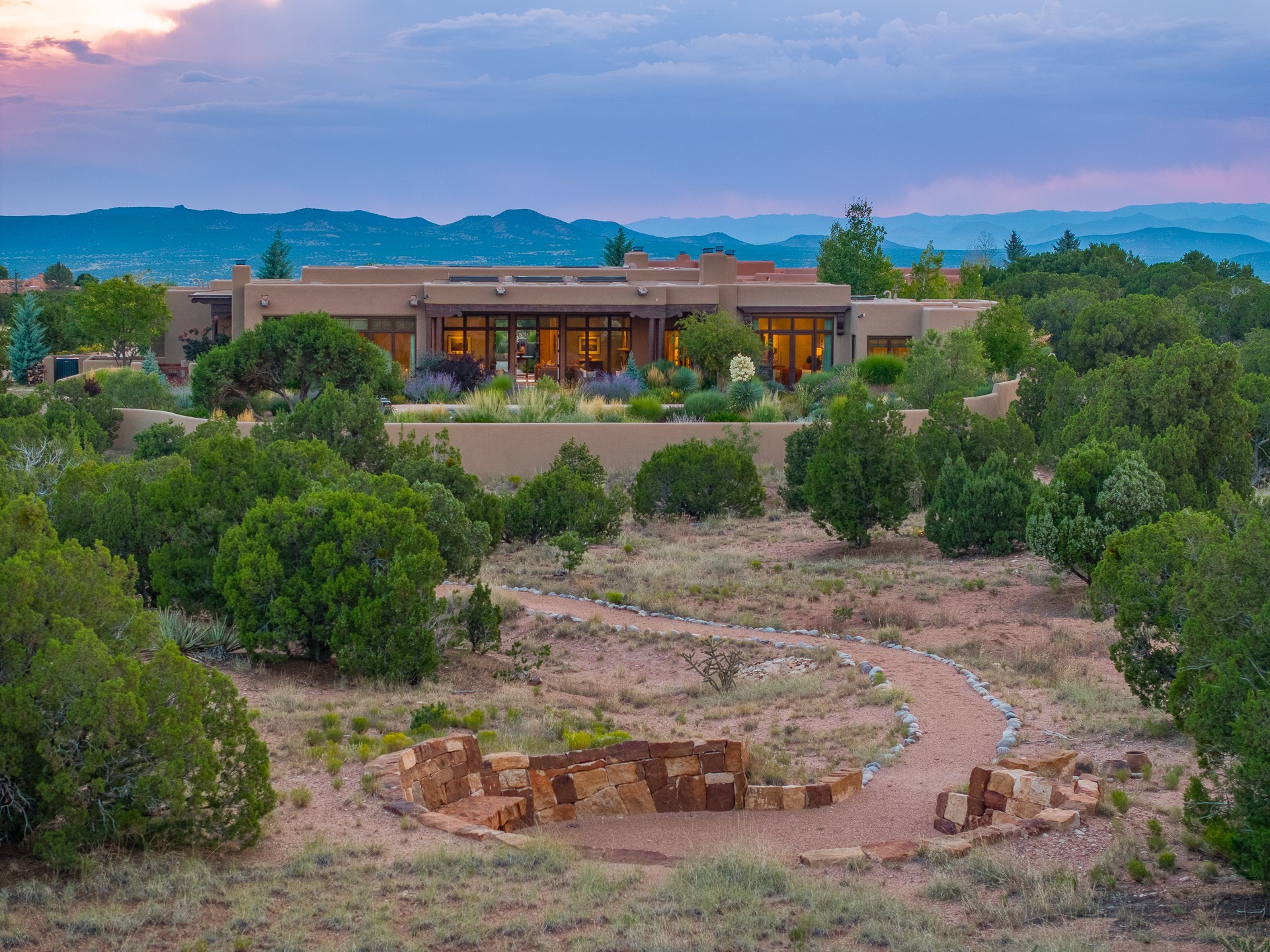 Rarely does a home achieve such a perfect balance of style, quality, natural beauty, and thoughtful design--but 20 Picacho Peak does so with ease. Set on five+ private acres off Wildhorse, this 4,800-square-foot masterpiece by Woods Design Builders offers 3 spacious, private bedrooms, five bathrooms, two dedicated offices, and exceptional indoor-outdoor living. From the primary suite and main living areas, panoramic Sangre de Cristo views create a constant backdrop, while the resort-style backyard--with its stunning in-ground pool, spa, and lush landscaping--invites year-round enjoyment.Completed in 2016 with meticulous attention to detail, the home features warm wood floors and beams, abundant natural light, and a layout that blends openness with intimate spaces. The chef's kitchen is equipped with Miele and Sub-Zero appliances, elegant Taj Mahal quartzite countertops, and a versatile wet bar seamlessly connecting to the living room. A casual den just off the kitchen offers an inviting retreat, while the adjacent great room and open dining area are ideal for entertaining. The primary suite is a true sanctuary, complete with a kiva fireplace, private portal access, a beautifully remodeled spa bath, and a grand walk-in closet. A second kiva graces the adjoining library/office--perfect for quiet work or reading by the fire. Guest quarters are thoughtfully separated, offering generous bedrooms, a private den, and comfort for family or friends. From the pool terrace, a landscaped path leads to a serene seating area - an idyllic spot for stargazing under Santa Fe's expansive skies. Additional amenities include radiant in-floor heating along with central heat & refrigerated air, a spacious two-car garage, abundant storage, and access to Las Campanas' world-class golf, dining, spa, and equestrian facilities. A golf equity membership to the club is available for separate purchase. Las Campanas HOA provides 24 hour security, gates, 24/7 Paramedic services, walking paths and maintenance. A rare offering in one of Santa Fe's most coveted communities - crafted for those who demand both beauty and quality.