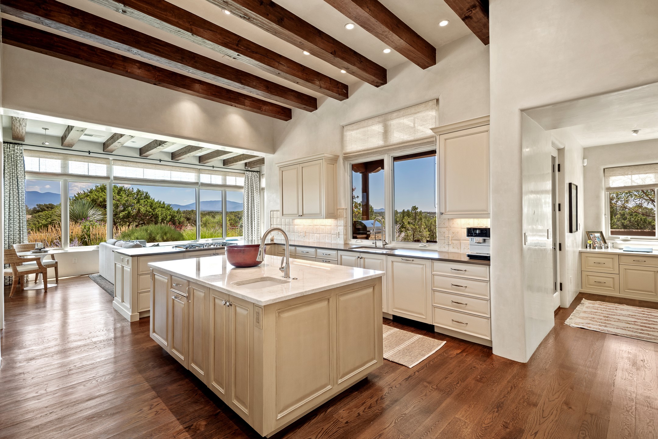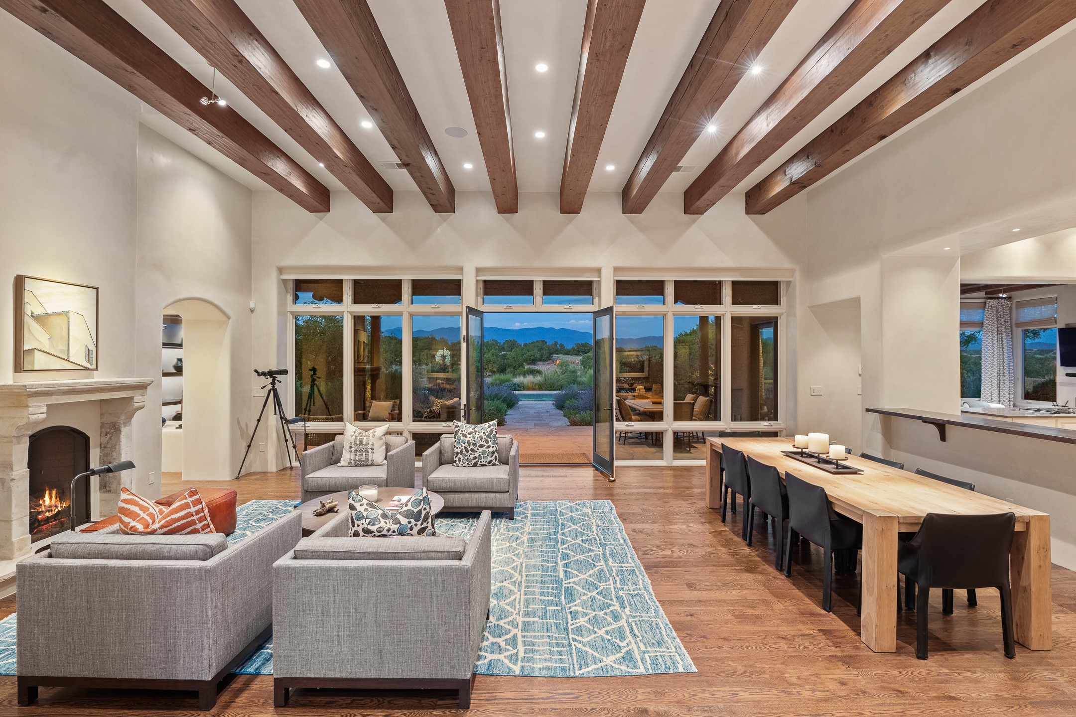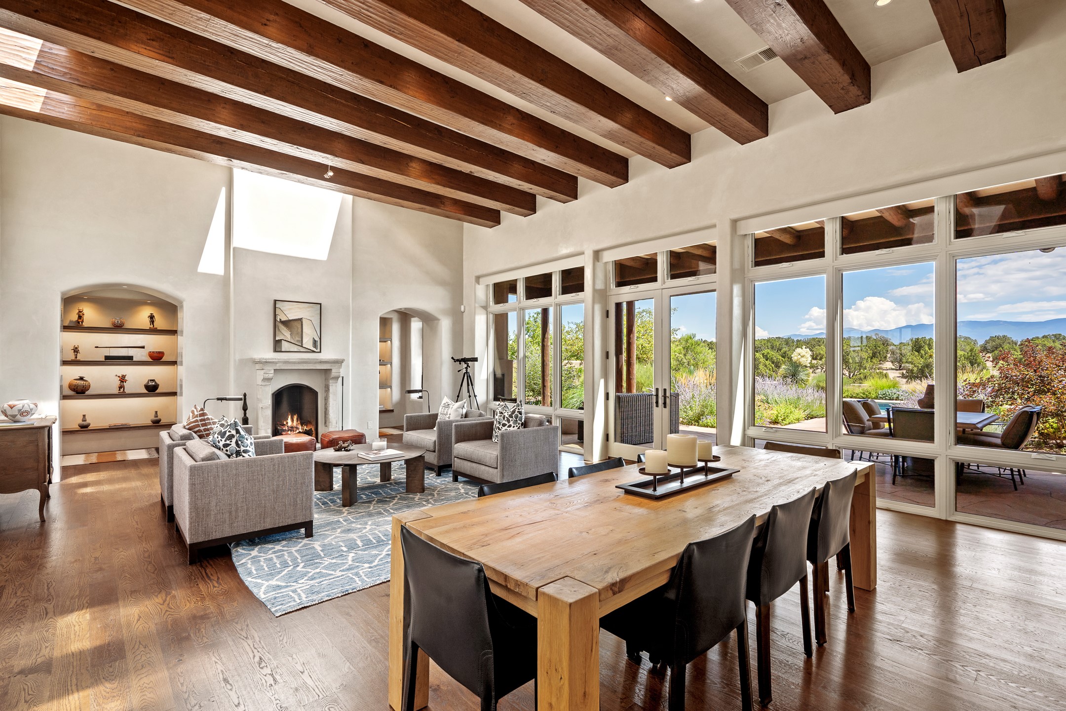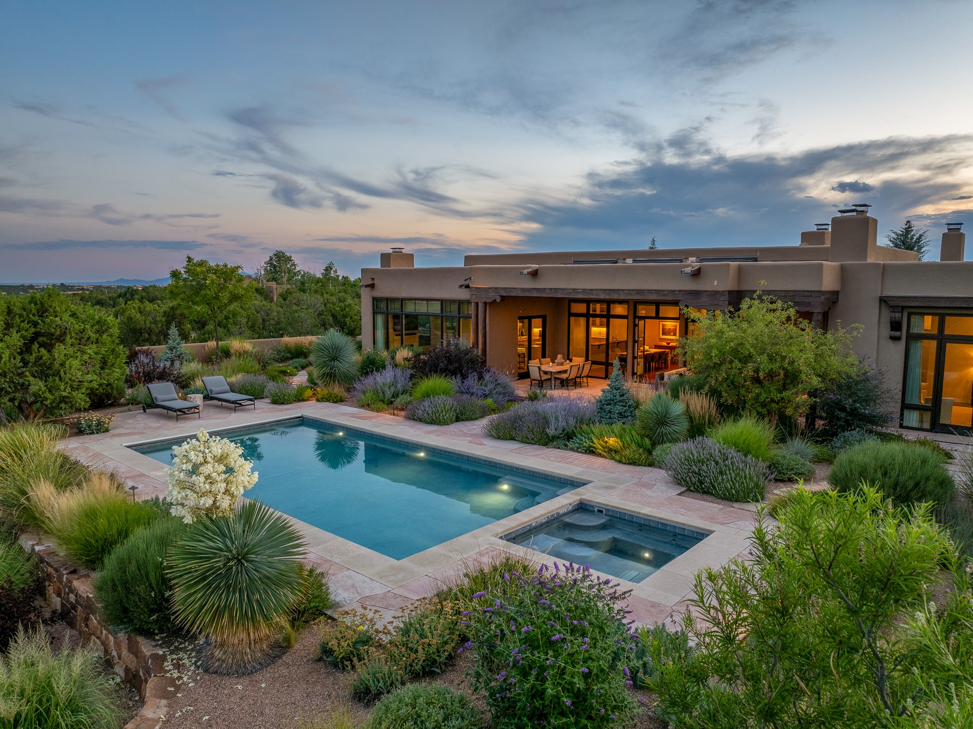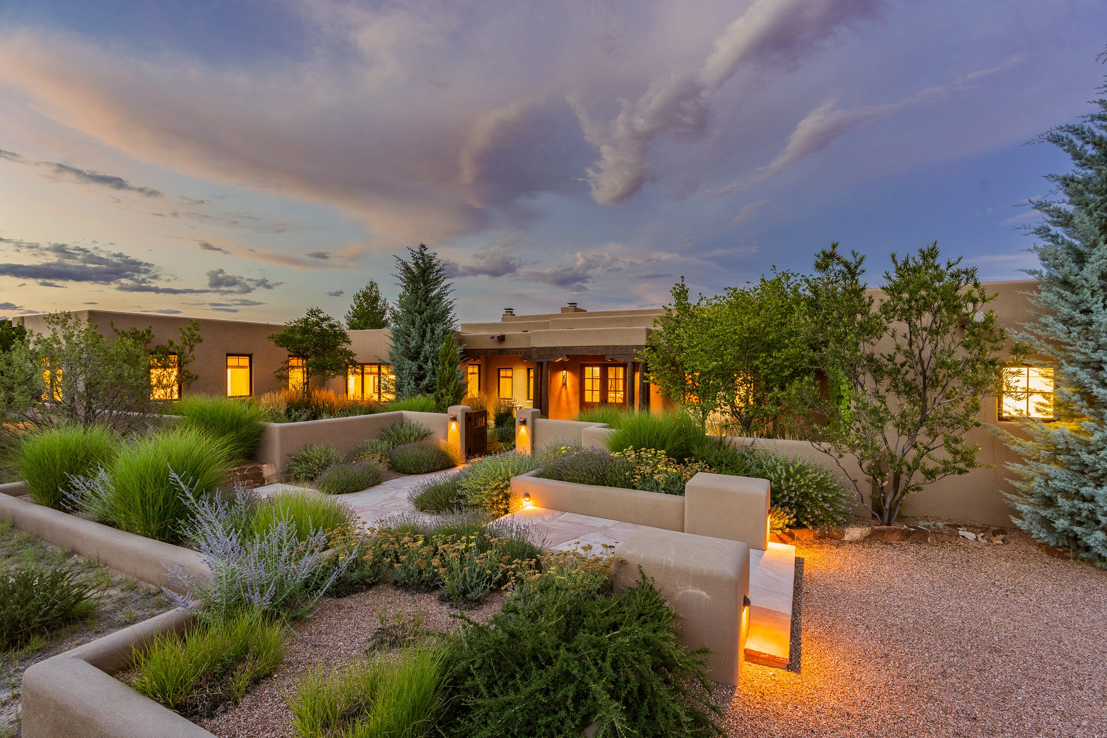 Rarely does a home achieve such a perfect balance of style, quality, natural beauty, and thoughtful design--but 20 Picacho Peak does so with ease. Set on five+ private acres off Wildhorse, this 4,800-square-foot masterpiece by Woods Design Builders offers 3 spacious, private bedrooms, five bathrooms, two dedicated offices, and exceptional indoor-outdoor living. From the primary suite and main living areas, panoramic Sangre de Cristo views create a constant backdrop, while the resort-style backyard--with its stunning in-ground pool, spa, and lush landscaping--invites year-round enjoyment.Completed in 2016 with meticulous attention to detail, the home features warm wood floors and beams, abundant natural light, and a layout that blends openness with intimate spaces. The chef's kitchen is equipped with Miele and Sub-Zero appliances, elegant Taj Mahal quartzite countertops, and a versatile wet bar seamlessly connecting to the living room. A casual den just off the kitchen offers an inviting retreat, while the adjacent great room and open dining area are ideal for entertaining. The primary suite is a true sanctuary, complete with a kiva fireplace, private portal access, a beautifully remodeled spa bath, and a grand walk-in closet. A second kiva graces the adjoining library/office--perfect for quiet work or reading by the fire. Guest quarters are thoughtfully separated, offering generous bedrooms, a private den, and comfort for family or friends. From the pool terrace, a landscaped path leads to a serene seating area - an idyllic spot for stargazing under Santa Fe's expansive skies. Additional amenities include radiant in-floor heating along with central heat & refrigerated air, a spacious two-car garage, abundant storage, and access to Las Campanas' world-class golf, dining, spa, and equestrian facilities. A golf equity membership to the club is available for separate purchase. Las Campanas HOA provides 24 hour security, gates, 24/7 Paramedic services, walking paths and maintenance. A rare offering in one of Santa Fe's most coveted communities - crafted for those who demand both beauty and quality.