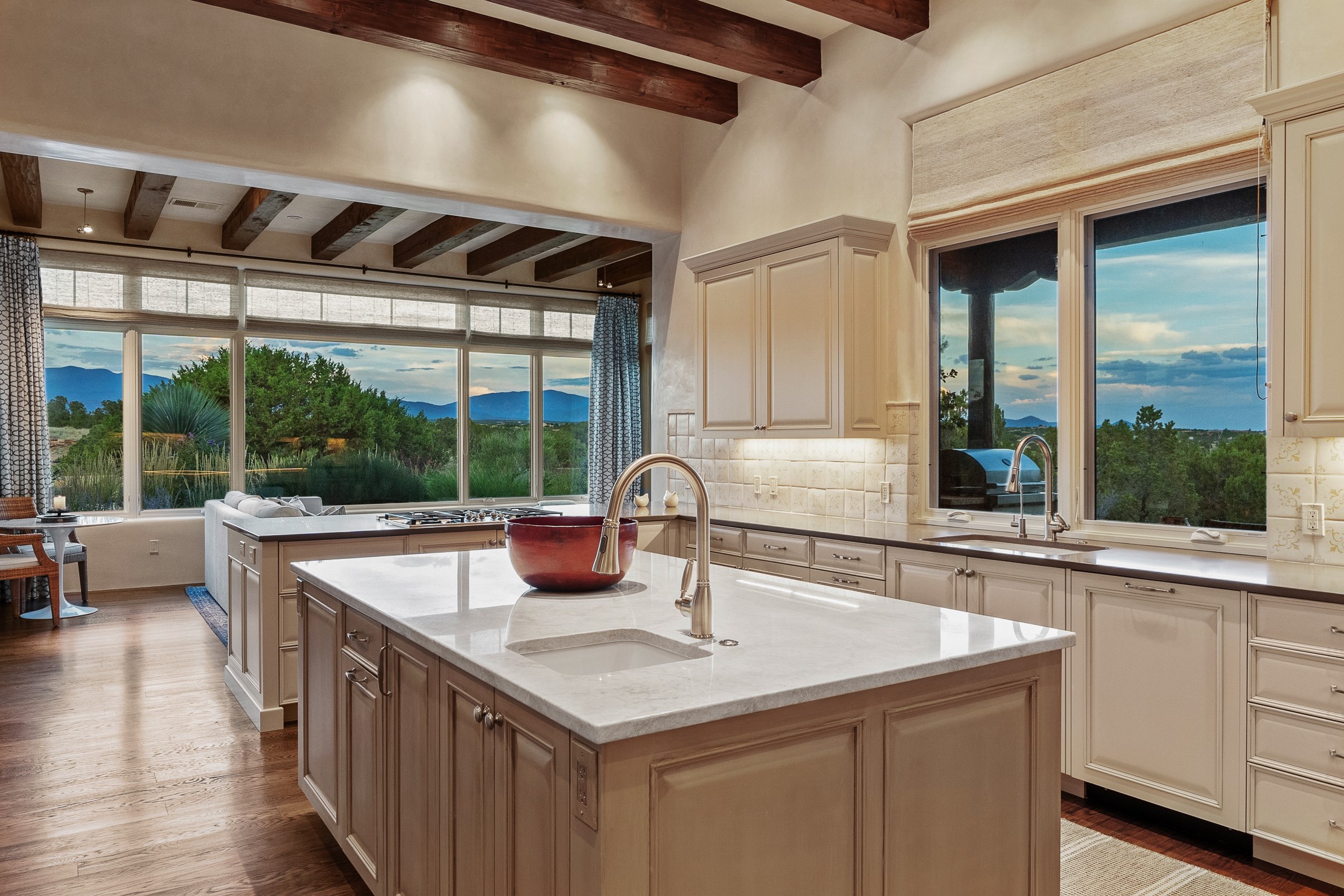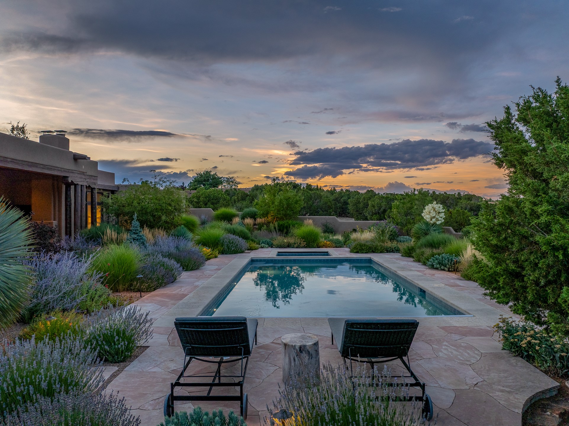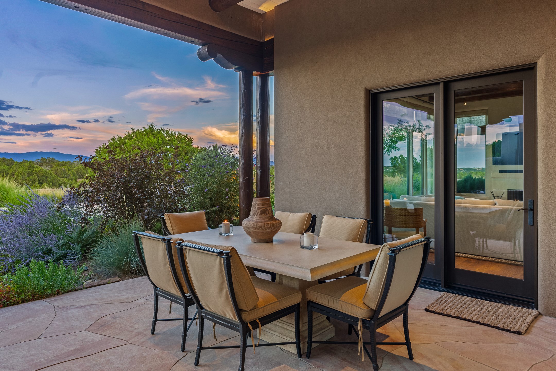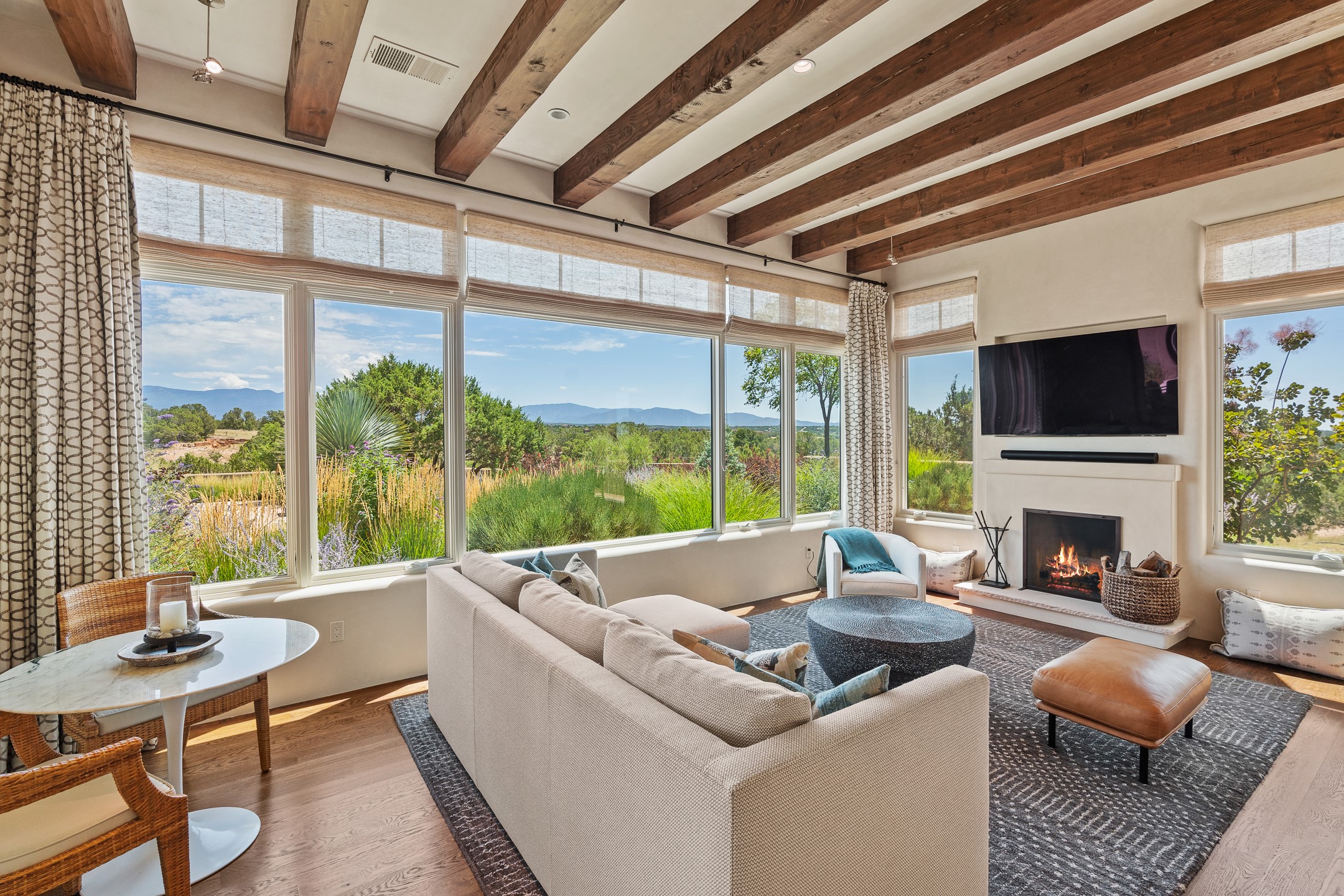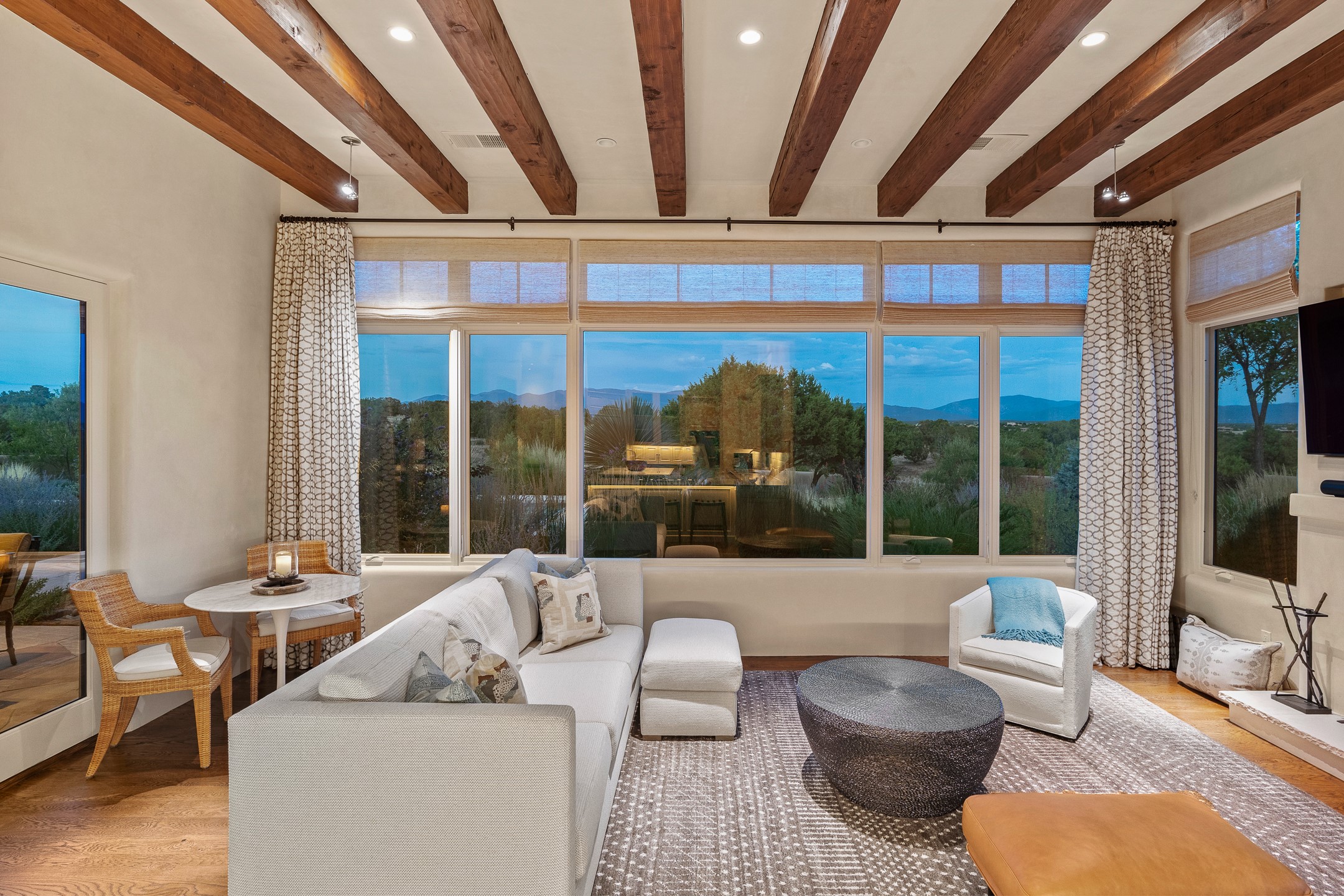 Rarely does a home achieve such a perfect balance of style, quality, natural beauty, and thoughtful design--but 20 Picacho Peak does so with ease. Set on five+ private acres off Wildhorse, this 4,800-square-foot masterpiece by Woods Design Builders offers 3 spacious, private bedrooms, five bathrooms, two dedicated offices, and exceptional indoor-outdoor living. From the primary suite and main living areas, panoramic Sangre de Cristo views create a constant backdrop, while the resort-style backyard--with its stunning in-ground pool, spa, and lush landscaping--invites year-round enjoyment.Completed in 2016 with meticulous attention to detail, the home features warm wood floors and beams, abundant natural light, and a layout that blends openness with intimate spaces. The chef's kitchen is equipped with Miele and Sub-Zero appliances, elegant Taj Mahal quartzite countertops, and a versatile wet bar seamlessly connecting to the living room. A casual den just off the kitchen offers an inviting retreat, while the adjacent great room and open dining area are ideal for entertaining. The primary suite is a true sanctuary, complete with a kiva fireplace, private portal access, a beautifully remodeled spa bath, and a grand walk-in closet. A second kiva graces the adjoining library/office--perfect for quiet work or reading by the fire. Guest quarters are thoughtfully separated, offering generous bedrooms, a private den, and comfort for family or friends. From the pool terrace, a landscaped path leads to a serene seating area - an idyllic spot for stargazing under Santa Fe's expansive skies. Additional amenities include radiant in-floor heating along with central heat & refrigerated air, a spacious two-car garage, abundant storage, and access to Las Campanas' world-class golf, dining, spa, and equestrian facilities. A golf equity membership to the club is available for separate purchase. Las Campanas HOA provides 24 hour security, gates, 24/7 Paramedic services, walking paths and maintenance. A rare offering in one of Santa Fe's most coveted communities - crafted for those who demand both beauty and quality.