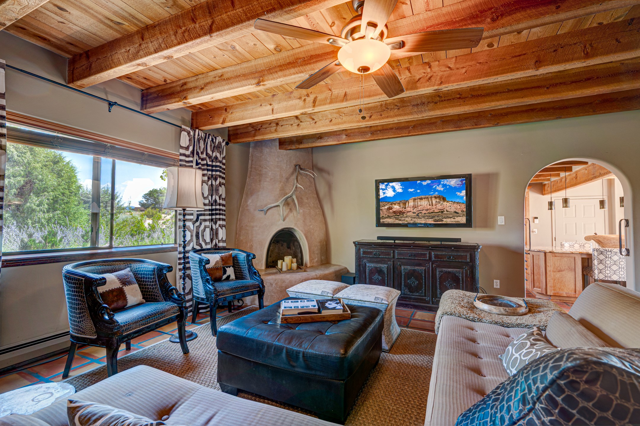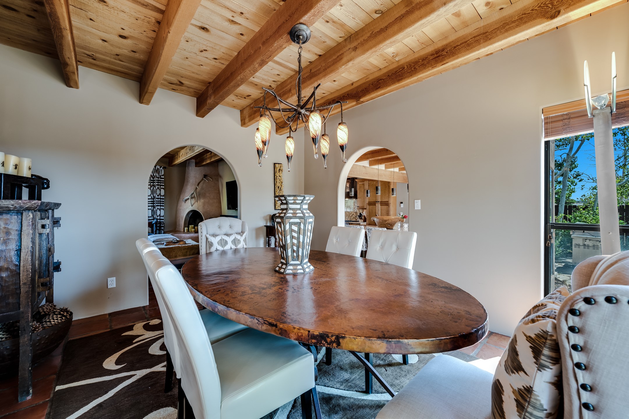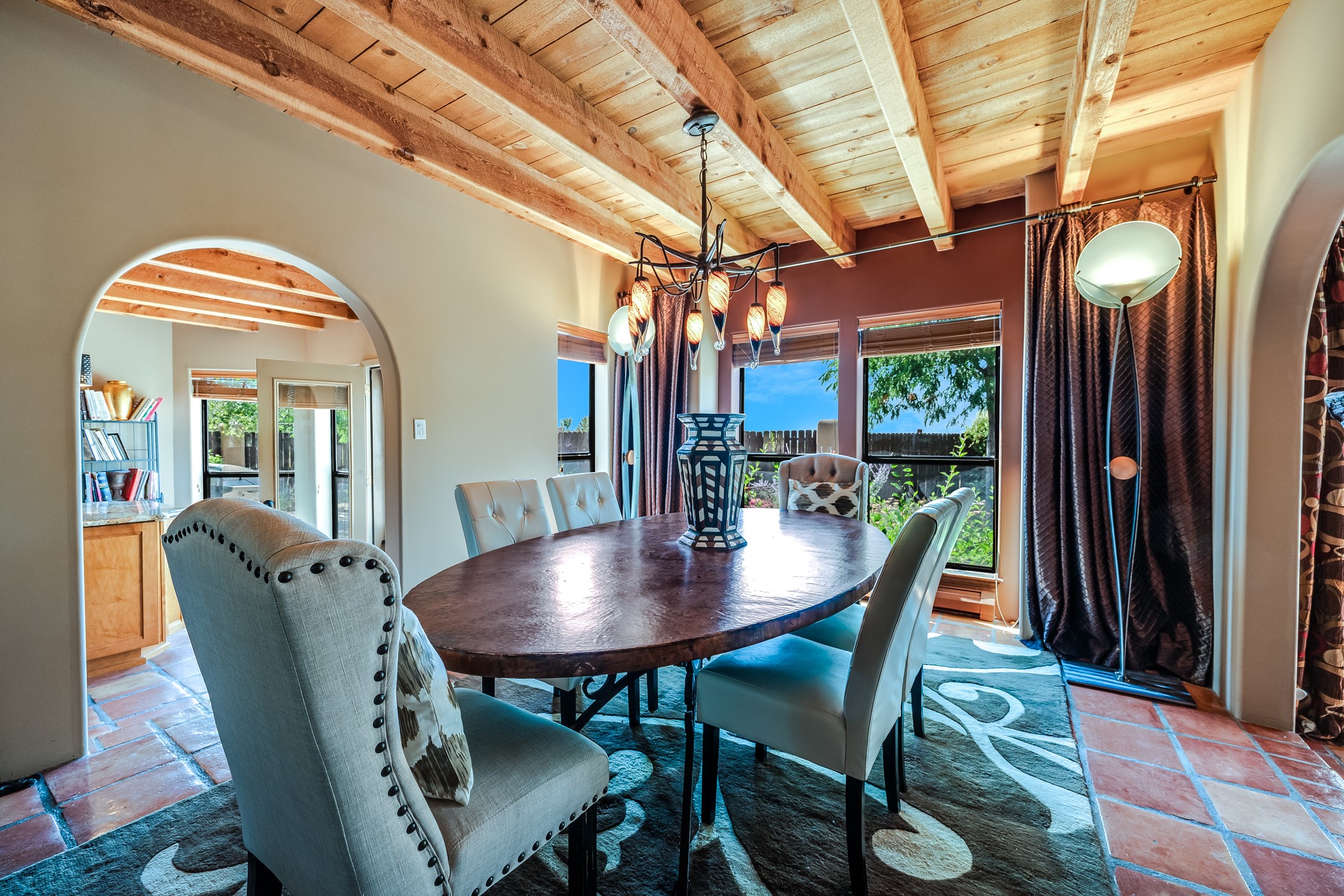 Fabulous Santa Fe detailing throughout this contemporary pueblo, open plan design. This home will wow you from landscaped entry through the foyer to view the pergola and dramatic garden fireplace. Romantic Kiva fireplaces in the owners suite, living room and study, high beam ceilings and gleaming Saltillo tile floors throughout. Remodeled spacious entertainers kitchen with large central island, a formal dining room overlooking the garden, and the main bedroom features a large walk in closet and updated spa-like bathroom. Privately fenced landscaped gardens and patios, portal and pergola for outside entertaining and enjoyment. Located on a quiet cul de sac within easy reach of the Eldorado amenities including the community center, pool, tennis, pickleball, dog parks, playgrounds, parks and disc golf, as well as 2 local shopping centers, library, senior center and schools, and only minutes into Santa Fe.