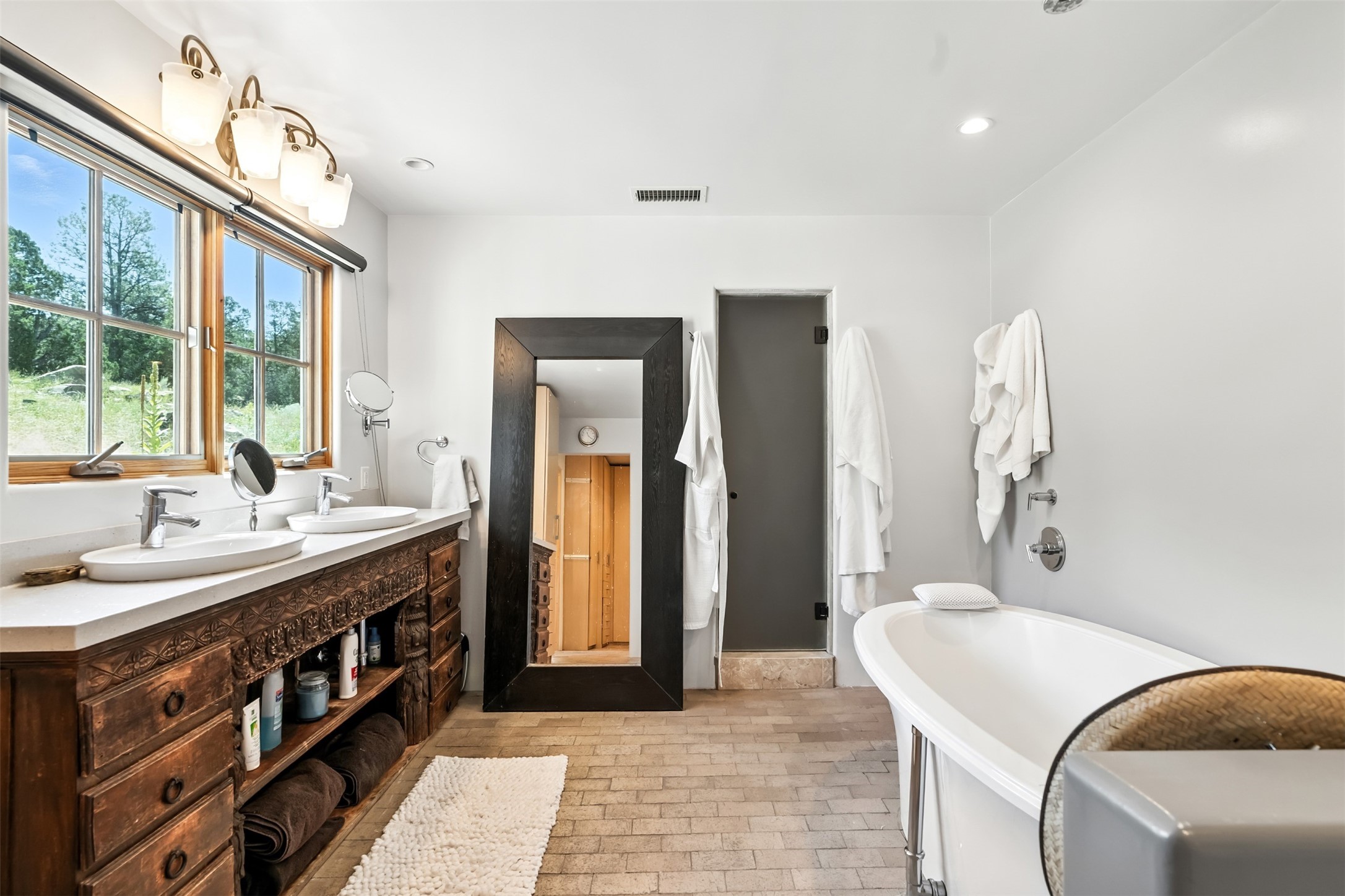 LIVE, WORK, ENTERTAIN, in your own secluded sanctuary located on 7.08 Sunlit Hills acres.10 Sabina Lane is a sophisticated & contemporary COMPOUND offering a wide variety ofliving & working spaces in a stunning pastoral setting, 15 minutes from Santa Fe.MAIN HOUSE - 2,187sqft open concept Great Room w/beamed cathedral ceiling,fireplace, Chef's kitchen w/granite counters, high end appliances, 2 spacious bedrooms w/ensuite bathrooms, laundry area, 5 sets of French door leading to 58 foot long covered portal.GUEST SUITE - 530sqft is steps from the main house & offers an inviting bedroom, spainspired bathroom, custom tiles, soaking tub, is adjoined by a private tranquil terrace.STUDIO/OFFICE - 994sqft amazing work space with vaulted ceiling, view windows, areasfor an office, art or other work related spaces, powder room & covered portal entry. Onewould never need to leave the property to conduct all their business or artistic work.CASITA - 683sqft Set apart from the main house, the casita has a full kitchen w/stonecounters, kiva fireplace, covered portal, stackable washer/dryer. The casitahas produced additional income as an Air B&BGARAGE - 60 sqft Fully finished, 2car capacity, storage areas.GAZEBO -196sqft An inviting space away from the home for meditation & relaxation.PAVILION -241sqft Wonderful retreat area w/fireplace, bancoseating, ceiling fan, designer lighting.The property is accessed through a gated entry, a graveled driveway w/recently addedretaining wall. Many additional aspects - electric convectionstove top, extensive & significant landscaping,10 zone irrigation system,2 owned propane tanks (500 and 250 gallons), 5 fireplaces, an amazing flower filled meadow, healthy pinon, aspen and juniper trees, eclectic river rock pylons, antique wooden bathroom cabinet, a wealth of ceiling fans & mini split in the primarybedroom. For folks seeking a destination, full time live/work situation, please consider 10Sabina Lane.