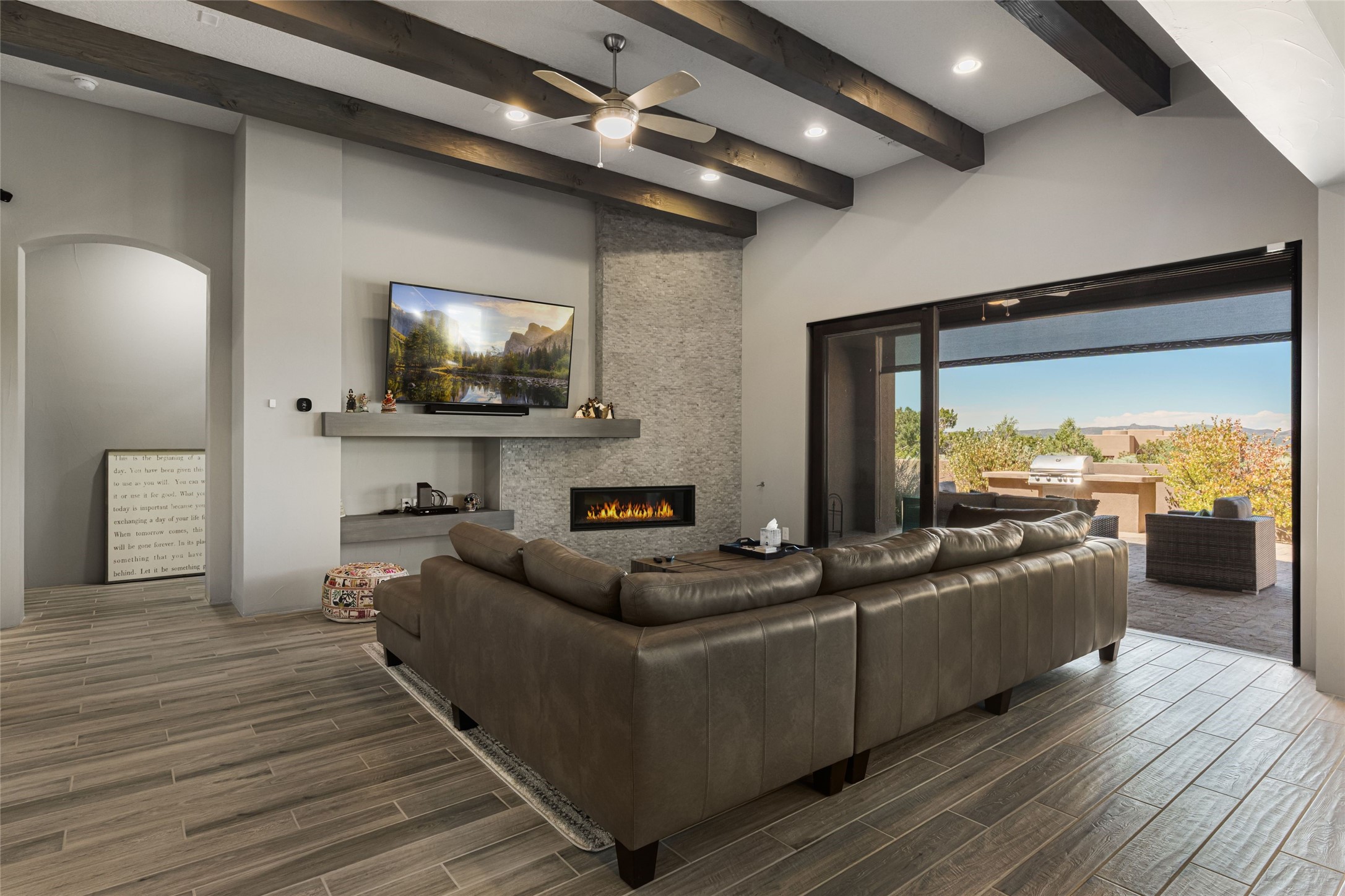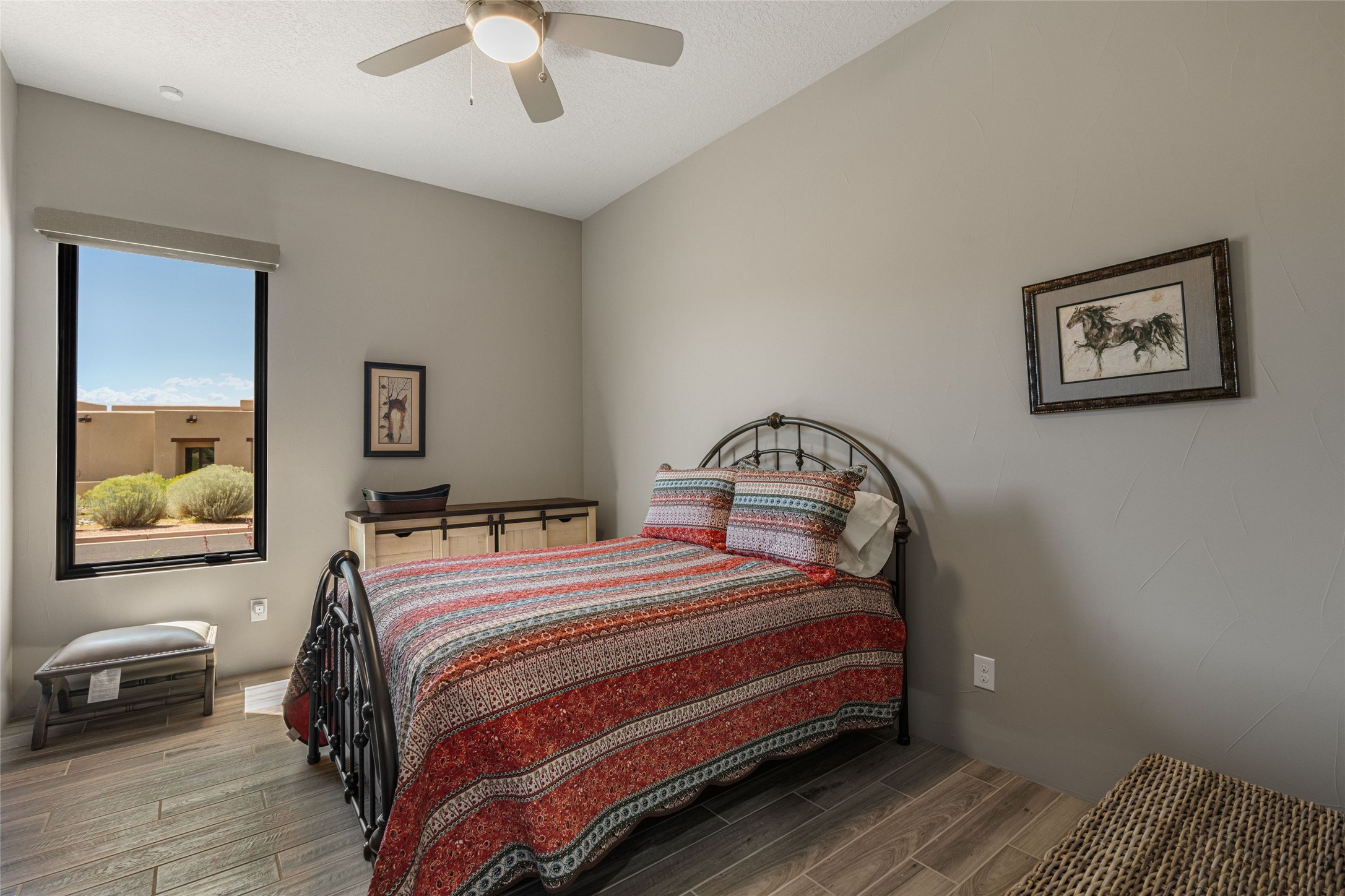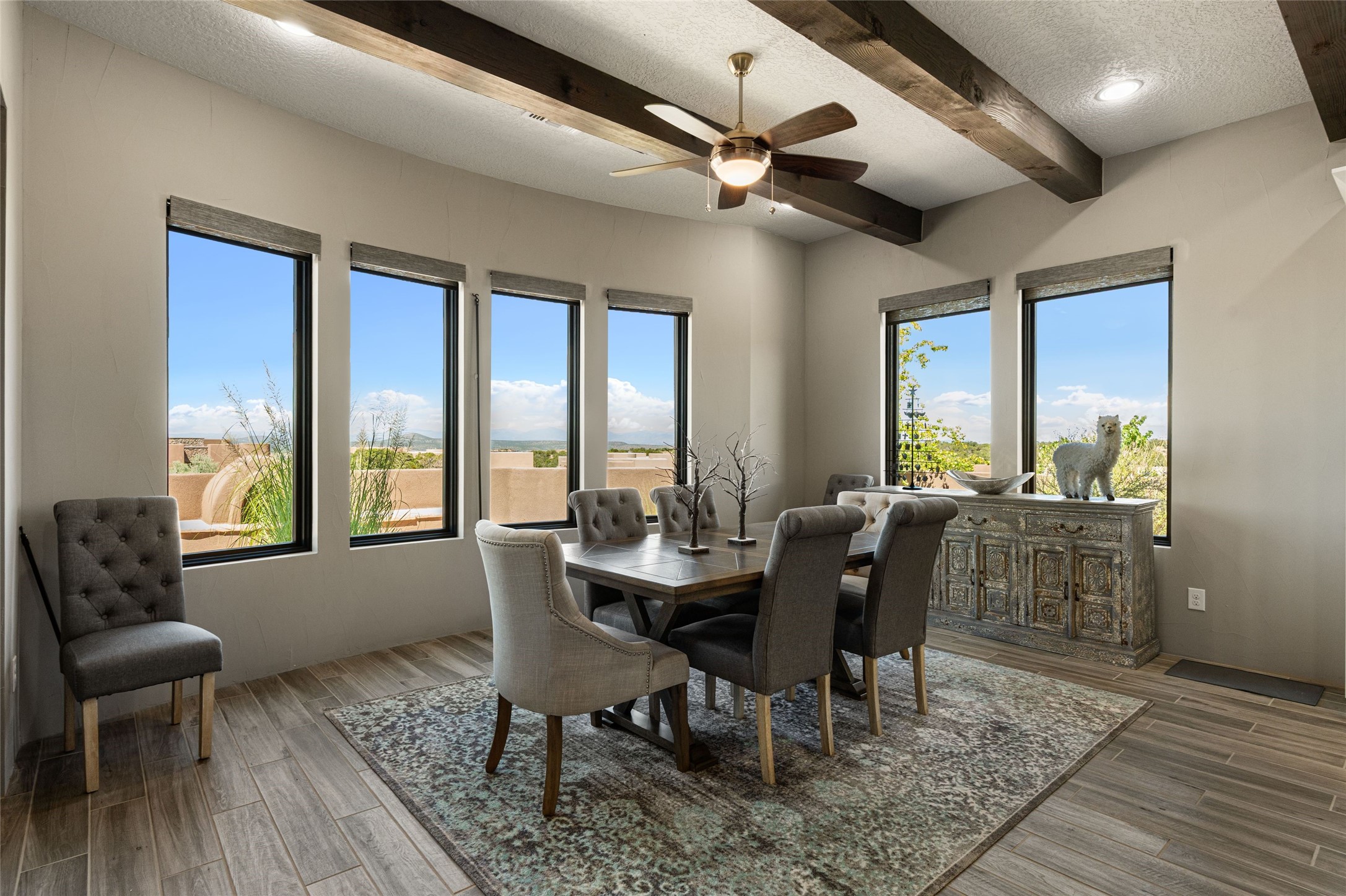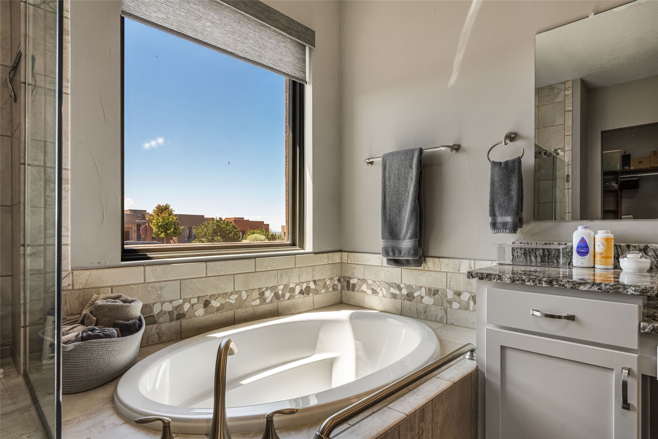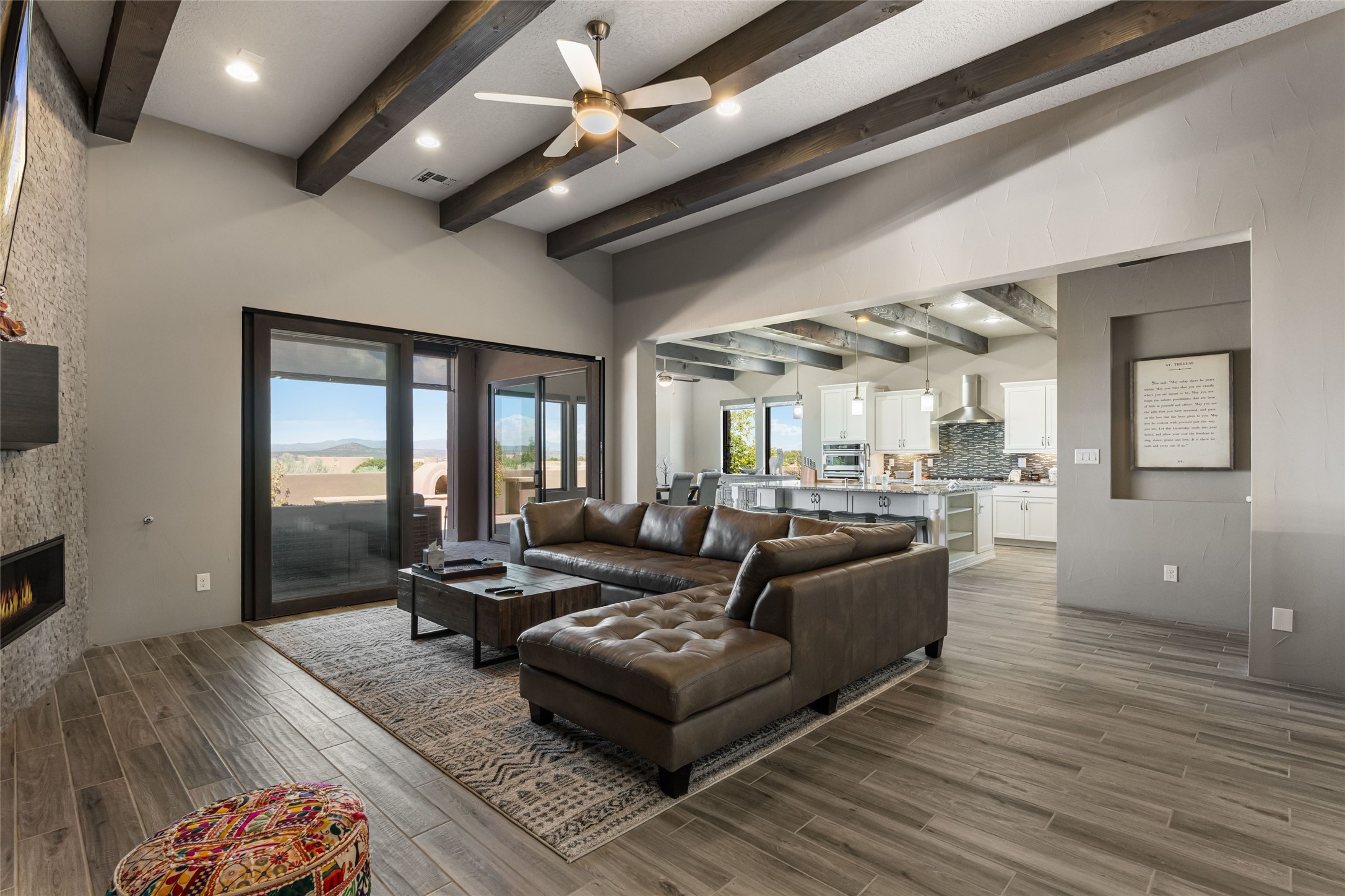 Well-sited Las Campanas 3-bedroom 2.5-bath home with breathtaking sunset mountain views. Single level, no interior steps. Inviting open floor plan that seamlessly connects two living areas. The ceramic tile floors throughout the home not only enhance the aesthetic appeal but also offer easy maintenance. The kitchen is appointed with upgraded cabinets and counter tops, spacious center island with prep sink and generous walk-in pantry. Large laundry room, complete with a sink and extra cabinets. Outdoor portal expands dining and entertaining space. Third bedroom offers flexibility as a studio/office. Over $268k builder upgrades include premium lot and elevation, fireplace, BBQ/Grill, storage room and California closets. With a 3-car garage, you'll have plenty of room for vehicles, tools, and recreational gear. State of the art security system that includes inside and outside cameras that can be viewed on- site or remotely. Las Campanas is gated community with a 24-hour security and EMT service. Membership in the Club at Las Campanas is available upon approval and for an extra fee.